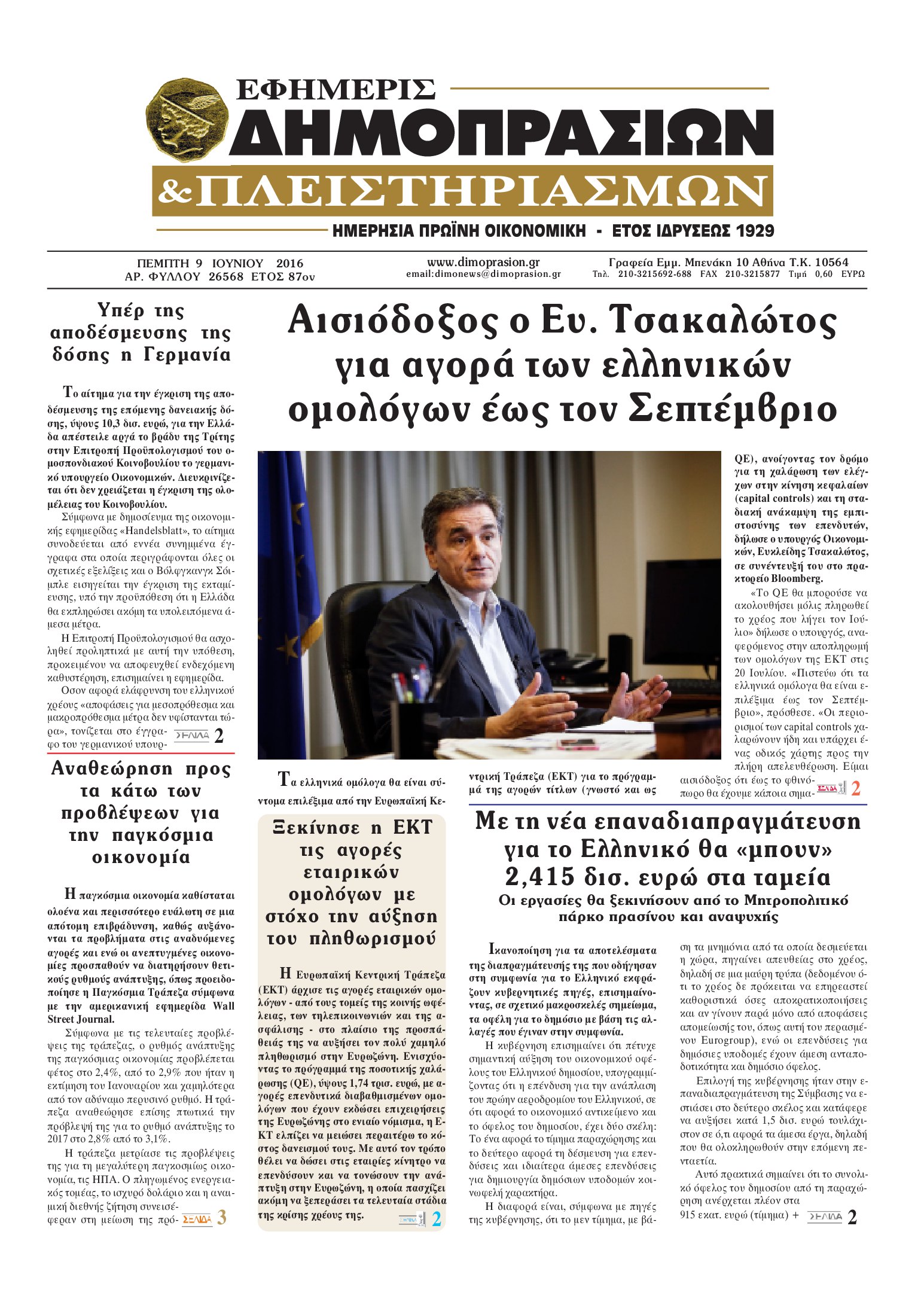 Oι οικονομικές εφημερίδες 9/6/2016 Enikos Newsroom 05:02, Πέμπτη 09 Ιουνίου 2016 Media Διαβάστε τα σημερινά πρωτοσέλιδα των οικονομικών εφημερίδων: ΟΙΚΟΝΟΜΙΚΕΣ ΕΦΗΜΕΡΙΔΕΣ ΠΡΩΤΟΣΕΛΙΔΑ Μοιράσου το: σχολίασε κι εσύ (0 σχόλια) Ακολουθήστε το enikos.gr στο Google News και μάθετε πρώτοι όλες τις ειδήσεις Δείτε όλες τις τελευταίες ειδήσεις από την Ελλάδα και τον Κόσμο στο enikos.gr Ειδήσεις Ροή Ειδήσεων 3 ώρες πριν Αγρότες: «Όχι στον διάλογο, μας εμπαίζει η κυβέρνηση» – Αποφάσισαν κλιμάκωση των κινητοποιήσεων, τι θα γίνει τα Χριστούγεννα 4 ώρες πριν Την πρώτη Belharra παρέλαβε η χώρα μας, υψώθηκε η ελληνική σημαία στη φρεγάτα «Κίμων» – Δένδιας: «Το ισχυρότερο Πολεμικό Ναυτικό που είχε ποτέ ο ελληνισμός» 2 ώρες πριν Γιώργος Μαζωνάκης: «Έχει υποστεί ένα σωρό εκβιαστικές πρακτικές – Του είπαν ότι θα του βάλουν τον συγκεκριμένο άνθρωπο να τον καταγγείλει» 3 ώρες πριν Μιχάλης Χουρδάκης: «Είμαι διαθέσιμος να συμβάλω στην προσωρινή κάλυψη του ιατρείου της Ψερίμου» – Η επιστολή στον Άδωνι Γεωργιάδη 3 ώρες πριν Εξώδικο Γεωργιάδη στην Κωνσταντοπούλου – «Με κατηγόρησε ότι έχω καταδικαστεί για παιδεραστία» 59 λεπτά πριν Γάμος: 11 ψυχρές αλλά ευγενικές φράσεις, που λέει ένας άνδρας όταν σκέφτεται τον χωρισμό 4 ώρες πριν Τα 5 ζώδια που θα ευνοηθούν στα οικονομικά τους το 2026 – «Τραβούν το χρήμα σαν μαγνήτες» 5 ώρες πριν Αυτό που κρύβεται κάτω από τη Γροιλανδία θα μπορούσε να ανατρέψει όσα γνωρίζουμε για την άνοδο της στάθμης των θαλασσών 1 ημέρα πριν 20 χρόνια τα Χριστούγεννα ξεκινούν στα Public με μεγάλη ποικιλία σε δώρα! 5 λεπτά πριν Αθήνα: Εξαρθρώθηκε εγκληματική οργάνωση που διακινούσε ναρκωτικά σε μορφή σοκολάτας – Δύο τράπερ ανάμεσα στους 4 συλληφθέντες – ΒΙΝΤΕΟ 15 λεπτά πριν Στη φυλακή ο «Έλληνας Εσκομπάρ» και τρεις συνεργοί του για το φορτίο με την κοκαΐνη – Τι υποστήριξε στην απολογία του 19 λεπτά πριν ΕΕ: Καλεί τα Σκόπια να σέβονται τις δεσμεύσεις από τη διαδικασία ένταξης και το Διεθνές Δίκαιο – Η χρηματοδότηση του Διαδρόμου Χ 25 λεπτά πριν Σοκ στη Σουηδία: 12χρονος πληρωμένος δολοφόνος σκότωσε λάθος άτομο 30 λεπτά πριν FIFA: Έτοιμη να… επανεντάξει τη Ρωσία από το 2026 ENIKOS NETWORK Σκέφτεστε συνέχεια συζητήσεις που έχετε κάνει; Τι σημαίνει αυτό, σύμφωνα με ειδικό Ξεκίνησε η «επέλαση» της γρίπης στην Ελλάδα-Ποιοι κινδυνεύουν Κλιμάκωση των κινητοποιήσεων αποφάσισαν οι αγρότες, κλείνουν παρακαμπτήριους την Παρασκευή – Τι απαντά η κυβέρνηση Ευλογιά αιγοπροβάτων: Νέες αποζημιώσεις ύψους 26,02 εκατ. ευρώ σε κτηνοτρόφους – Η κατανομή ανά Περιφέρεια Χαρτογραφώντας το «σημείο χωρίς επιστροφή»: Για πρώτη φορά αποκαλύπτεται με λεπτομέρεια το ακανθώδες όριο της ατμόσφαιρας τ... Η Google καταργεί τη λειτουργία «dark web report» – Πώς θα μπορούν οι χρήστες να διαγράφουν τα δεδομένα τους περισσότερα 17:45 , Πέμπτη 18 Δεκεμβρίου 2025 ROUK ZOUK: Εορταστικό επεισόδιο με καλεσμένους τους πρωταγωνιστές του «Γιατί ρε πατέρα» Το Σάββατο 20 Δεκεμβρίου στις 21:00, η Ζέτα Μακρυπούλια υποδέχεται εκλεκτούς ηθοποιούς που όλο... 17:20 , Πέμπτη 18 Δεκεμβρίου 2025 Άγιος έρωτας: Η Χριστίνα εξομολογείται στον πατέρα Νικόλαο, απόψε στις 21:00 στον Alpha Η Νότα αποφασίζει να εκδικηθεί τον Πέτρο και τον Στέφανο, για χάρη του Λούη, όμως τα πράγματα ... 16:50 , Πέμπτη 18 Δεκεμβρίου 2025 Να μ’ αγαπάς: Ζωή και Φωτεινή συμφιλιώνονται ως μάνα με κόρη, απόψε στις 20:00 Η ταυτότητα του Άγγελου αποκαλύπτεται στο νέο επεισόδιο της σειράς “Να μ’ αγαπάς... 15:52 , Πέμπτη 18 Δεκεμβρίου 2025 Τ