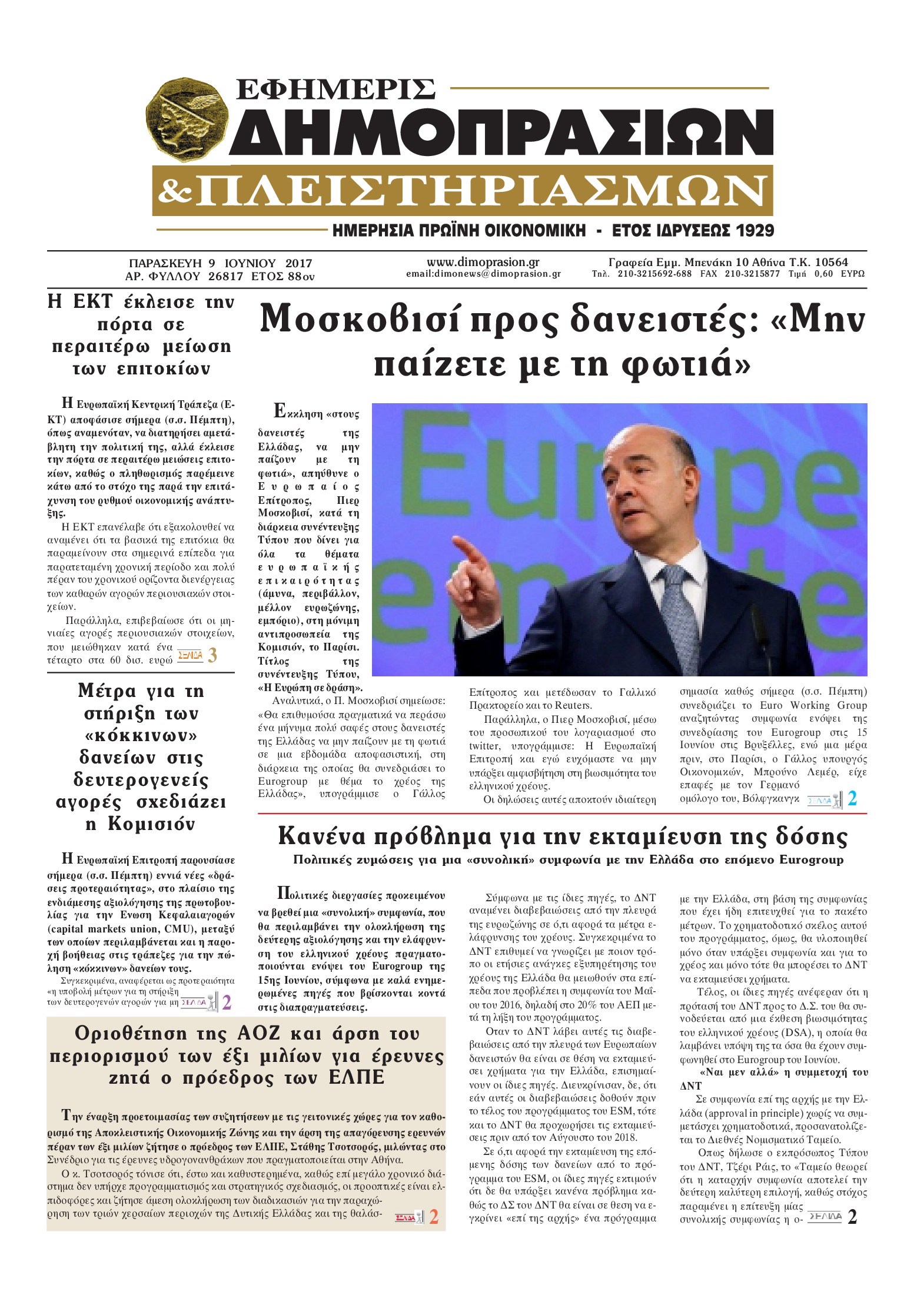 Οι οικονομικές εφημερίδες 9/6/2017 Enikos Newsroom 06:40, Παρασκευή 09 Ιουνίου 2017 Media Διαβάστε τα σημερινά πρωτοσέλιδα των οικονομικών εφημερίδων: ΟΙΚΟΝΟΜΙΚΕΣ ΕΦΗΜΕΡΙΔΕΣ ΠΡΩΤΟΣΕΛΙΔΑ Μοιράσου το: σχολίασε κι εσύ (0 σχόλια) Ακολουθήστε το enikos.gr στο Google News και μάθετε πρώτοι όλες τις ειδήσεις Δείτε όλες τις τελευταίες ειδήσεις από την Ελλάδα και τον Κόσμο στο enikos.gr Ειδήσεις Ροή Ειδήσεων 19 λεπτά πριν Την πρώτη Belharra παρέλαβε η χώρα μας, υψώθηκε η ελληνική σημαία στη φρεγάτα «Κίμων» – Δένδιας: «Το ισχυρότερο Πολεμικό Ναυτικό που είχε ποτέ ο ελληνισμός» 3 ώρες πριν Γιώργος Μαζωνάκης: «Δεν ζήτησα χρήματα, παρά μόνο ηθική δικαίωση» – Οι πρώτες δηλώσεις του 21χρονου μετά την κατάθεση της μήνυσης 2 ώρες πριν Δίκη Βαλυράκη: Καταθέτει ο βασικός αυτόπτης μάρτυρας – «Δέχτηκα πιέσεις να μη μιλήσω, πήγα να ψωνίσω και αυτοκίνητο με χτύπησε στο πόδι» 1 ώρα πριν Ώρα αποφάσεων για τους αγρότες – Ξεκίνησε η πανελλαδική σύσκεψη μπλόκων στις Σέρρες – ΦΩΤΟ 6 ώρες πριν Συναγερμός και στην Ελλάδα για τη «σούπερ γρίπη»: Πόσο σοβαρή είναι και ποιοι θεωρούνται πιο ευάλωτοι – 3 ειδικοί μιλούν στο enikos.gr 7 ώρες πριν Τα 4 ζώδια που λαμβάνουν ένα ισχυρό σημάδι από το σύμπαν – «Αποκαλύπτεται κάτι που μπορεί να αλλάξει τη ζωή μας» 6 ώρες πριν Αν κάνετε συνεχώς αυτά τα 8 πράγματα με τα κατοικίδιά σας, σας λείπει η ανθρώπινη επαφή 2 ώρες πριν Αυτό που κρύβεται κάτω από τη Γροιλανδία θα μπορούσε να ανατρέψει όσα γνωρίζουμε για την άνοδο της στάθμης των θαλασσών 1 ημέρα πριν 20 χρόνια τα Χριστούγεννα ξεκινούν στα Public με μεγάλη ποικιλία σε δώρα! 5 λεπτά πριν Εξεταστική για ΟΠΕΚΕΠΕ – Μπρατάκος: «Δεν μου τέθηκε ζήτημα για πιέσεις από τον κ. Αυγενάκη ή οποιονδήποτε» – Τι είπε για τον Σημανδράκο 6 λεπτά πριν ΤΕΧΑΝ: 1ο Πανελλήνιο Σχολικό Πρωτάθλημα Ανακύκλωσης Δευτεροβάθμιας Εκπαίδευσης 10 λεπτά πριν Τραυματίστηκε 5χρονο παιδί σε νηπιαγωγείο στο Αγρίνιο – Χτυπήθηκε από αντικείμενο που έπεσε από έπιπλο 15 λεπτά πριν Μεσσηνία: Παρέμβαση εισαγγελέα στο μπλόκο αγροτών στον κόμβο της Θουρίας έπειτα από καταγγελίες για παρακώλυση συγκοινωνιών 19 λεπτά πριν Την πρώτη Belharra παρέλαβε η χώρα μας, υψώθηκε η ελληνική σημαία στη φρεγάτα «Κίμων» – Δένδιας: «Το ισχυρότερο Πολεμικό Ναυτικό που είχε ποτέ ο ελληνισμός» ENIKOS NETWORK 100 χρόνια ΠΙΣ: Ένας αιώνας προσφοράς στην Ιατρική και την κοινωνία Ένα ποτήρι την ημέρα από αυτόν τον χυμό μειώνει τη χοληστερίνη, τη φλεγμονή και την πίεση Κρατική επιχορήγηση έως 14.500 ευρώ: Ποιοι θα λάβουν από σήμερα την προκαταβολή στον τραπεζικό λογαριασμό τους Αυτόματη απόδοση ΦΠΑ: Τα δύο σενάρια που επεξεργάζεται η ΑΑΔΕ Χαρτογραφώντας το «σημείο χωρίς επιστροφή»: Για πρώτη φορά αποκαλύπτεται με λεπτομέρεια το ακανθώδες όριο της ατμόσφαιρας τ... Η Google καταργεί τη λειτουργία «dark web report» – Πώς θα μπορούν οι χρήστες να διαγράφουν τα δεδομένα τους περισσότερα 15:52 , Πέμπτη 18 Δεκεμβρίου 2025 Το Σπίτι Δίπλα Στο Ποτάμι: Το καθηλωτικό τελευταίο επεισόδιο για το 2025 απόψε στις 22:30 Καθηλώνει το σημερινό επεισόδιο της σειράς “Το Σπίτι Δίπλα Στο Ποτάμι” που έρχεται... 15:20 , Πέμπτη 18 Δεκεμβρίου 2025 Άγιος έρωτας – Η Ελευθερία Αρβανιτάκη τραγουδά και ο Γιάννης Τσορτέκης καθηλώνει με τον χορό του Ο Κλεάνθης χορεύει στους ήχους της Ελευθερίας Αρβανιτάκη στη σειρά “Άγιος Έρωτας“.... 08:00 , Πέμπτη 18 Δεκεμβρίου 2025 Την Κυριακή με τη Realnews: Δωροεπιταγή 10€ Δωροεπιταγή αξίας 10€ για αγορές άνω των 60€ από τα πολυκαταστήματα F
