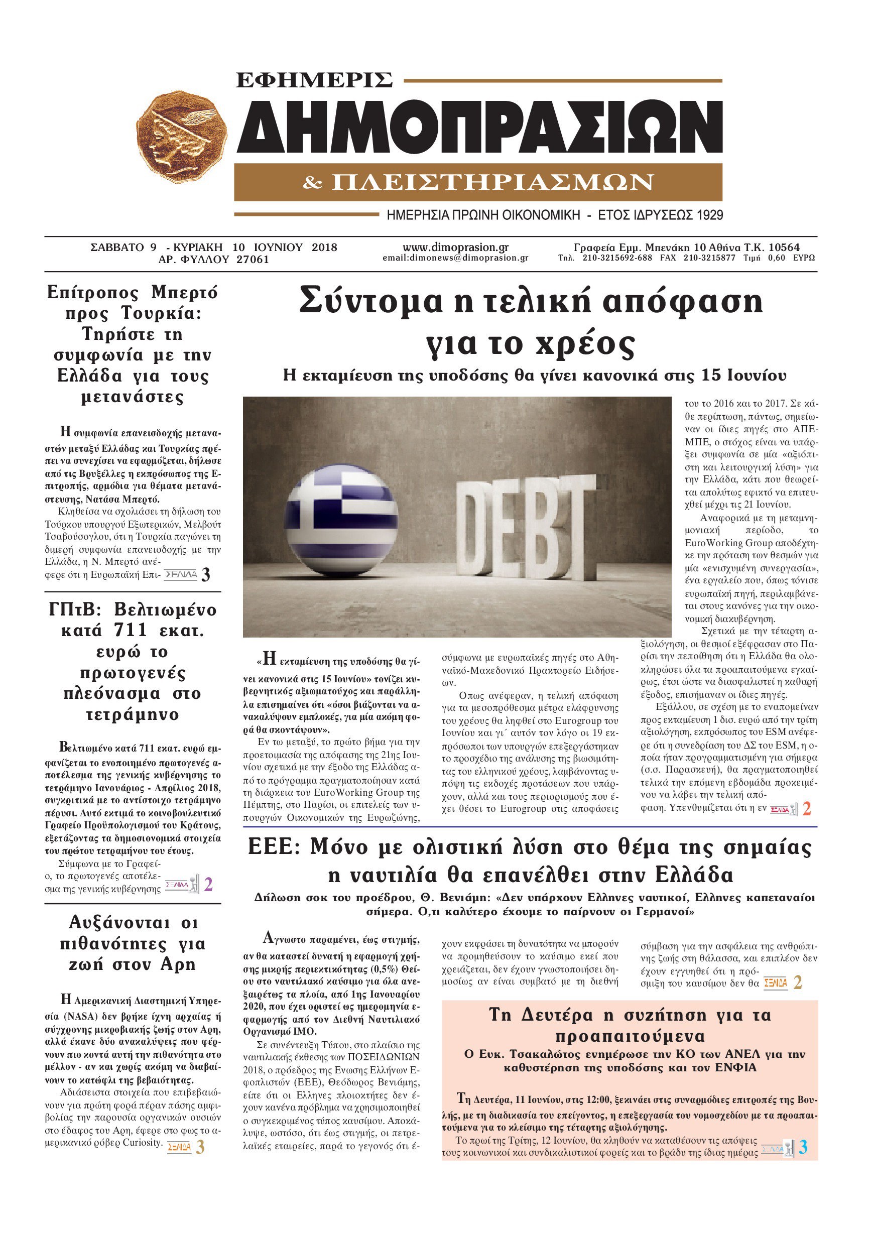 Οι οικονομικές εφημερίδες 9/6/2018 Enikos Newsroom 06:37, Σάββατο 09 Ιουνίου 2018 Media Διαβάστε τα σημερινά πρωτοσέλιδα των οικονομικών εφημερίδων. ΕΦΗΜΕΡΙΔΕΣ ΟΙΚΟΝΟΜΙΚΕΣ ΕΦΗΜΕΡΙΔΕΣ ΠΡΩΤΟΣΕΛΙΔΑ Μοιράσου το: σχολίασε κι εσύ (0 σχόλια) Ακολουθήστε το enikos.gr στο Google News και μάθετε πρώτοι όλες τις ειδήσεις Δείτε όλες τις τελευταίες ειδήσεις από την Ελλάδα και τον Κόσμο στο enikos.gr Ειδήσεις Ροή Ειδήσεων 17 λεπτά πριν Αγρότες: «Όχι στον διάλογο, μας εμπαίζει η κυβέρνηση» – Αποφάσισαν κλιμάκωση των κινητοποιήσεων 45 λεπτά πριν Την πρώτη Belharra παρέλαβε η χώρα μας, υψώθηκε η ελληνική σημαία στη φρεγάτα «Κίμων» – Δένδιας: «Το ισχυρότερο Πολεμικό Ναυτικό που είχε ποτέ ο ελληνισμός» 3 ώρες πριν Γιώργος Μαζωνάκης: «Δεν ζήτησα χρήματα, παρά μόνο ηθική δικαίωση» – Οι πρώτες δηλώσεις του 21χρονου μετά την κατάθεση της μήνυσης 2 ώρες πριν Δίκη Βαλυράκη: Καταθέτει ο βασικός αυτόπτης μάρτυρας – «Δέχτηκα πιέσεις να μη μιλήσω, πήγα να ψωνίσω και αυτοκίνητο με χτύπησε στο πόδι» 7 ώρες πριν Συναγερμός και στην Ελλάδα για τη «σούπερ γρίπη»: Πόσο σοβαρή είναι και ποιοι θεωρούνται πιο ευάλωτοι – 3 ειδικοί μιλούν στο enikos.gr 1 ώρα πριν Τα 5 ζώδια που θα ευνοηθούν στα οικονομικά τους το 2026 – «Τραβούν το χρήμα σαν μαγνήτες» 6 ώρες πριν Αν κάνετε συνεχώς αυτά τα 8 πράγματα με τα κατοικίδιά σας, σας λείπει η ανθρώπινη επαφή 2 ώρες πριν Αυτό που κρύβεται κάτω από τη Γροιλανδία θα μπορούσε να ανατρέψει όσα γνωρίζουμε για την άνοδο της στάθμης των θαλασσών 1 ημέρα πριν 20 χρόνια τα Χριστούγεννα ξεκινούν στα Public με μεγάλη ποικιλία σε δώρα! 2 λεπτά πριν Μιχάλης Χουρδάκης: «Είμαι διαθέσιμος να συμβάλω στην προσωρινή κάλυψη του ιατρείου της Ψερίμου» – Η επιστολή στον Άδωνι Γεωργιάδη 7 λεπτά πριν Κουίζ για την παλιά Αθήνα: Αναγνωρίζετε την περιοχή; Είναι από τις πιο γνωστές 12 λεπτά πριν Λάμπρος Κωνσταντάρας για τα φετινά Χριστούγεννα: «Θα είναι πάρα πολύ δύσκολα, γιατί θα είναι τα πρώτα χωρίς τον πατέρα μου» 17 λεπτά πριν Αγρότες: «Όχι στον διάλογο, μας εμπαίζει η κυβέρνηση» – Αποφάσισαν κλιμάκωση των κινητοποιήσεων 21 λεπτά πριν Να μ’ αγαπάς: Ζωή και Φωτεινή συμφιλιώνονται ως μάνα με κόρη, απόψε στις 20:00 ENIKOS NETWORK 100 χρόνια ΠΙΣ: Ένας αιώνας προσφοράς στην Ιατρική και την κοινωνία Ένα ποτήρι την ημέρα από αυτόν τον χυμό μειώνει τη χοληστερίνη, τη φλεγμονή και την πίεση Κρατική επιχορήγηση έως 14.500 ευρώ: Ποιοι θα λάβουν από σήμερα την προκαταβολή στον τραπεζικό λογαριασμό τους Αυτόματη απόδοση ΦΠΑ: Τα δύο σενάρια που επεξεργάζεται η ΑΑΔΕ Χαρτογραφώντας το «σημείο χωρίς επιστροφή»: Για πρώτη φορά αποκαλύπτεται με λεπτομέρεια το ακανθώδες όριο της ατμόσφαιρας τ... Η Google καταργεί τη λειτουργία «dark web report» – Πώς θα μπορούν οι χρήστες να διαγράφουν τα δεδομένα τους περισσότερα 16:50 , Πέμπτη 18 Δεκεμβρίου 2025 Να μ’ αγαπάς: Ζωή και Φωτεινή συμφιλιώνονται ως μάνα με κόρη, απόψε στις 20:00 Η ταυτότητα του Άγγελου αποκαλύπτεται στο νέο επεισόδιο της σειράς “Να μ’ αγαπάς... 15:52 , Πέμπτη 18 Δεκεμβρίου 2025 Το Σπίτι Δίπλα Στο Ποτάμι: Το καθηλωτικό τελευταίο επεισόδιο για το 2025 απόψε στις 22:30 Καθηλώνει το σημερινό επεισόδιο της σειράς “Το Σπίτι Δίπλα Στο Ποτάμι” που έρχεται... 15:20 , Πέμπτη 18 Δεκεμβρίου 2025 Άγιος έρωτας – Η Ελευθερία Αρβανιτάκη τραγουδά και ο Γιάννης Τσορτέκης καθηλώνει με τον χορό του Ο Κλεάνθης χορεύει στους ήχους της Ελευθερίας Αρβανιτάκη στη σειρά “Άγιος Έρωτας“.... 08:00 , Πέμπτη 18 Δεκεμβρίου 2025 Την Κυριακή με τη Realnews: 