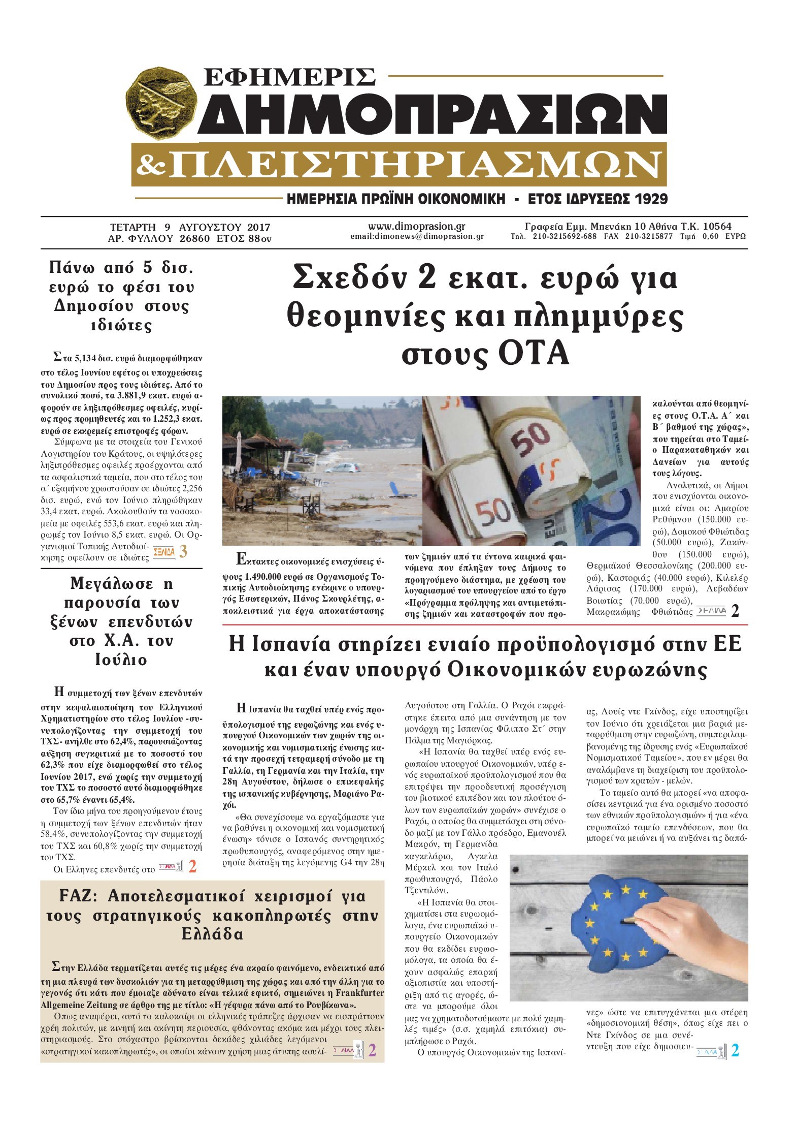 Οι οικονομικές εφημερίδες 9/8/2017 Κώστας Τεό 07:03, Τετάρτη 09 Αυγούστου 2017 Media Διαβάστε τα σημερινά πρωτοσέλιδα των οικονομικών εφημερίδων: ΟΙΚΟΝΟΜΙΚΕΣ ΕΦΗΜΕΡΙΔΕΣ ΠΡΩΤΟΣΕΛΙΔΑ Μοιράσου το: σχολίασε κι εσύ (0 σχόλια) Ακολουθήστε το enikos.gr στο Google News και μάθετε πρώτοι όλες τις ειδήσεις Δείτε όλες τις τελευταίες ειδήσεις από την Ελλάδα και τον Κόσμο στο enikos.gr Ειδήσεις Ροή Ειδήσεων 8 ώρες πριν Εκτός ευρωομάδας ΣΥΡΙΖΑ ο Νίκος Παππάς μετά την επίθεση στον δημοσιογράφο Νίκο Γιαννόπουλο – Η μήνυση και οι νέες δηλώσεις 8 ώρες πριν «Αγριεύουν» οι αγρότες: «Δεν συντρέχει λόγος συνάντησης με τον πρωθυπουργό» – Ώρα αποφάσεων στη σύσκεψη της Πέμπτης 8 ώρες πριν Κυψέλη: Χωρίς την οικογένειά της δίπλα της απολογήθηκε η 16χρονη – «Της είχε επιτεθεί κάποιος για να την βιάσει, φοβήθηκε και κυκλοφορούσε με μαχαίρι» 8 ώρες πριν Politico: Το πρόβλημα της Ευρώπης δεν είναι το Βέλγιο αλλά ο Ντόναλντ Τραμπ 10 ώρες πριν Αλεξανδρούπολη: Πολυοργανική ανεπάρκεια λόγω υποσιτισμού η αιτία θανάτου του 3χρονου αγοριού 1 ώρα πριν Καούρα: Το μπαχαρικό που είναι «εξίσου αποτελεσματικό» με την ομεπραζόλη, σύμφωνα με ειδικούς 2 ώρες πριν Τα ζώδια σήμερα, Πέμπτη 18 Δεκεμβρίου: Λέοντες, η καρδιά σας θέλει να εκφραστεί 8 ώρες πριν Μυστήριο με τεράστιες κυκλικές πέτρες 200 κιλών – Ανακαλύφθηκαν τυχαία κατά τη διάρκεια οδικών έργων και κανείς δεν ξέρει από πού προέρχονται 22 ώρες πριν 20 χρόνια τα Χριστούγεννα ξεκινούν στα Public με μεγάλη ποικιλία σε δώρα! 6 λεπτά πριν Εορτολόγιο: Ποιοι γιορτάζουν σήμερα 18 Δεκεμβρίου 18 λεπτά πριν Επιχειρήσεις: Έρχονται νέα μέτρα φορολογικών ελαφρύνσεων – Τα σχέδια για την προκαταβολή φόρου και το τέλος επιτηδεύματος 25 λεπτά πριν ΗΠΑ: Οριστική άρση κυρώσεων κατά της Συρίας – Ανοίγει ο δρόμος για επενδύσεις 33 λεπτά πριν Οι τελευταίες εξελίξεις στην εμπορική συμφωνία Ευρωπαϊκής Ένωσης – Mercosur 38 λεπτά πριν Ρεκόρ εσόδων για τον Παναμά από τα τέλη διέλευσης της Διώρυγας ENIKOS NETWORK Μπορείτε να εντοπίσετε το ποντικάκι που κρύβεται πίσω από όλα τα μανιτάρια; Μόνο όσοι έχουν τα μάτια γερακιού μπορούν να λύ... Το «λουλούδι σκαντζόχοιρος» που μπορεί να ενισχύσει το ανοσοποιητικό, να μειώσει τη φλεγμονή και να ρυθμίσει το σάκχαρο ΕΛΣΤΑΤ: Τι δείχνουν τα νέα στοιχεία για τις ηλεκτρονικές παραγγελίες των επιχειρήσεων ΚΕΠΕ: Οι 3 διακριτές συμβολές των ΜμΕ και της μεταποίησης στην ελληνική οικονομία Χαρτογραφώντας το «σημείο χωρίς επιστροφή»: Για πρώτη φορά αποκαλύπτεται με λεπτομέρεια το ακανθώδες όριο της ατμόσφαιρας τ... Η Google καταργεί τη λειτουργία «dark web report» – Πώς θα μπορούν οι χρήστες να διαγράφουν τα δεδομένα τους περισσότερα 05:48 , Πέμπτη 18 Δεκεμβρίου 2025 Οι οικονομικές εφημερίδες 18/12/2025 Διαβάστε τα πρωτοσέλιδα από τις οικονομικές εφημερίδες, σήμερα 18/12/2025. 05:43 , Πέμπτη 18 Δεκεμβρίου 2025 Οι αθλητικές εφημερίδες 18/12/2025 Διαβάστε τα πρωτοσέλιδα από τις αθλητικές εφημερίδες, σήμερα 18/12/2025. 05:38 , Πέμπτη 18 Δεκεμβρίου 2025 Οι πολιτικές εφημερίδες 18/12/2025 Διαβάστε τα πρωτοσέλιδα από τις πολιτικές εφημερίδες, σήμερα 18/12/2025. 05:22 , Πέμπτη 18 Δεκεμβρίου 2025 Το Ποντίκι σήμερα Πέμπτη 18/12/2025 Διαβάστε το πρωτοσέλιδο της εφημερίδας «Το Ποντίκι» σήμερα 18/12/2025. ΤΕΛΕΥΤΑΙΕΣ ΕΙΔΗΣΕΙΣ 6 λεπτά πριν Εορτολόγιο: Ποιοι γιορτάζουν σήμερα 18 Δεκεμβρίου 18 λεπτά πριν Επιχειρήσεις: Έρχονται νέα μέτρα φορολογικών... 25 λεπτά πριν ΗΠΑ: Οριστική άρση κυρώσεων κατά της Συρίας – Ανοίγει... 33 λεπτά πριν Οι τελευταίες εξελίξει