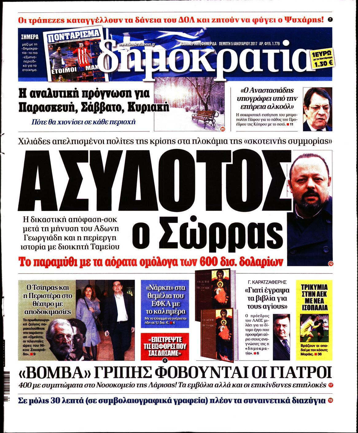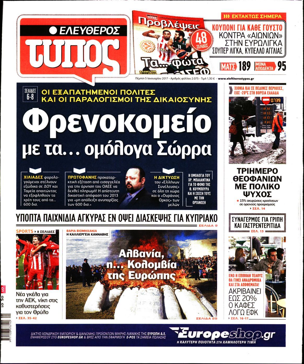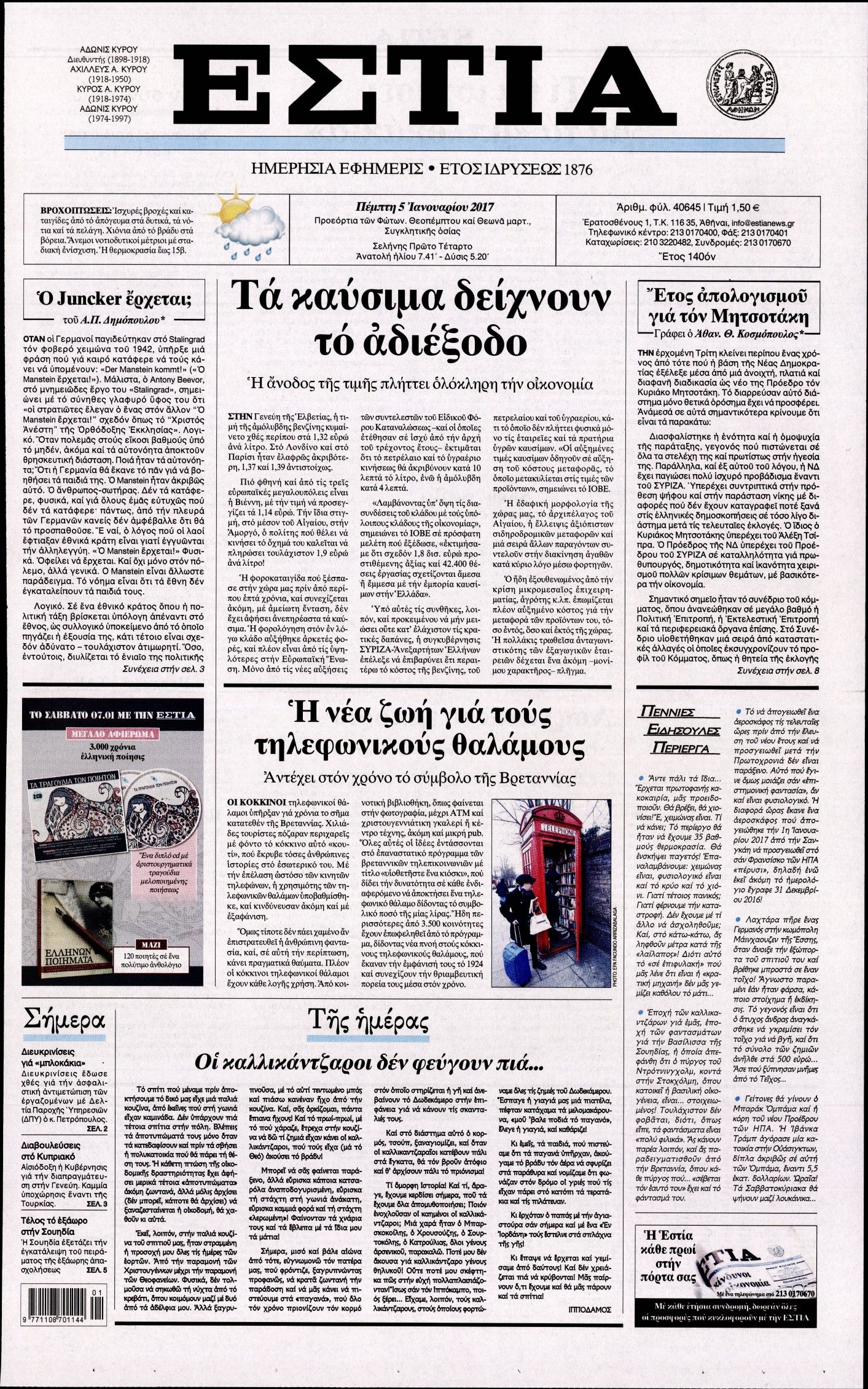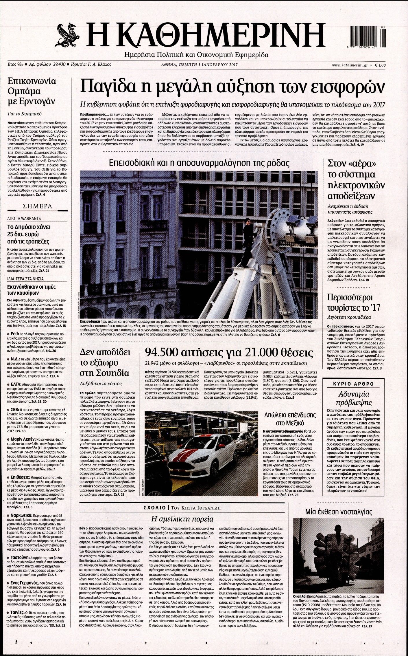 Οι πολιτικές εφημερίδες 05/01/2017 Enikos Newsroom 01:22, Πέμπτη 05 Ιανουαρίου 2017 Media Διαβάστε τα σημερινά πρωτοσέλιδα των πολιτικών εφημερίδων: ΠΟΛΙΤΙΚΕΣ ΕΦΗΜΕΡΙΔΕΣ ΠΡΩΤΟΣΕΛΙΔΑ Μοιράσου το: σχολίασε κι εσύ (0 σχόλια) Ακολουθήστε το enikos.gr στο Google News και μάθετε πρώτοι όλες τις ειδήσεις Δείτε όλες τις τελευταίες ειδήσεις από την Ελλάδα και τον Κόσμο στο enikos.gr Ειδήσεις Ροή Ειδήσεων 2 λεπτά πριν Live streaming – Ο Μάκης Βορίδης στο στούντιο του Realfm 97,8 σε μια εφ’ όλης της ύλης συνέντευξη στον Νίκο Χατζηνικολάου 2 ώρες πριν Σίδνεϊ: Βίντεο με ηλικιωμένο ζευγάρι που όρμησε για να σταματήσει τον έναν δράστη – Συγκλονιστικές μαρτυρίες για τους «ήρωες μέχρι τέλους» 28 λεπτά πριν Κατρίνης: «Ο μικρός μου γιος οδηγούσε χωρίς δίπλωμα, πράξη αδικαιολόγητη και παράνομη – Ο νόμος ισχύει για όλους» 24 λεπτά πριν Τσιάρας: Καλούμε τους αγρότες να έρθουν να συζητήσουμε για την επίλυση του θέματος 2 ώρες πριν «Το θαύμα των Χριστουγέννων»: Σκύλος που εξαφανίστηκε το 2021 βρέθηκε σε καταφύγιο ζώων σε απόσταση 3.200 χιλιομέτρων – ΒΙΝΤΕΟ 1 ώρα πριν Τέλος η μοναξιά για 3 ζώδια μετά τις 16 Δεκεμβρίου – «Ξαναβρίσκετε τον εαυτό σας» 3 ώρες πριν Ανακαλύφθηκε περίτεχνη μαρμάρινη μπανιέρα που επαναχρησιμοποιήθηκε ως κρήνη 2 ώρες πριν Η πεθερά της την κατηγορεί πως δεν την ταΐζει σωστά – «Δεν παραπονιέται όμως στον γιο της» 13 λεπτά πριν Οι άνθρωποι που φαίνονται «τυχεροί» στη ζωή τους, συνήθως έχουν αυτές τις 8 αθόρυβες συνήθειες 2 λεπτά πριν Live streaming – Ο Μάκης Βορίδης στο στούντιο του Realfm 97,8 σε μια εφ’ όλης της ύλης συνέντευξη στον Νίκο Χατζηνικολάου 2 λεπτά πριν Ολυμπιακός – Βαλένθια: Επιστροφή στις νίκες «ψάχνουν» οι Ερυθρόλευκοι 7 λεπτά πριν Ακούστε το σχόλιο του Νίκου Χατζηνικολάου 16/12/2025 13 λεπτά πριν Οι άνθρωποι που φαίνονται «τυχεροί» στη ζωή τους, συνήθως έχουν αυτές τις 8 αθόρυβες συνήθειες 13 λεπτά πριν Καινούργιου: «Με την εγκυμοσύνη προς το παρόν ξεχνάω, δεν βλέπω, δεν ακούω…» ENIKOS NETWORK Οι ρίζες της άνοιας ίσως βρίσκονται στην παιδική ηλικία – Τι έδειξαν πρόσφατες μελέτες Όμιλος ΠΡΟΣΥΦΑΠΕ: Επιστρέφει στην κοινωνία τμήμα της υπεραξίας που παράγει Τα μυστικά για τις μεταβιβάσεις ακινήτων – Αναλυτικός οδηγός Προϋπολογισμός 2026: Η ομιλία Μητσοτάκη στη Βουλή- Τι θα πει για το αγροτικό, το στεγαστικό και το πακέτο μέτρων του 2026 Σύγχρονος Νοστράδαμος: Προειδοποιεί για «μεγάλο γεγονός» τους επόμενους μήνες που θα συγκλονίσει τη Βρετανία και τον κόσμο Τεστ παρατηρητικότητας: Μπορείτε να βρείτε τις 3 διαφορές στις εικόνες με έναν πιγκουίνο σε 14 δευτερόλεπτα περισσότερα 09:58 , Τρίτη 16 Δεκεμβρίου 2025 LIVE – Ακούστε την εκπομπή του Νίκου Χατζηνικολάου 16/12/2025 Ακούστε την εκπομπή του Νίκου Χατζηνικολάου, στον Realfm 97,8. Ακούστε LIVE εδώ 09:26 , Τρίτη 16 Δεκεμβρίου 2025 Τηλεθέαση (15/12): Τα νούμερα για την prime time – Ποιες σειρές ξεχώρισαν Ξεκάθαρη πρωτιά στην τηλεθέαση κατέκτησε η σειρά «Μια νύχτα μόνο», η οποία βρέθηκε στην κορυφή... 08:00 , Τρίτη 16 Δεκεμβρίου 2025 Την Κυριακή με τη Realnews: Δωροεπιταγή 10€ Δωροεπιταγή αξίας 10€ για αγορές άνω των 60€ από τα πολυκαταστήματα FactoryOutlet H προσφορά ι... 05:48 , Τρίτη 16 Δεκεμβρίου 2025 Οι οικονομικές εφημερίδες 16/12/2025 Διαβάστε τα πρωτοσέλιδα από τις οικονομικές εφημερίδες, σήμερα 16/12/2025. ΤΕΛΕΥΤΑΙΕΣ ΕΙΔΗΣΕΙΣ 7 λεπτά πριν Ακούστε το σχόλιο του Νίκου Χατζηνικολάου 16/12/2025 13 λεπτά πριν Οι άνθρωποι που φαίνονται «τυχεροί» στη ζωή τους,... 13 λεπτά πριν Καινούργιου: «Με την εγκυμοσύνη προς το παρόν ξεχνάω,..