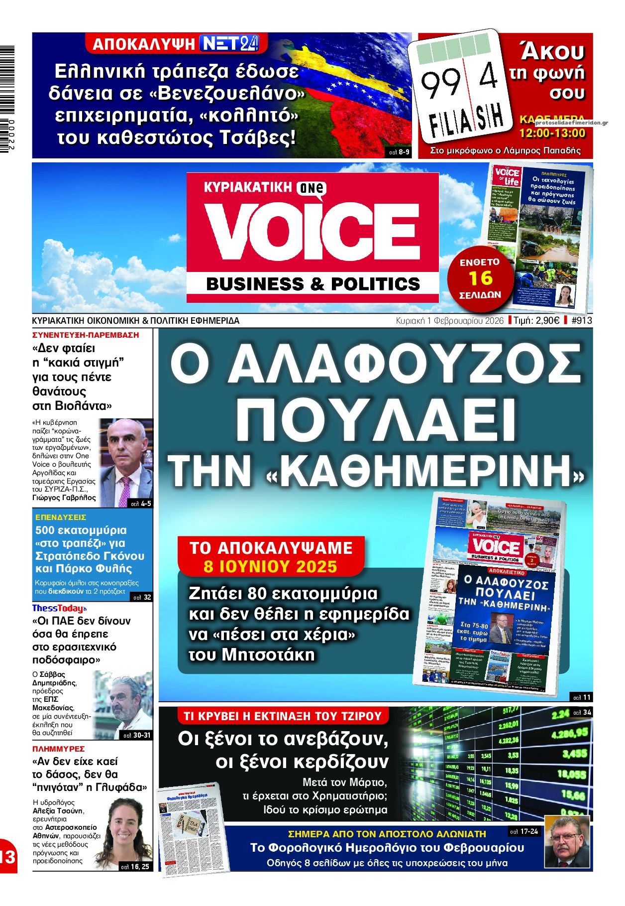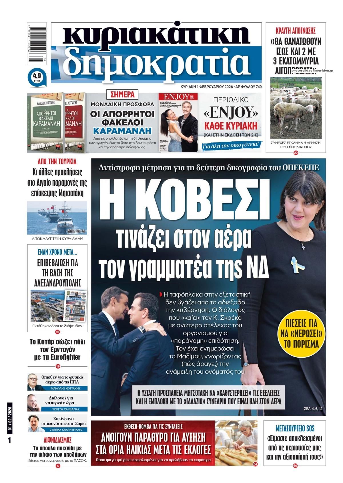 Οι πολιτικές εφημερίδες 1/2/2026 Enikos Newsroom 05:38, Κυριακή 01 Φεβρουαρίου 2026 Media Διαβάστε τα πρωτοσέλιδα από τις πολιτικές εφημερίδες, σήμερα 1/2/2026. ΕΦΗΜΕΡΙΔΕΣ ΠΟΛΙΤΙΚΕΣ ΕΦΗΜΕΡΙΔΕΣ ΠΡΩΤΟΣΕΛΙΔΑ Μοιράσου το: Κακοκαιρία: Αλλεπάλληλα μηνύματα από το 112 για περιορισμό μετακινήσεων – Θα «χτυπήσει» σε δύο φάσεις στην Αττική, νέο έκτακτο δελτίο από την ΕΜΥ Ο Τραμπ ισχυρίζεται ότι οι ΗΠΑ βρίσκονται σε συνομιλίες με το Ιράν Ιράν: «Δραστηριότητα» στα πυρηνικά εργοστάσια δείχνουν δορυφορικές εικόνες σχολίασε κι εσύ (0 σχόλια) Ακολουθήστε το enikos.gr στο Google News και μάθετε πρώτοι όλες τις ειδήσεις Δείτε όλες τις τελευταίες ειδήσεις από την Ελλάδα και τον Κόσμο στο enikos.gr Ειδήσεις Ροή Ειδήσεων 8 ώρες πριν Κακοκαιρία: Αλλεπάλληλα μηνύματα από το 112 για περιορισμό μετακινήσεων – Θα «χτυπήσει» σε δύο φάσεις στην Αττική, νέο έκτακτο δελτίο από την ΕΜΥ 8 ώρες πριν «Βιολάντα»: Δεν έχει βρεθεί το ακριβές σημείο από όπου ξεκίνησε η διαρροή αερίου – Οι καταγγελίες εργαζομένων και ο νέος κύκλος καταθέσεων 9 ώρες πριν Υπόθεση Έπσταϊν: Οι αναφορές σε Χάρβεϊ Γουάινσταϊν και Jay-Z προκαλούν «σεισμό» – Η καταγγελία γυναίκας για σεξουαλική επίθεση 8 ώρες πριν Εξαφάνιση Λόρας: «Η αεροπορική δεν απάντησε ποτέ στην ΕΛ.ΑΣ.» – Γιατί είχε φωτογραφίσει το διαβατήριο της μητέρας της 10 ώρες πριν Μάικλ Τζάκσον: «Βόμβα» από ηχητικά ντοκουμέντα που έρχονται στο φως – Η ανατριχιαστική εξομολόγηση του «βασιλιά της ποπ» για τα παιδιά 42 λεπτά πριν Οπτική ψευδαίσθηση: Μόνο το 1% των ανθρώπων θα βρει τον σκύλο σε 11 δευτερόλεπτα 57 λεπτά πριν Δυσκοιλιότητα: 3 τροφές που προσφέρουν φυσική ανακούφιση, σύμφωνα με μελέτη 4 ώρες πριν Τα ζώδια σήμερα, Κυριακή 1 Φεβρουαρίου 2026: Λέοντες, η Πανσέληνος αποκαλύπτει τα αληθινά συναισθήματά σας 11 ώρες πριν Γιατί οι πιο πιστοί και αφοσιωμένοι άνθρωποι θεωρούνται δεδομένοι: 7 λόγοι σύμφωνα με την ψυχολογία 3 λεπτά πριν Η Realnews που κυκλοφορεί σήμερα 17 λεπτά πριν ΔΕΔΔΗΕ: Διακοπές ρεύματος σήμερα (1/2) στην Αθήνα και σε άλλες 5 περιοχές της Αττικής 35 λεπτά πριν Ο 22χρονος ομογενής Γιώργος Φρανκς κατέρριψε ιστορικό πανελλήνιο ρεκόρ του Κώστα Κεντέρη στα 400 μ. κλειστού στίβου 42 λεπτά πριν Οπτική ψευδαίσθηση: Μόνο το 1% των ανθρώπων θα βρει τον σκύλο σε 11 δευτερόλεπτα 57 λεπτά πριν Δυσκοιλιότητα: 3 τροφές που προσφέρουν φυσική ανακούφιση, σύμφωνα με μελέτη ENIKOS NETWORK Το φυλαχτό του έρωτα που μπορεί να ανεβάσει τη libido και να βελτιώσει τη διάθεση Μούχλα: Πώς τα χαλιά αυξάνουν την υγρασία στο σπίτι – Τι να κάνουμε Δημόσιο: Εξτρά αυξήσεις αποδοχών – Ποιοι και πόσα κερδίζουν από 1η Απριλίου Τι δεν “βλέπει” το ραντάρ της Εφορίας – 21 παροχές και εισοδήματα χωρίς φόρο Σπαζοκεφαλιά: Βρες πόσα 9 υπάρχουν στην εικόνα σε 8 δευτερόλεπτα Τεστ IQ: Μπορείς να εντοπίσεις τον αριθμό 999 ανάμεσα στα 99Q σε 15 δευτερόλεπτα; περισσότερα 05:43 , Κυριακή 01 Φεβρουαρίου 2026 Οι αθλητικές εφημερίδες 1/2/2026 Διαβάστε τα πρωτοσέλιδα από τις αθλητικές εφημερίδες, σήμερα 1/2/2026. 05:00 , Κυριακή 01 Φεβρουαρίου 2026 Σήμερα με τη Realnews: Φονική παράσταση της Colleen Cambridge μαζί real taste & style και μαστορέματα Σήμερα με τη Realnews: Φονική παράσταση της Colleen Cambridge μαζί real taste & style και ... 03:00 , Κυριακή 01 Φεβρουαρίου 2026 Σήμερα με τη Realnews: Ό,τι και αν αγοράσεις, σκανάρεις και κερδίζεις! Σήμερα με τη Realnews: Ό,τι και αν αγοράσεις, σκανάρεις και κερδίζεις! Με το PADU app, το κορυ... ΤΕΛΕΥΤΑΙΕΣ ΕΙΔΗΣΕΙΣ 17 λεπτά πριν ΔΕΔΔΗΕ: Διακοπές ρεύματος σήμερα (1/2) στην Αθήνα και σε... 35 λ