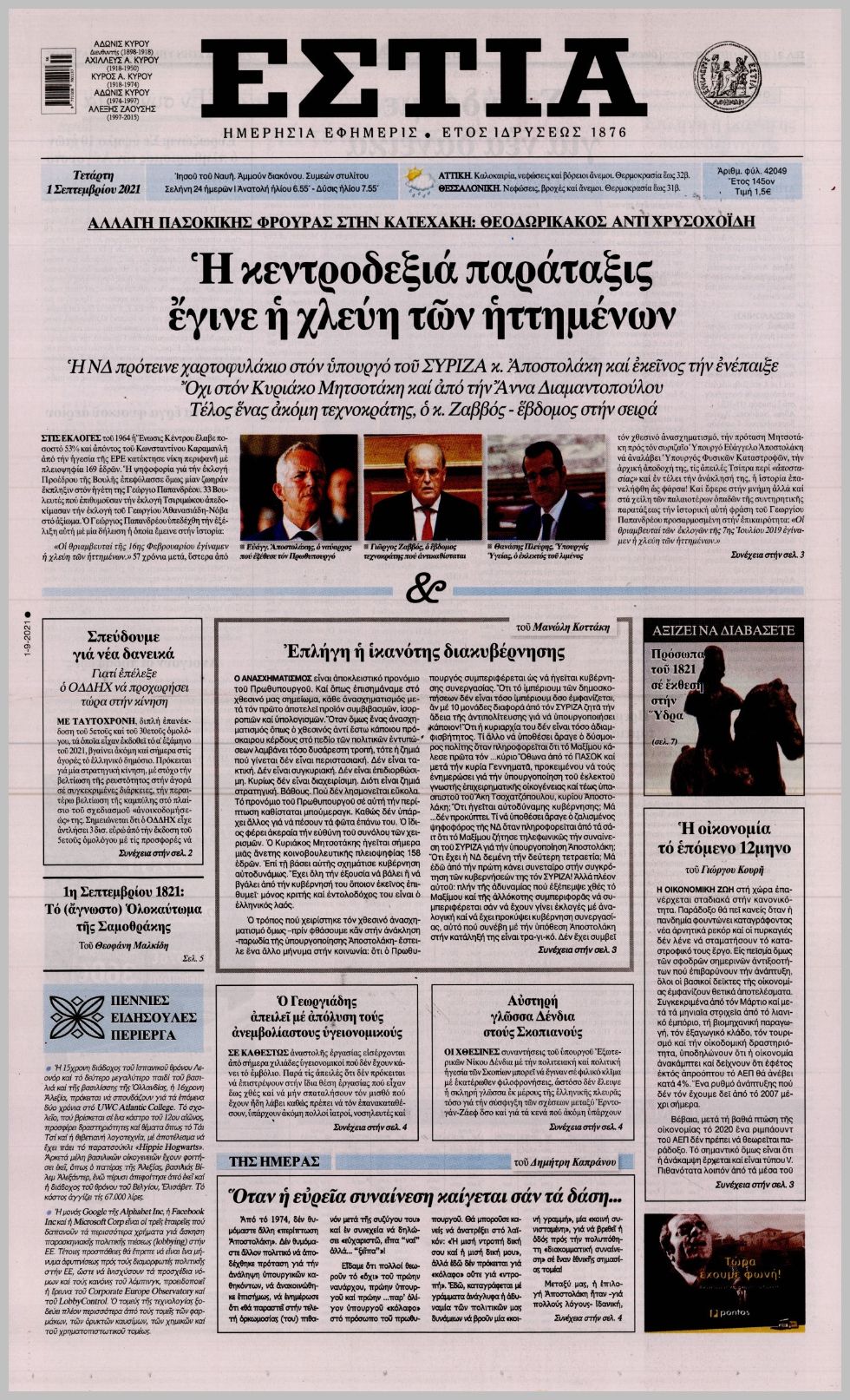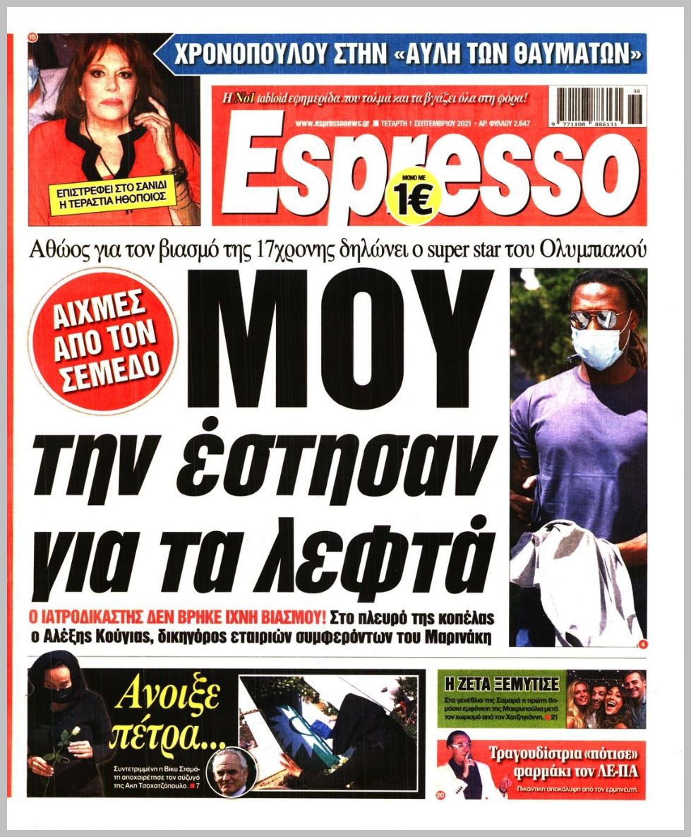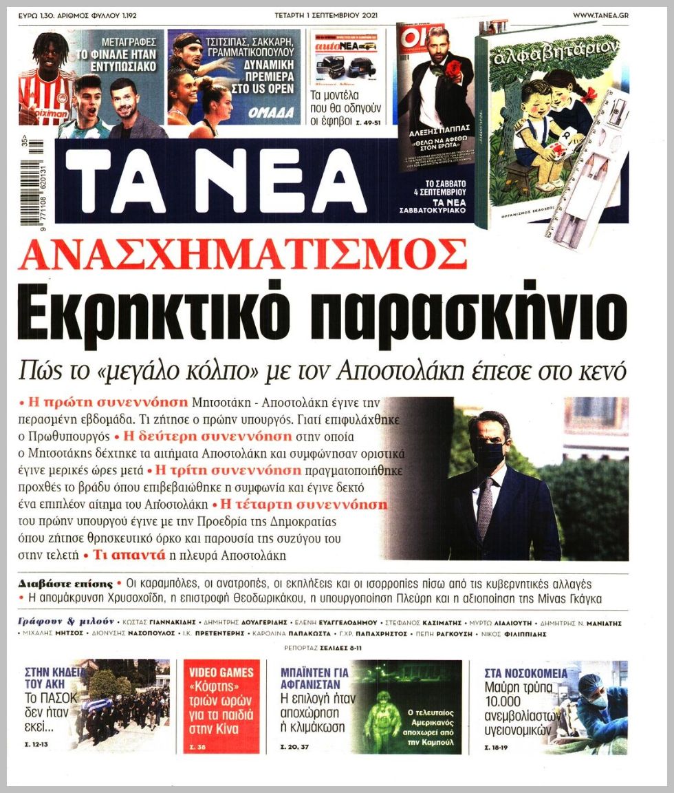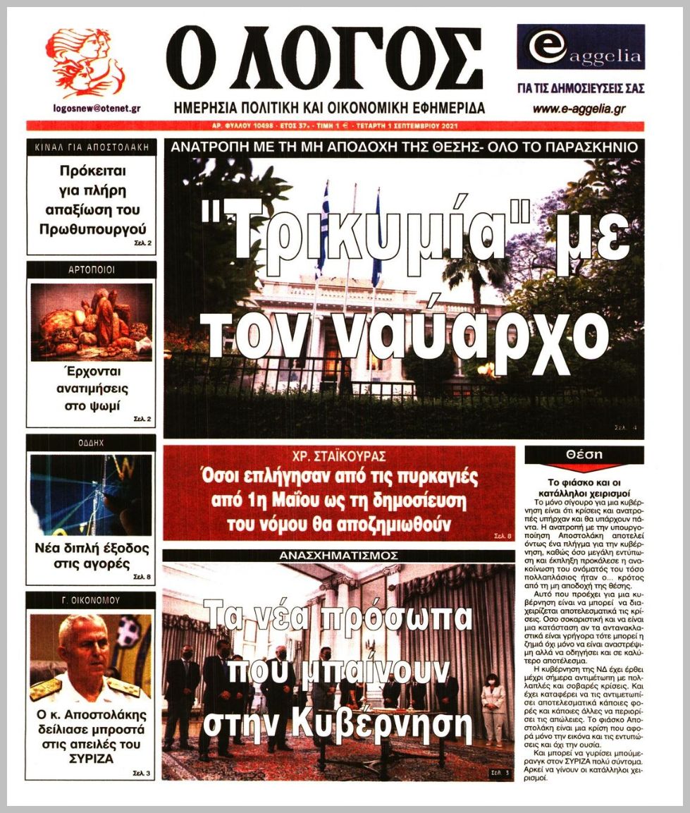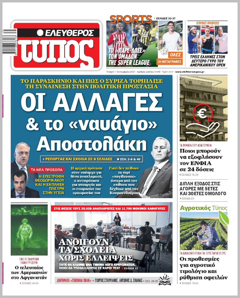 Οι πολιτικές εφημερίδες 1/9/2021 Διονύσης Νίκκας 06:08, Τετάρτη 01 Σεπτεμβρίου 2021 Media Διαβάστε τα πρωτοσέλιδα των πολιτικών εφημερίδων… ΕΦΗΜΕΡΙΔΕΣ ΠΡΩΤΟΣΕΛΙΔΑ Μοιράσου το: σχολίασε κι εσύ (0 σχόλια) Ακολουθήστε το enikos.gr στο Google News και μάθετε πρώτοι όλες τις ειδήσεις Δείτε όλες τις τελευταίες ειδήσεις από την Ελλάδα και τον Κόσμο στο enikos.gr Ειδήσεις Ροή Ειδήσεων 12 λεπτά πριν Θεσσαλονίκη: Βίντεο από τη στιγμή της έκρηξης σε υποκατάστημα τράπεζας στον Εύοσμο – Δεν προηγήθηκε τηλεφώνημα από τους δράστες 3 ώρες πριν Πόλεμος στην Ουκρανία: Γιατί η Ρωσία αναμένεται να απορρίψει το νέο ειρηνευτικό σχέδιο – Τα 2 σημεία που δεν κάνει πίσω ο Πούτιν 30 λεπτά πριν Σέρρες: Σαρώνουν πεδιάδα και βουνό για την εξαφάνιση του πυροσβέστη – Άκαρπες οι έρευνες – ΒΙΝΤΕΟ 4 ώρες πριν Τροχαίο στην Ημαθία: Θρήνος για τον θάνατο του 22χρονου – Συγκλονίζουν οι εικόνες από το σημείο της τραγωδίας 5 ώρες πριν Φρικτός θάνατος για 2χρονη: Έπεσε σε ποτάμι και την κατασπάραξαν πιράνχας 1 ώρα πριν Τα 5 ζώδια που θα δουν επιτέλους βελτίωση στα ερωτικά τους τον Ιανουάριο του 2026 – «Θα ζήσετε μία ουσιαστική και σταθερή αγάπη» 6 ώρες πριν Νιώθετε περισσότερη μοναξιά τα Χριστούγεννα; Η ψυχολογία αποκαλύπτει τα 7 χαρακτηριστικά που μάλλον διαθέτετε 5 ώρες πριν Γυναίκα που διαγνώστηκε με καρκίνο του παχέος εντέρου προειδοποιεί: «Αυτή είναι η πιο ύπουλη πτυχή της νόσου» 2 ώρες πριν Το μυστικό του Αϊνστάιν σε ένα μικροτσίπ: Ανακαλύφθηκε η κρυφή γεωμετρία που «δαμάζει» τα ηλεκτρόνια όπως η βαρύτητα 4 λεπτά πριν Ζαχάροβα: Υπάρχει «αργή αλλά σταθερή πρόοδος» στις ειρηνευτικές συνομιλίες με τις ΗΠΑ 12 λεπτά πριν Θεσσαλονίκη: Βίντεο από τη στιγμή της έκρηξης σε υποκατάστημα τράπεζας στον Εύοσμο – Δεν προηγήθηκε τηλεφώνημα από τους δράστες 20 λεπτά πριν Κουίζ για την παλιά Αθήνα: Αναγνωρίζετε την οδό; Έχετε περάσει 100% από εκεί 22 λεπτά πριν Λάκης Γαβαλάς: Είχα την αξιοπρέπειά μου στη φυλακή, έβγαινα να προαυλιστώ και έκαναν οι κρατούμενοι στην άκρη για να περάσω 30 λεπτά πριν Σέρρες: Σαρώνουν πεδιάδα και βουνό για την εξαφάνιση του πυροσβέστη – Άκαρπες οι έρευνες – ΒΙΝΤΕΟ ENIKOS NETWORK 12 Χριστουγεννιάτικες υπερτροφές που πρέπει να συμπεριλάβετε στο γιορτινό τραπέζι – Είναι νόστιμες και θα σας χορτάσουν Οι επιστήμονες βρήκαν το μυστικό της μακροζωίας – Ποιοι μπορεί να ξεπεράσουν τα 100, σύμφωνα με μελέτη Χειμερινές εκπτώσεις 2026: Πότε κάνουν πρεμιέρα και τι πρέπει να γνωρίζουν οι καταναλωτές για τις αγορές τους στα καταστήμα... ΔΥΠΑ: Έρχονται 2.000 νέες θέσεις εργασίας για ανέργους σε δήμους- Όλες οι λεπτομέρειες Ο Google Assistant θα παραμείνει λίγο περισσότερο για ορισμένους χρήστες Android Τεστ προσωπικότητας: Το βάζο που θα επιλέξετε αποκαλύπτει πώς λύνετε προβλήματα στη ζωή σας περισσότερα 14:14 , Πέμπτη 25 Δεκεμβρίου 2025 Την Κυριακή με τη Realnews: Ό,τι και αν αγοράσεις, σκανάρεις και κερδίζεις! Την Κυριακή με τη Realnews: Ό,τι και αν αγοράσεις, σκανάρεις και κερδίζεις! Με το PADU app, το... 11:58 , Πέμπτη 25 Δεκεμβρίου 2025 Ρεκόρ Γκίνες: Το White Christmas το πιο επιτυχημένο single όλων των εποχών σε φυσική μορφή – Βίντεο Το «White Christmas» είναι το πιο επιτυχημένο single όλων των εποχών σε φυσική μορφή, με περίπ... 10:11 , Πέμπτη 25 Δεκεμβρίου 2025 Αυτή την Κυριακή με τη Realnews: Το μυστήριο των Χριστουγέννων – Οι γιορτές στη Νέα Υόρκη παίρνουν μια αναπάντεχη τροπή, σε ένα συγκλονιστικό θρίλερ από τη συγγραφέα Vicki Delany Αυτή την Κυριακή με τη Realnews: Το μυστήριο των Χρισ
