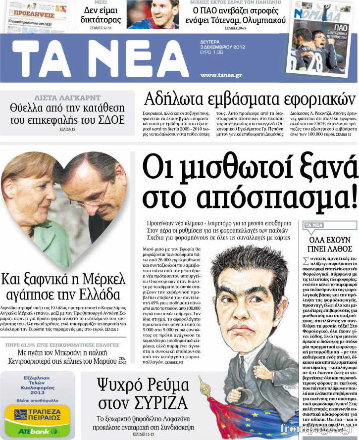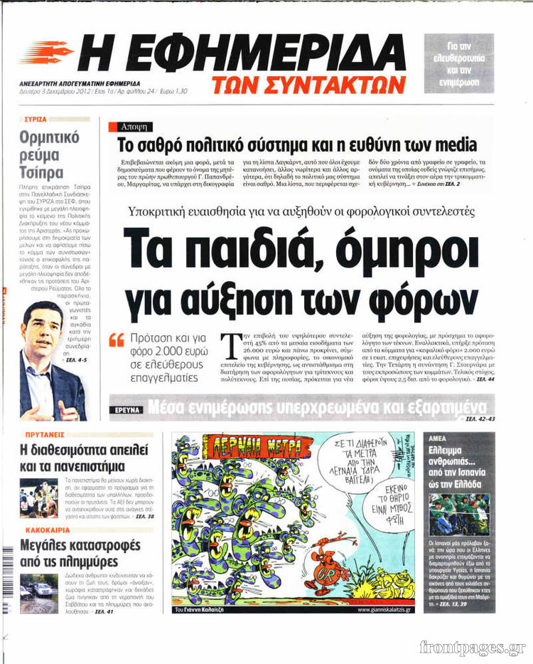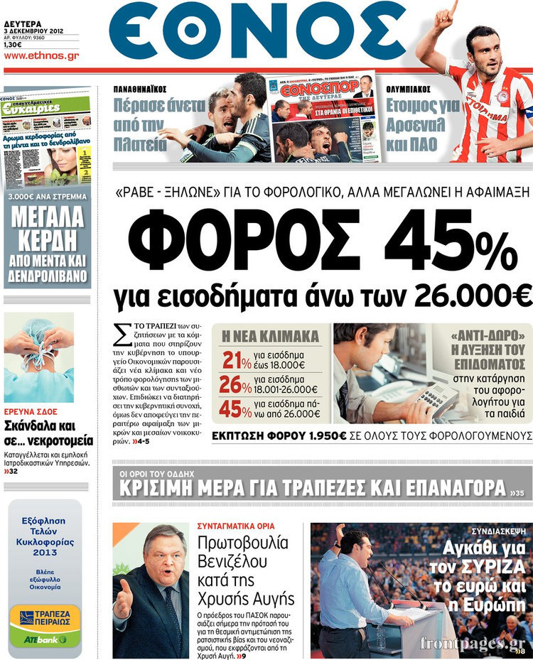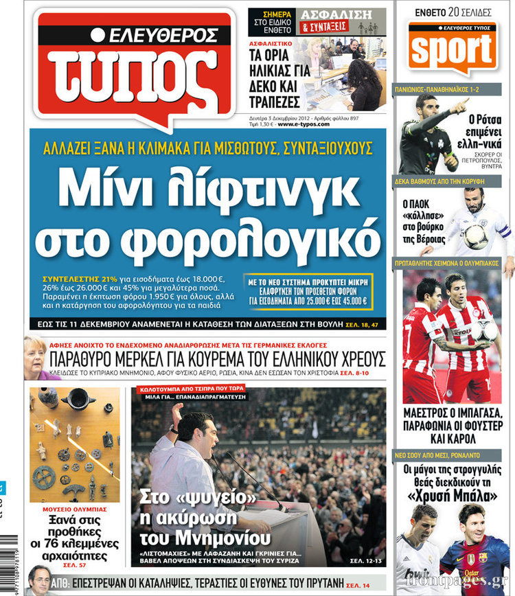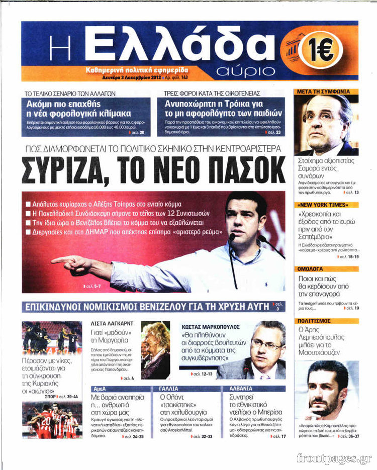 Οι πολιτικές εφημερίδες Enikos Newsroom 08:55, Δευτέρα 03 Δεκεμβρίου 2012 Media Οι πολιτικές εφημερίδες Τα σημερινά πρωτοσέλιδα των πολιτικών εφημερίδων. ΑΘΛΗΤΙΚΑ ΑΘΛΗΤΙΚΕΣ ΕΦΗΜΕΡΙΔΕΣ ΕΦΗΜΕΡΙΔΕΣ ΠΡΩΤΟΣΕΛΙΔΑ Μοιράσου το: σχολίασε κι εσύ (0 σχόλια) Ακολουθήστε το enikos.gr στο Google News και μάθετε πρώτοι όλες τις ειδήσεις Δείτε όλες τις τελευταίες ειδήσεις από την Ελλάδα και τον Κόσμο στο enikos.gr Ειδήσεις Ροή Ειδήσεων 2 ώρες πριν Δημοσκόπηση Metron Analysis: Στις 10 μονάδες η διαφορά ΝΔ-ΠΑΣΟΚ, στην 3η θέση η Πλεύση Ελευθερίας – 8 στους 10 στηρίζουν τον αγώνα των αγροτών 6 ώρες πριν Αγρότες: «Όχι στον διάλογο, μας εμπαίζει η κυβέρνηση» – Αποφάσισαν κλιμάκωση των κινητοποιήσεων, τι θα γίνει τα Χριστούγεννα 2 ώρες πριν Νίκος Παππάς στον ΑΝΤ1: «Δεν κρύβομαι – Μετά το συμβάν ακολούθησα κανονικά το πρόγραμμά μου» – ΒΙΝΤΕΟ 3 ώρες πριν Αθήνα: Εξαρθρώθηκε εγκληματική οργάνωση που διακινούσε ναρκωτικά σε μορφή σοκολάτας – Δύο τράπερ ανάμεσα στους 4 συλληφθέντες – ΒΙΝΤΕΟ 1 ώρα πριν Διαμαντής Καραναστάσης: Οδηγούσε υπό την επήρεια αλκοόλ – Του αφαιρέθηκε το δίπλωμα και του επιβλήθηκε πρόστιμο 350 ευρώ 2 ώρες πριν Manifesting: Πώς να συναντήσετε τον σύντροφο της ζωής σας, ανάλογα με τον μήνα γέννησής σας 4 ώρες πριν Γάμος: 11 ψυχρές αλλά ευγενικές φράσεις, που λέει ένας άνδρας όταν σκέφτεται τον χωρισμό 3 ώρες πριν Σφουγγάρισμα: Η συνήθεια που θα σας βοηθήσει να διατηρήσετε το σπίτι σας καθαρό και τακτοποιημένο 2 ημέρες πριν 20 χρόνια τα Χριστούγεννα ξεκινούν στα Public με μεγάλη ποικιλία σε δώρα! 3 λεπτά πριν Ούρσουλα φον ντερ Λάιεν: Μετατίθεται για τον Ιανουάριο η υπογραφή της εμπορικής συμφωνίας «ΕΕ-MERCOSUR» 8 λεπτά πριν Φοινικούντα: Το Σάββατο απολογείται ο 30χρονος γιος γνωστού επιχειρηματία της Πλάκας που παραδόθηκε – Όσα είπε στους αστυνομικούς και ο ρόλος του στο έγκλημα 18 λεπτά πριν Αυξάνουν την πίεση προς την κυβέρνηση οι αγρότες: Κλείνουν παρακαμπτήριους και ανοίγουν διόδια – Τι θα γίνει τις γιορτές 23 λεπτά πριν Ελισάβετ Κωνσταντινίδου για τον Γεράσιμο Μιχελή και την Πόπη Χριστοδούλου: «Ξέρω ότι έχουν πάει απλώς κάπου αλλού, ότι δεν είναι ο θάνατος έτσι όπως τον έχουμε στο μυαλό μας» 27 λεπτά πριν Κρήτη: Νέες αποκαλύψεις για τον 54χρονο που κατηγορείται ότι εξαπάτησε τους γονείς του 33χρονου – Ζητούσε τρίχες αγνοουμένων ENIKOS NETWORK Σε περίοδο αυξημένης δραστηριότητας η γρίπη στην Ελλάδα-Μέτρα προστασίας από τον ΕΟΔΥ Σκέφτεστε συνέχεια συζητήσεις που έχετε κάνει; Τι σημαίνει αυτό, σύμφωνα με ειδικό Λαγκάρντ: Αισιόδοξη για την ανάπτυξη της Ευρωζώνης, αβέβαιη για τον πληθωρισμό ΑΣΕΠ 2ΓΒ/2025: Σήμερα αρχίζει η υποβολή ενστάσεων – Πότε θα βγουν τα οριστικά αποτελέσματα Χαρτογραφώντας το «σημείο χωρίς επιστροφή»: Για πρώτη φορά αποκαλύπτεται με λεπτομέρεια το ακανθώδες όριο της ατμόσφαιρας τ... Η Google καταργεί τη λειτουργία «dark web report» – Πώς θα μπορούν οι χρήστες να διαγράφουν τα δεδομένα τους περισσότερα 17:45 , Πέμπτη 18 Δεκεμβρίου 2025 ROUK ZOUK: Εορταστικό επεισόδιο με καλεσμένους τους πρωταγωνιστές του «Γιατί ρε πατέρα» Το Σάββατο 20 Δεκεμβρίου στις 21:00, η Ζέτα Μακρυπούλια υποδέχεται εκλεκτούς ηθοποιούς που όλο... 17:20 , Πέμπτη 18 Δεκεμβρίου 2025 Άγιος έρωτας: Η Χριστίνα εξομολογείται στον πατέρα Νικόλαο, απόψε στις 21:00 στον Alpha Η Νότα αποφασίζει να εκδικηθεί τον Πέτρο και τον Στέφανο, για χάρη του Λούη, όμως τα πράγματα ... 16:50 , Πέμπτη 18 Δεκεμβρίου 2025 Να μ’ αγαπάς: Ζωή και Φωτεινή συμφιλιώνονται ως μάνα με κόρη, α