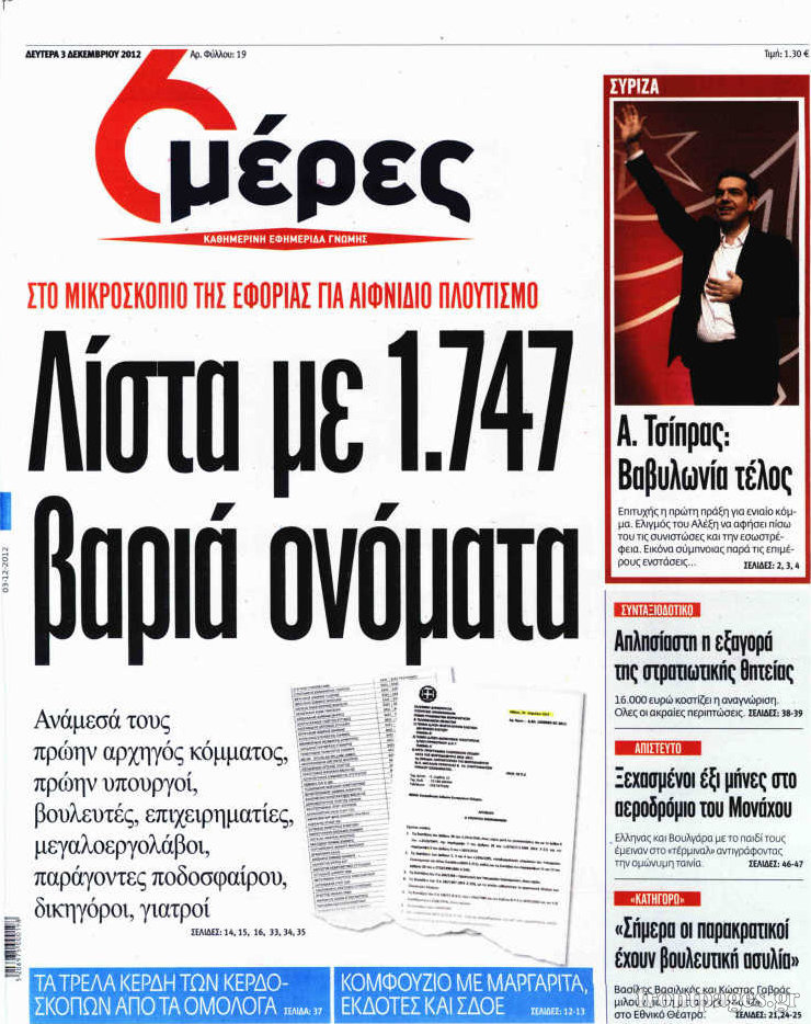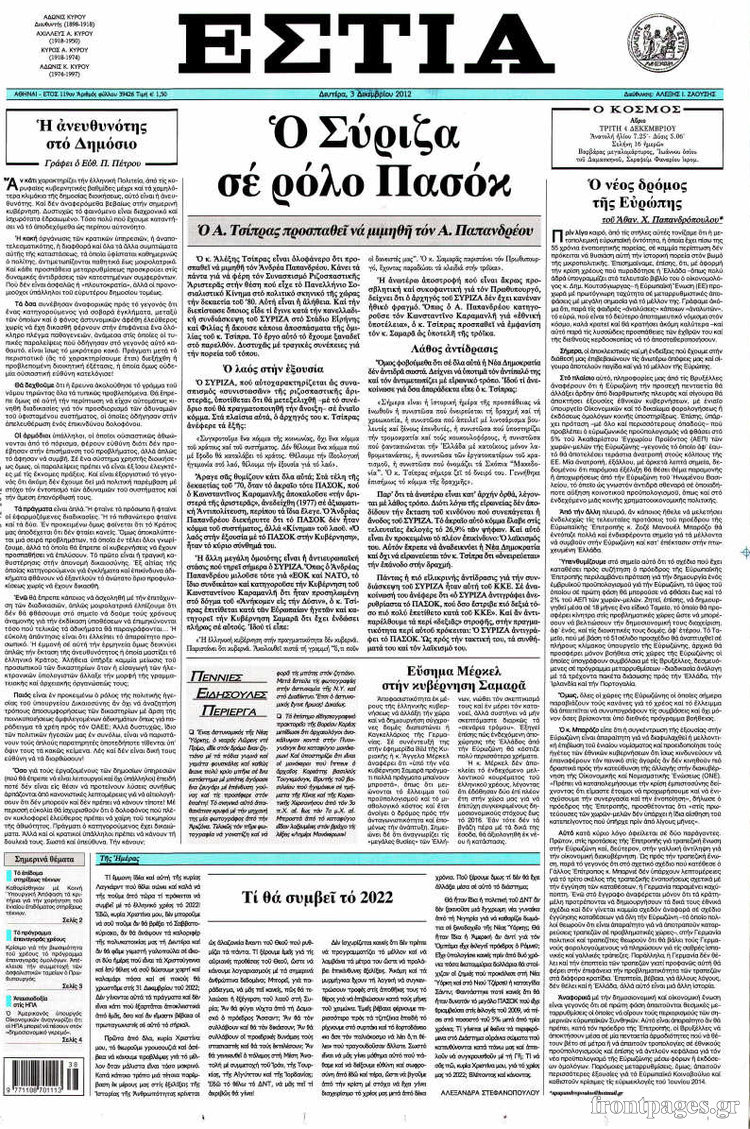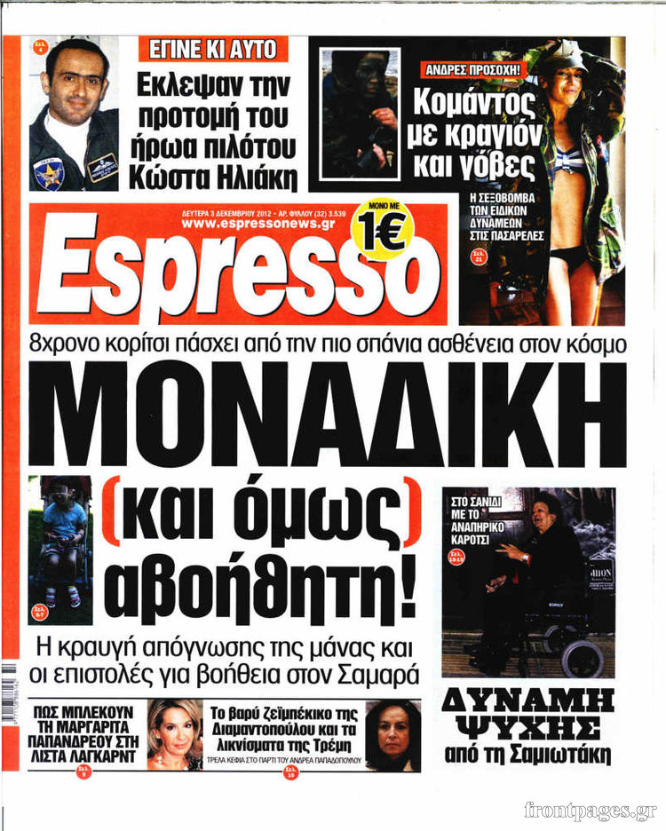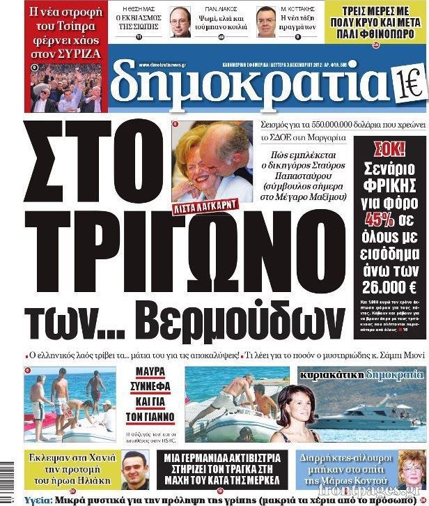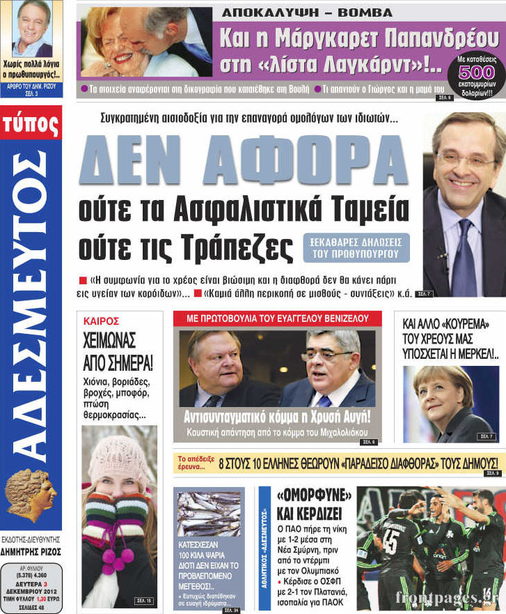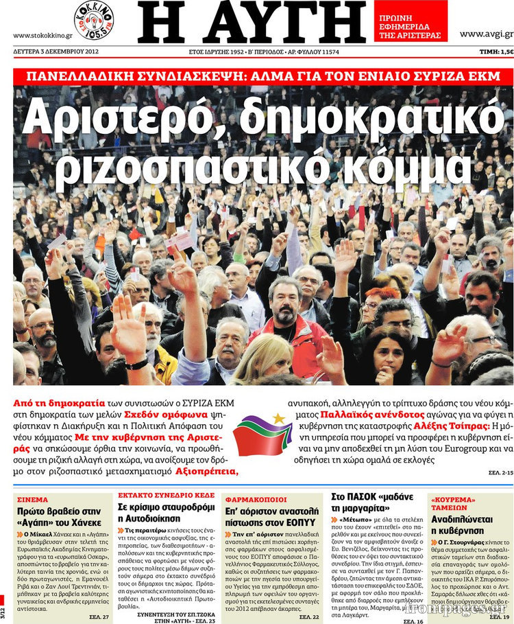 Οι πολιτικές εφημερίδες Enikos Newsroom 08:55, Δευτέρα 03 Δεκεμβρίου 2012 Media Οι πολιτικές εφημερίδες Τα σημερινά πρωτοσέλιδα των πολιτικών εφημερίδων. ΑΘΛΗΤΙΚΑ ΑΘΛΗΤΙΚΕΣ ΕΦΗΜΕΡΙΔΕΣ ΕΦΗΜΕΡΙΔΕΣ ΠΡΩΤΟΣΕΛΙΔΑ Μοιράσου το: σχολίασε κι εσύ (0 σχόλια) Ακολουθήστε το enikos.gr στο Google News και μάθετε πρώτοι όλες τις ειδήσεις Δείτε όλες τις τελευταίες ειδήσεις από την Ελλάδα και τον Κόσμο στο enikos.gr Ειδήσεις Ροή Ειδήσεων 2 ώρες πριν Δημοσκόπηση Metron Analysis: Στις 10 μονάδες η διαφορά ΝΔ-ΠΑΣΟΚ, στην 3η θέση η Πλεύση Ελευθερίας – 8 στους 10 στηρίζουν τον αγώνα των αγροτών 6 ώρες πριν Αγρότες: «Όχι στον διάλογο, μας εμπαίζει η κυβέρνηση» – Αποφάσισαν κλιμάκωση των κινητοποιήσεων, τι θα γίνει τα Χριστούγεννα 2 ώρες πριν Νίκος Παππάς στον ΑΝΤ1: «Δεν κρύβομαι – Μετά το συμβάν ακολούθησα κανονικά το πρόγραμμά μου» – ΒΙΝΤΕΟ 3 ώρες πριν Αθήνα: Εξαρθρώθηκε εγκληματική οργάνωση που διακινούσε ναρκωτικά σε μορφή σοκολάτας – Δύο τράπερ ανάμεσα στους 4 συλληφθέντες – ΒΙΝΤΕΟ 1 ώρα πριν Διαμαντής Καραναστάσης: Οδηγούσε υπό την επήρεια αλκοόλ – Του αφαιρέθηκε το δίπλωμα και του επιβλήθηκε πρόστιμο 350 ευρώ 2 ώρες πριν Manifesting: Πώς να συναντήσετε τον σύντροφο της ζωής σας, ανάλογα με τον μήνα γέννησής σας 4 ώρες πριν Γάμος: 11 ψυχρές αλλά ευγενικές φράσεις, που λέει ένας άνδρας όταν σκέφτεται τον χωρισμό 3 ώρες πριν Σφουγγάρισμα: Η συνήθεια που θα σας βοηθήσει να διατηρήσετε το σπίτι σας καθαρό και τακτοποιημένο 2 ημέρες πριν 20 χρόνια τα Χριστούγεννα ξεκινούν στα Public με μεγάλη ποικιλία σε δώρα! 3 λεπτά πριν Ούρσουλα φον ντερ Λάιεν: Μετατίθεται για τον Ιανουάριο η υπογραφή της εμπορικής συμφωνίας «ΕΕ-MERCOSUR» 8 λεπτά πριν Φοινικούντα: Το Σάββατο απολογείται ο 30χρονος γιος γνωστού επιχειρηματία της Πλάκας που παραδόθηκε – Όσα είπε στους αστυνομικούς και ο ρόλος του στο έγκλημα 18 λεπτά πριν Αυξάνουν την πίεση προς την κυβέρνηση οι αγρότες: Κλείνουν παρακαμπτήριους και ανοίγουν διόδια – Τι θα γίνει τις γιορτές 23 λεπτά πριν Ελισάβετ Κωνσταντινίδου για τον Γεράσιμο Μιχελή και την Πόπη Χριστοδούλου: «Ξέρω ότι έχουν πάει απλώς κάπου αλλού, ότι δεν είναι ο θάνατος έτσι όπως τον έχουμε στο μυαλό μας» 27 λεπτά πριν Κρήτη: Νέες αποκαλύψεις για τον 54χρονο που κατηγορείται ότι εξαπάτησε τους γονείς του 33χρονου – Ζητούσε τρίχες αγνοουμένων ENIKOS NETWORK Σε περίοδο αυξημένης δραστηριότητας η γρίπη στην Ελλάδα-Μέτρα προστασίας από τον ΕΟΔΥ Σκέφτεστε συνέχεια συζητήσεις που έχετε κάνει; Τι σημαίνει αυτό, σύμφωνα με ειδικό Λαγκάρντ: Αισιόδοξη για την ανάπτυξη της Ευρωζώνης, αβέβαιη για τον πληθωρισμό ΑΣΕΠ 2ΓΒ/2025: Σήμερα αρχίζει η υποβολή ενστάσεων – Πότε θα βγουν τα οριστικά αποτελέσματα Χαρτογραφώντας το «σημείο χωρίς επιστροφή»: Για πρώτη φορά αποκαλύπτεται με λεπτομέρεια το ακανθώδες όριο της ατμόσφαιρας τ... Η Google καταργεί τη λειτουργία «dark web report» – Πώς θα μπορούν οι χρήστες να διαγράφουν τα δεδομένα τους περισσότερα 17:45 , Πέμπτη 18 Δεκεμβρίου 2025 ROUK ZOUK: Εορταστικό επεισόδιο με καλεσμένους τους πρωταγωνιστές του «Γιατί ρε πατέρα» Το Σάββατο 20 Δεκεμβρίου στις 21:00, η Ζέτα Μακρυπούλια υποδέχεται εκλεκτούς ηθοποιούς που όλο... 17:20 , Πέμπτη 18 Δεκεμβρίου 2025 Άγιος έρωτας: Η Χριστίνα εξομολογείται στον πατέρα Νικόλαο, απόψε στις 21:00 στον Alpha Η Νότα αποφασίζει να εκδικηθεί τον Πέτρο και τον Στέφανο, για χάρη του Λούη, όμως τα πράγματα ... 16:50 , Πέμπτη 18 Δεκεμβρίου 2025 Να μ’ αγαπάς: Ζωή και Φωτεινή συμφιλιώνονται ως μάνα με κόρη, α
