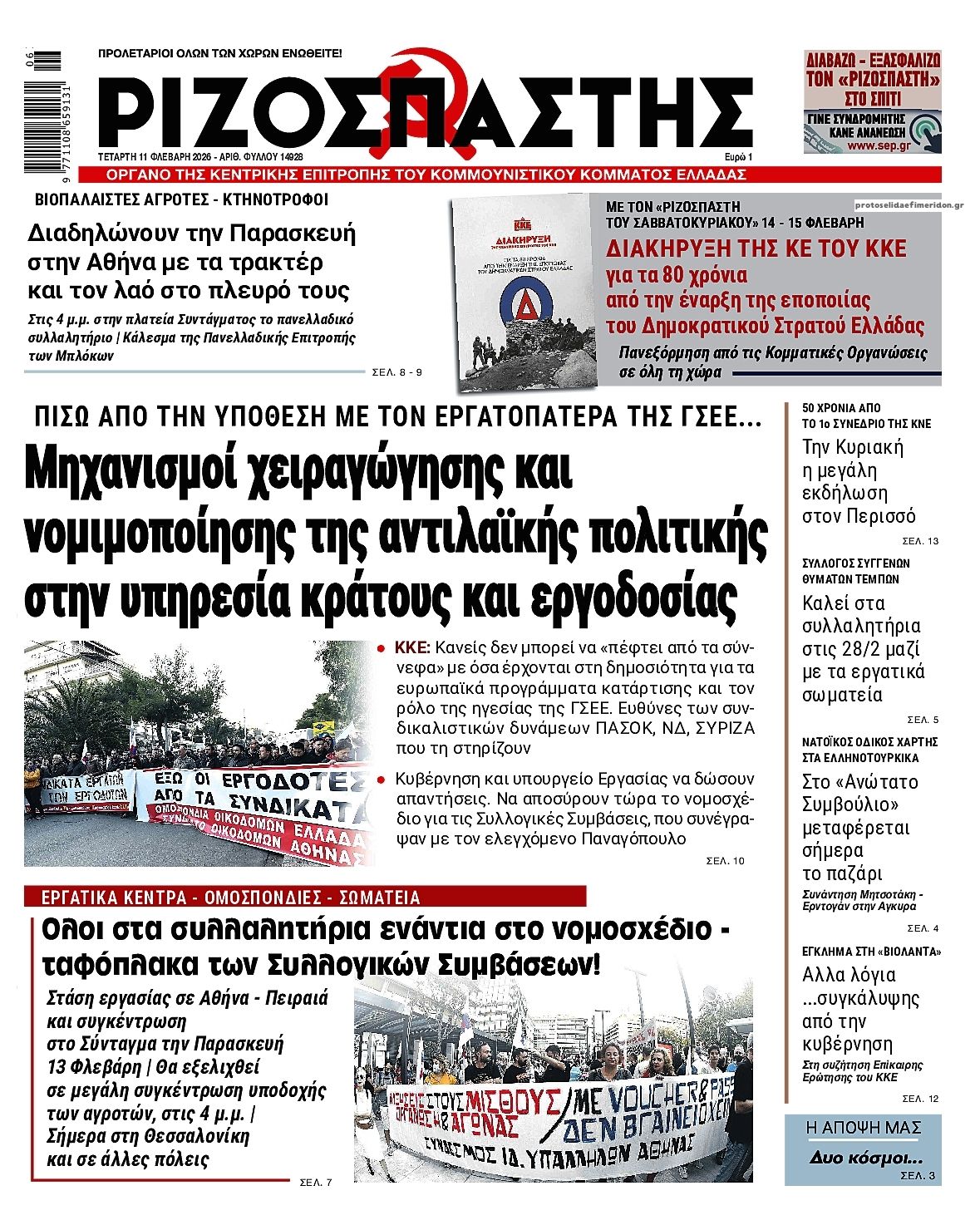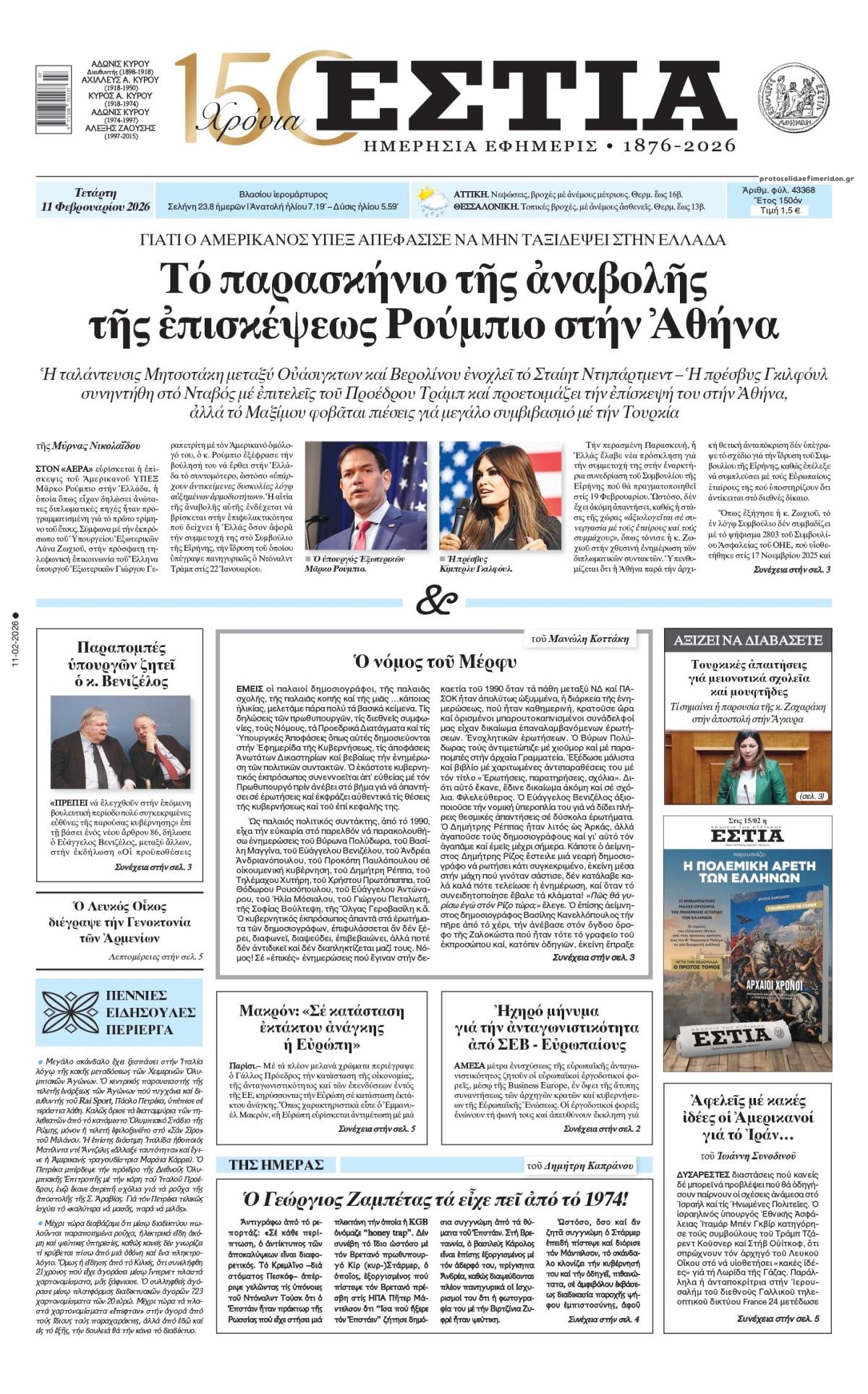 Οι πολιτικές εφημερίδες 11/2/2026 Enikos Newsroom 05:38, Τετάρτη 11 Φεβρουαρίου 2026 Media Διαβάστε τα πρωτοσέλιδα από τις πολιτικές εφημερίδες, σήμερα 11/2/2026. ΕΦΗΜΕΡΙΔΕΣ ΠΟΛΙΤΙΚΕΣ ΕΦΗΜΕΡΙΔΕΣ ΠΡΩΤΟΣΕΛΙΔΑ Μοιράσου το: ΗΠΑ: Ο Τραμπ θα ακυρώσει θεμελιώδη κλιματική ρύθμιση του Ομπάμα για την προστασία του περιβάλλοντος από εκπομπές αερίων Έκρηξη Γεωργιάδη κατά Ανδρουλάκη για Παναγόπουλο: «Αν τον θεωρούσε κλέφτη γιατί τον στήριζε;» – «Μπούρδες τα περί απευθείας αναθέσεων» Αποκαλύψεις-σοκ για τον Έπσταϊν: Σωφρονιστικοί υπάλληλοι φέρονται να έβγαλαν «ψεύτικο πτώμα» για να παραπλανήσουν τα ΜΜΕ σχολίασε κι εσύ (0 σχόλια) Ακολουθήστε το enikos.gr στο Google News και μάθετε πρώτοι όλες τις ειδήσεις Δείτε όλες τις τελευταίες ειδήσεις από την Ελλάδα και τον Κόσμο στο enikos.gr Ειδήσεις Ροή Ειδήσεων 8 ώρες πριν Σμήναρχος: Η έρευνα για την πρόσβαση σε ευαίσθητα δεδομένα από την προηγούμενη υπηρεσία του – Το χρονικό μέχρι την προφυλάκιση και οι ισχυρισμοί για απειλές 7 ώρες πριν ΗΠΑ: Οι 6 δισεκατομμυριούχοι στους φακέλους Επστάιν που έκρυψε το υπουργείο Δικαιοσύνης – Καταγγελίες για ευρύτερη συγκάλυψη 8 ώρες πριν Μητσοτάκης – Ερντογάν: Ραντεβού στην Άγκυρα με στόχο να μείνουν ανοιχτοί οι δίαυλοι επικοινωνίας – Η ατζέντα, οι προσδοκίες και οι στόχοι των δύο πλευρών 3 ώρες πριν Ευρωπαϊκή Επιτροπή: Σχέδιο Δράσης κατά του διαδικτυακού εκφοβισμού για την προστασία παιδιών και εφήβων 8 ώρες πριν Τραμπ: Η Προεδρία του μπορεί να θεωρηθεί ως παρένθεση και όχι ως μόνιμη αλλαγή – Η προοπτική μιας αμερικανικής «Παλινόρθωσης» παραμένει 9 ώρες πριν Δύο προφυλακίσεις για το κύκλωμα με τα λαθραία τσιγάρα – Αύριο οι απολογίες των «εγκεφάλων» 11 ώρες πριν Υπουργείο Παιδείας: Οι προτάσεις για το νέο Λύκειο και το Εθνικό Απολυτήριο – Μείωση της ύλης και των εξεταζόμενων μαθημάτων στη Γ’ Λυκείου 16 ώρες πριν Χειμερινοί Ολυμπιακοί Αγώνες 2026: Ουκρανός αθλητής κατηγορεί τη ΔΟΕ για «προδοσία» – Απαγόρευσε το «κράνος μνήμης» με εικόνες νεκρών αθλητών 24 ώρες πριν Συντάξεις Μαρτίου: Ποιοι συνταξιούχοι θα πληρωθούν νωρίτερα – Αυτές είναι οι ημερομηνίες που «κλείδωσαν» 22 ώρες πριν Στεγαστική κρίση και κοινωνικοοικονομικές επιπτώσεις στην Ελλάδα: Το κόστος, η ποιότητα και η προσβασιμότητα με βάση τα στοιχεία της Eurostat 16 λεπτά πριν ΗΠΑ: Στη Φλόριντα η πρώτη εκτέλεση θανατοποινίτη για το 2026 31 λεπτά πριν ΔΕΔΔΗΕ: Διακοπές ρεύματος σήμερα (11/2) στην Αθήνα και σε άλλες 17 περιοχές της Αττικής 45 λεπτά πριν Οπτική ψευδαίσθηση: Μόνο αν έχετε παρατηρητικότητα ντετέκτιβ, θα εντοπίσετε το κουμπί στην εικόνα σε 9 δευτερόλεπτα 56 λεπτά πριν Δημοσιογράφοι χωρίς Σύνορα (RSF): Καλούν τον Παύλο Μαρινάκη να ανακαλέσει απειλές κατά δημοσιογράφου για ερώτηση σχετική με το ναυάγιο στη Χίο 1 ώρα πριν Αρτηριακή πίεση: Το φρούτο που είναι πλούσιο σε κάλιο και μπορεί να την μειώσει, σύμφωνα με μελέτη ENIKOS NETWORK Έχετε βλέμμα καρχαρία; Μπορείτε να εντοπίσετε το μοναδικό 4312 ανάμεσα σε όλα τα 4321 και να λύσετε το τεστ οπτικής αντίληψ... Το βότανο του Αμάρακου που μπορεί να ανακουφίσει από το άγχος και να αντιμετωπίσει τα συμπτώματα του συνδρόμου πολυκυστικών... Πόσο θα κοστίσει η Τσικνοπέμπτη – Ανατιμήσεις έως 13% στα κρέατα ΜΙΔΑ: Τι θα δηλώσουν οι ιδιοκτήτες ακινήτων Ευπάθεια στο moltbook ai αποκαλύπτει email, tokens σύνδεσης και api keys Αυτός είναι ο ρόλος της μικρής τρύπας στους νυχοκόπτες – «Είμαι ο μόνος που δεν το ήξερε;»» περισσότερα 23:11 , Τρίτη 10 Φεβ