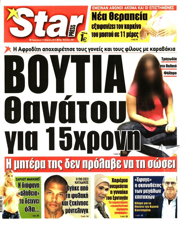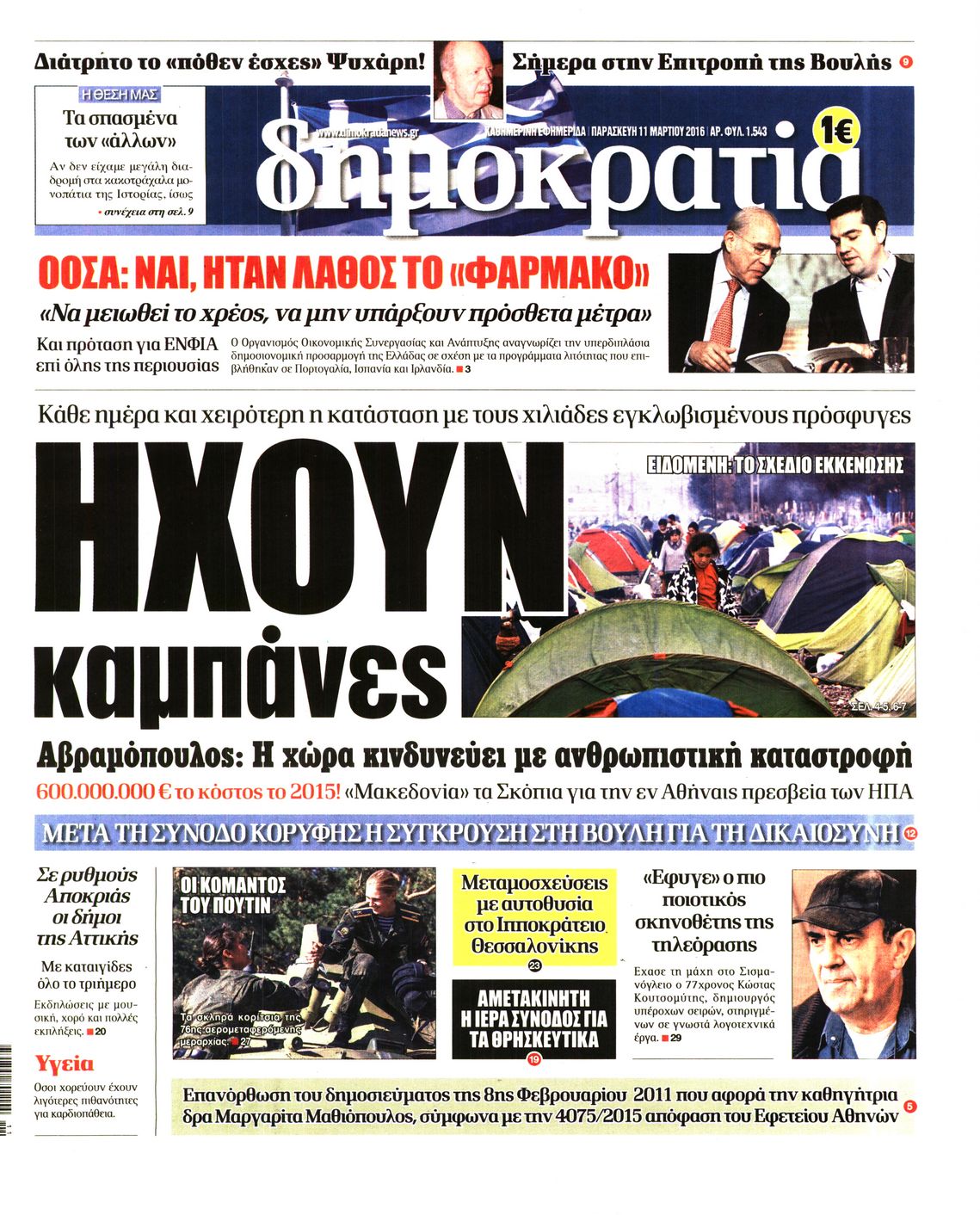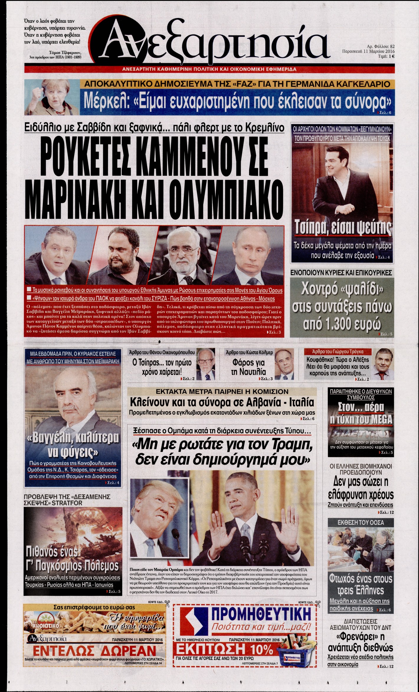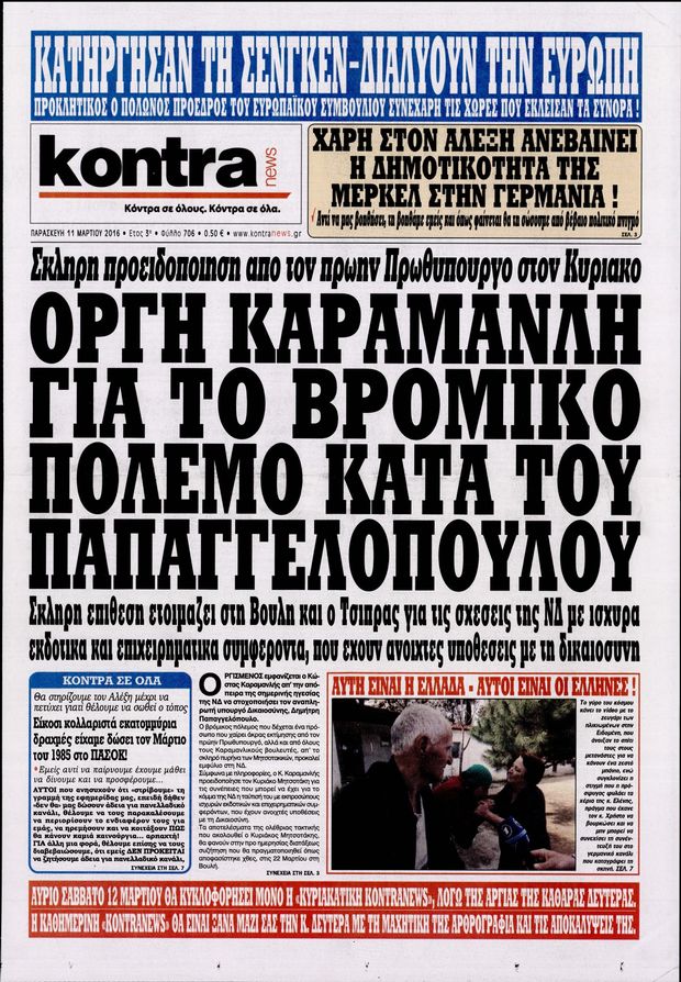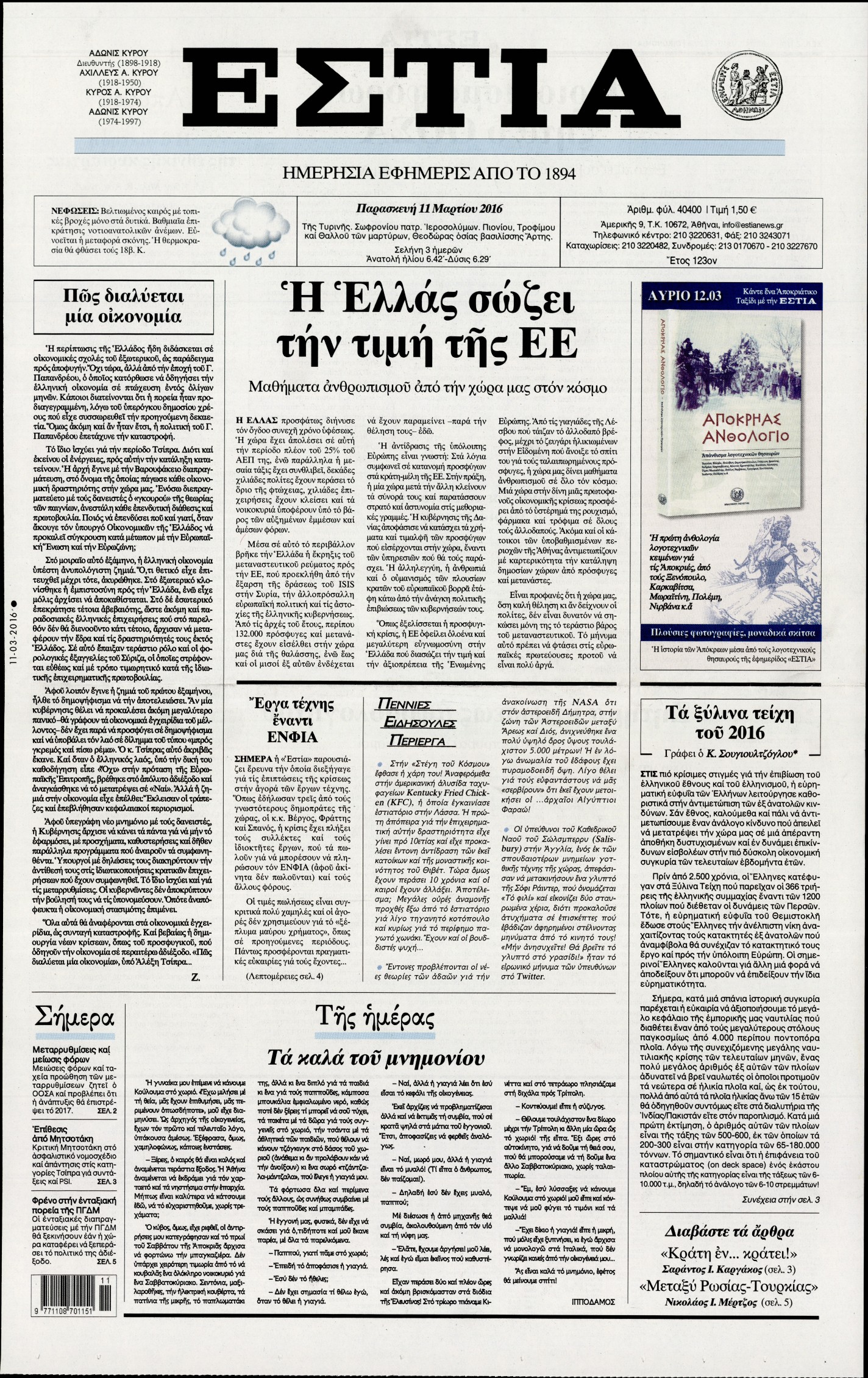 Οι πολιτικές εφημερίδες 11-3-2016 Enikos Newsroom 05:48, Παρασκευή 11 Μαρτίου 2016 Media Διαβάστε τα σημερινά πρωτοσέλιδα των πολιτικών εφημερίδων: ΠΟΛΙΤΙΚΕΣ ΕΦΗΜΕΡΙΔΕΣ ΠΡΩΤΟΣΕΛΙΔΑ Μοιράσου το: σχολίασε κι εσύ (0 σχόλια) Ακολουθήστε το enikos.gr στο Google News και μάθετε πρώτοι όλες τις ειδήσεις Δείτε όλες τις τελευταίες ειδήσεις από την Ελλάδα και τον Κόσμο στο enikos.gr Ειδήσεις Ροή Ειδήσεων 3 ώρες πριν Χριστούγεννα στα μπλόκα: Επιμένουν στις κινητοποιήσεις τους οι αγρότες – Ανοίγουν τα διόδια το Σαββατοκύριακο 3 ώρες πριν Ουκρανία: Η άνευ προηγουμένου επίθεση σε ρωσικό τάνκερ στη Μεσόγειο και το μήνυμα προς στον Πούτιν – Το «μακρύ χέρι» του Κιέβου 3 ώρες πριν Πούτιν: Τα μηνύματα σε Ευρώπη και ΝΑΤΟ από το μαραθώνιο «σόου» του – Η απαίτηση για «σεβασμό» και η ειρήνη «με τους όρους» της Μόσχας 3 ώρες πριν Τραμπ: Δεν αποκλείει την πιθανότητα ενός πολέμου στη Βενεζουέλα – «Ο Μαδούρο ξέρει καλύτερα από τον καθένα τι ακριβώς θέλω» 4 ώρες πριν Συνεχίζει να προκαλεί ο Μίτσκοσκι: «Για μένα το όνομα Μακεδονία είναι ιερό» 3 ώρες πριν Ανακαλύφθηκαν αρχαία χρυσά νομίσματα 2.200 ετών που απεικονίζουν τον θεό Απόλλωνα – Η άγνωστη σύνδεση με τον Φίλιππο Β΄ της Μακεδονίας 4 ώρες πριν Ύπνος: Μια κρυφή κατάσταση του εγκεφάλου πριν από τον ύπνο μπορεί να είναι το “κλειδί” για υψηλή ευφυΐα και δημιουργικότητα 5 ώρες πριν Αριθμολογία: Οι άνθρωποι που έχουν γεννηθεί αυτές τις 4 ημερομηνίες, συχνά παρεξηγούνται – «Η καλοσύνη τους κρύβει τεράστια δύναμη» 6 ώρες πριν Ξεχάστε το καθάρισμα το Σαββατοκύριακο: Ο «κανόνας των 20 λεπτών» που θα σας λύσει τα χέρια 13 λεπτά πριν Euroleague: Επέστρεψε στις νίκες ο Ολυμπιακός, πήρε την ματσάρα της χρονιάς η Μπάρτσα – Τα αποτελέσματα και η βαθμολογία 28 λεπτά πριν Συρία: Μαζικά πλήγματα των ΗΠΑ σε θέσεις του Ισλαμικού Κράτους – Χέγκσεθ: «Δεν είναι αρχή πολέμου, είναι μια δήλωση εκδίκησης» για το θάνατο των στρατιωτών μας 41 λεπτά πριν Ουκρανία: Ολοκληρώθηκαν οι συνομιλίες με τους Αμερικανούς κι Ευρωπαίους διαπραγματευτές 56 λεπτά πριν Μπαρτσελόνα – Μπασκόνια 134-124: Οι «μπλαουγκράνα» πήραν το ματς της χρονιάς ύστερα από τρεις παρατάσεις 1 ώρα πριν Φαίη Σκορδά: «Παλιότερα τα κομπλιμέντα τα προσπερνούσα, τώρα τα έχω ανάγκη» ENIKOS NETWORK Το ΕΚΑΒ τιμήθηκε από την Ακαδημία Αθηνών για τα 40 χρόνια προσφοράς του Έχετε πραγματικά μεγάλη καρδιά; 10 χαρακτηριστικά όσων έχουν καλοσύνη Αναστολή μέτρων αναγκαστικής εκτέλεσης για κτηνοτρόφους που πλήττονται από την ευλογιά των αιγοπροβάτων Πλήρης επάρκεια προϊόντων στις λαϊκές της Αττικής, παρά τις αγροτικές κινητοποιήσεις – Τι απαντούν οι πωλητές Χαρτογραφώντας το «σημείο χωρίς επιστροφή»: Για πρώτη φορά αποκαλύπτεται με λεπτομέρεια το ακανθώδες όριο της ατμόσφαιρας τ... Η Google καταργεί τη λειτουργία «dark web report» – Πώς θα μπορούν οι χρήστες να διαγράφουν τα δεδομένα τους περισσότερα 22:42 , Παρασκευή 19 Δεκεμβρίου 2025 Γιώργος Γιαννόπουλος για “Το σόι σου”: “Είναι ευτυχία και ευλογία αυτή η σειρά” «Είναι ευτυχία και ευλογία η συγκυρία αυτής της σειράς», θα πει ο Γιώργος Γιαννόπουλος -ο αγαπ... 20:37 , Παρασκευή 19 Δεκεμβρίου 2025 Don’t Forget The Lyrics: Η Έλλη Κοκκίνου υποδέχεται 4 παίκτες που θα κάνουν τα πάντα για να μη χάσουν ούτε… μισή λέξη από τους στίχους Το «Don’t Forget The Lyrics» επιστρέφει απόψε, Παρασκευή 19 Δεκεμβρίου, στις 21:00 με νέο επει... 19:31 , Παρασκευή 19 Δεκεμβρίου 2025 GNTM: Απόψε ο μεγάλος τελικός για τους 4 φιναλίστ Έπειτα από μήνες γεμάτους μόδ