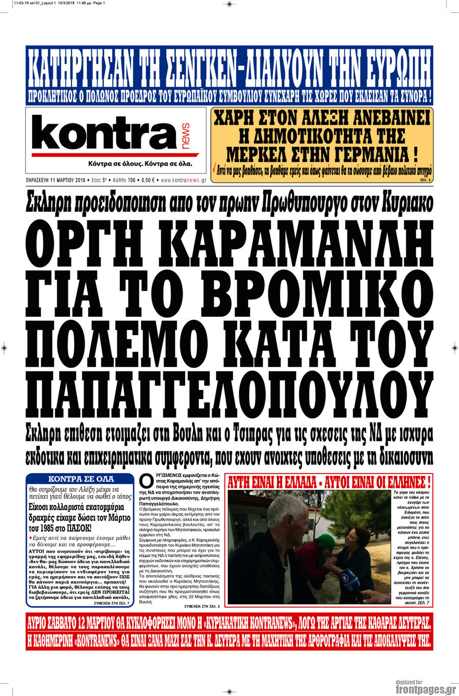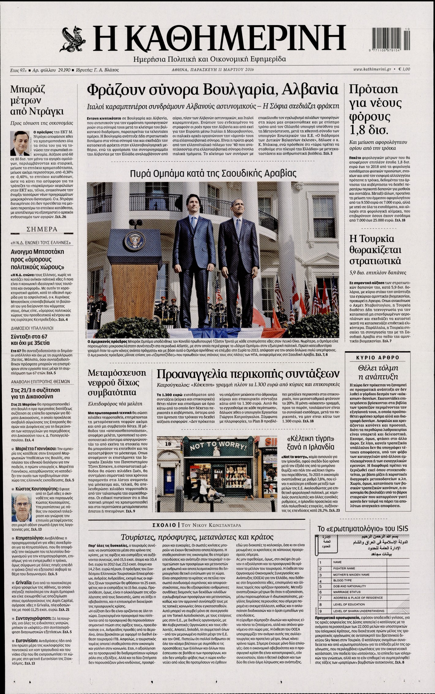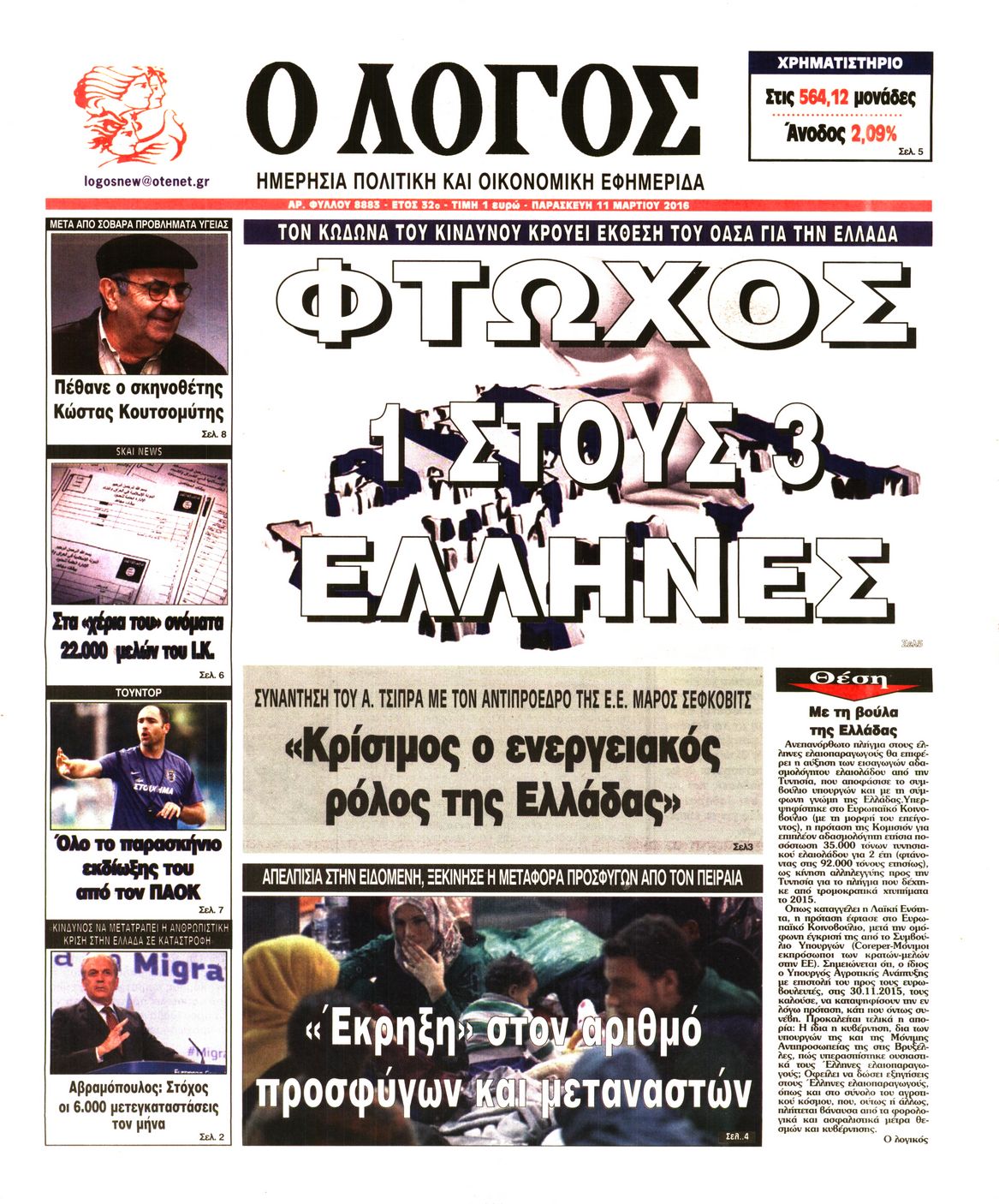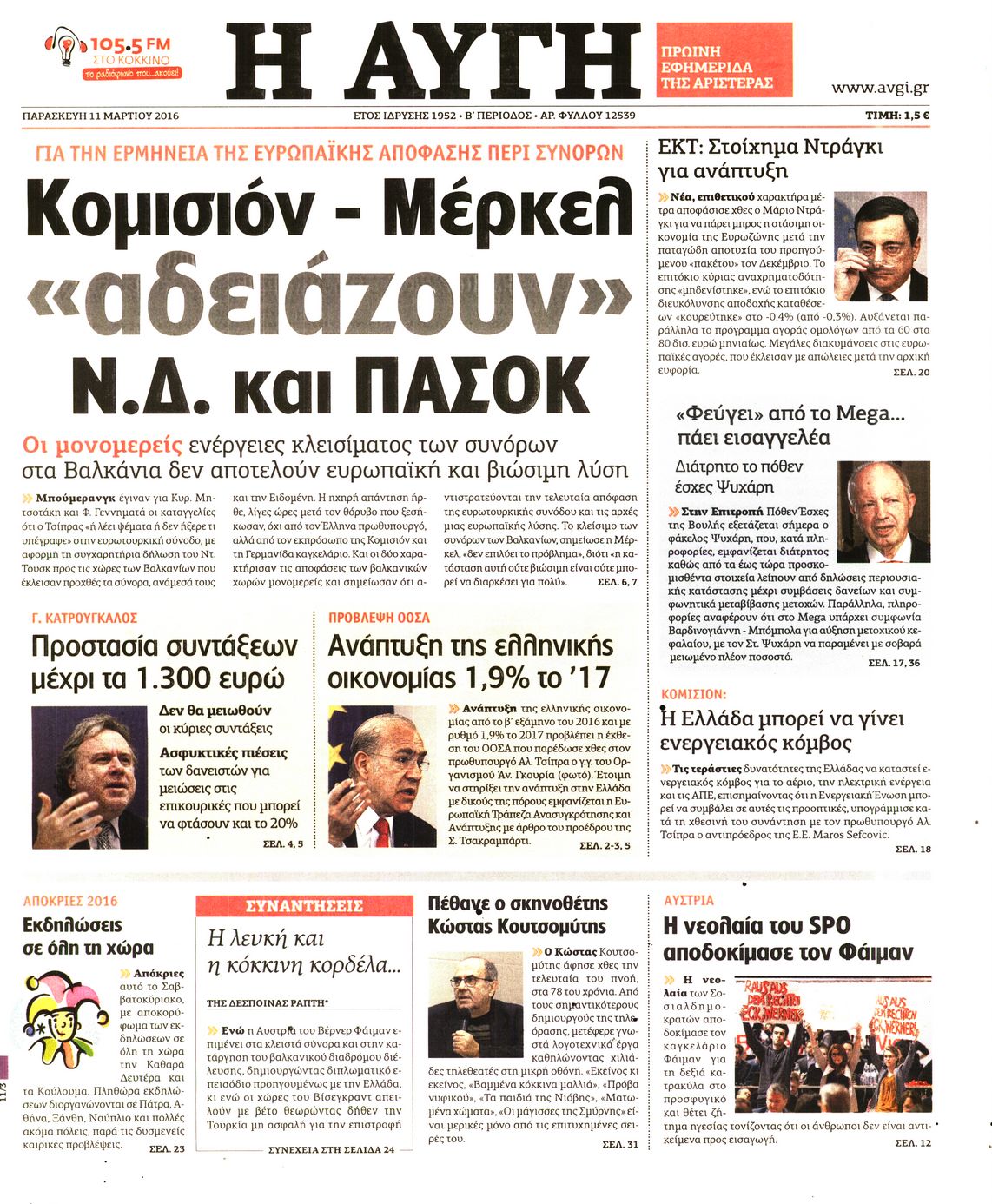 Οι πολιτικές εφημερίδες 11-3-2016 Enikos Newsroom 05:48, Παρασκευή 11 Μαρτίου 2016 Media Διαβάστε τα σημερινά πρωτοσέλιδα των πολιτικών εφημερίδων: ΠΟΛΙΤΙΚΕΣ ΕΦΗΜΕΡΙΔΕΣ ΠΡΩΤΟΣΕΛΙΔΑ Μοιράσου το: σχολίασε κι εσύ (0 σχόλια) Ακολουθήστε το enikos.gr στο Google News και μάθετε πρώτοι όλες τις ειδήσεις Δείτε όλες τις τελευταίες ειδήσεις από την Ελλάδα και τον Κόσμο στο enikos.gr Ειδήσεις Ροή Ειδήσεων 3 ώρες πριν Χριστούγεννα στα μπλόκα: Επιμένουν στις κινητοποιήσεις τους οι αγρότες – Ανοίγουν τα διόδια το Σαββατοκύριακο 3 ώρες πριν Ουκρανία: Η άνευ προηγουμένου επίθεση σε ρωσικό τάνκερ στη Μεσόγειο και το μήνυμα προς στον Πούτιν – Το «μακρύ χέρι» του Κιέβου 3 ώρες πριν Πούτιν: Τα μηνύματα σε Ευρώπη και ΝΑΤΟ από το μαραθώνιο «σόου» του – Η απαίτηση για «σεβασμό» και η ειρήνη «με τους όρους» της Μόσχας 3 ώρες πριν Τραμπ: Δεν αποκλείει την πιθανότητα ενός πολέμου στη Βενεζουέλα – «Ο Μαδούρο ξέρει καλύτερα από τον καθένα τι ακριβώς θέλω» 4 ώρες πριν Συνεχίζει να προκαλεί ο Μίτσκοσκι: «Για μένα το όνομα Μακεδονία είναι ιερό» 3 ώρες πριν Ανακαλύφθηκαν αρχαία χρυσά νομίσματα 2.200 ετών που απεικονίζουν τον θεό Απόλλωνα – Η άγνωστη σύνδεση με τον Φίλιππο Β΄ της Μακεδονίας 4 ώρες πριν Ύπνος: Μια κρυφή κατάσταση του εγκεφάλου πριν από τον ύπνο μπορεί να είναι το “κλειδί” για υψηλή ευφυΐα και δημιουργικότητα 5 ώρες πριν Αριθμολογία: Οι άνθρωποι που έχουν γεννηθεί αυτές τις 4 ημερομηνίες, συχνά παρεξηγούνται – «Η καλοσύνη τους κρύβει τεράστια δύναμη» 6 ώρες πριν Ξεχάστε το καθάρισμα το Σαββατοκύριακο: Ο «κανόνας των 20 λεπτών» που θα σας λύσει τα χέρια 13 λεπτά πριν Euroleague: Επέστρεψε στις νίκες ο Ολυμπιακός, πήρε την ματσάρα της χρονιάς η Μπάρτσα – Τα αποτελέσματα και η βαθμολογία 28 λεπτά πριν Συρία: Μαζικά πλήγματα των ΗΠΑ σε θέσεις του Ισλαμικού Κράτους – Χέγκσεθ: «Δεν είναι αρχή πολέμου, είναι μια δήλωση εκδίκησης» για το θάνατο των στρατιωτών μας 41 λεπτά πριν Ουκρανία: Ολοκληρώθηκαν οι συνομιλίες με τους Αμερικανούς κι Ευρωπαίους διαπραγματευτές 56 λεπτά πριν Μπαρτσελόνα – Μπασκόνια 134-124: Οι «μπλαουγκράνα» πήραν το ματς της χρονιάς ύστερα από τρεις παρατάσεις 1 ώρα πριν Φαίη Σκορδά: «Παλιότερα τα κομπλιμέντα τα προσπερνούσα, τώρα τα έχω ανάγκη» ENIKOS NETWORK Το ΕΚΑΒ τιμήθηκε από την Ακαδημία Αθηνών για τα 40 χρόνια προσφοράς του Έχετε πραγματικά μεγάλη καρδιά; 10 χαρακτηριστικά όσων έχουν καλοσύνη Αναστολή μέτρων αναγκαστικής εκτέλεσης για κτηνοτρόφους που πλήττονται από την ευλογιά των αιγοπροβάτων Πλήρης επάρκεια προϊόντων στις λαϊκές της Αττικής, παρά τις αγροτικές κινητοποιήσεις – Τι απαντούν οι πωλητές Χαρτογραφώντας το «σημείο χωρίς επιστροφή»: Για πρώτη φορά αποκαλύπτεται με λεπτομέρεια το ακανθώδες όριο της ατμόσφαιρας τ... Η Google καταργεί τη λειτουργία «dark web report» – Πώς θα μπορούν οι χρήστες να διαγράφουν τα δεδομένα τους περισσότερα 22:42 , Παρασκευή 19 Δεκεμβρίου 2025 Γιώργος Γιαννόπουλος για “Το σόι σου”: “Είναι ευτυχία και ευλογία αυτή η σειρά” «Είναι ευτυχία και ευλογία η συγκυρία αυτής της σειράς», θα πει ο Γιώργος Γιαννόπουλος -ο αγαπ... 20:37 , Παρασκευή 19 Δεκεμβρίου 2025 Don’t Forget The Lyrics: Η Έλλη Κοκκίνου υποδέχεται 4 παίκτες που θα κάνουν τα πάντα για να μη χάσουν ούτε… μισή λέξη από τους στίχους Το «Don’t Forget The Lyrics» επιστρέφει απόψε, Παρασκευή 19 Δεκεμβρίου, στις 21:00 με νέο επει... 19:31 , Παρασκευή 19 Δεκεμβρίου 2025 GNTM: Απόψε ο μεγάλος τελικός για τους 4 φιναλίστ Έπειτα από μήνες γεμάτους μόδ