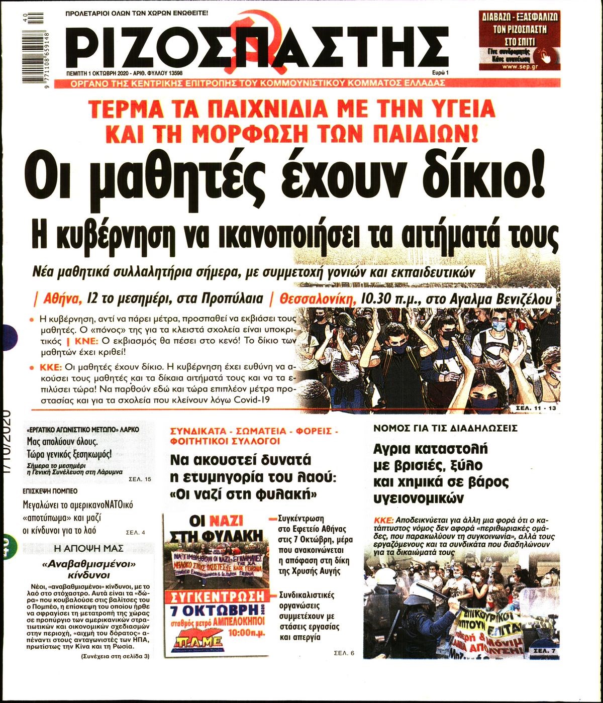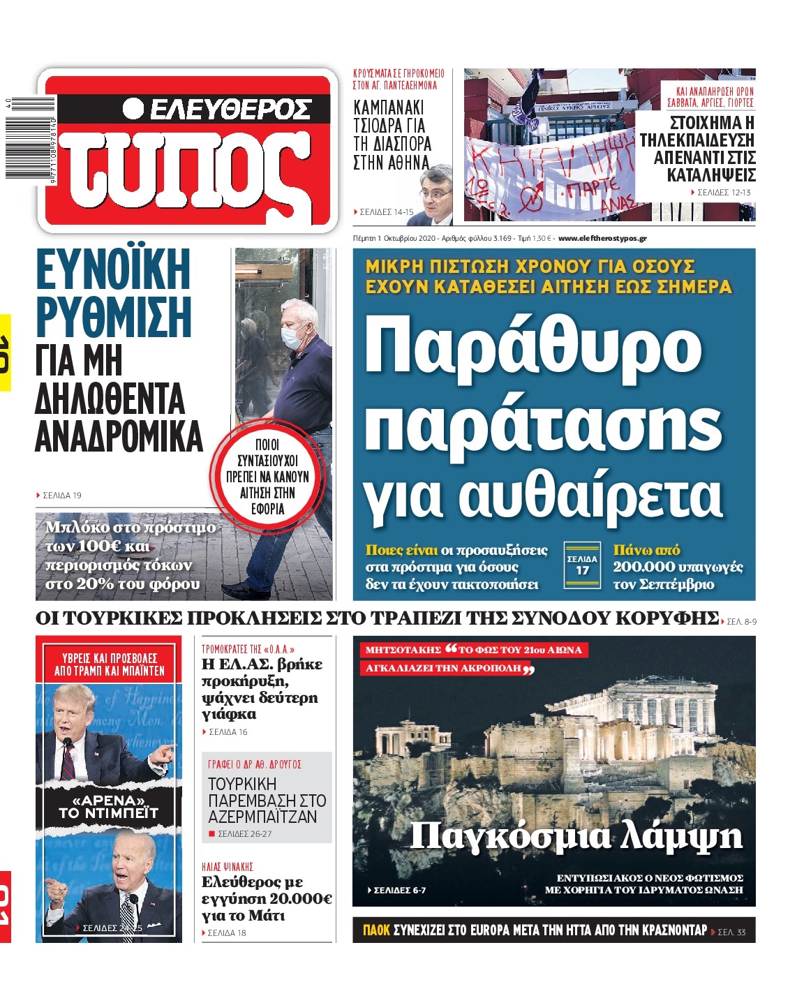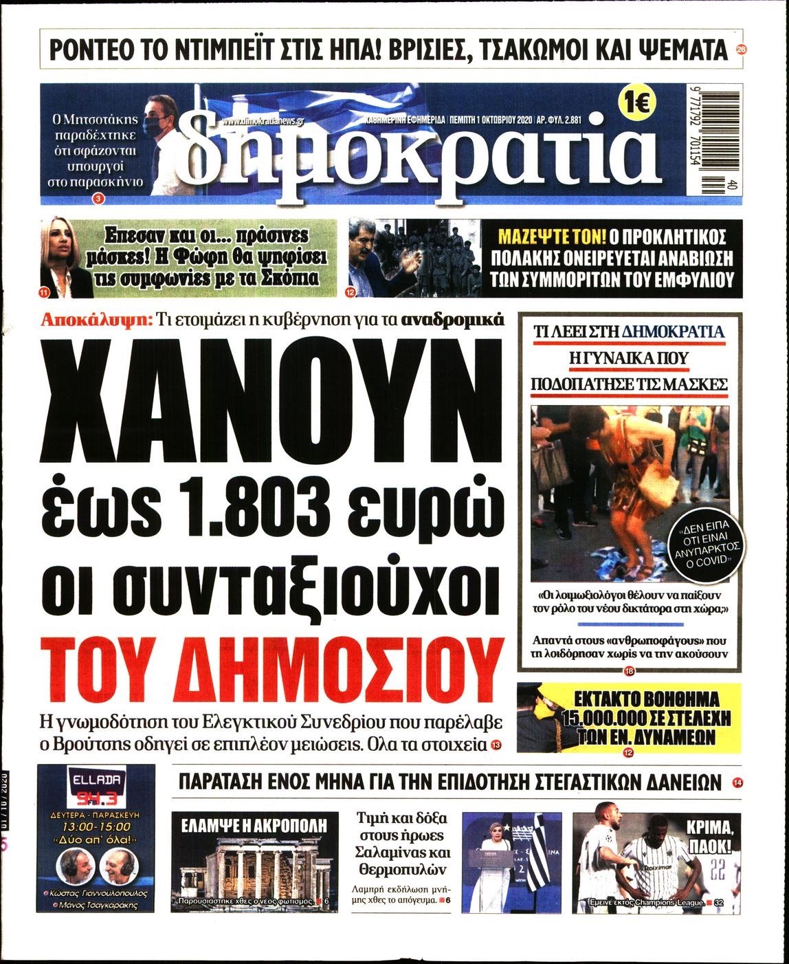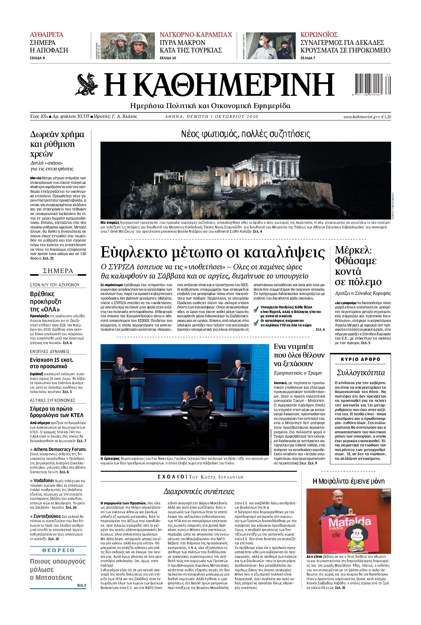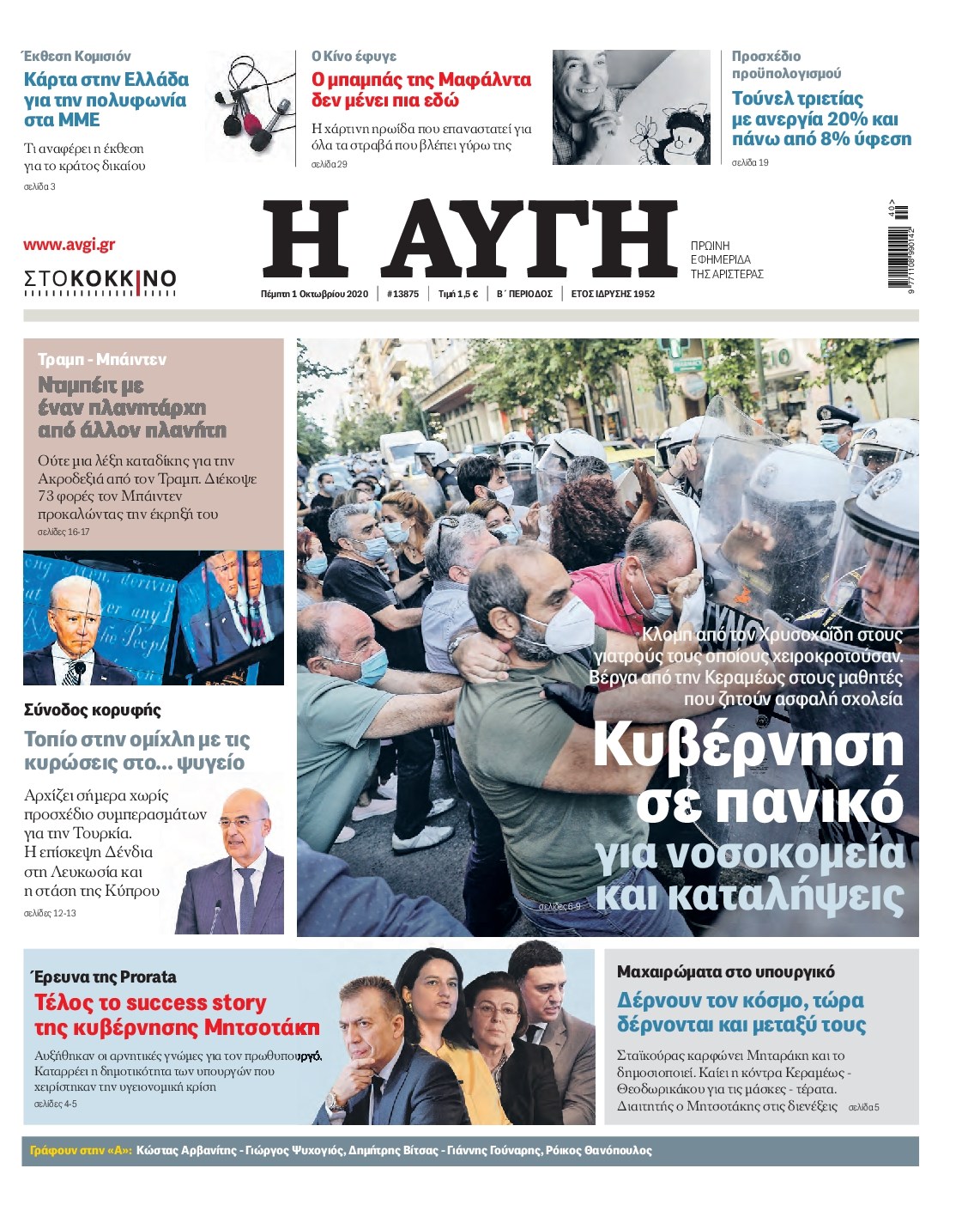 Οι πολιτικές εφημερίδες 1/10/2020 Διονύσης Νίκκας 06:05, Πέμπτη 01 Οκτωβρίου 2020 Media Διαβάστε τα πρωτοσέλιδα των πολιτικών εφημερίδων… ΠΟΛΙΤΙΚΕΣ ΕΦΗΜΕΡΙΔΕΣ ΠΡΩΤΟΣΕΛΙΔΑ Μοιράσου το: σχολίασε κι εσύ (0 σχόλια) Ακολουθήστε το enikos.gr στο Google News και μάθετε πρώτοι όλες τις ειδήσεις Δείτε όλες τις τελευταίες ειδήσεις από την Ελλάδα και τον Κόσμο στο enikos.gr Ειδήσεις Ροή Ειδήσεων 2 ώρες πριν Μπλόκα: Οι αγρότες σηκώνουν τις μπάρες σε διόδια για τους εκδρομείς των Χριστουγέννων και μοιράζουν προϊόντα – Βίντεο 2 ώρες πριν Τσιάρας προς αγρότες: Τα μπλόκα και τα πείσματα δεν ωφελούν – Οι λύσεις περνούν μέσα από τον διάλογο 3 ώρες πριν Αρχεία Έπσταϊν: Οι συγκλονιστικές φωτογραφίες – Ο Μάικλ Τζάκσον, ο Μικ Τζάγκερ και ο Κέβιν Σπέισι ανάμεσα στους διάσημους που απεικονίζονται 56 λεπτά πριν Μαθητές διακινούσαν κοκαΐνη και χασίς σε σχολείο της Αττικής – 12 συλλήψεις 1 ώρα πριν Βέλγιο: Άγνωστοι έριξαν κόκκινη μπογιά στο προξενείο της Πολωνίας στις Βρυξέλλες 5 ώρες πριν Μία νέα «χρυσή» περίοδος αρχίζει για 3 ζώδια από σήμερα – «Μία αναπάντεχη ευκαιρία οδηγεί στην επιτυχία» 3 ώρες πριν Διαιτολόγος αποκαλύπτει 9 πρωινές συνήθειες που «λιώνουν» το κοιλιακό λίπος – «Υποστηρίζουν την υγιεινή απώλεια βάρους» 4 ώρες πριν Οι 7 φράσεις που δεν λένε ποτέ οι συναισθηματικά έξυπνοι άνθρωποι κατά τη διάρκεια ενός καβγά 7 ώρες πριν Enerwave: Το νέο «ρεύμα» στη λιανική ενέργειας που αλλάζει την εμπειρία του καταναλωτή 5 λεπτά πριν Μαρινάκης στον Realfm 97,8: Η κυβέρνηση σέβεται κάθε λογική διεκδίκηση των αγροτών, αλλά και το αίτημα των πολιτών να μην ταλαιπωρούνται 11 λεπτά πριν O Πάντερ MVP της 17ης αγωνιστικής στην Euroleague 19 λεπτά πριν Πέθανε η τραγουδίστρια Κλαούντια Ντελμέρ 27 λεπτά πριν Μία ανεκμετάλλευτη πηγή θα μπορούσε να προσφέρει ανεξάντλητη ενέργεια – Οι επιστήμονες ίσως γνωρίζουν πώς να την ξεκλειδώσουν 36 λεπτά πριν Θεσσαλονίκη: Ανήλικος που είχε εξαφανιστεί βρέθηκε στο σπίτι Τούρκων μετά από αστυνομική επιχείρηση ENIKOS NETWORK Η αποχή από την αναπαραγωγή παρατείνει τη ζωή στα ζώα, σύμφωνα με μελέτη – Τι ισχύει για τους ανθρώπους; Σημαντικές επαφές στις ΗΠΑ είχε ο υπουργός Υγείας Άδωνις Γεωργιάδης Ευλογιά αιγοπροβάτων: Παρατεταμένη επιζωοτία, αυστηρά μέτρα – Τι ισχύει για τον εμβολιασμό και την ανασύσταση του ζωικού κε... Τσιάρας προς αγρότες: Έχει ικανοποιηθεί το 74% των αιτημάτων – Τα μπλόκα και τα πείσματα δεν ωφελούν Χαρτογραφώντας το «σημείο χωρίς επιστροφή»: Για πρώτη φορά αποκαλύπτεται με λεπτομέρεια το ακανθώδες όριο της ατμόσφαιρας τ... Η Google καταργεί τη λειτουργία «dark web report» – Πώς θα μπορούν οι χρήστες να διαγράφουν τα δεδομένα τους περισσότερα 14:04 , Σάββατο 20 Δεκεμβρίου 2025 Η Realnews αυτής της Κυριακής (21/12/2025) Με τίτλο: «Ασπίδα προστασίας για την Ελλάδα» κυκλοφορεί, αυτήν την Κυριακή, η Realnews. Σημαντ... 12:53 , Σάββατο 20 Δεκεμβρίου 2025 Να μ’ αγαπάς: Το παρελθόν έρχεται στο φως – Καταιγιστικές εξελίξεις στα τελευταία επεισόδια του 2025 Ο Άγγελος αποκαλύπτεται, η Φωτεινή ανησυχεί για τον Λευτέρη και η Ζωή έρχεται αντιμέτωπη με το... 11:41 , Σάββατο 20 Δεκεμβρίου 2025 «Η αγάπη δεν χάνεται ποτέ»: Η μικρού μήκους ταινία κινουμένων σχεδίων που θέτει ερωτήματα για τη ζωή και τον θάνατο Ο θάνατος είναι ένα από τα πιο σκληρά θέματα που καλείται να διαχειριστεί κάποιος στη διάρκεια... 09:30 , Σάββατο 20 Δεκεμβρίου 2025 «Porto Leone: Στη γειτονιά με τα κόκκινα φανάρια» – Ο Χρόνης αποκαλύπτει στην Αλεξάνδρα το μυστικό 