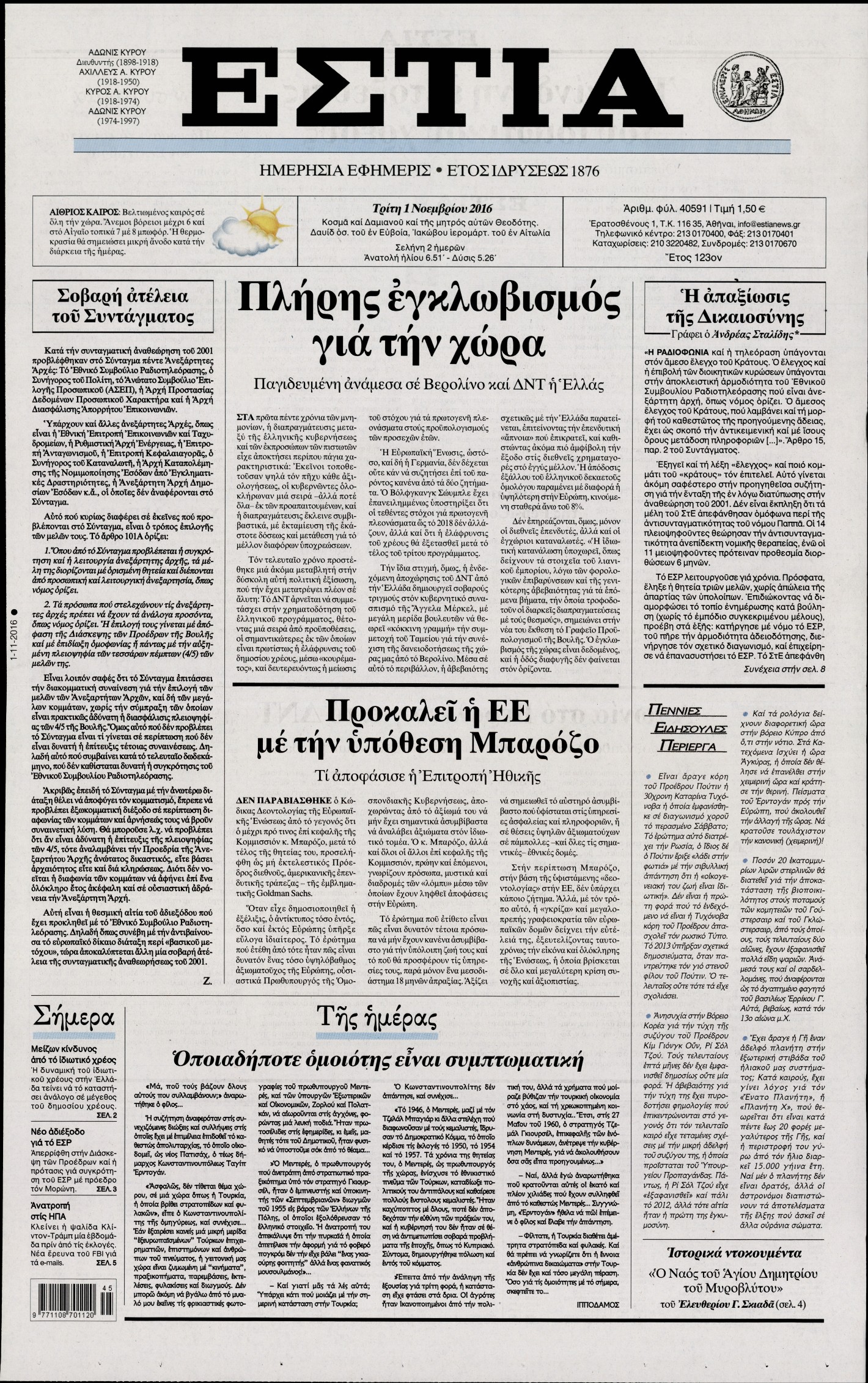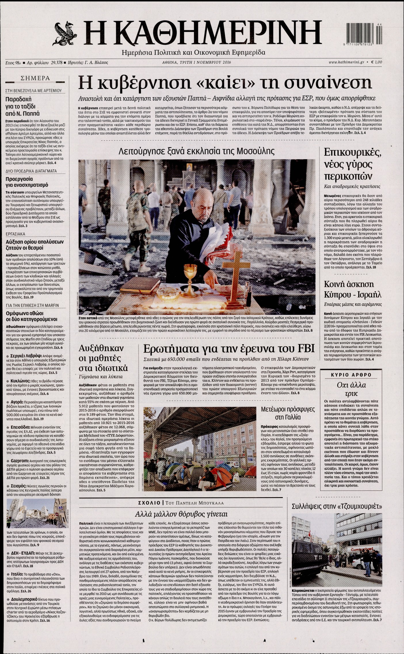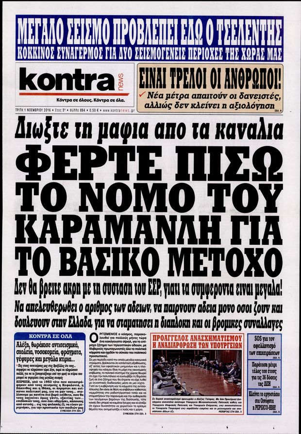 Οι πολιτικές εφημερίδες 1/11/2016 Κώστας Τεό 04:43, Τρίτη 01 Νοεμβρίου 2016 Media Διαβάστε τα σημερινά πρωτοσέλιδα των πολιτικών εφημερίδων: ΠΟΛΙΤΙΚΕΣ ΕΦΗΜΕΡΙΔΕΣ ΠΡΩΤΟΣΕΛΙΔΑ Μοιράσου το: σχολίασε κι εσύ (0 σχόλια) Ακολουθήστε το enikos.gr στο Google News και μάθετε πρώτοι όλες τις ειδήσεις Δείτε όλες τις τελευταίες ειδήσεις από την Ελλάδα και τον Κόσμο στο enikos.gr Ειδήσεις Ροή Ειδήσεων 2 ώρες πριν Χριστούγεννα στα μπλόκα: Επιμένουν στις κινητοποιήσεις τους οι αγρότες – Ανοίγουν τα διόδια το Σαββατοκύριακο 2 ώρες πριν Ουκρανία: Η άνευ προηγουμένου επίθεση σε ρωσικό τάνκερ στη Μεσόγειο και το μήνυμα προς στον Πούτιν – Το «μακρύ χέρι» του Κιέβου 1 ώρα πριν Πούτιν: Τα μηνύματα σε Ευρώπη και ΝΑΤΟ από το μαραθώνιο «σόου» του – Η απαίτηση για «σεβασμό» και η ειρήνη «με τους όρους» της Μόσχας 2 ώρες πριν Τραμπ: Δεν αποκλείει την πιθανότητα ενός πολέμου στη Βενεζουέλα – «Ο Μαδούρο ξέρει καλύτερα από τον καθένα τι ακριβώς θέλω» 3 ώρες πριν Συνεχίζει να προκαλεί ο Μίτσκοσκι: «Για μένα το όνομα Μακεδονία είναι ιερό» 1 ώρα πριν Ανακαλύφθηκαν αρχαία χρυσά νομίσματα 2.200 ετών που απεικονίζουν τον θεό Απόλλωνα – Η άγνωστη σύνδεση με τον Φίλιππο Β΄ της Μακεδονίας 2 ώρες πριν Ύπνος: Μια κρυφή κατάσταση του εγκεφάλου πριν από τον ύπνο μπορεί να είναι το “κλειδί” για υψηλή ευφυΐα και δημιουργικότητα 3 ώρες πριν Αριθμολογία: Οι άνθρωποι που έχουν γεννηθεί αυτές τις 4 ημερομηνίες, συχνά παρεξηγούνται – «Η καλοσύνη τους κρύβει τεράστια δύναμη» 4 ώρες πριν Ξεχάστε το καθάρισμα το Σαββατοκύριακο: Ο «κανόνας των 20 λεπτών» που θα σας λύσει τα χέρια 36 δευτερόλεπτα πριν Βασίλης Σπανούλης: Δεν εμφανίστηκε ούτε ένας δημοσιογράφος στην συνέντευξη Τύπου – «Καλησπέρα στον… κανέναν», δείτε βίντεο 12 λεπτά πριν Πόλεμος στην Ουκρανία: Εφτά νεκροί από ρωσική πυραυλική επίθεση στο λιμάνι της Οδησσού 15 λεπτά πριν ΗΠΑ: Η κυβέρνηση του Ντόναλντ Τραμπ άρχισε να δημοσιοποιεί τα αρχεία Έπσταϊν 27 λεπτά πριν Σάμος: Άνοιξε το μπλόκο των αγροτών στον κόμβο Κοκκαρίου – Σε νέα συνεδρίαση θα καθορίσουν την στάση τους 35 λεπτά πριν Άνω Λιόσια: Πυροβολισμοί σε επιχείρηση με χαλιά – Εντοπίστηκαν 10 κάλυκες ENIKOS NETWORK Το ΕΚΑΒ τιμήθηκε από την Ακαδημία Αθηνών για τα 40 χρόνια προσφοράς του Έχετε πραγματικά μεγάλη καρδιά; 10 χαρακτηριστικά όσων έχουν καλοσύνη Αναστολή μέτρων αναγκαστικής εκτέλεσης για κτηνοτρόφους που πλήττονται από την ευλογιά των αιγοπροβάτων Πλήρης επάρκεια προϊόντων στις λαϊκές της Αττικής, παρά τις αγροτικές κινητοποιήσεις – Τι απαντούν οι πωλητές Χαρτογραφώντας το «σημείο χωρίς επιστροφή»: Για πρώτη φορά αποκαλύπτεται με λεπτομέρεια το ακανθώδες όριο της ατμόσφαιρας τ... Η Google καταργεί τη λειτουργία «dark web report» – Πώς θα μπορούν οι χρήστες να διαγράφουν τα δεδομένα τους περισσότερα 22:42 , Παρασκευή 19 Δεκεμβρίου 2025 Γιώργος Γιαννόπουλος για “Το σόι σου”: “Είναι ευτυχία και ευλογία αυτή η σειρά” «Είναι ευτυχία και ευλογία η συγκυρία αυτής της σειράς», θα πει ο Γιώργος Γιαννόπουλος -ο αγαπ... 20:37 , Παρασκευή 19 Δεκεμβρίου 2025 Don’t Forget The Lyrics: Η Έλλη Κοκκίνου υποδέχεται 4 παίκτες που θα κάνουν τα πάντα για να μη χάσουν ούτε… μισή λέξη από τους στίχους Το «Don’t Forget The Lyrics» επιστρέφει απόψε, Παρασκευή 19 Δεκεμβρίου, στις 21:00 με νέο επει... 19:31 , Παρασκευή 19 Δεκεμβρίου 2025 GNTM: Απόψε ο μεγάλος τελικός για τους 4 φιναλίστ Έπειτα από μήνες γεμάτους μόδα, δημιουργία και έντονες αναμετρήσεις, το GNTM 2025 κορυφώνεται,... 18:11 