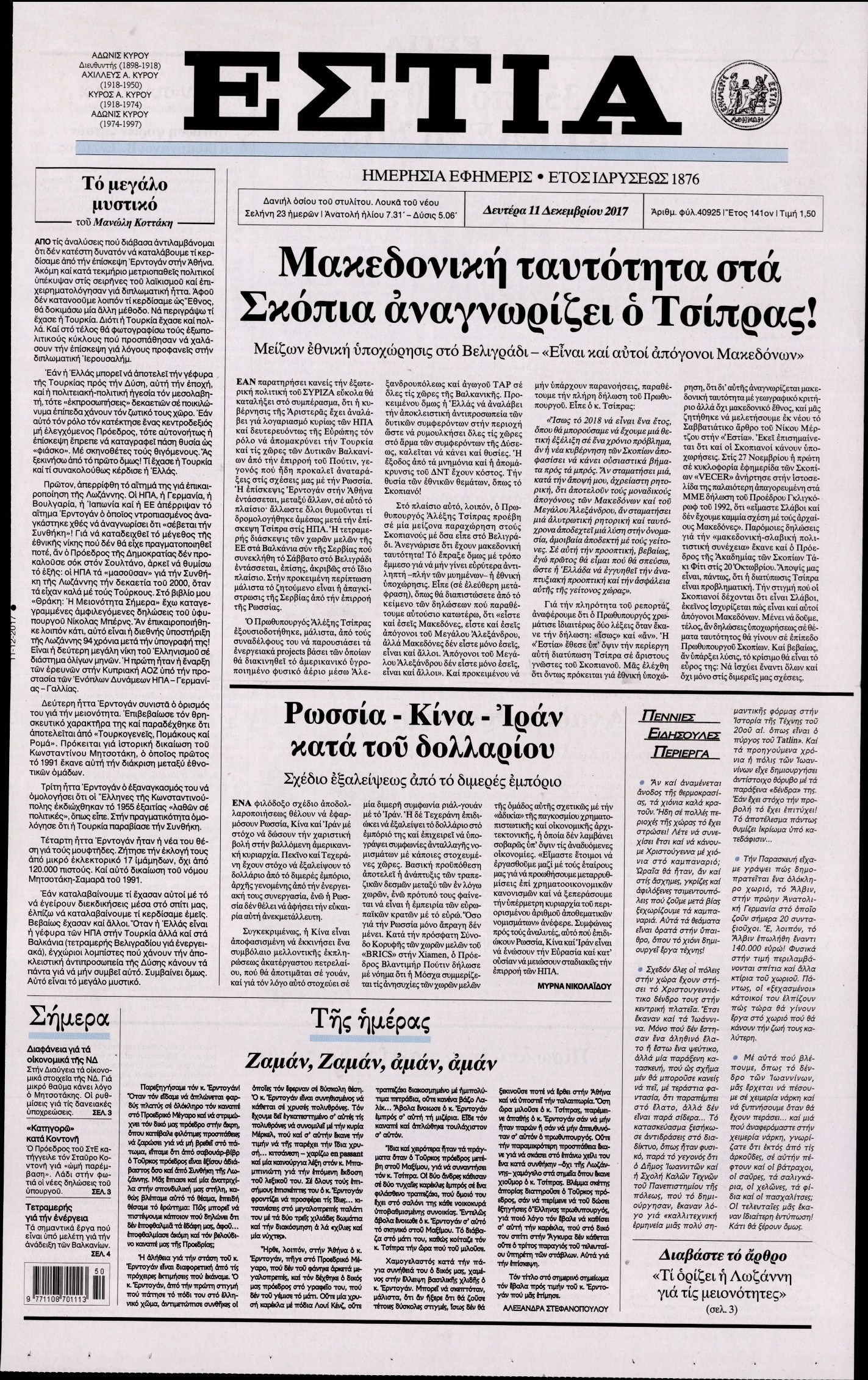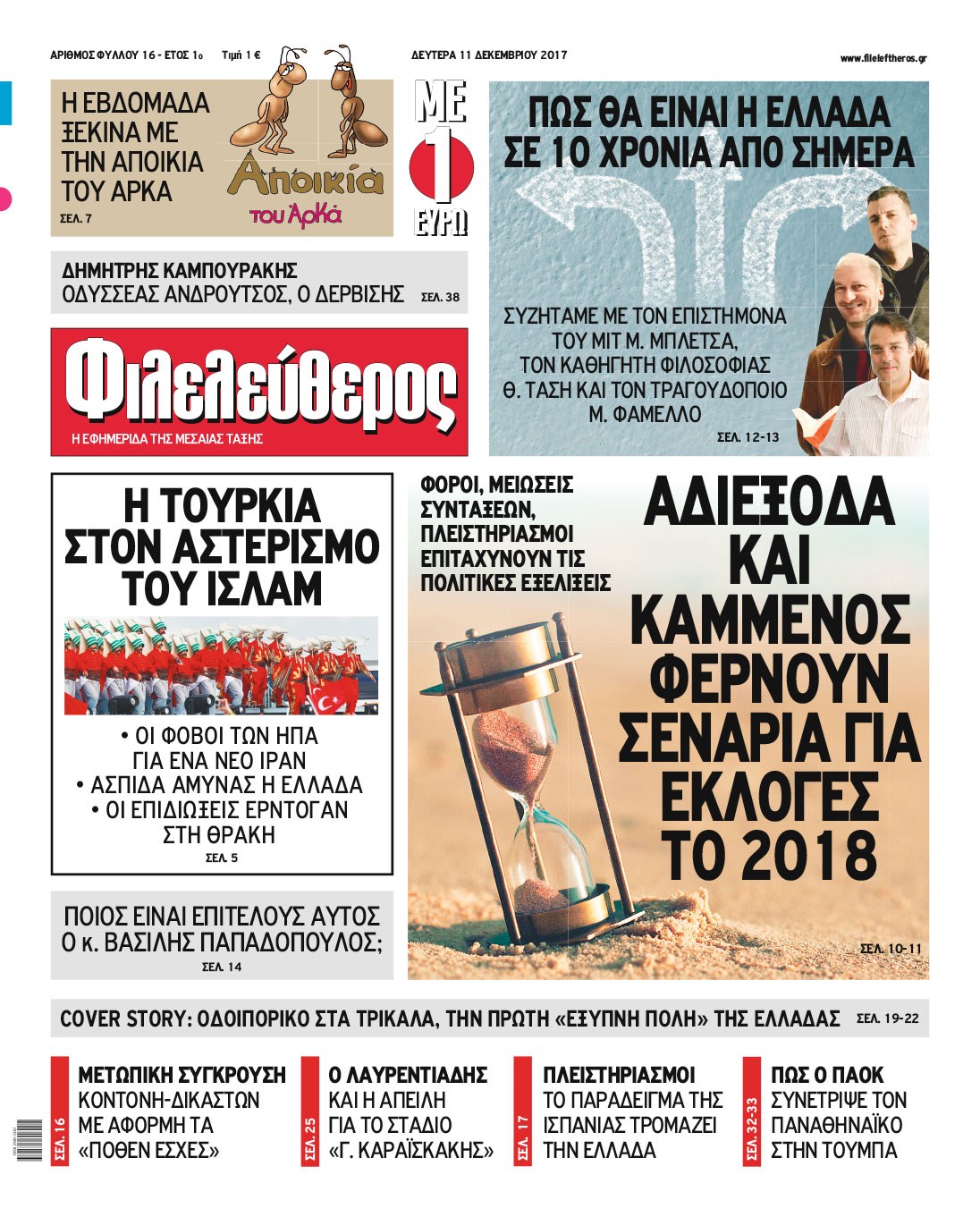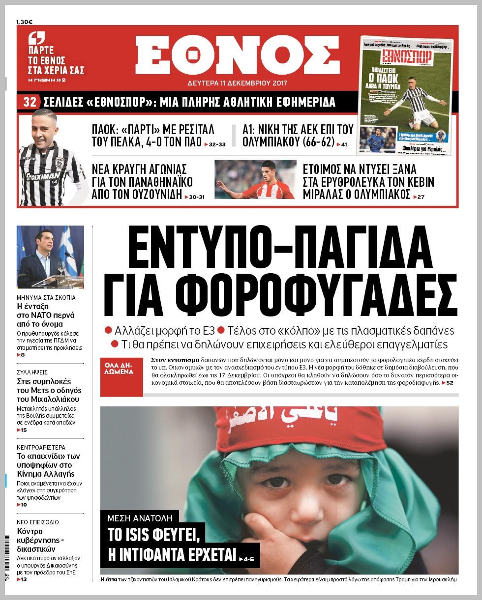 Οι πολιτικές εφημερίδες 11/12/2017 Κώστας Τεό 07:02, Δευτέρα 11 Δεκεμβρίου 2017 Media Διαβάστε τα σημερινά πρωτοσέλιδα των πολιτικών εφημερίδων: ΠΟΛΙΤΙΚΕΣ ΕΦΗΜΕΡΙΔΕΣ ΠΡΩΤΟΣΕΛΙΔΑ Μοιράσου το: σχολίασε κι εσύ (0 σχόλια) Ακολουθήστε το enikos.gr στο Google News και μάθετε πρώτοι όλες τις ειδήσεις Δείτε όλες τις τελευταίες ειδήσεις από την Ελλάδα και τον Κόσμο στο enikos.gr Ειδήσεις Ροή Ειδήσεων 4 ώρες πριν Χριστούγεννα στα μπλόκα: Επιμένουν στις κινητοποιήσεις τους οι αγρότες – Ανοίγουν τα διόδια το Σαββατοκύριακο 4 ώρες πριν Ουκρανία: Η άνευ προηγουμένου επίθεση σε ρωσικό τάνκερ στη Μεσόγειο και το μήνυμα προς στον Πούτιν – Το «μακρύ χέρι» του Κιέβου 3 ώρες πριν Πούτιν: Τα μηνύματα σε Ευρώπη και ΝΑΤΟ από το μαραθώνιο «σόου» του – Η απαίτηση για «σεβασμό» και η ειρήνη «με τους όρους» της Μόσχας 4 ώρες πριν Τραμπ: Δεν αποκλείει την πιθανότητα ενός πολέμου στη Βενεζουέλα – «Ο Μαδούρο ξέρει καλύτερα από τον καθένα τι ακριβώς θέλω» 5 ώρες πριν Συνεχίζει να προκαλεί ο Μίτσκοσκι: «Για μένα το όνομα Μακεδονία είναι ιερό» 3 ώρες πριν Ανακαλύφθηκαν αρχαία χρυσά νομίσματα 2.200 ετών που απεικονίζουν τον θεό Απόλλωνα – Η άγνωστη σύνδεση με τον Φίλιππο Β΄ της Μακεδονίας 4 ώρες πριν Ύπνος: Μια κρυφή κατάσταση του εγκεφάλου πριν από τον ύπνο μπορεί να είναι το “κλειδί” για υψηλή ευφυΐα και δημιουργικότητα 5 ώρες πριν Αριθμολογία: Οι άνθρωποι που έχουν γεννηθεί αυτές τις 4 ημερομηνίες, συχνά παρεξηγούνται – «Η καλοσύνη τους κρύβει τεράστια δύναμη» 6 ώρες πριν Ξεχάστε το καθάρισμα το Σαββατοκύριακο: Ο «κανόνας των 20 λεπτών» που θα σας λύσει τα χέρια 14 λεπτά πριν ΗΠΑ: Τραγωδία στην Αλαμπάμα – Σκότωσε την δημοσιογράφο σύζυγό του και αυτοκτόνησε μπροστά στον 3χρονο γιο τους 28 λεπτά πριν Πρόταση γάμου στο ΣΕΦ κατά την διάρκεια του αγώνα Ολυμπιακός-Βιλερμπάν – Δείτε βίντεο 43 λεπτά πριν Euroleague: Επέστρεψε στις νίκες ο Ολυμπιακός, πήρε την ματσάρα της χρονιάς η Μπάρτσα – Τα αποτελέσματα και η βαθμολογία 58 λεπτά πριν Συρία: Μαζικά πλήγματα των ΗΠΑ σε θέσεις του Ισλαμικού Κράτους – Χέγκσεθ: «Δεν είναι αρχή πολέμου, είναι μια δήλωση εκδίκησης» για το θάνατο των στρατιωτών μας 1 ώρα πριν Ουκρανία: Ολοκληρώθηκαν οι συνομιλίες με τους Αμερικανούς κι Ευρωπαίους διαπραγματευτές ENIKOS NETWORK Το ΕΚΑΒ τιμήθηκε από την Ακαδημία Αθηνών για τα 40 χρόνια προσφοράς του Έχετε πραγματικά μεγάλη καρδιά; 10 χαρακτηριστικά όσων έχουν καλοσύνη Αναστολή μέτρων αναγκαστικής εκτέλεσης για κτηνοτρόφους που πλήττονται από την ευλογιά των αιγοπροβάτων Πλήρης επάρκεια προϊόντων στις λαϊκές της Αττικής, παρά τις αγροτικές κινητοποιήσεις – Τι απαντούν οι πωλητές Χαρτογραφώντας το «σημείο χωρίς επιστροφή»: Για πρώτη φορά αποκαλύπτεται με λεπτομέρεια το ακανθώδες όριο της ατμόσφαιρας τ... Η Google καταργεί τη λειτουργία «dark web report» – Πώς θα μπορούν οι χρήστες να διαγράφουν τα δεδομένα τους περισσότερα 22:42 , Παρασκευή 19 Δεκεμβρίου 2025 Γιώργος Γιαννόπουλος για “Το σόι σου”: “Είναι ευτυχία και ευλογία αυτή η σειρά” «Είναι ευτυχία και ευλογία η συγκυρία αυτής της σειράς», θα πει ο Γιώργος Γιαννόπουλος -ο αγαπ... 20:37 , Παρασκευή 19 Δεκεμβρίου 2025 Don’t Forget The Lyrics: Η Έλλη Κοκκίνου υποδέχεται 4 παίκτες που θα κάνουν τα πάντα για να μη χάσουν ούτε… μισή λέξη από τους στίχους Το «Don’t Forget The Lyrics» επιστρέφει απόψε, Παρασκευή 19 Δεκεμβρίου, στις 21:00 με νέο επει... 19:31 , Παρασκευή 19 Δεκεμβρίου 2025 GNTM: Απόψε ο μεγάλος τελικός για τους 4 φιναλίστ Έπειτ