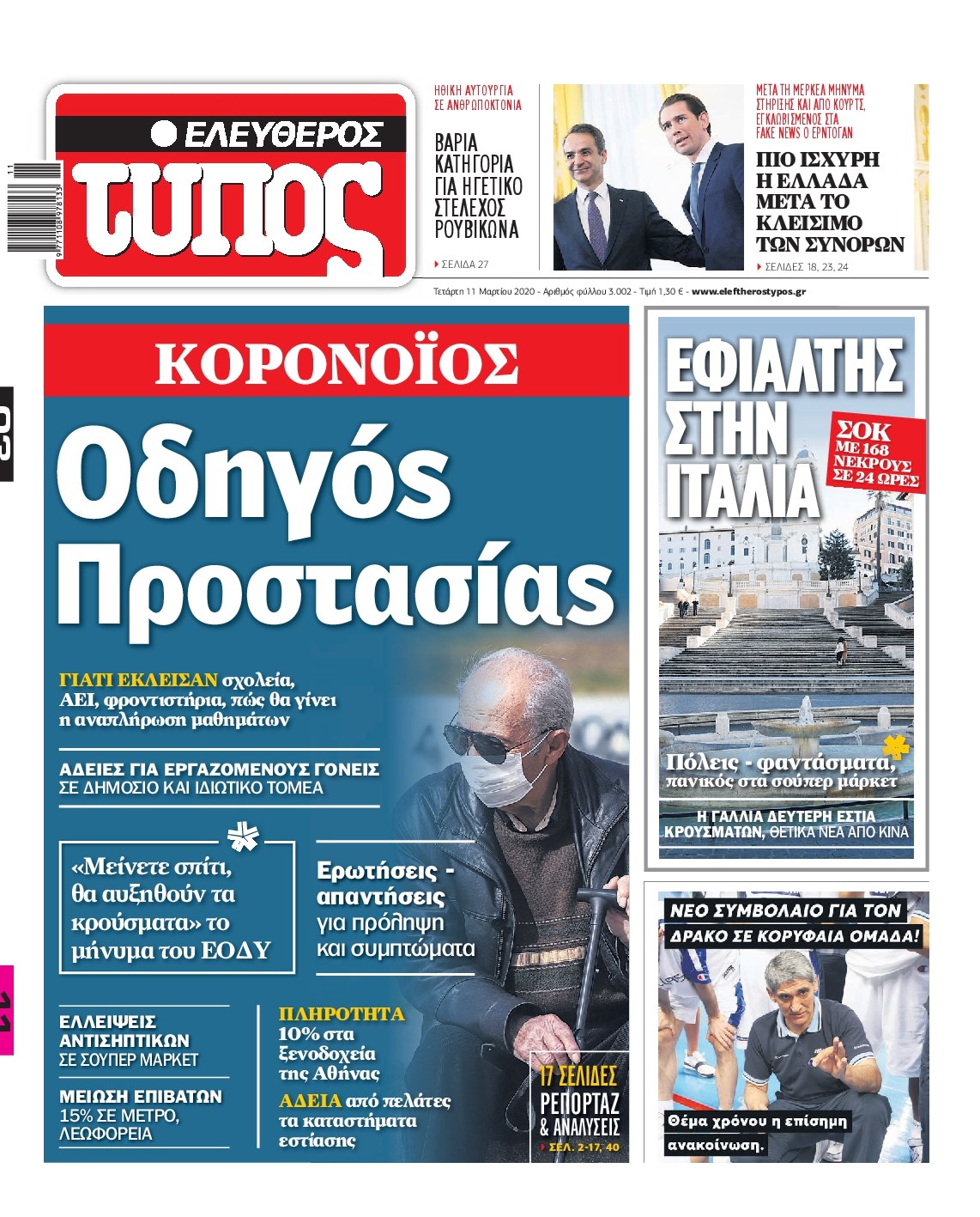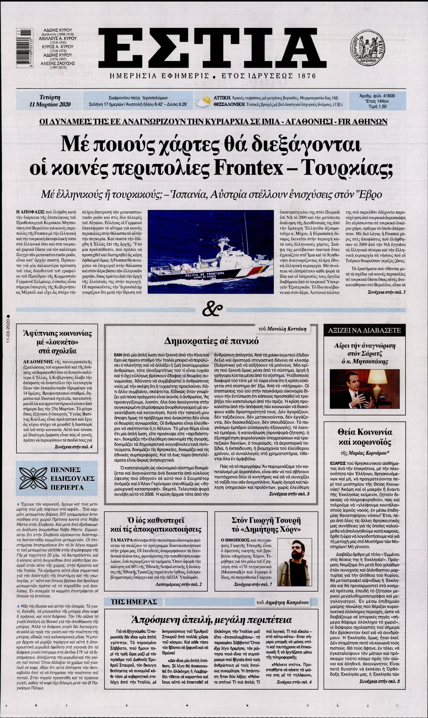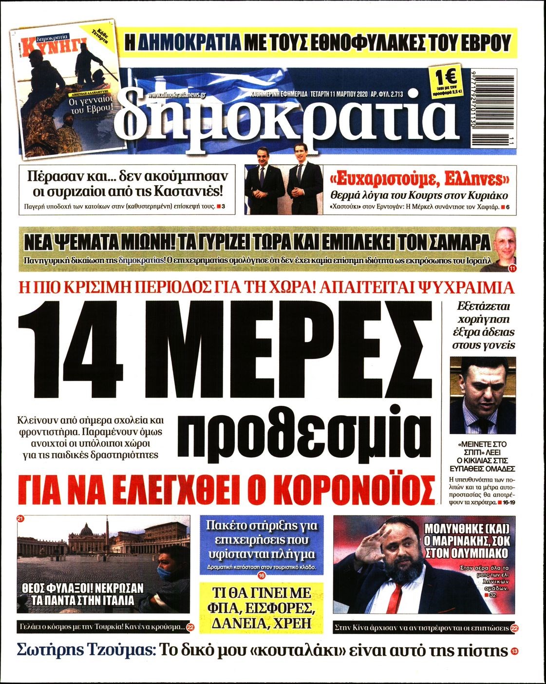 Οι πολιτικές εφημερίδες 11/3/2020 Διονύσης Νίκκας 06:39, Τετάρτη 11 Μαρτίου 2020 Media Διαβάστε τα πρωτοσέλιδα των πολιτικών εφημερίδων… ΠΟΛΙΤΙΚΕΣ ΕΦΗΜΕΡΙΔΕΣ ΠΡΩΤΟΣΕΛΙΔΑ Μοιράσου το: σχολίασε κι εσύ (0 σχόλια) Ακολουθήστε το enikos.gr στο Google News και μάθετε πρώτοι όλες τις ειδήσεις Δείτε όλες τις τελευταίες ειδήσεις από την Ελλάδα και τον Κόσμο στο enikos.gr Ειδήσεις Ροή Ειδήσεων 5 ώρες πριν Χριστούγεννα στα μπλόκα: Επιμένουν στις κινητοποιήσεις τους οι αγρότες – Ανοίγουν τα διόδια το Σαββατοκύριακο 5 ώρες πριν Ουκρανία: Η άνευ προηγουμένου επίθεση σε ρωσικό τάνκερ στη Μεσόγειο και το μήνυμα προς στον Πούτιν – Το «μακρύ χέρι» του Κιέβου 4 ώρες πριν Πούτιν: Τα μηνύματα σε Ευρώπη και ΝΑΤΟ από το μαραθώνιο «σόου» του – Η απαίτηση για «σεβασμό» και η ειρήνη «με τους όρους» της Μόσχας 5 ώρες πριν Τραμπ: Δεν αποκλείει την πιθανότητα ενός πολέμου στη Βενεζουέλα – «Ο Μαδούρο ξέρει καλύτερα από τον καθένα τι ακριβώς θέλω» 6 ώρες πριν Συνεχίζει να προκαλεί ο Μίτσκοσκι: «Για μένα το όνομα Μακεδονία είναι ιερό» 4 ώρες πριν Ανακαλύφθηκαν αρχαία χρυσά νομίσματα 2.200 ετών που απεικονίζουν τον θεό Απόλλωνα – Η άγνωστη σύνδεση με τον Φίλιππο Β΄ της Μακεδονίας 5 ώρες πριν Ύπνος: Μια κρυφή κατάσταση του εγκεφάλου πριν από τον ύπνο μπορεί να είναι το “κλειδί” για υψηλή ευφυΐα και δημιουργικότητα 6 ώρες πριν Αριθμολογία: Οι άνθρωποι που έχουν γεννηθεί αυτές τις 4 ημερομηνίες, συχνά παρεξηγούνται – «Η καλοσύνη τους κρύβει τεράστια δύναμη» 7 ώρες πριν Ξεχάστε το καθάρισμα το Σαββατοκύριακο: Ο «κανόνας των 20 λεπτών» που θα σας λύσει τα χέρια 2 λεπτά πριν Ταμίλα Κουλίεβα: «Δεν θέλω να είμαι κάποια που πορεύεται συνεχώς με τις ίδιες αναφορές» 17 λεπτά πριν Η Ελλάδα προσχωρεί στη Διεθνή Επιτροπή Αποζημιώσεων για την Ουκρανία 32 λεπτά πριν GNTM: Η Ξένια Τσίρκοβα αναδείχθηκε μεγάλη νικήτρια και πήρε τις 50.000 ευρώ – Ποιος βρέθηκε σε απόσταση αναπνοής; 47 λεπτά πριν Θεσσαλονίκη: Εξαφανίστηκε 13χρονος από χώρο φιλοξενίας ασυνόδευτων ανηλίκων στο Ωραιόκαστρο 57 λεπτά πριν Ντόναλντ Τραμπ: «Πολύ βαριά αντίποινα» στη Συρία – «Πλήττουμε πολύ δυνατά οχυρά του Ισλαμικού Κράτους» ENIKOS NETWORK Το ΕΚΑΒ τιμήθηκε από την Ακαδημία Αθηνών για τα 40 χρόνια προσφοράς του Έχετε πραγματικά μεγάλη καρδιά; 10 χαρακτηριστικά όσων έχουν καλοσύνη Αναστολή μέτρων αναγκαστικής εκτέλεσης για κτηνοτρόφους που πλήττονται από την ευλογιά των αιγοπροβάτων Πλήρης επάρκεια προϊόντων στις λαϊκές της Αττικής, παρά τις αγροτικές κινητοποιήσεις – Τι απαντούν οι πωλητές Χαρτογραφώντας το «σημείο χωρίς επιστροφή»: Για πρώτη φορά αποκαλύπτεται με λεπτομέρεια το ακανθώδες όριο της ατμόσφαιρας τ... Η Google καταργεί τη λειτουργία «dark web report» – Πώς θα μπορούν οι χρήστες να διαγράφουν τα δεδομένα τους περισσότερα 02:50 , Σάββατο 20 Δεκεμβρίου 2025 GNTM: Η Ξένια Τσίρκοβα αναδείχθηκε μεγάλη νικήτρια και πήρε τις 50.000 ευρώ – Ποιος βρέθηκε σε απόσταση αναπνοής; Με φαντασμαγορικό τρόπο ολοκληρώθηκε το βράδυ της Παρασκευής ο μεγάλος τελικός του GNTM, μέσα ... 22:42 , Παρασκευή 19 Δεκεμβρίου 2025 Γιώργος Γιαννόπουλος για “Το σόι σου”: “Είναι ευτυχία και ευλογία αυτή η σειρά” «Είναι ευτυχία και ευλογία η συγκυρία αυτής της σειράς», θα πει ο Γιώργος Γιαννόπουλος -ο αγαπ... 20:37 , Παρασκευή 19 Δεκεμβρίου 2025 Don’t Forget The Lyrics: Η Έλλη Κοκκίνου υποδέχεται 4 παίκτες που θα κάνουν τα πάντα για να μη χάσουν ούτε… μισή λέξη από τους στίχους Το «Don’t Forget The Lyrics» επιστρέφει απόψε, 