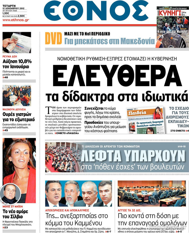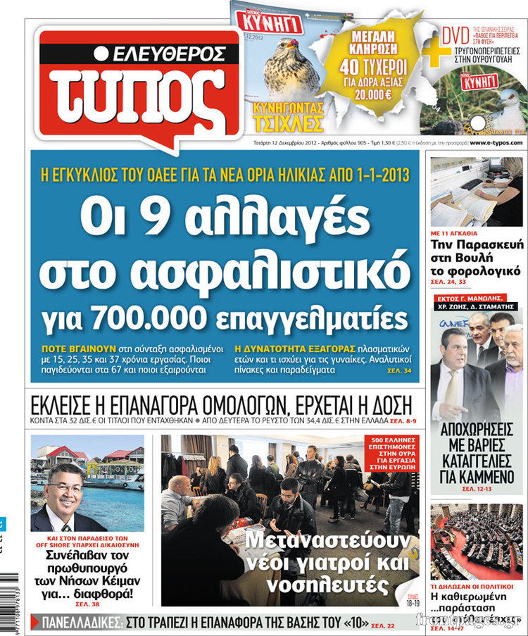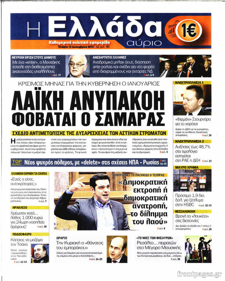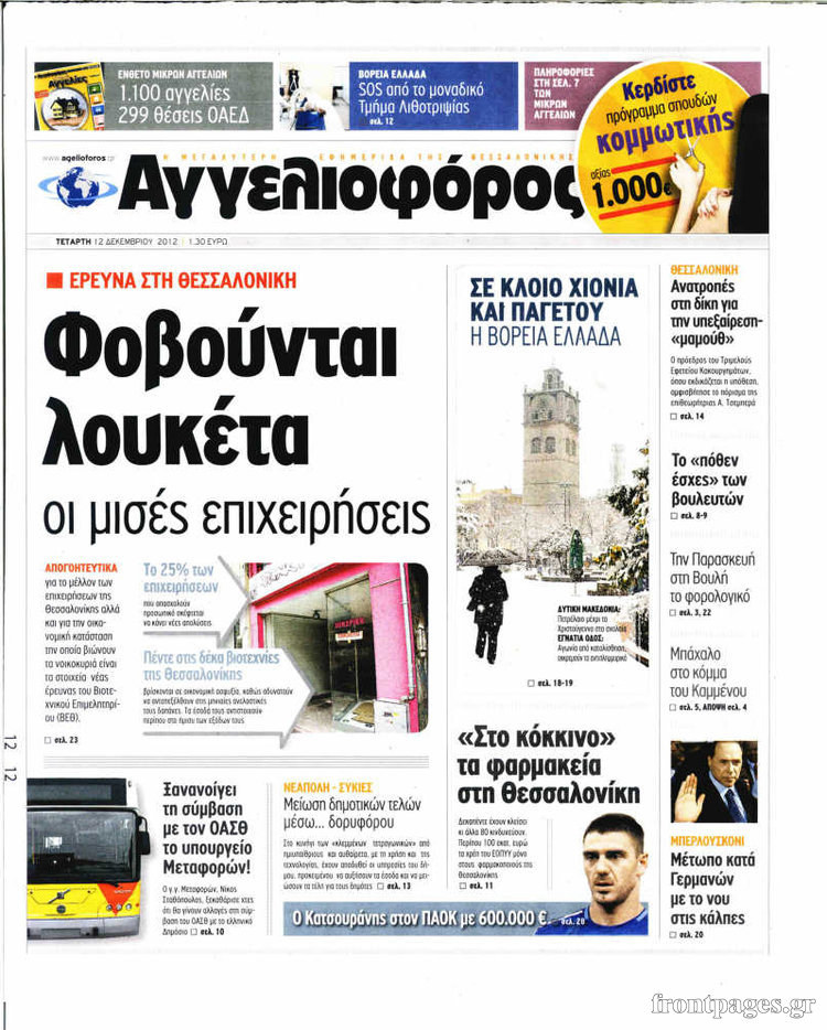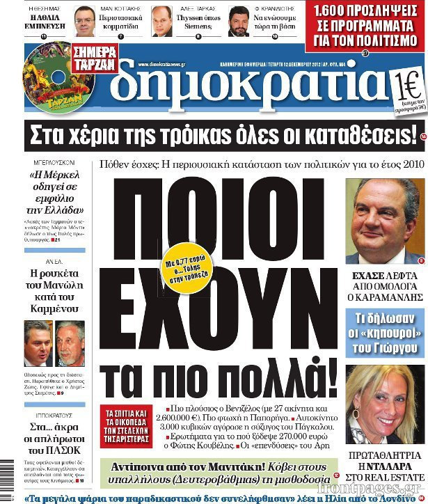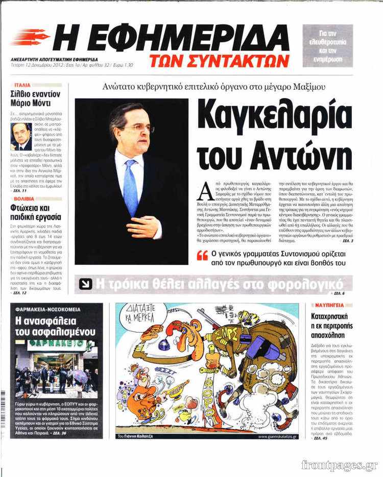 Οι πολιτικές εφημερίδες Enikos Newsroom 09:02, Τετάρτη 12 Δεκεμβρίου 2012 Media Οι πολιτικές εφημερίδες ΕΦΗΜΕΡΙΔΕΣ ΠΟΛΙΤΙΚΕΣ ΕΦΗΜΕΡΙΔΕΣ ΠΡΩΤΟΣΕΛΙΔΑ Μοιράσου το: σχολίασε κι εσύ (0 σχόλια) Ακολουθήστε το enikos.gr στο Google News και μάθετε πρώτοι όλες τις ειδήσεις Δείτε όλες τις τελευταίες ειδήσεις από την Ελλάδα και τον Κόσμο στο enikos.gr Ειδήσεις Ροή Ειδήσεων 2 ώρες πριν «Βιολάντα:» Οι ανατριχιαστικοί διάλογοι λίγες ώρες πριν από την φονική έκρηξη για «μυρωδιά σαν υγραέριο» – «Μου έλεγαν ότι δεν ήταν κάτι ανησυχητικό» κατέθεσε ο υπεύθυνος βάρδιας 3 ώρες πριν Ο Κυριάκος Μητσοτάκης ανοίγει τα χαρτιά του για τη Συνταγματική Αναθεώρηση – Στο τραπέζι και η μονιμότητα των δημοσίων υπαλλήλων 1 ώρα πριν Νέα Πέραμος: Προσπάθησαν να κάψουν το πτώμα του 27χρονου – Οι έρευνες στο εργασιακό του περιβάλλον και η εκτέλεση «καρμπόν» πριν από 2 χρόνια στη Μάνδρα 2 ώρες πριν Κακοκαιρία: Νέο έκτακτο δελτίο της ΕΜΥ – Σε ποιες περιοχές θα συνεχιστούν τα έντονα φαινόμενα 1 ώρα πριν Γκίλφοϊλ: Προανήγγειλε επίσκεψη Τραμπ στην Ελλάδα – «Ελπίζω να έρθει και η Μελάνια» 3 ώρες πριν Αριθμολογία: Οι 3 «καταραμένες» διευθύνσεις σπιτιού – «Τα νούμερα αυτά συνδέονται με αναταραχές και αρνητική ενέργεια» 4 ώρες πριν Τα 11 ψέματα που λένε πάντα οι άνδρες για να σας πείσουν ότι έχετε εσείς το πρόβλημα 2 ώρες πριν Ύπνος: Γιατί πρέπει να κοιμάστε με την πόρτα του υπνοδωματίου σας κλειστή 1 ώρα πριν Στο φως η θρυλική πόλη που ίδρυσε ο Μέγας Αλέξανδρος στο Ιράκ – Το «φάντασμα» του Τίγρη αποκαλύπτεται 14 λεπτά πριν Ο πρόεδρος Τραμπ βλέπει μια συμφωνία με την Κούβα μετά τις απειλές 36 λεπτά πριν ΑΕΚ – Ολυμπιακός 1-1: Ισοπαλία στο ντέρμπι με πέναλτυ στο 90+16′ για τους Πειραιώτες – Έντονες διαμαρτυρίες των γηπεδούχων 48 λεπτά πριν Επίδομα παιδιού 2026: Πότε ανοίγει η πλατφόρμα για τις νέες αιτήσεις – Τι πρέπει να γνωρίζετε 1 ώρα πριν Στο φως η θρυλική πόλη που ίδρυσε ο Μέγας Αλέξανδρος στο Ιράκ – Το «φάντασμα» του Τίγρη αποκαλύπτεται 1 ώρα πριν Νέα Πέραμος: Προσπάθησαν να κάψουν το πτώμα του 27χρονου – Οι έρευνες στο εργασιακό του περιβάλλον και η εκτέλεση «καρμπόν» πριν από 2 χρόνια στη Μάνδρα ENIKOS NETWORK Γελάτε, κλαίτε ή ανοίγει η μύτη σας μετά τον οργασμό – Πού οφείλεται, σύμφωνα με μελέτη; Πώς να ξεφορτωθείτε τις σακούλες κάτω από τα μάτια – Tips που δουλεύουν Τη Δευτέρα οι ανακοινώσεις του Κυριάκου Μητσοτάκη για τη συνταγματική αναθεώρηση – Ποια άρθρα θα προτείνει να αλλάξουν Ο καιρός της Δευτέρας: Ισχυρές καταιγίδες και χιονοπτώσεις – Σε ποιες περιοχές χρειάζεται προσοχή Σπαζοκεφαλιά: Βρες πόσα 9 υπάρχουν στην εικόνα σε 8 δευτερόλεπτα Τεστ IQ: Μπορείς να εντοπίσεις τον αριθμό 999 ανάμεσα στα 99Q σε 15 δευτερόλεπτα; περισσότερα 17:13 , Κυριακή 01 Φεβρουαρίου 2026 Σία Κοσιώνη: Το πρώτο μήνυμα μετά την περιπέτεια με την υγεία της – «Τα καταφέραμε» Για έναν δύσκολο Ιανουάριο που της φάνηκε σαν ένας ολόκληρος χρόνος κάνει λόγο η Σία Κοσιώνη σ... 15:05 , Κυριακή 01 Φεβρουαρίου 2026 Από Ήλιο σε Ήλιο: Πότε κάνει τελικά πρεμιέρα η νέα σειρά της ΕΡΤ1; Το αρχικό πλάνο και η μετακίνηση της προβολής. Της Νάντιας Ρηγάτου Μπορεί η Μεγάλη Χίμαιρα να ... 15:04 , Κυριακή 01 Φεβρουαρίου 2026 Στο real taste & style που κυκλοφορεί με τη Realnews Στο real taste & style που κυκλοφορεί με τη Realnews. Τον Φεβρουάριο, η πατάτα βγαίνει μπρ... 13:47 , Κυριακή 01 Φεβρουαρίου 2026 Άγιος Έρωτας: Ο πατέρας Νικόλαος και η Χλόη παραδίνονται στον έρωτα – ‘Ολες οι εξελίξεις Καταιγιστικές εξελίξεις την επό