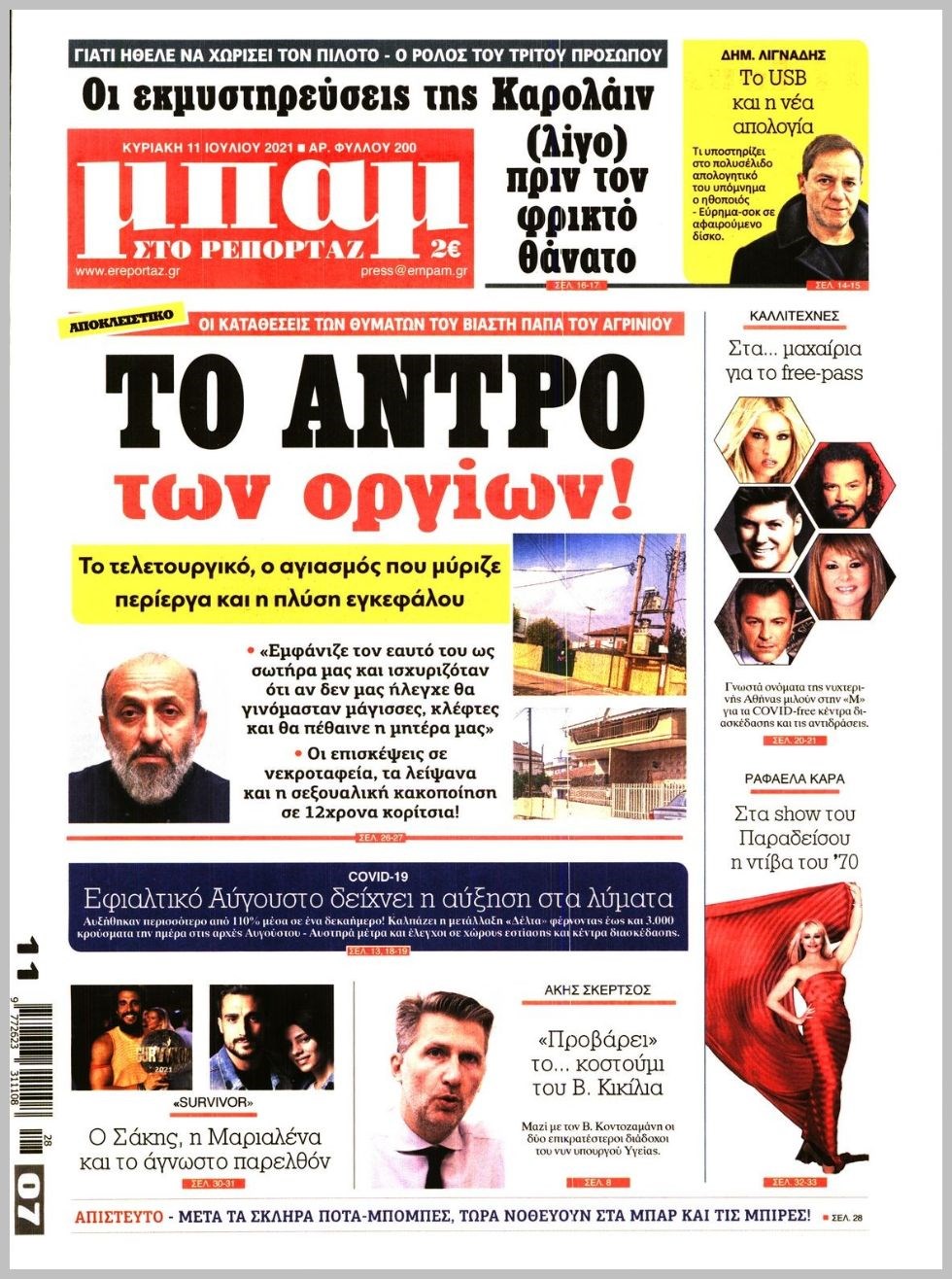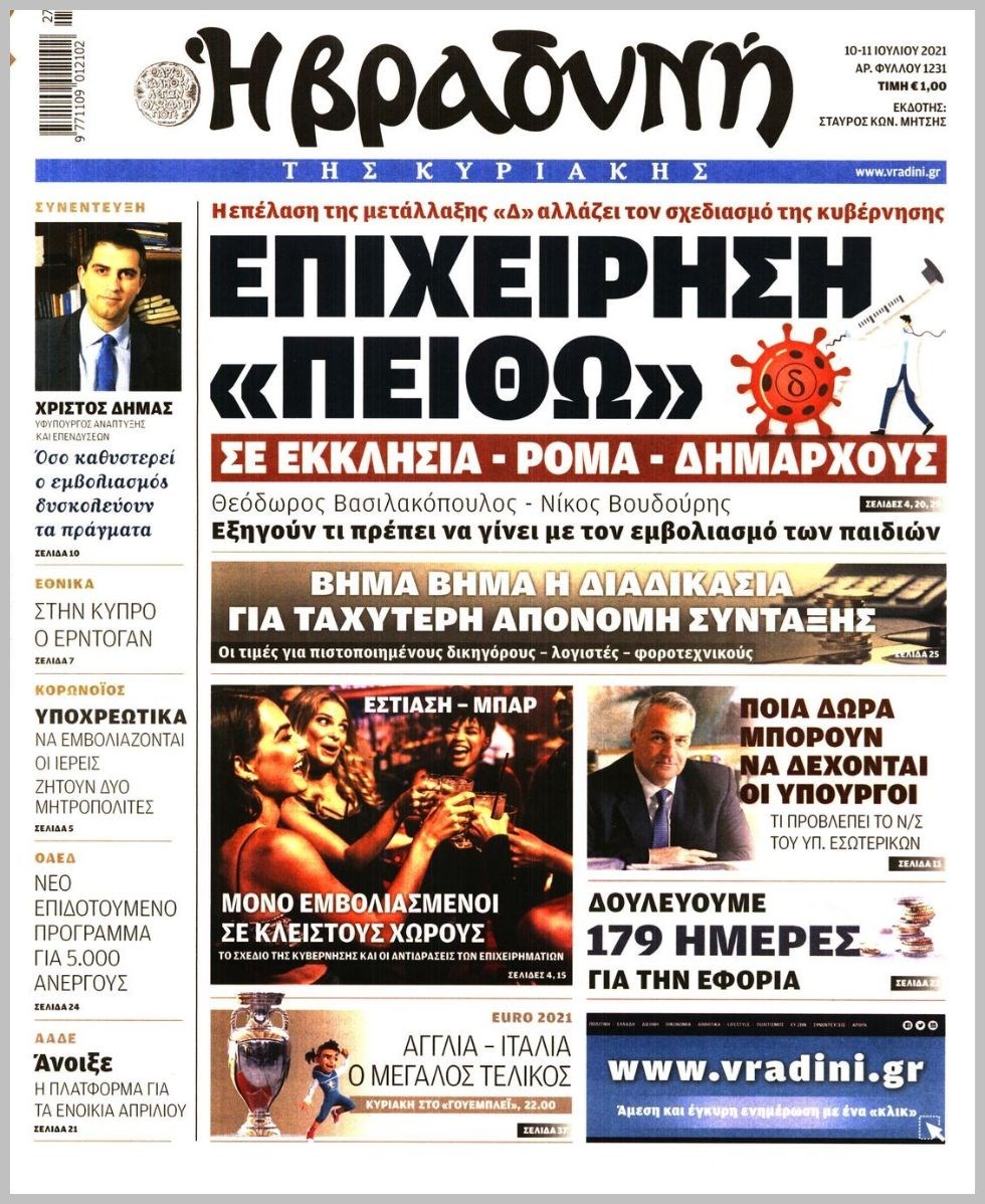 Οι πολιτικές εφημερίδες 11/7/2021 Διονύσης Νίκκας 07:07, Κυριακή 11 Ιουλίου 2021 Media Διαβάστε τα πρωτοσέλιδα των πολιτικών εφημερίδων… ΕΦΗΜΕΡΙΔΕΣ ΠΡΩΤΟΣΕΛΙΔΑ Μοιράσου το: σχολίασε κι εσύ (0 σχόλια) Ακολουθήστε το enikos.gr στο Google News και μάθετε πρώτοι όλες τις ειδήσεις Δείτε όλες τις τελευταίες ειδήσεις από την Ελλάδα και τον Κόσμο στο enikos.gr Ειδήσεις Ροή Ειδήσεων 51 λεπτά πριν Συνεδρίασε το ΚΥΣΕΑ: Παρατείνονται οι θητείες των Αρχηγών σε Ένοπλες Δυνάμεις και Σώματα Ασφαλείας 4 ώρες πριν Αποστολή στη Λευκωσία: Η μέθοδος Doppelganger της Ρωσίας και ο υβριδικός πόλεμος που έχει χτυπήσει και στην Ελλάδα 3 ώρες πριν Αγρότες: Το μεσημέρι στη Νίκαια η συνεδρίαση της πανελλαδικής επιτροπής – Πρόταση για συλλαλητήριο στην Αθήνα την Τρίτη 4 ώρες πριν Τι σημαίνει η συμφωνία ΕΕ – Mercosur για τη χώρα μας – Οι εξαγωγικές προοπτικές για τα ελληνικά αγροδιατροφικά προϊόντα 2 ώρες πριν Πειραιάς: Δεμένα πλοία και ακυρώσεις λόγω των ισχυρών ανέμων – Δεν έχει τεθεί σε ισχύ γενικό απαγορευτικό απόπλου 2 ώρες πριν Τα 4 ζώδια που αλλάζουν «πρόσωπο» – «Δεν υπάρχει πισωγύρισμα, μην αγνοείτε άλλο αυτά που νιώθετε» 1 ώρα πριν Γυναίκα που έχασε βάρος χωρίς στερήσεις αποκαλύπτει: «Αυτά είναι τα 3 πράγματα που με βοήθησαν να μειώσω το σωματικό λίπος σε 1 χρόνο» 3 ώρες πριν Χώρισε με την σύντροφό του επειδή ανακάλυψε πως έχει παιδιά – «Μου είπε πως το κράτησε κρυφό γιατί δεν ήθελε να με τρομάξει» 4 ώρες πριν Εκπληκτική ανακάλυψη σε αρχαία ελληνική πόλη – Βρέθηκε άθικτη κεραμική γραφίδα του 5ου αιώνα π.Χ με τη μορφή του Διονύσου 10 δευτερόλεπτα πριν Θεσσαλονίκη: Δικογραφία σε βάρος εκπροσώπου εταιρείας για περιβαλλοντική ρύπανση 18 λεπτά πριν Φρίκη για 13χρονη που είχε εξαφανιστεί στη Θεσσαλονίκη – Διέμενε στο σπίτι 24χρονου που την βίαζε και της έδινε ναρκωτικά 27 λεπτά πριν Κρήτη: Καρέ καρέ οι κινήσεις διαρρήκτη σε πρακτορείο τυχερών παιχνιδιών στα Χανιά 35 λεπτά πριν Συναγερμός από την Περιφέρεια Αττικής για το νερό της Αίγινας 40 λεπτά πριν Ελένη Φουρέιρα: Μοιράστηκε τρυφερές φωτογραφίες κρατώντας αγκαλιά τον γιο της ENIKOS NETWORK Ο RSV απειλεί τους ηλικιωμένους-Νέα δεδομένα για τον εμβολιασμό 3 συμπτώματα που «ψιθυρίζουν» και 1 που «φωνάζει» ότι κάτι δεν πάει καλά με την υγεία σας, σύμφωνα με αγγειοχειρουργό Δήμος προσλαμβάνει 37 άτομα διαφόρων ειδικοτήτων: Σήμερα αρχίζει η υποβολή αιτήσεων- Όλες οι λεπτομέρειες Δημοσιονομική υπεραπόδοση το 2025 με πρωτογενές πλεόνασμα άνω του στόχου Ο Google Assistant θα παραμείνει λίγο περισσότερο για ορισμένους χρήστες Android Τεστ προσωπικότητας: Το βάζο που θα επιλέξετε αποκαλύπτει πώς λύνετε προβλήματα στη ζωή σας περισσότερα 10:00 , Σάββατο 10 Ιανουαρίου 2026 Αυτή την Κυριακή με τη Realnews: Μυστηριώδης εξαφάνιση – Ένα καθηλωτικό θρίλερ γεμάτο αγωνία από τον διεθνώς αναγνωρισμένο συγγραφέα Rick Mofina Αυτή την Κυριακή με τη Realnews: Μυστηριώδης εξαφάνιση –Ένα καθηλωτικό θρίλερ γεμάτο αγω... 09:27 , Σάββατο 10 Ιανουαρίου 2026 Την Κυριακή με τη Realnews: Ό,τι και αν αγοράσεις, σκανάρεις και κερδίζεις! Την Κυριακή με τη Realnews: Ό,τι και αν αγοράσεις, σκανάρεις και κερδίζεις! Με το PADU app, το... 08:22 , Σάββατο 10 Ιανουαρίου 2026 Το παιδί: Ο Υάκινθος επιστρέφει και οι χωριανοί φτάνουν στο όριο της τρέλας Η αγαπημένη μαύρη μαύρη κοινωνική κωμωδία «Το παιδί» επιστρέφει με νέα επεισόδια και… απροσδόκ... 07:30 , Σάββατο 10 Ιανουαρίου 2026 Οι αθλητικές μεταδόσεις 10/1/2026 Τα τρία παιχνίδια, με τα οποία ανοίγει η αυλαία της 21η