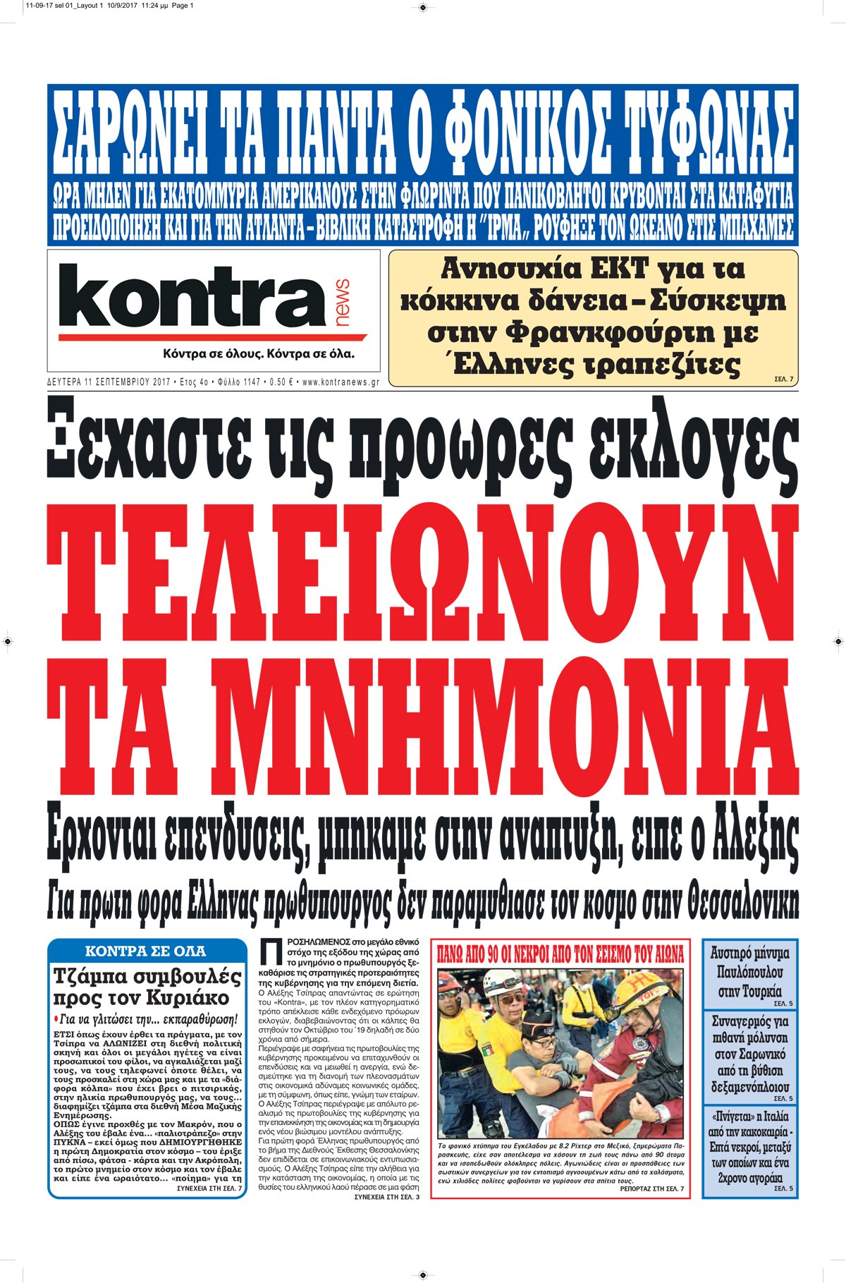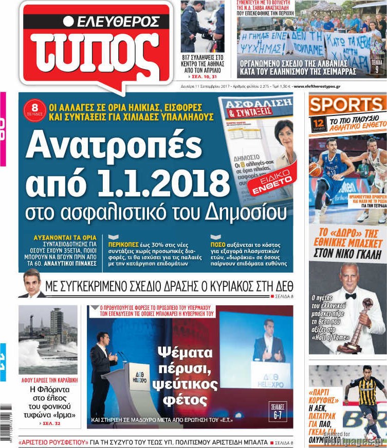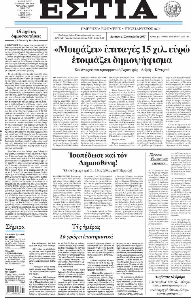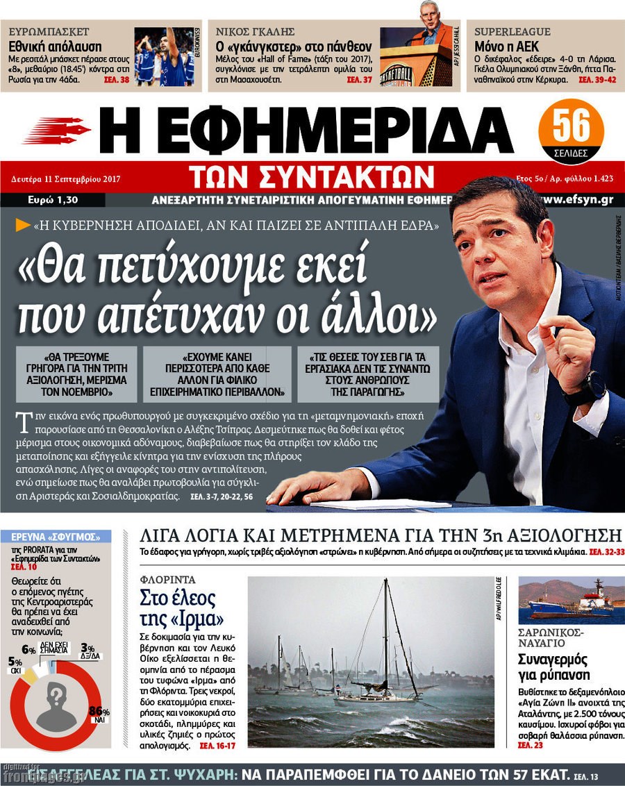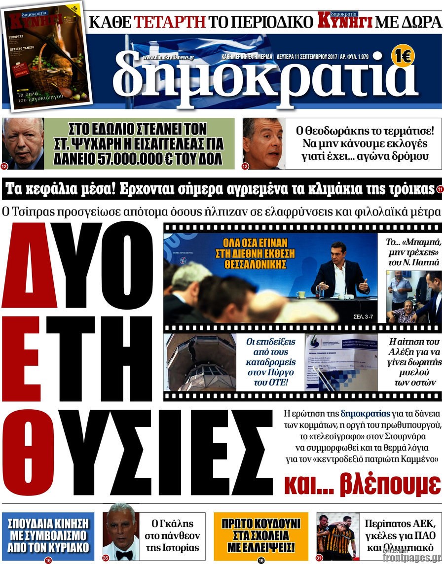 Οι πολιτικές εφημερίδες 11/9/2017 Enikos Newsroom 07:37, Δευτέρα 11 Σεπτεμβρίου 2017 Media Διαβάστε τα σημερινά πρωτοσέλιδα των πολιτικών εφημερίδων: ΠΟΛΙΤΙΚΕΣ ΕΦΗΜΕΡΙΔΕΣ ΠΡΩΤΟΣΕΛΙΔΑ Μοιράσου το: σχολίασε κι εσύ (0 σχόλια) Ακολουθήστε το enikos.gr στο Google News και μάθετε πρώτοι όλες τις ειδήσεις Δείτε όλες τις τελευταίες ειδήσεις από την Ελλάδα και τον Κόσμο στο enikos.gr Ειδήσεις Ροή Ειδήσεων 20 λεπτά πριν Χριστούγεννα στα μπλόκα: Επιμένουν στις κινητοποιήσεις τους οι αγρότες – Ανοίγουν τα διόδια το Σαββατοκύριακο 48 λεπτά πριν Τραμπ: Δεν αποκλείει την πιθανότητα ενός πολέμου στη Βενεζουέλα – «Ο Μαδούρο ξέρει καλύτερα από τον καθένα τι ακριβώς θέλω» 42 λεπτά πριν Ουκρανία: Η άνευ προηγουμένου επίθεση σε ρωσικό τάνκερ στη Μεσόγειο και το μήνυμα προς στον Πούτιν – Το «μακρύ χέρι» του Κιέβου 3 ώρες πριν Πούτιν: «Ναι, είμαι ερωτευμένος» – Βίντεο από τη σπάνια προσωπική παραδοχή του 1 ώρα πριν Συνεχίζει να προκαλεί ο Μίτσκοσκι: «Για μένα το όνομα Μακεδονία είναι ιερό» 2 ώρες πριν Αριθμολογία: Οι άνθρωποι που έχουν γεννηθεί αυτές τις 4 ημερομηνίες, συχνά παρεξηγούνται – «Η καλοσύνη τους κρύβει τεράστια δύναμη» 4 ώρες πριν Μήπως έχετε χάσει τον εαυτό σας στη σχέση σας; 7 «αθόρυβες» υποχωρήσεις που μάλλον κάνατε, χωρίς να το συνειδητοποιήσετε 3 ώρες πριν Ξεχάστε το καθάρισμα το Σαββατοκύριακο: Ο «κανόνας των 20 λεπτών» που θα σας λύσει τα χέρια 58 λεπτά πριν Ύπνος: Μια κρυφή κατάσταση του εγκεφάλου πριν από τον ύπνο μπορεί να είναι το “κλειδί” για υψηλή ευφυΐα και δημιουργικότητα 3 λεπτά πριν Νίκος Ξυλούρης: Συγκινεί η χήρα του σπουδαίου καλλιτέχνη – «Ευχαριστώ όλο τον κόσμο που τον κρατάει ζωντανό 45 χρόνια» 10 λεπτά πριν Παναθηναϊκός: «Μέσα» οι Σφιντέρσκι και Τουμπά για το ματς με τον ΠΑΟΚ – Τι έδειξε η μαγνητική του Πάντοβιτς 15 λεπτά πριν Γιώργος Γιαννόπουλος για “Το σόι σου”: “Είναι ευτυχία και ευλογία αυτή η σειρά” 20 λεπτά πριν Χριστούγεννα στα μπλόκα: Επιμένουν στις κινητοποιήσεις τους οι αγρότες – Ανοίγουν τα διόδια το Σαββατοκύριακο 31 λεπτά πριν Χάρι και Μέγκαν: Η σπάνια οικογενειακή φωτογραφία με τον Άρτσι και τη Λίλιμπετ – Τι σχεδιάζουν για τα Χριστούγεννα ENIKOS NETWORK Το ΕΚΑΒ τιμήθηκε από την Ακαδημία Αθηνών για τα 40 χρόνια προσφοράς του Έχετε πραγματικά μεγάλη καρδιά; 10 χαρακτηριστικά όσων έχουν καλοσύνη Πλήρης επάρκεια προϊόντων στις λαϊκές της Αττικής, παρά τις αγροτικές κινητοποιήσεις – Τι απαντούν οι πωλητές ΑΑΔΕ: Νέες αναβαθμίσεις στο Ψηφιακό Πελατολόγιο και την εφαρμογή myDATAapp – Τι πρέπει να γνωρίζετε Χαρτογραφώντας το «σημείο χωρίς επιστροφή»: Για πρώτη φορά αποκαλύπτεται με λεπτομέρεια το ακανθώδες όριο της ατμόσφαιρας τ... Η Google καταργεί τη λειτουργία «dark web report» – Πώς θα μπορούν οι χρήστες να διαγράφουν τα δεδομένα τους περισσότερα 22:42 , Παρασκευή 19 Δεκεμβρίου 2025 Γιώργος Γιαννόπουλος για “Το σόι σου”: “Είναι ευτυχία και ευλογία αυτή η σειρά” «Είναι ευτυχία και ευλογία η συγκυρία αυτής της σειράς», θα πει ο Γιώργος Γιαννόπουλος -ο αγαπ... 20:37 , Παρασκευή 19 Δεκεμβρίου 2025 Don’t Forget The Lyrics: Η Έλλη Κοκκίνου υποδέχεται 4 παίκτες που θα κάνουν τα πάντα για να μη χάσουν ούτε… μισή λέξη από τους στίχους Το «Don’t Forget The Lyrics» επιστρέφει απόψε, Παρασκευή 19 Δεκεμβρίου, στις 21:00 με νέο επει... 19:31 , Παρασκευή 19 Δεκεμβρίου 2025 GNTM: Απόψε ο μεγάλος τελικός για τους 4 φιναλίστ Έπειτα από μήνες γεμάτους μόδα, δημιουργία και έντονες αναμετρήσεις, το GNTM 2025 κορυφώνεται,... 18:11 , Παρασκευ