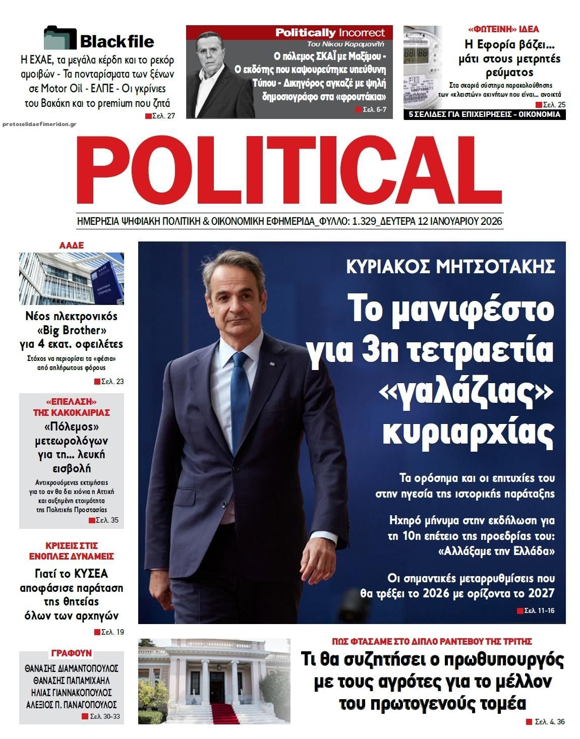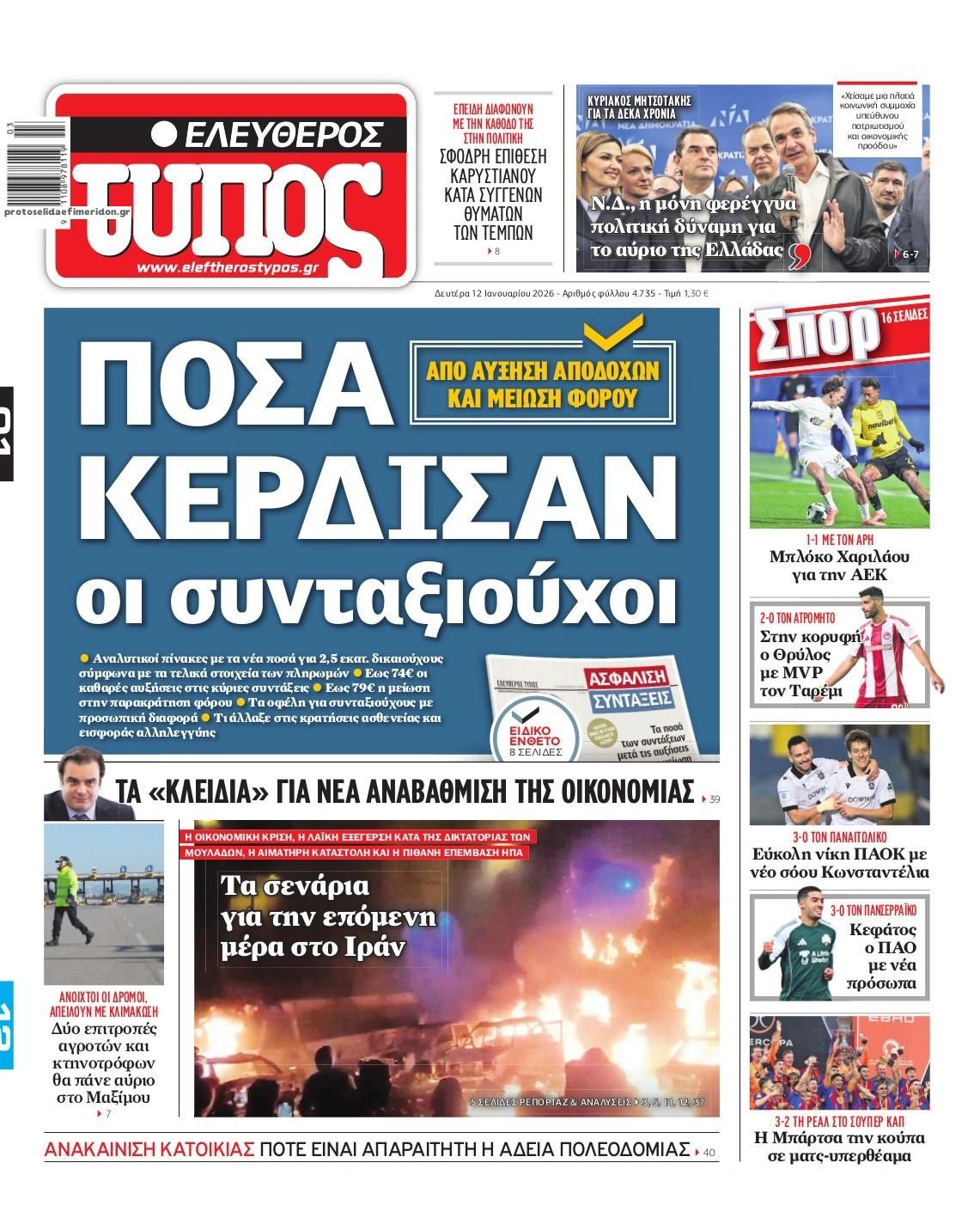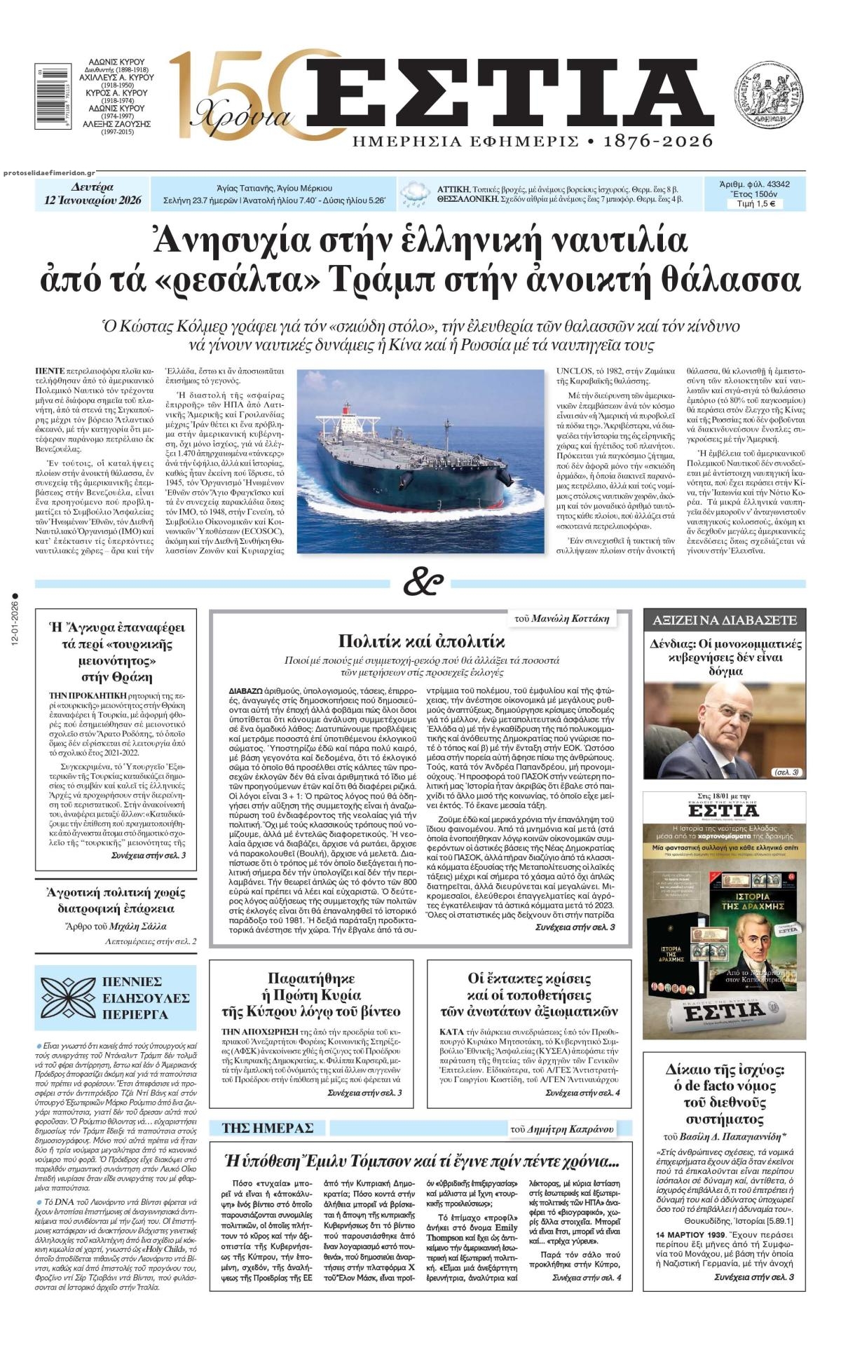 Οι πολιτικές εφημερίδες 12/1/2026 Σήφης Γαρυφαλάκης 05:38, Δευτέρα 12 Ιανουαρίου 2026 Media Διαβάστε τα πρωτοσέλιδα από τις πολιτικές εφημερίδες, σήμερα 12/1/2026. ΕΦΗΜΕΡΙΔΕΣ ΠΟΛΙΤΙΚΕΣ ΕΦΗΜΕΡΙΔΕΣ ΠΡΩΤΟΣΕΛΙΔΑ Μοιράσου το: σχολίασε κι εσύ (0 σχόλια) Ακολουθήστε το enikos.gr στο Google News και μάθετε πρώτοι όλες τις ειδήσεις Δείτε όλες τις τελευταίες ειδήσεις από την Ελλάδα και τον Κόσμο στο enikos.gr Ειδήσεις Ροή Ειδήσεων 2 ώρες πριν Το Ιράν πλησιάζει σε μια επανάσταση που θα αναδιαμορφώσει τον κόσμο – «Η πιο σημαντική στιγμή για τη χώρα από το 1979» 3 ώρες πριν Γροιλανδία: Γιατί οι απειλές του Ντόναλντ Τραμπ ξυπνούν μνήμες από τις σκοτεινές στιγμές των συμμαχιών του «Ψυχρού Πολέμου» – Ανάλυση Guardian 2 ώρες πριν ΔΥΠΑ: Επιδοτήσεις 17.500 ευρώ σε ανέργους για να ανοίξουν τη δική τους επιχείρηση – Όλες οι λεπτομέρειες 1 ώρα πριν Αποστολή στην Κύπρο: Στο Λονδίνο ψάχνουν τα ίχνη των «Ολλανδών επιχειρηματιών» για το σκάνδαλο με το βίντεο 46 λεπτά πριν Χρυσές Σφαίρες 2026: Θρίαμβος για το «One Battle After Another» με 4 βραβεία και δικαίωση για τον Σαλαμέ – Η λίστα των μεγάλων νικητών 6 ώρες πριν Τα ζώδια σήμερα, Δευτέρα 12 Ιανουαρίου 2026: Ζυγοί, είστε έτοιμοι για μια ανανέωση στη ζωή σας 3 ώρες πριν Οπτική ψευδαίσθηση: Μόνο αν είσαι ο Σέρλοκ Χολμς θα βρεις τον μοναχικό παπαγάλο σε 8 δευτερόλεπτα 3 ώρες πριν Κολλαγόνο: Ποια είναι η καλύτερη ώρα για τη λήψη του, σύμφωνα με διαιτολόγους 47 λεπτά πριν Ανακαλύφθηκε πρωτόγνωρο οστέινο κουτί μέσα σε τάφο γυναίκας – Τα μοναδικά μοτίβα με τους ομόκεντρους κύκλους 3 λεπτά πριν Ξανά στο εδώλιο η Ρούλα Πισπιρίγκου: Αρχίζει η δίκη για την δολοφονία της Τζωρτζίνας στο Εφετείο 8 λεπτά πριν Οι εξαγγελίες Καρυστιανού και η επόμενη ημέρα – Με ποιους συζητά για το νέο κόμμα 13 λεπτά πριν Τζολάκης – Σπανού: Μαζί στο επόμενο βήμα 17 λεπτά πριν Θεσσαλονίκη: Νεκρή εντοπίστηκε η ηλικιωμένη που έψαχναν σε σπίτι που πήρε φωτιά στον Σοχό 17 λεπτά πριν Παύλος Μαρινάκης: «Αναζητούμε τη χρυσή τομή με τους αγρότες» ENIKOS NETWORK Αυτή την Κυριακή με τη Realnews: Στοιχειωμένα μυστικά της Emmeline Duncan, μαζί αστυνομικά best sellers Covid: Πότε ο κορωνοϊός μπορεί να προκαλέσει θρομβώσεις στο αίμα – Πώς να προστατευτούμε; ΔΥΠΑ: Επιδοτήσεις 17.500 ευρώ σε ανέργους για να ανοίξουν την δική τους επιχείρηση Συντάξεις: Ολοταχώς προς νέο ρεκόρ συνταξιοδοτήσεων το 2025 – Οι βασικοί λόγοι Ο Google Assistant θα παραμείνει λίγο περισσότερο για ορισμένους χρήστες Android Τεστ προσωπικότητας: Το βάζο που θα επιλέξετε αποκαλύπτει πώς λύνετε προβλήματα στη ζωή σας περισσότερα 08:07 , Δευτέρα 12 Ιανουαρίου 2026 Χρυσές Σφαίρες 2026: Θρίαμβος για το «One Battle After Another» με 4 βραβεία και δικαίωση για τον Σαλαμέ – Η λίστα των μεγάλων νικητών Με ανατροπές και σαρκασμό η 83η τελετή για τις Χρυσές Σφαίρες ολοκληρώθηκε το βράδυ της Κυριακ... 08:00 , Δευτέρα 12 Ιανουαρίου 2026 Αυτή την Κυριακή με τη Realnews: Στοιχειωμένα μυστικά – Ένα συναρπαστικό μυθιστόρημα της Emmeline Duncan Αυτή την Κυριακή με τη Realnews: Στοιχειωμένα μυστικά – Ένα συναρπαστικό μυθιστόρημα της... 07:21 , Δευτέρα 12 Ιανουαρίου 2026 Αυτή την Κυριακή με τη Realnews: Στοιχειωμένα μυστικά της Emmeline Duncan – Μαζί αστυνομικά best sellers Αυτή την Κυριακή με τη Realnews: Στοιχειωμένα μυστικά της Emmeline Duncan – Μαζί αστυνομ... 13:34 , Κυριακή 11 Ιανουαρίου 2026 Σήμερα με τη Realnews: Μυστηριώδης εξαφάνιση – Ένα καθηλωτικό θρίλερ γεμάτο αγωνία από τον διεθνώς αναγνωρισμένο συγγραφέα Rick Mofina Σήμερα με τη Realnews: Μυστηριώδης εξαφάνιση –Ένα καθηλωτικό θρίλερ γε