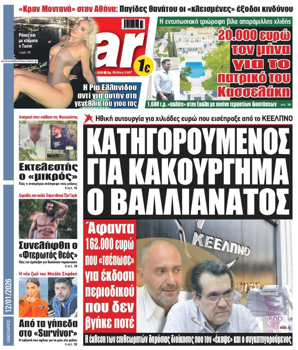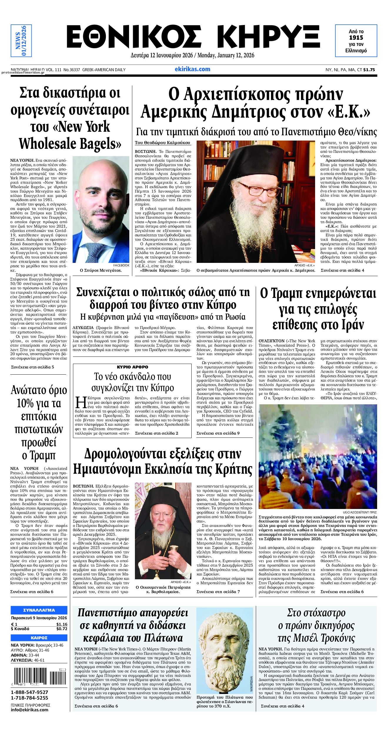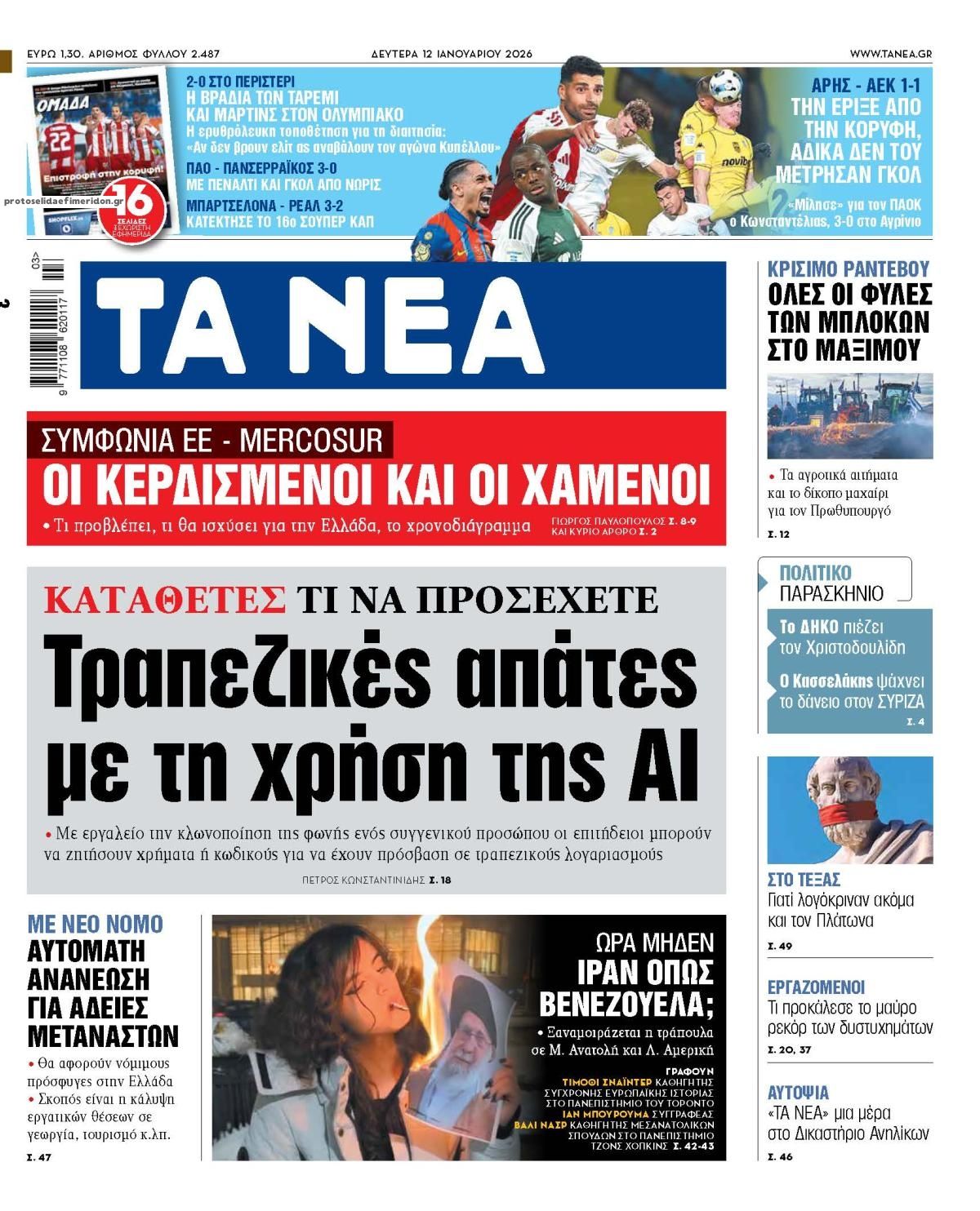 Οι πολιτικές εφημερίδες 12/1/2026 Σήφης Γαρυφαλάκης 05:38, Δευτέρα 12 Ιανουαρίου 2026 Media Διαβάστε τα πρωτοσέλιδα από τις πολιτικές εφημερίδες, σήμερα 12/1/2026. ΕΦΗΜΕΡΙΔΕΣ ΠΟΛΙΤΙΚΕΣ ΕΦΗΜΕΡΙΔΕΣ ΠΡΩΤΟΣΕΛΙΔΑ Μοιράσου το: σχολίασε κι εσύ (0 σχόλια) Ακολουθήστε το enikos.gr στο Google News και μάθετε πρώτοι όλες τις ειδήσεις Δείτε όλες τις τελευταίες ειδήσεις από την Ελλάδα και τον Κόσμο στο enikos.gr Ειδήσεις Ροή Ειδήσεων 2 ώρες πριν Το Ιράν πλησιάζει σε μια επανάσταση που θα αναδιαμορφώσει τον κόσμο – «Η πιο σημαντική στιγμή για τη χώρα από το 1979» 3 ώρες πριν Γροιλανδία: Γιατί οι απειλές του Ντόναλντ Τραμπ ξυπνούν μνήμες από τις σκοτεινές στιγμές των συμμαχιών του «Ψυχρού Πολέμου» – Ανάλυση Guardian 2 ώρες πριν ΔΥΠΑ: Επιδοτήσεις 17.500 ευρώ σε ανέργους για να ανοίξουν τη δική τους επιχείρηση – Όλες οι λεπτομέρειες 1 ώρα πριν Αποστολή στην Κύπρο: Στο Λονδίνο ψάχνουν τα ίχνη των «Ολλανδών επιχειρηματιών» για το σκάνδαλο με το βίντεο 46 λεπτά πριν Χρυσές Σφαίρες 2026: Θρίαμβος για το «One Battle After Another» με 4 βραβεία και δικαίωση για τον Σαλαμέ – Η λίστα των μεγάλων νικητών 6 ώρες πριν Τα ζώδια σήμερα, Δευτέρα 12 Ιανουαρίου 2026: Ζυγοί, είστε έτοιμοι για μια ανανέωση στη ζωή σας 3 ώρες πριν Οπτική ψευδαίσθηση: Μόνο αν είσαι ο Σέρλοκ Χολμς θα βρεις τον μοναχικό παπαγάλο σε 8 δευτερόλεπτα 3 ώρες πριν Κολλαγόνο: Ποια είναι η καλύτερη ώρα για τη λήψη του, σύμφωνα με διαιτολόγους 47 λεπτά πριν Ανακαλύφθηκε πρωτόγνωρο οστέινο κουτί μέσα σε τάφο γυναίκας – Τα μοναδικά μοτίβα με τους ομόκεντρους κύκλους 3 λεπτά πριν Ξανά στο εδώλιο η Ρούλα Πισπιρίγκου: Αρχίζει η δίκη για την δολοφονία της Τζωρτζίνας στο Εφετείο 8 λεπτά πριν Οι εξαγγελίες Καρυστιανού και η επόμενη ημέρα – Με ποιους συζητά για το νέο κόμμα 13 λεπτά πριν Τζολάκης – Σπανού: Μαζί στο επόμενο βήμα 17 λεπτά πριν Θεσσαλονίκη: Νεκρή εντοπίστηκε η ηλικιωμένη που έψαχναν σε σπίτι που πήρε φωτιά στον Σοχό 17 λεπτά πριν Παύλος Μαρινάκης: «Αναζητούμε τη χρυσή τομή με τους αγρότες» ENIKOS NETWORK Αυτή την Κυριακή με τη Realnews: Στοιχειωμένα μυστικά της Emmeline Duncan, μαζί αστυνομικά best sellers Covid: Πότε ο κορωνοϊός μπορεί να προκαλέσει θρομβώσεις στο αίμα – Πώς να προστατευτούμε; ΔΥΠΑ: Επιδοτήσεις 17.500 ευρώ σε ανέργους για να ανοίξουν την δική τους επιχείρηση Συντάξεις: Ολοταχώς προς νέο ρεκόρ συνταξιοδοτήσεων το 2025 – Οι βασικοί λόγοι Ο Google Assistant θα παραμείνει λίγο περισσότερο για ορισμένους χρήστες Android Τεστ προσωπικότητας: Το βάζο που θα επιλέξετε αποκαλύπτει πώς λύνετε προβλήματα στη ζωή σας περισσότερα 08:07 , Δευτέρα 12 Ιανουαρίου 2026 Χρυσές Σφαίρες 2026: Θρίαμβος για το «One Battle After Another» με 4 βραβεία και δικαίωση για τον Σαλαμέ – Η λίστα των μεγάλων νικητών Με ανατροπές και σαρκασμό η 83η τελετή για τις Χρυσές Σφαίρες ολοκληρώθηκε το βράδυ της Κυριακ... 08:00 , Δευτέρα 12 Ιανουαρίου 2026 Αυτή την Κυριακή με τη Realnews: Στοιχειωμένα μυστικά – Ένα συναρπαστικό μυθιστόρημα της Emmeline Duncan Αυτή την Κυριακή με τη Realnews: Στοιχειωμένα μυστικά – Ένα συναρπαστικό μυθιστόρημα της... 07:21 , Δευτέρα 12 Ιανουαρίου 2026 Αυτή την Κυριακή με τη Realnews: Στοιχειωμένα μυστικά της Emmeline Duncan – Μαζί αστυνομικά best sellers Αυτή την Κυριακή με τη Realnews: Στοιχειωμένα μυστικά της Emmeline Duncan – Μαζί αστυνομ... 13:34 , Κυριακή 11 Ιανουαρίου 2026 Σήμερα με τη Realnews: Μυστηριώδης εξαφάνιση – Ένα καθηλωτικό θρίλερ γεμάτο αγωνία από τον διεθνώς αναγνωρισμένο συγγραφέα Rick Mofina Σήμερα με τη Realnews: Μυστηριώδης εξαφάνιση –Ένα καθηλωτικό θρίλερ γε