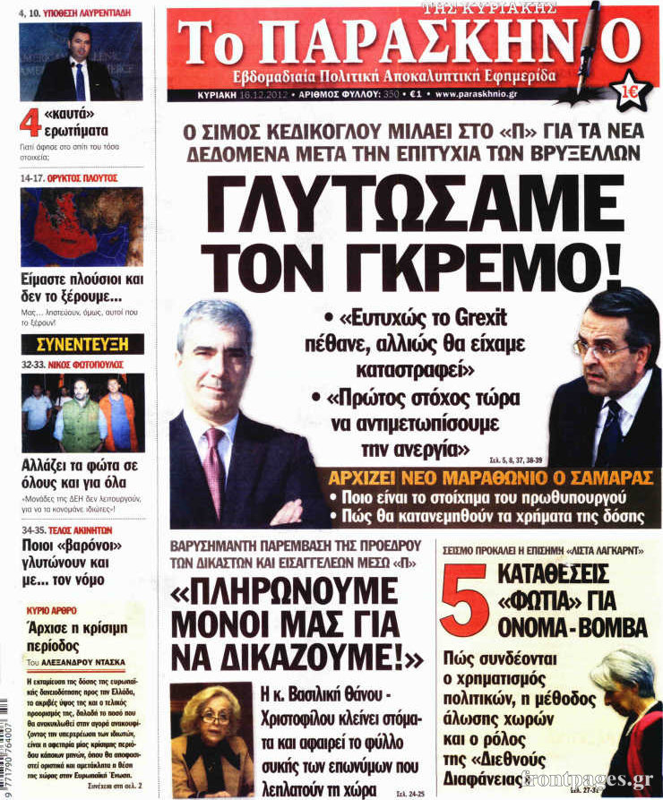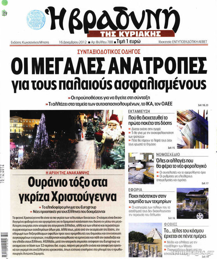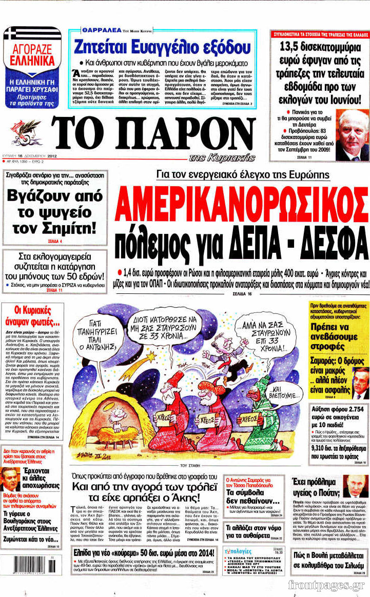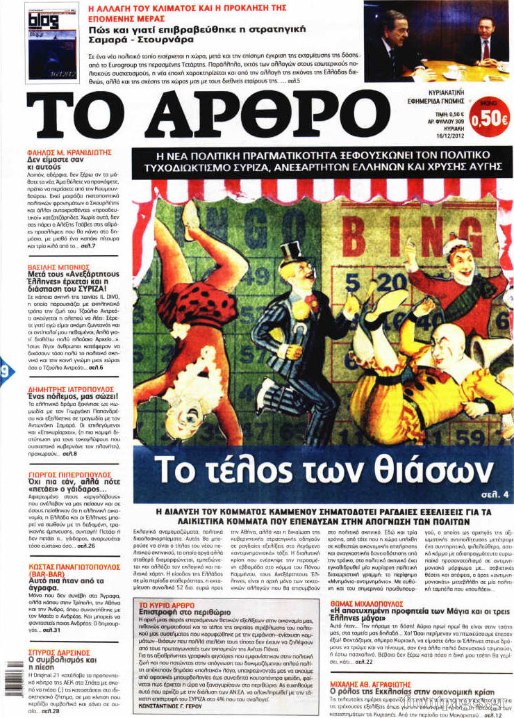 Οι πολιτικές εφημερίδες Enikos Newsroom 08:46, Κυριακή 16 Δεκεμβρίου 2012 Media Οι πολιτικές εφημερίδες Τα πρωτοσέλιδα των πολιτικών εφημερίδων. ΕΦΗΜΕΡΙΔΕΣ ΚΥΡΙΑΚΑΤΙΚΕΣ ΕΦΗΜΕΡΙΔΕΣ ΠΟΛΙΤΙΚΕΣ ΕΦΗΜΕΡΙΔΕΣ ΠΡΩΤΟΣΕΛΙΔΑ Μοιράσου το: σχολίασε κι εσύ (0 σχόλια) Ακολουθήστε το enikos.gr στο Google News και μάθετε πρώτοι όλες τις ειδήσεις Δείτε όλες τις τελευταίες ειδήσεις από την Ελλάδα και τον Κόσμο στο enikos.gr Ειδήσεις Ροή Ειδήσεων 7 ώρες πριν Εκτός ευρωομάδας ΣΥΡΙΖΑ ο Νίκος Παππάς μετά την επίθεση στον δημοσιογράφο Νίκο Γιαννόπουλο – Η μήνυση και οι νέες δηλώσεις 7 ώρες πριν «Αγριεύουν» οι αγρότες: «Δεν συντρέχει λόγος συνάντησης με τον πρωθυπουργό» – Ώρα αποφάσεων στη σύσκεψη της Πέμπτης 7 ώρες πριν Κυψέλη: Χωρίς την οικογένειά της δίπλα της απολογήθηκε η 16χρονη – «Της είχε επιτεθεί κάποιος για να την βιάσει, φοβήθηκε και κυκλοφορούσε με μαχαίρι» 7 ώρες πριν Politico: Το πρόβλημα της Ευρώπης δεν είναι το Βέλγιο αλλά ο Ντόναλντ Τραμπ 8 ώρες πριν Αλεξανδρούπολη: Πολυοργανική ανεπάρκεια λόγω υποσιτισμού η αιτία θανάτου του 3χρονου αγοριού 7 ώρες πριν Μυστήριο με τεράστιες κυκλικές πέτρες 200 κιλών – Ανακαλύφθηκαν τυχαία κατά τη διάρκεια οδικών έργων και κανείς δεν ξέρει από πού προέρχονται 8 ώρες πριν Ύπνος: Ειδικός εξηγεί τον πραγματικό λόγο που ξυπνάτε στις 4 τα ξημερώματα – Ο ρόλος των ορμονών και του κιρκάδιου ρυθμού 9 ώρες πριν Αριθμολογία: Οι άνθρωποι που έχουν γεννηθεί αυτές τις 4 ημερομηνίες, είναι τρυφεροί και αγαπούν ανιδιοτελώς 20 ώρες πριν 20 χρόνια τα Χριστούγεννα ξεκινούν στα Public με μεγάλη ποικιλία σε δώρα! 2 λεπτά πριν Οι οικονομικές εφημερίδες 18/12/2025 7 λεπτά πριν Οι αθλητικές εφημερίδες 18/12/2025 12 λεπτά πριν Οι πολιτικές εφημερίδες 18/12/2025 20 λεπτά πριν Τα ζώδια σήμερα, Πέμπτη 18 Δεκεμβρίου: Λέοντες, η καρδιά σας θέλει να εκφραστεί 28 λεπτά πριν Το Ποντίκι σήμερα Πέμπτη 18/12/2025 ENIKOS NETWORK Αϋπνία: Το κόλπο που θα σας βοηθήσει να κοιμηθείτε απόψε – Είναι απλό και έχει αποτέλεσμα 2,6 εκατομμύρια πολίτες έχουν ήδη εμβολιαστεί κατά της γρίπης ΕΛΣΤΑΤ: Τι δείχνουν τα νέα στοιχεία για τις ηλεκτρονικές παραγγελίες των επιχειρήσεων ΚΕΠΕ: Οι 3 διακριτές συμβολές των ΜμΕ και της μεταποίησης στην ελληνική οικονομία Χαρτογραφώντας το «σημείο χωρίς επιστροφή»: Για πρώτη φορά αποκαλύπτεται με λεπτομέρεια το ακανθώδες όριο της ατμόσφαιρας τ... Η Google καταργεί τη λειτουργία «dark web report» – Πώς θα μπορούν οι χρήστες να διαγράφουν τα δεδομένα τους περισσότερα 05:48 , Πέμπτη 18 Δεκεμβρίου 2025 Οι οικονομικές εφημερίδες 18/12/2025 Διαβάστε τα πρωτοσέλιδα από τις οικονομικές εφημερίδες, σήμερα 18/12/2025. 05:43 , Πέμπτη 18 Δεκεμβρίου 2025 Οι αθλητικές εφημερίδες 18/12/2025 Διαβάστε τα πρωτοσέλιδα από τις αθλητικές εφημερίδες, σήμερα 18/12/2025. 05:38 , Πέμπτη 18 Δεκεμβρίου 2025 Οι πολιτικές εφημερίδες 18/12/2025 Διαβάστε τα πρωτοσέλιδα από τις πολιτικές εφημερίδες, σήμερα 18/12/2025. 05:22 , Πέμπτη 18 Δεκεμβρίου 2025 Το Ποντίκι σήμερα Πέμπτη 18/12/2025 Διαβάστε το πρωτοσέλιδο της εφημερίδας «Το Ποντίκι» σήμερα 18/12/2025. ΤΕΛΕΥΤΑΙΕΣ ΕΙΔΗΣΕΙΣ 2 λεπτά πριν Οι οικονομικές εφημερίδες 18/12/2025 7 λεπτά πριν Οι αθλητικές εφημερίδες 18/12/2025 12 λεπτά πριν Οι πολιτικές εφημερίδες 18/12/2025 20 λεπτά πριν Τα ζώδια σήμερα, Πέμπτη 18 Δεκεμβρίου: Λέοντες, η καρδιά... 28 λεπτά πριν Το Ποντίκι σήμερα Πέμπτη 18/12/2025 33 λεπτά πριν Εφημερεύοντα φαρμακεία σε Αθήνα και Θεσσαλονίκη (18/12) 35 λεπτά πριν Αλεξάνδρα Ούστα: «Αυτό που με τρέλανε στον σύζυγό μου... 42 λεπτά πριν Μιχάλης Αεράκης: «Της είπα “θ