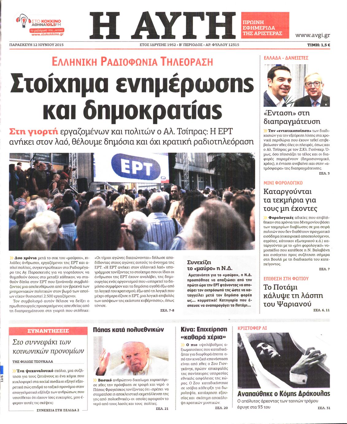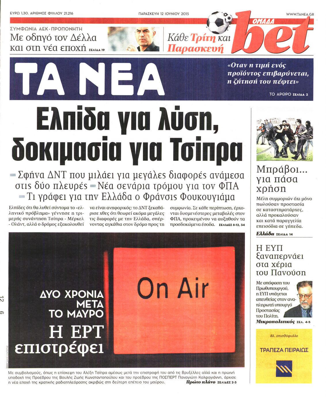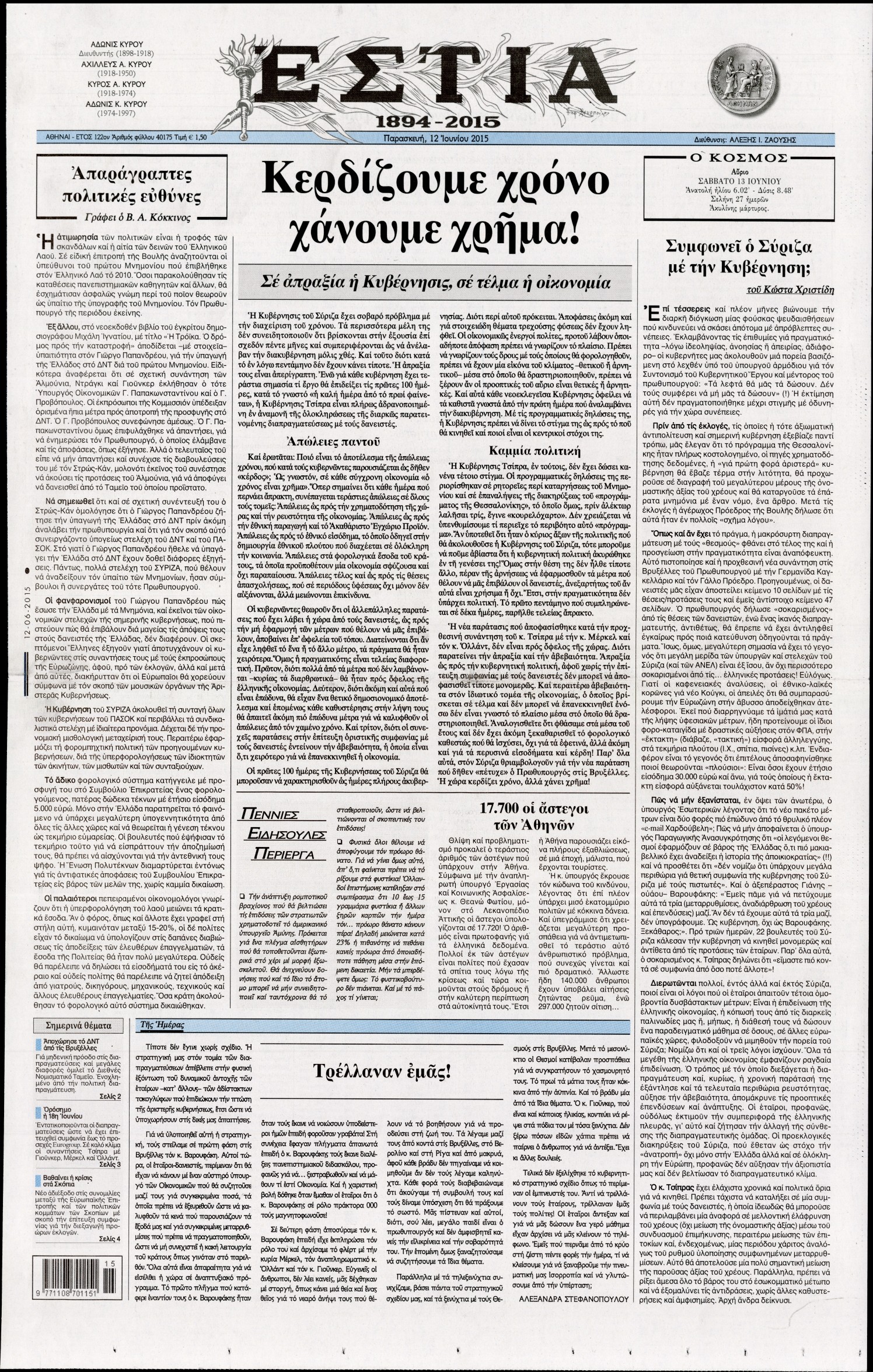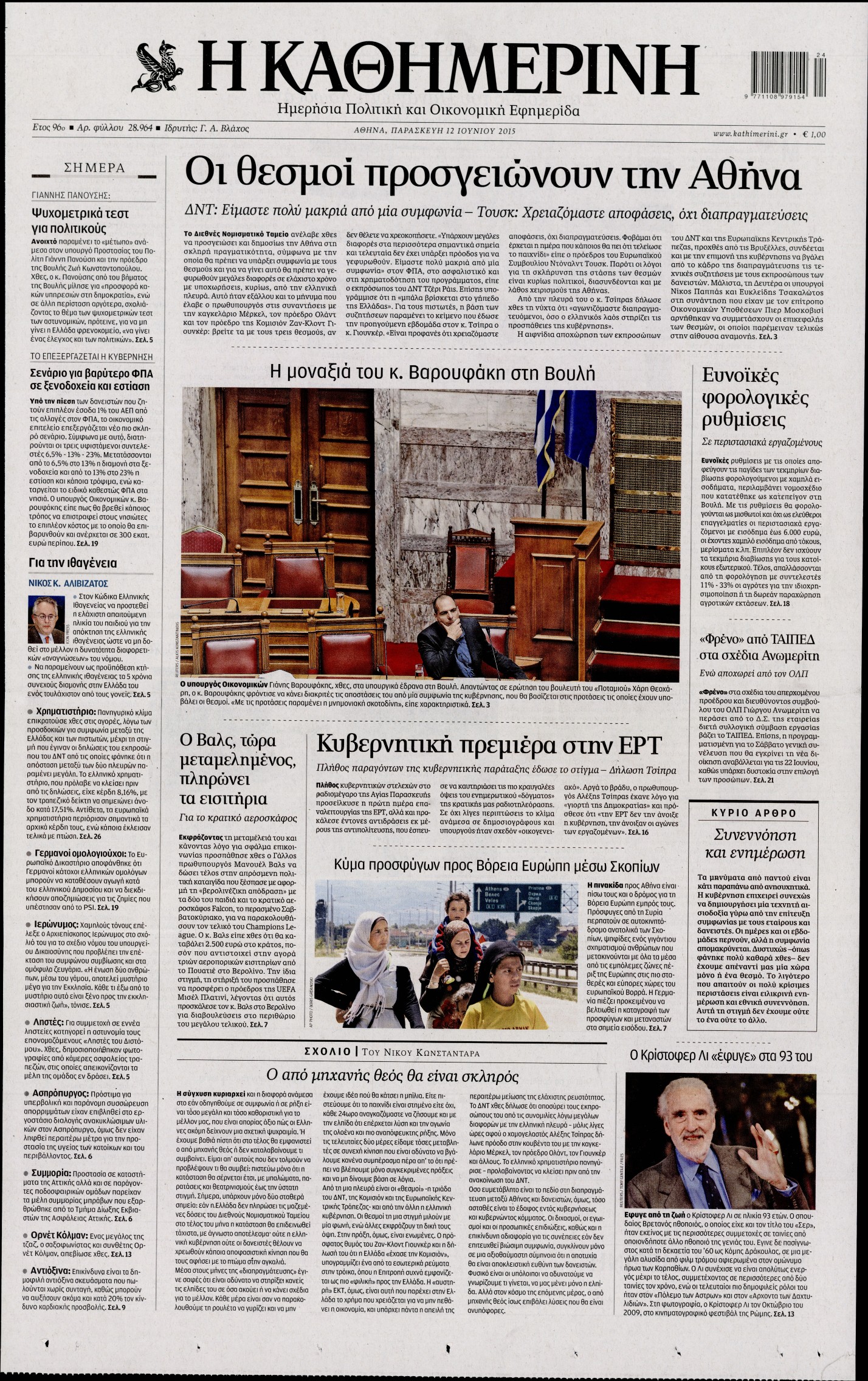 Οι πολιτικές εφημερίδες 12/6/2015 Enikos Newsroom 06:48, Παρασκευή 12 Ιουνίου 2015 Media Διαβάστε τα σημερινά πρωτοσέλιδα των πολιτικών εφημερίδων: ΠΟΛΙΤΙΚΕΣ ΕΦΗΜΕΡΙΔΕΣ ΠΡΩΤΟΣΕΛΙΔΑ Μοιράσου το: σχολίασε κι εσύ (0 σχόλια) Ακολουθήστε το enikos.gr στο Google News και μάθετε πρώτοι όλες τις ειδήσεις Δείτε όλες τις τελευταίες ειδήσεις από την Ελλάδα και τον Κόσμο στο enikos.gr Ειδήσεις Ροή Ειδήσεων 4 ώρες πριν Χριστούγεννα στα μπλόκα: Επιμένουν στις κινητοποιήσεις τους οι αγρότες – Ανοίγουν τα διόδια το Σαββατοκύριακο 5 ώρες πριν Ουκρανία: Η άνευ προηγουμένου επίθεση σε ρωσικό τάνκερ στη Μεσόγειο και το μήνυμα προς στον Πούτιν – Το «μακρύ χέρι» του Κιέβου 4 ώρες πριν Πούτιν: Τα μηνύματα σε Ευρώπη και ΝΑΤΟ από το μαραθώνιο «σόου» του – Η απαίτηση για «σεβασμό» και η ειρήνη «με τους όρους» της Μόσχας 5 ώρες πριν Τραμπ: Δεν αποκλείει την πιθανότητα ενός πολέμου στη Βενεζουέλα – «Ο Μαδούρο ξέρει καλύτερα από τον καθένα τι ακριβώς θέλω» 5 ώρες πριν Συνεχίζει να προκαλεί ο Μίτσκοσκι: «Για μένα το όνομα Μακεδονία είναι ιερό» 4 ώρες πριν Ανακαλύφθηκαν αρχαία χρυσά νομίσματα 2.200 ετών που απεικονίζουν τον θεό Απόλλωνα – Η άγνωστη σύνδεση με τον Φίλιππο Β΄ της Μακεδονίας 5 ώρες πριν Ύπνος: Μια κρυφή κατάσταση του εγκεφάλου πριν από τον ύπνο μπορεί να είναι το “κλειδί” για υψηλή ευφυΐα και δημιουργικότητα 6 ώρες πριν Αριθμολογία: Οι άνθρωποι που έχουν γεννηθεί αυτές τις 4 ημερομηνίες, συχνά παρεξηγούνται – «Η καλοσύνη τους κρύβει τεράστια δύναμη» 7 ώρες πριν Ξεχάστε το καθάρισμα το Σαββατοκύριακο: Ο «κανόνας των 20 λεπτών» που θα σας λύσει τα χέρια 23 λεπτά πριν Θεσσαλονίκη: Εξαφανίστηκε 13χρονος από χώρο φιλοξενίας ασυνόδευτων ανηλίκων στο Ωραιόκαστρο 34 λεπτά πριν Ντόναλντ Τραμπ: «Πολύ βαριά αντίποινα» στη Συρία – «Πλήττουμε πολύ δυνατά οχυρά του Ισλαμικού Κράτους» 48 λεπτά πριν Εξάρχεια: Ένταση με μολότοφ, χημικά και κρότου λάμψης 1 ώρα πριν ΗΠΑ: Τραγωδία στην Αλαμπάμα – Σκότωσε την δημοσιογράφο σύζυγό του και αυτοκτόνησε μπροστά στον 3χρονο γιο τους 1 ώρα πριν Πρόταση γάμου στο ΣΕΦ κατά την διάρκεια του αγώνα Ολυμπιακός-Βιλερμπάν – Δείτε βίντεο ENIKOS NETWORK Το ΕΚΑΒ τιμήθηκε από την Ακαδημία Αθηνών για τα 40 χρόνια προσφοράς του Έχετε πραγματικά μεγάλη καρδιά; 10 χαρακτηριστικά όσων έχουν καλοσύνη Αναστολή μέτρων αναγκαστικής εκτέλεσης για κτηνοτρόφους που πλήττονται από την ευλογιά των αιγοπροβάτων Πλήρης επάρκεια προϊόντων στις λαϊκές της Αττικής, παρά τις αγροτικές κινητοποιήσεις – Τι απαντούν οι πωλητές Χαρτογραφώντας το «σημείο χωρίς επιστροφή»: Για πρώτη φορά αποκαλύπτεται με λεπτομέρεια το ακανθώδες όριο της ατμόσφαιρας τ... Η Google καταργεί τη λειτουργία «dark web report» – Πώς θα μπορούν οι χρήστες να διαγράφουν τα δεδομένα τους περισσότερα 22:42 , Παρασκευή 19 Δεκεμβρίου 2025 Γιώργος Γιαννόπουλος για “Το σόι σου”: “Είναι ευτυχία και ευλογία αυτή η σειρά” «Είναι ευτυχία και ευλογία η συγκυρία αυτής της σειράς», θα πει ο Γιώργος Γιαννόπουλος -ο αγαπ... 20:37 , Παρασκευή 19 Δεκεμβρίου 2025 Don’t Forget The Lyrics: Η Έλλη Κοκκίνου υποδέχεται 4 παίκτες που θα κάνουν τα πάντα για να μη χάσουν ούτε… μισή λέξη από τους στίχους Το «Don’t Forget The Lyrics» επιστρέφει απόψε, Παρασκευή 19 Δεκεμβρίου, στις 21:00 με νέο επει... 19:31 , Παρασκευή 19 Δεκεμβρίου 2025 GNTM: Απόψε ο μεγάλος τελικός για τους 4 φιναλίστ Έπειτα από μήνες γεμάτους μόδα, δημιουργία και έντονες αναμετρήσεις, το GNTM 2025 κορυφώνεται,... 18:11 , Παρασκευή 19 Δεκεμβρίου 2025 Το σ