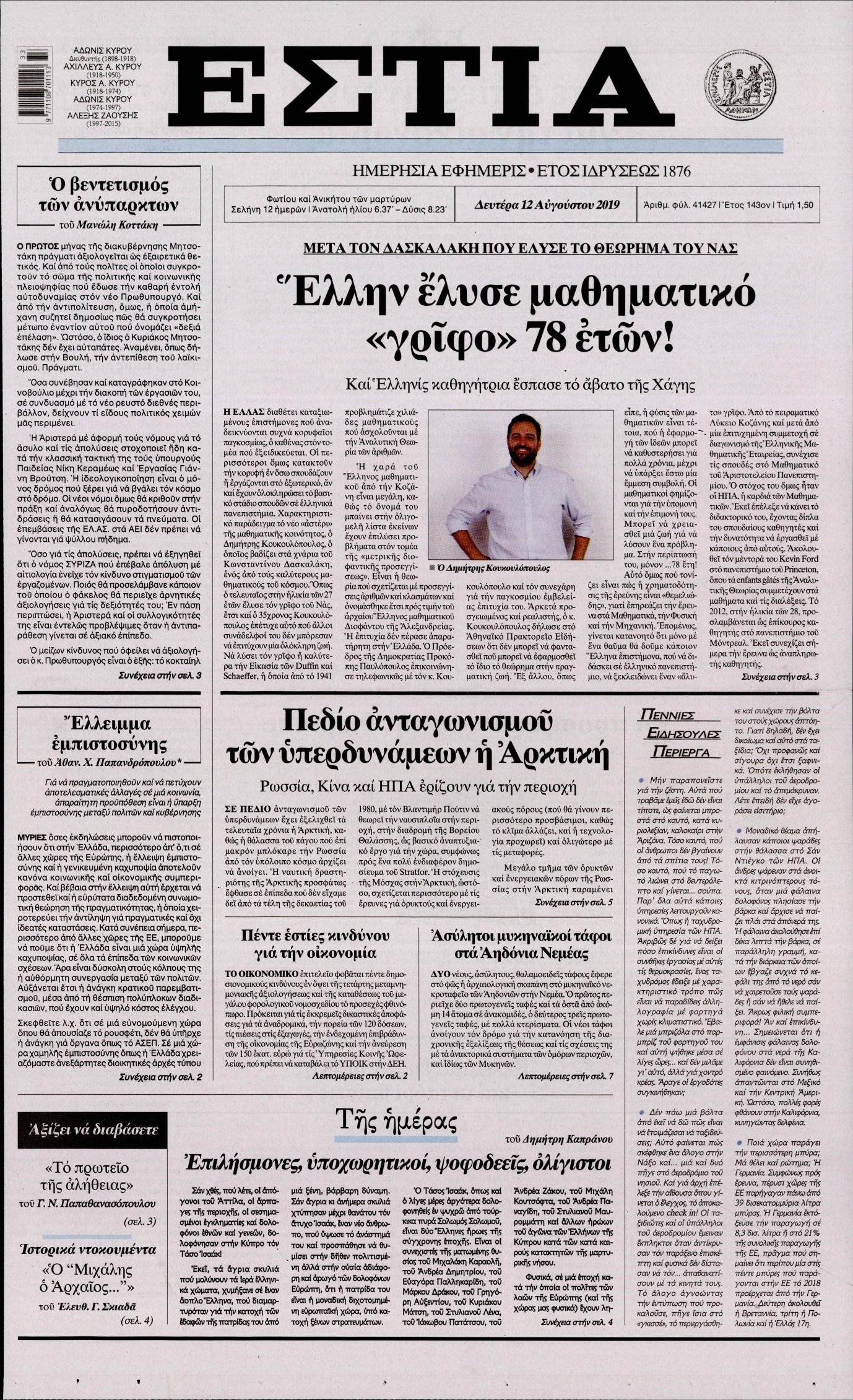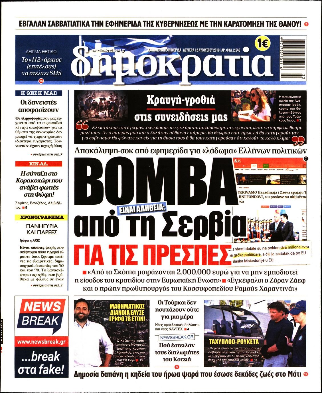 Οι πολιτικές εφημερίδες 12/8/2019 Εύη Κατσώλη 07:43, Δευτέρα 12 Αυγούστου 2019 Media Διαβάστε τα πρωτοσέλιδα των πολιτικών εφημερίδων… ΠΟΛΙΤΙΚΕΣ ΕΦΗΜΕΡΙΔΕΣ ΠΡΩΤΟΣΕΛΙΔΑ Μοιράσου το: σχολίασε κι εσύ (0 σχόλια) Ακολουθήστε το enikos.gr στο Google News και μάθετε πρώτοι όλες τις ειδήσεις Δείτε όλες τις τελευταίες ειδήσεις από την Ελλάδα και τον Κόσμο στο enikos.gr Ειδήσεις Ροή Ειδήσεων 6 ώρες πριν Χριστούγεννα στα μπλόκα: Επιμένουν στις κινητοποιήσεις τους οι αγρότες – Ανοίγουν τα διόδια το Σαββατοκύριακο 7 ώρες πριν Ουκρανία: Η άνευ προηγουμένου επίθεση σε ρωσικό τάνκερ στη Μεσόγειο και το μήνυμα προς στον Πούτιν – Το «μακρύ χέρι» του Κιέβου 6 ώρες πριν Πούτιν: Τα μηνύματα σε Ευρώπη και ΝΑΤΟ από το μαραθώνιο «σόου» του – Η απαίτηση για «σεβασμό» και η ειρήνη «με τους όρους» της Μόσχας 7 ώρες πριν Τραμπ: Δεν αποκλείει την πιθανότητα ενός πολέμου στη Βενεζουέλα – «Ο Μαδούρο ξέρει καλύτερα από τον καθένα τι ακριβώς θέλω» 7 ώρες πριν Συνεχίζει να προκαλεί ο Μίτσκοσκι: «Για μένα το όνομα Μακεδονία είναι ιερό» 6 ώρες πριν Ανακαλύφθηκαν αρχαία χρυσά νομίσματα 2.200 ετών που απεικονίζουν τον θεό Απόλλωνα – Η άγνωστη σύνδεση με τον Φίλιππο Β΄ της Μακεδονίας 7 ώρες πριν Ύπνος: Μια κρυφή κατάσταση του εγκεφάλου πριν από τον ύπνο μπορεί να είναι το “κλειδί” για υψηλή ευφυΐα και δημιουργικότητα 8 ώρες πριν Αριθμολογία: Οι άνθρωποι που έχουν γεννηθεί αυτές τις 4 ημερομηνίες, συχνά παρεξηγούνται – «Η καλοσύνη τους κρύβει τεράστια δύναμη» 9 ώρες πριν Ξεχάστε το καθάρισμα το Σαββατοκύριακο: Ο «κανόνας των 20 λεπτών» που θα σας λύσει τα χέρια 9 λεπτά πριν Μοχάμεντ Σαλάχ: Ζήτησε «συγγνώμη» από τους συμπαίκτες του στη Λίβερπουλ για το ξέσπασμά του 24 λεπτά πριν Μάρκο Ρούμπιο: Ανθρωπιστική κατάπαυση του πυρός στο Σουδάν ζητά ο Αμερικανός υπουργός Εξωτερικών 39 λεπτά πριν Αγγελική Νικολούλη: Τα συλλυπητήρια για την απώλεια της Ειρήνης Μαρινάκη 53 λεπτά πριν Βολιβία: Μαζική διαδηλώσεις εναντίον της κατάργησης των επιδοτήσεων των τιμών των καυσίμων 1 ώρα πριν Φως στο Τούνελ: Έφτασε η ώρα της αλήθειας για την δολοφονία της χήρας του πρώην υπουργού στο Κολωνάκι ENIKOS NETWORK Το ΕΚΑΒ τιμήθηκε από την Ακαδημία Αθηνών για τα 40 χρόνια προσφοράς του Έχετε πραγματικά μεγάλη καρδιά; 10 χαρακτηριστικά όσων έχουν καλοσύνη Αναστολή μέτρων αναγκαστικής εκτέλεσης για κτηνοτρόφους που πλήττονται από την ευλογιά των αιγοπροβάτων Πλήρης επάρκεια προϊόντων στις λαϊκές της Αττικής, παρά τις αγροτικές κινητοποιήσεις – Τι απαντούν οι πωλητές Χαρτογραφώντας το «σημείο χωρίς επιστροφή»: Για πρώτη φορά αποκαλύπτεται με λεπτομέρεια το ακανθώδες όριο της ατμόσφαιρας τ... Η Google καταργεί τη λειτουργία «dark web report» – Πώς θα μπορούν οι χρήστες να διαγράφουν τα δεδομένα τους περισσότερα 04:20 , Σάββατο 20 Δεκεμβρίου 2025 Αγγελική Νικολούλη: Τα συλλυπητήρια για την απώλεια της Ειρήνης Μαρινάκη Τα συλληπητήρια στον πρόεδρο του Mega, τον Βαγγέλη Μαρινάκη, για την απώλεια της μητέρας του Ε... 02:50 , Σάββατο 20 Δεκεμβρίου 2025 GNTM: Η Ξένια Τσίρκοβα αναδείχθηκε μεγάλη νικήτρια και πήρε τις 50.000 ευρώ – Ποιος βρέθηκε σε απόσταση αναπνοής; Με φαντασμαγορικό τρόπο ολοκληρώθηκε το βράδυ της Παρασκευής ο μεγάλος τελικός του GNTM, μέσα ... 22:42 , Παρασκευή 19 Δεκεμβρίου 2025 Γιώργος Γιαννόπουλος για “Το σόι σου”: “Είναι ευτυχία και ευλογία αυτή η σειρά” «Είναι ευτυχία και ευλογία η συγκυρία αυτής της σειράς», θα πει ο Γιώργος Γιαννόπουλος -ο αγαπ... 20:37 , Παρ