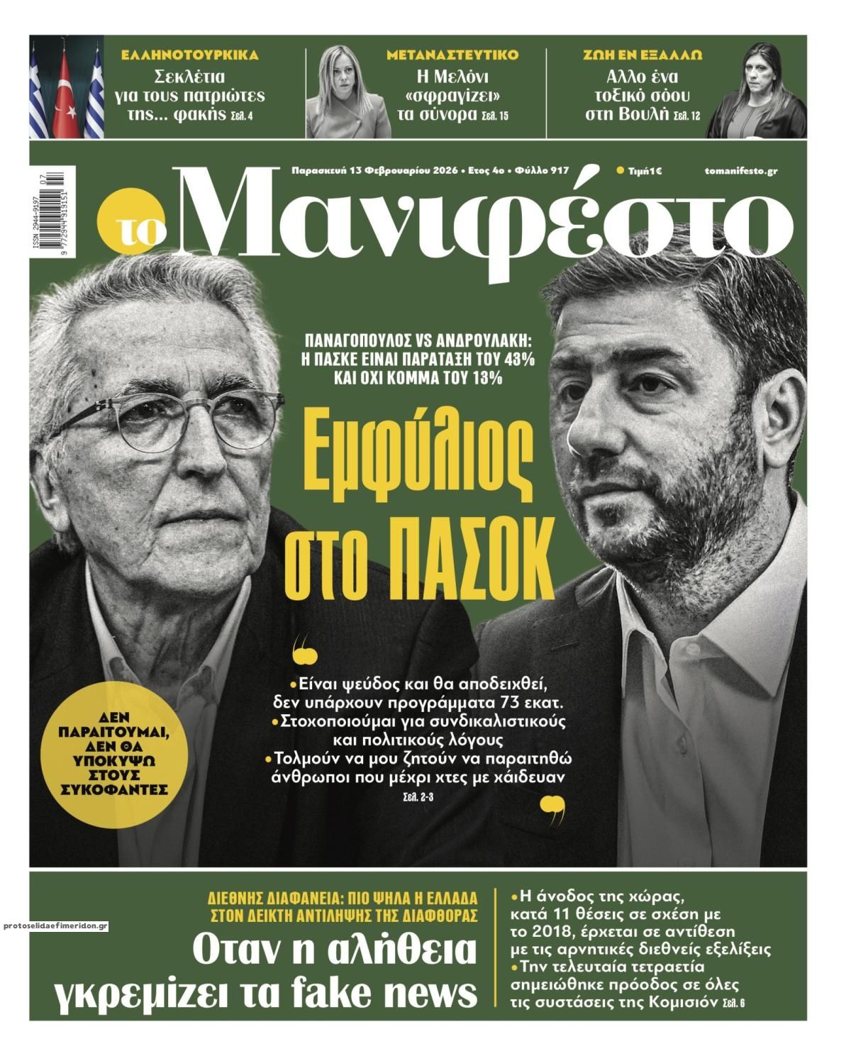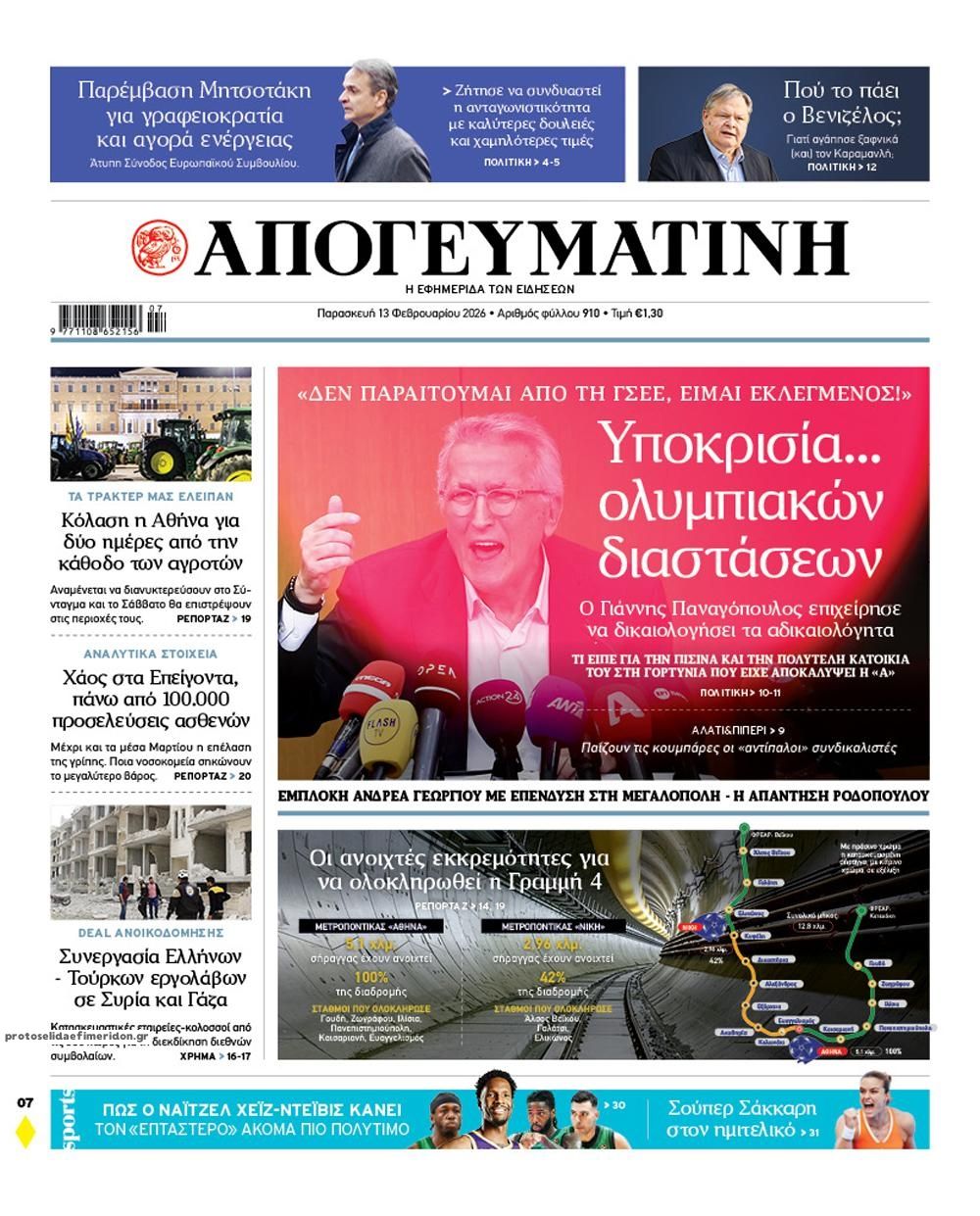 Οι πολιτικές εφημερίδες 13/2/2026 Enikos Newsroom 05:38, Παρασκευή 13 Φεβρουαρίου 2026 Media Διαβάστε τα πρωτοσέλιδα από τις πολιτικές εφημερίδες, σήμερα 13/2/2026. ΕΦΗΜΕΡΙΔΕΣ ΠΟΛΙΤΙΚΕΣ ΕΦΗΜΕΡΙΔΕΣ ΠΡΩΤΟΣΕΛΙΔΑ Μοιράσου το: Κυριάκος Μητσοτάκης στη Σύνοδο της ΕΕ: «Ανταγωνιστικότητα με καλύτερες δουλειές και χαμηλότερες τιμές» Παύλος Ντε Γκρες: Η απάντηση για το ενδεχόμενο δημιουργίας κόμματος – «Θέλω να είμαι χρήσιμος στη χώρα μου» Σεξ, σκάνδαλα και βιντεοταινίες στην Ουγγαρία: «Εκβιασμό ρωσικού τύπου» καταγγέλλει αντίπαλος του Όρμπαν για ροζ βίντεο με πρώην του σχολίασε κι εσύ (0 σχόλια) Ακολουθήστε το enikos.gr στο Google News και μάθετε πρώτοι όλες τις ειδήσεις Δείτε όλες τις τελευταίες ειδήσεις από την Ελλάδα και τον Κόσμο στο enikos.gr Ειδήσεις Ροή Ειδήσεων 10 ώρες πριν «Βιολάντα»: Στο επίκεντρο των ερευνών νέες… αδήλωτες δεξαμενές – Μαρτυρία ότι οι υπεύθυνοι γνώριζαν από το καλοκαίρι το πρόβλημα στις σωληνώσεις 8 ώρες πριν Γεωργιάδης για Κωνσταντοπούλου: Επειδή μου είπε αστυνομικός φίλος μου ότι πήγε με robe de chambre στο ΑΤ πρέπει να παραιτηθεί ο Χρυσοχοΐδης 8 ώρες πριν Σμήναρχος: Η κάρτα από το Χονγκ Κόνγκ και οι έρευνες στους τραπεζικούς λογαριασμούς των συγγενών του 9 ώρες πριν Υπόθεση Παναγόπουλου: Στο «μικροσκόπιο» οι πληρωμές εμπλεκόμενων εταιρειών – Τα 5 ερωτήματα που παραμένουν αναπάντητα 8 ώρες πριν Χειμερινοί Ολυμπιακοί Αγώνες 2026: Το φιάσκο της ΔΟΕ με το «κράνος μνήμης» του Ουκρανού αθλητή – Τι θα μπορούσε να κάνει αντί να τον αποκλείσει 10 ώρες πριν Αριθμολογία: Τα 4 βασικά χαρακτηριστικά των ανθρώπων που έχουν γεννηθεί στις 5 του μήνα 9 ώρες πριν Ύπνος: «Βρήκα τη λύση ώστε να χρησιμοποιώ το κινητό μου το βράδυ και να κοιμάμαι καλά», αποκαλύπτει ειδικός τεχνολογίας 11 ώρες πριν Ο σκύλος ή η γάτα σας μπορεί να μεταδίδουν έναν αόρατο «εισβολέα» – Τι είναι ο Πλατυέλμινθας και τι να προσέχετε 12 ώρες πριν Πώς να βρείτε χρόνο για ξεκαθάρισμα: Το έξυπνο κόλπο για οργάνωση χωρίς κόπο 9 λεπτά πριν ΟΗΕ: Καταδίκη της παραβίασης εγκαταστάσεων του στην Υεμένη – Αίτημα για άνευ όρων απελευθέρωση του προσωπικού από την Ελλάδα 23 λεπτά πριν ΔΕΔΔΗΕ: Διακοπές ρεύματος σήμερα (13/2) στην Αθήνα και σε άλλες 13 περιοχές της Αττικής 34 λεπτά πριν MasterChef: Η μαύρη ποδιά που «κρέμασε» έναν διαγωνιζόμενο λόγω άγχους 38 λεπτά πριν Οπτική ψευδαίσθηση: Μόνο αν είσαι ο Σέρλοκ Χολμς θα βρεις το γλειφιτζούρι σε 12 δευτερόλεπτα 54 λεπτά πριν Διαβήτης: Το μπαχαρικό που μπορεί να μειώσει το σάκχαρο στο αίμα, σύμφωνα με μελέτες ENIKOS NETWORK Υπνική άπνοια και ροχαλητό: Νέα θεραπεία έχει ποσοστό επιτυχίας 93%, σύμφωνα με νέα μελέτη ΕΟΔΥ: 15 θάνατοι από γρίπη και 7 από COVID-19 την τελευταία εβδομάδα ΑΑΔΕ: Ανοίγει εκ νέου η πλατφόρμα myBusinessSupport για διορθώσεις ΑΤΑΚ ή ΚΑΕΚ σε αγροτεμάχια Παρατείνεται έως τις 25 Φεβρουαρίου η προθεσμία υποβολής ΑΠΔ κοινών επιχειρήσεων του e-ΕΦΚΑ Ευπάθεια στο moltbook ai αποκαλύπτει email, tokens σύνδεσης και api keys Αυτός είναι ο ρόλος της μικρής τρύπας στους νυχοκόπτες – «Είμαι ο μόνος που δεν το ήξερε;»» περισσότερα 05:30 , Παρασκευή 13 Φεβρουαρίου 2026 Ο Παύλος Ντε Γκρες στο «Ενώπιος Ενωπίω» – ΒΙΝΤΕΟ Ο Παύλος Ντε Γκρες βρέθηκε καλεσμένος το βράδυ της Πέμπτης στην εκπομπή «Ενώπιος Ενωπίω» του Ν... 02:43 , Παρασκευή 13 Φεβρουαρίου 2026 Εκλογές ΕΣΗΕΑ: Ξανά πρώτη η Μαρία Αντωνιάδου με 36,7%, 4 έδρες οι «Ενωμένοι Δημοσιογράφοι» – Αναλυτικά όλα τα αποτελέσματα Η παράταξη της Μαρίας Αντωνιάδου, «Ενωμένοι Δημοσιογράφοι», κα