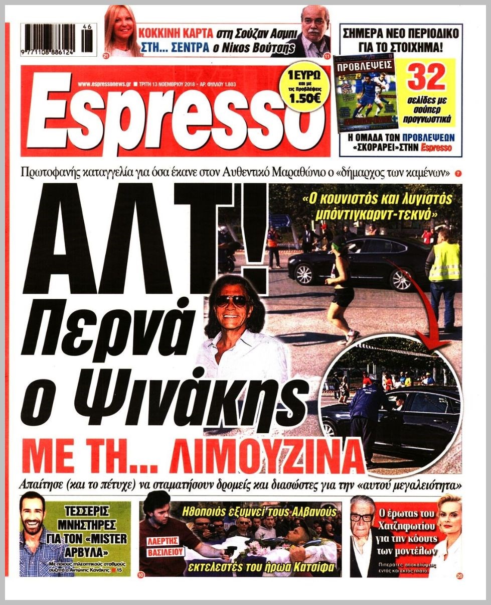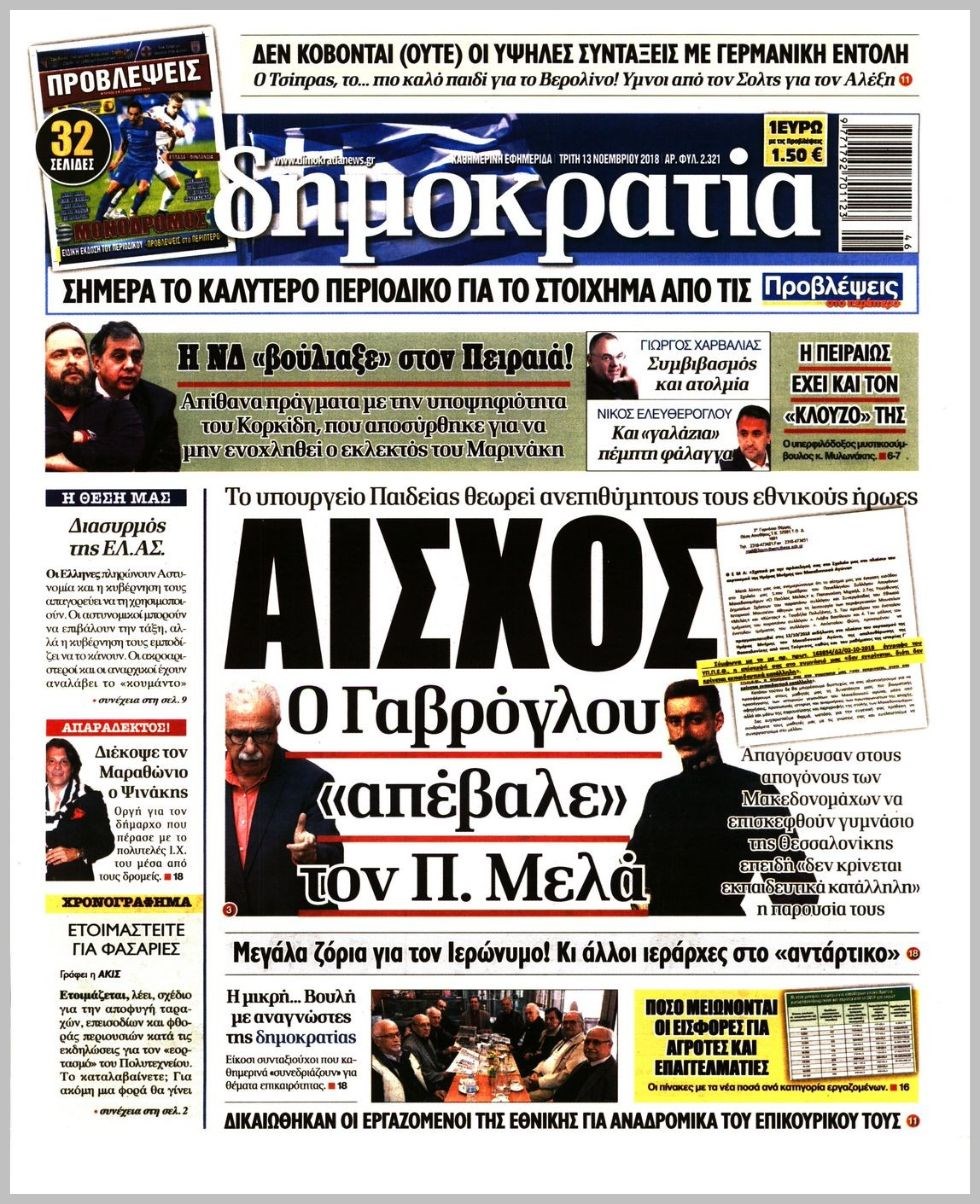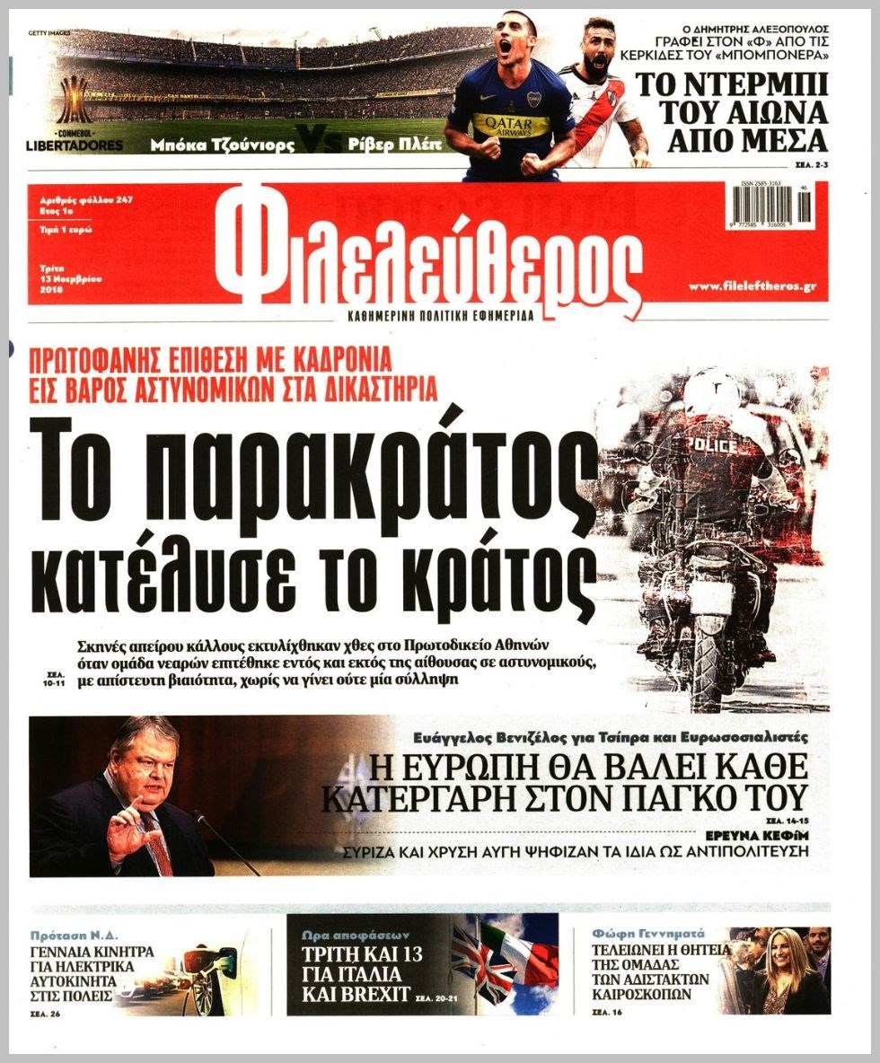 Οι πολιτικές εφημερίδες 13/11/18 Enikos Newsroom 06:19, Τρίτη 13 Νοεμβρίου 2018 Media Διαβάστε τα πρωτοσέλιδα: ΠΟΛΙΤΙΚΕΣ ΕΦΗΜΕΡΙΔΕΣ ΠΡΩΤΟΣΕΛΙΔΑ Μοιράσου το: σχολίασε κι εσύ (0 σχόλια) Ακολουθήστε το enikos.gr στο Google News και μάθετε πρώτοι όλες τις ειδήσεις Δείτε όλες τις τελευταίες ειδήσεις από την Ελλάδα και τον Κόσμο στο enikos.gr Ειδήσεις Ροή Ειδήσεων 59 λεπτά πριν Νέες εστίες ακρίβειας «ροκανίζουν» τα εισοδήματα – Πού καταγράφονται οι μεγαλύτερες αυξήσεις 13 λεπτά πριν Συνεχίζουν τις κινητοποιήσεις οι αγρότες: Κλείνουν τις σήραγγες των Τεμπών για τα φορτηγά – Τι θα γίνει τα Χριστούγεννα 42 λεπτά πριν «Έπιασαν δουλειά» οι 8 κάμερες που λειτουργούν πιλοτικά – Περισσότερες από 1.000 παραβάσεις σε 4 ημέρες 23 λεπτά πριν Ουκρανία: Συνομιλίες στη Φλόριντα με υποσημειώσεις και βαθιές διαφωνίες – Το δύσκολο παζλ των διαπραγματεύσεων και το χάσμα Ουάσιγκτον – Μόσχας 1 ώρα πριν Η Τουρκία μοστράρει τις κορβέτες της – Η χαμένη ευκαιρία της Ελλάδας 2 ώρες πριν Οπτική ψευδαίσθηση: Μόνο οι πιο έξυπνοι άνθρωποι θα βρουν τον Άγιο Βασίλη σε 8 δευτερόλεπτα 2 ώρες πριν Άνοια και εγκεφαλικό: Γιατρός προειδοποιεί για ένα δημοφιλές ρόφημα που αυξάνει τον κίνδυνο κατά 290% και 300% αντίστοιχα 3 ώρες πριν Τα ζώδια σήμερα, Δευτέρα 22 Δεκεμβρίου: Ζυγοί, αφήστε την καρδιά σας ελεύθερη 2 ημέρες πριν Enerwave: Το νέο «ρεύμα» στη λιανική ενέργειας που αλλάζει την εμπειρία του καταναλωτή 6 λεπτά πριν Το αδιέξοδο του Ερντογάν με τους ρωσικούς πυραύλους: Τα σενάρια για τα παζάρια μεταξύ Τουρκίας, Ρωσίας και ΗΠΑ για τους S-400 13 λεπτά πριν Συνεχίζουν τις κινητοποιήσεις οι αγρότες: Κλείνουν τις σήραγγες των Τεμπών για τα φορτηγά – Τι θα γίνει τα Χριστούγεννα 13 λεπτά πριν Επανεκκίνηση με τη Λιβύη – Το διπλωματικό παρασκήνιο 19 λεπτά πριν Ανακαλύφθηκε βραχογράφημα που παραπέμπει στον Ηρακλή και την Ύδρα από ελληνικά νομίσματα του 325 π.Χ. 23 λεπτά πριν Ουκρανία: Συνομιλίες στη Φλόριντα με υποσημειώσεις και βαθιές διαφωνίες – Το δύσκολο παζλ των διαπραγματεύσεων και το χάσμα Ουάσιγκτον – Μόσχας ENIKOS NETWORK Αυτή την Κυριακή με τη Realnews: Το μυστήριο των Χριστουγέννων της Vicki Delany, μαζί αστυνομικά μυθηστορήματα Μήπως το σεσουάρ σας σάς αρρωσταίνει; Ποιες οικιακές συσκευές εκπέμπουν τρισεκατομμύρια επιβλαβή σωματίδια, σύμφωνα με μελέ... Νέες εστίες ακρίβειας «ροκανίζουν» τα εισοδήματα – Πού καταγράφονται οι μεγαλύτερες αυξήσεις Νέο έτος ρεκόρ για τον ελληνικό τουρισμό το 2025: «Είμαστε μέσα στους 10 πλέον επισκέψιμους προορισμούς παγκοσμίως» λέει η ... Χαρτογραφώντας το «σημείο χωρίς επιστροφή»: Για πρώτη φορά αποκαλύπτεται με λεπτομέρεια το ακανθώδες όριο της ατμόσφαιρας τ... Η Google καταργεί τη λειτουργία «dark web report» – Πώς θα μπορούν οι χρήστες να διαγράφουν τα δεδομένα τους περισσότερα 07:02 , Δευτέρα 22 Δεκεμβρίου 2025 Αυτή την Κυριακή με τη Realnews: Το μυστήριο των Χριστουγέννων της Vicki Delany – Μαζί αστυνομικά μυθιστορήματα Αυτή την Κυριακή με τη Realnews: Το μυστήριο των Χριστουγέννων της Vicki Delany – Μαζί α... 05:48 , Δευτέρα 22 Δεκεμβρίου 2025 Οι οικονομικές εφημερίδες 22/12/2025 Διαβάστε τα πρωτοσέλιδα από τις οικονομικές εφημερίδες, σήμερα 22/12/2025 05:43 , Δευτέρα 22 Δεκεμβρίου 2025 Οι αθλητικές εφημερίδες 22/12/2025 Διαβάστε τα πρωτοσέλιδα από τις αθλητικές εφημερίδες, σήμερα 22/12/2025. 05:38 , Δευτέρα 22 Δεκεμβρίου 2025 Οι πολιτικές εφημερίδες 22/12/2025 Διαβάστε τα πρωτοσέλιδα από τις πολιτικές εφημερίδες, σήμερα 22/12/2025. ΤΕΛΕΥΤΑΙΕΣ ΕΙΔΗΣΕΙΣ 6 λεπτά πριν Το αδιέξοδο το