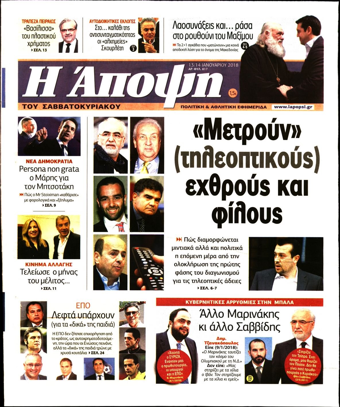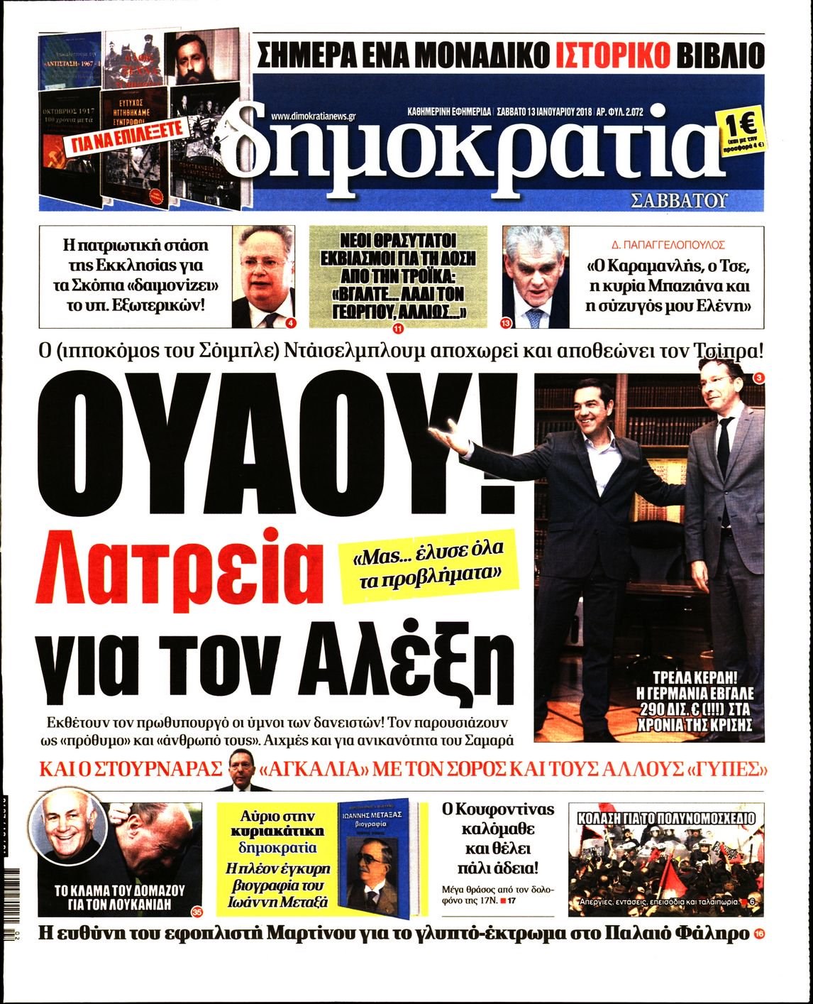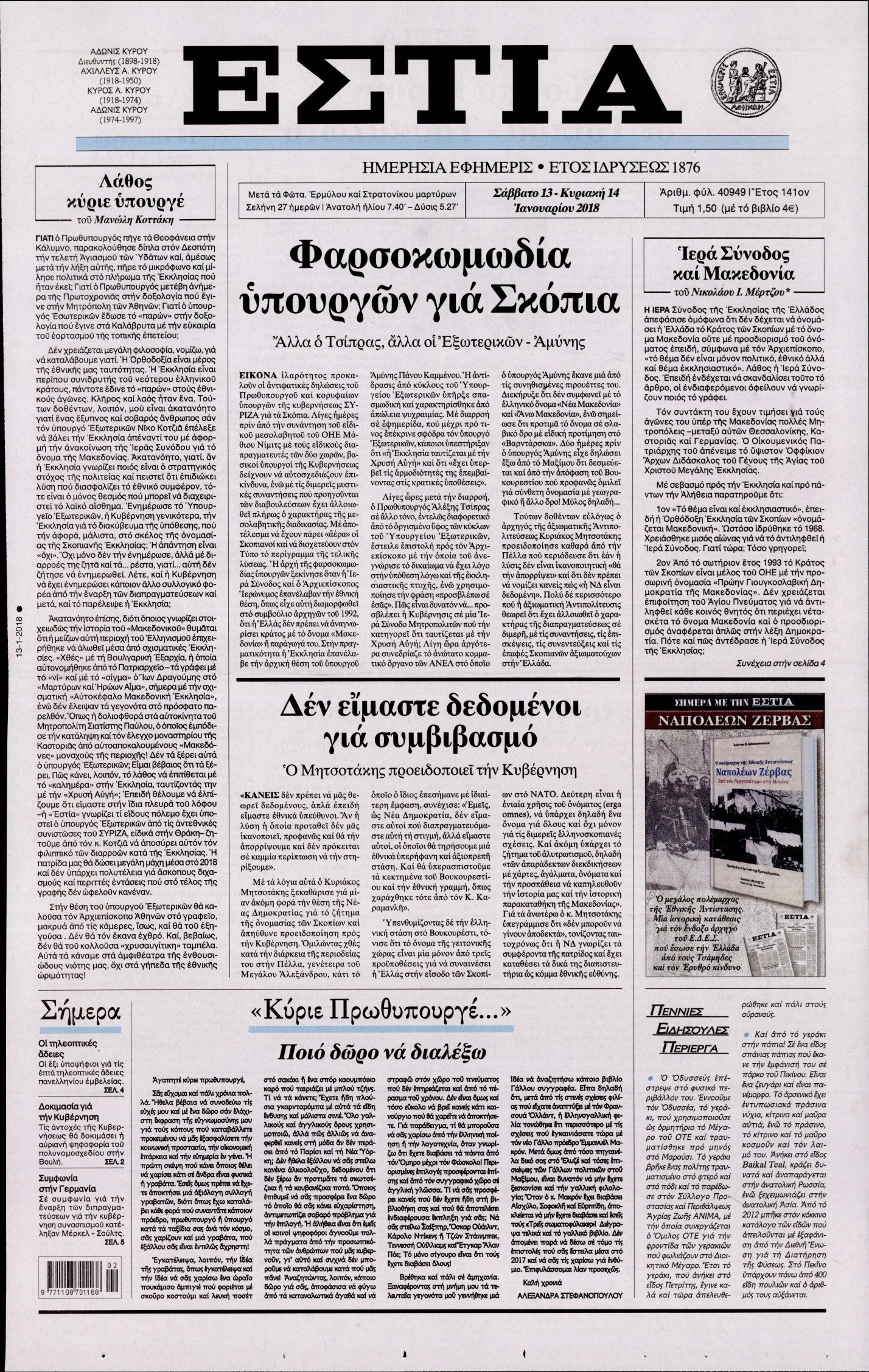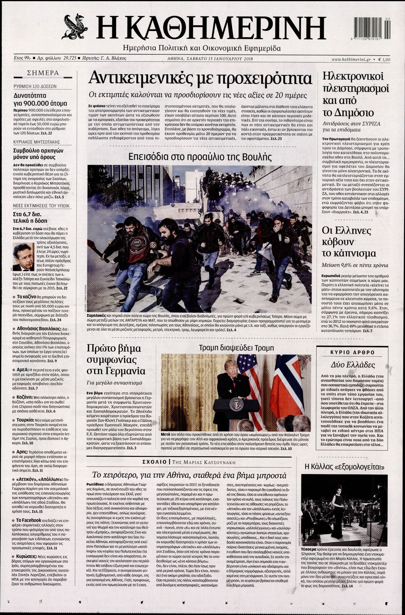 Οι πολιτικές εφημερίδες 13/1/2018 Enikos Newsroom 07:36, Σάββατο 13 Ιανουαρίου 2018 Media Διαβάστε τα σημερινά πρωτοσέλιδα των πολιτικών εφημερίδων: ΠΟΛΙΤΙΚΕΣ ΕΦΗΜΕΡΙΔΕΣ ΠΡΩΤΟΣΕΛΙΔΑ Μοιράσου το: σχολίασε κι εσύ (0 σχόλια) Ακολουθήστε το enikos.gr στο Google News και μάθετε πρώτοι όλες τις ειδήσεις Δείτε όλες τις τελευταίες ειδήσεις από την Ελλάδα και τον Κόσμο στο enikos.gr Ειδήσεις Ροή Ειδήσεων 4 ώρες πριν Υπόθεση Έπσταϊν: Το Υπουργείο Δικαιοσύνης δημοσιοποίησε μια σειρά από εξαιρετικά επεξεργασμένα αρχεία – «Λείπουν τα πιο σημαντικά έγγραφα», λένε οι Δημοκρατικοί 55 λεπτά πριν Γιορτές με μπλόκα για τους αγρότες: Ανοίγουν διόδια και μοιράζουν προϊόντα στους ταξιδιώτες 1 ώρα πριν Εξαφάνιση 33χρονου γιατρού στην Κρήτη: «Άναψα τα φώτα, τρόμαξε και άρχισε να τρέχει στα χωράφια» – Η τελευταία διαδρομή και η μαρτυρία «κλειδί» 3 ώρες πριν Ο «χάρτης» με τις αυξήσεις και τις φοροελαφρύνσεις του 2026 – Ποιοι και πόσα κερδίζουν 1 ώρα πριν Τα αρχεία του Έπσταϊν αποκαλύπτουν φωτογραφία του έκπτωτου πρίγκιπα Άντριου – Είναι ξαπλωμένος στην αγκαλιά 5 γυναικών 1 ώρα πριν Μία νέα «χρυσή» περίοδος αρχίζει για 3 ζώδια από σήμερα – «Μία αναπάντεχη ευκαιρία οδηγεί στην επιτυχία» 5 ώρες πριν Αυγά: Πόσα μπορείτε να τρώτε την ημέρα με ασφάλεια για μέγιστη πρόσληψη πρωτεΐνης 3 ώρες πριν Αρχαιολόγοι ανακάλυψαν σε χωράφι απεικόνιση 600 ετών ενός Αγίου – Τα στοιχεία που δείχνουν ότι μαρτύρησε 2 ώρες πριν Αγχώνεται για το χριστουγεννιάτικο δώρο που πήρε στην πλούσια σύντροφό του – «Φοβάμαι πως θα το βρει φθηνιάρικο, φοράει βραχιόλια Cartier» 4 λεπτά πριν Τραγωδία στην άσφαλτο στα Χανιά: Νεκρός 37χρονος οδηγός ΙΧ – Τον βρήκαν ώρες μετά το τροχαίο 12 λεπτά πριν Τα Labubu «μετακομίζουν» στο Χόλιγουντ: Η Sony Pictures ετοιμάζει live-action ταινία με τον σκηνοθέτη του «Wonka» 20 λεπτά πριν Νέες ταυτότητες: Μεγάλη αναμονή για ραντεβού στην Αττική – Τέλος τα ταξίδια εκτός Ελλάδος από τον Αύγουστο για όσους δεν έχουν αλλάξει 28 λεπτά πριν Οι 7 φράσεις που δεν λένε ποτέ οι συναισθηματικά έξυπνοι άνθρωποι κατά τη διάρκεια ενός καβγά 31 λεπτά πριν Τηλεθέαση (19/12): Ανατροπές και πρωτιές στην πρωινή ζώνη ENIKOS NETWORK Είστε μόνιμα απρόσεκτοι; 3 σημάδια που δείχνουν ότι μπορεί να είναι σύμπτωμα πάθησης Πόσα κιλά παίρνουμε πραγματικά τα Χριστούγεννα, σύμφωνα με την επιστήμη – Πώς να το αποτρέψουμε; e-ΕΦΚΑ και ΔΥΠΑ: Έρχονται νέες πληρωμές έως τις 24 Δεκεμβρίου – Ποιοι πάνε ταμείο Επίδομα παιδιού: Τι αλλάζει από το 2026 – Το όφελος από τις φορολογικές ελαφρύνσεις Χαρτογραφώντας το «σημείο χωρίς επιστροφή»: Για πρώτη φορά αποκαλύπτεται με λεπτομέρεια το ακανθώδες όριο της ατμόσφαιρας τ... Η Google καταργεί τη λειτουργία «dark web report» – Πώς θα μπορούν οι χρήστες να διαγράφουν τα δεδομένα τους περισσότερα 09:30 , Σάββατο 20 Δεκεμβρίου 2025 «Porto Leone: Στη γειτονιά με τα κόκκινα φανάρια» – Ο Χρόνης αποκαλύπτει στην Αλεξάνδρα το μυστικό για το παιδί της Λένας Η μεγάλη δραματική σειρά του Apha «Porto Leone: Στη γειτονιά με τα κόκκινα φανάρια» μας μεταφέ... 08:14 , Σάββατο 20 Δεκεμβρίου 2025 Τρομεροί γονείς: Η Μαρία Καβογιάννη εισβάλλει στο σπίτι της οικογένειας Στεφανίδη Όσα θα δούμε στο νέο διπλό επεισόδιο της σειράς «Τρομεροί γονείς», σήμερα Σάββατο 20 Δεκεμβρίο... 05:48 , Σάββατο 20 Δεκεμβρίου 2025 Οι οικονομικές εφημερίδες 20/12/2025 Διαβάστε τα πρωτοσέλιδα από τις οικονομικές εφημερίδες, σήμερα 20/12/2025. 05:43 , Σάββατο 20 Δεκεμβρίου 2025 Οι αθλητικές εφημερίδες 20/12/2025 Διαβάστε τα πρωτοσέλιδα α