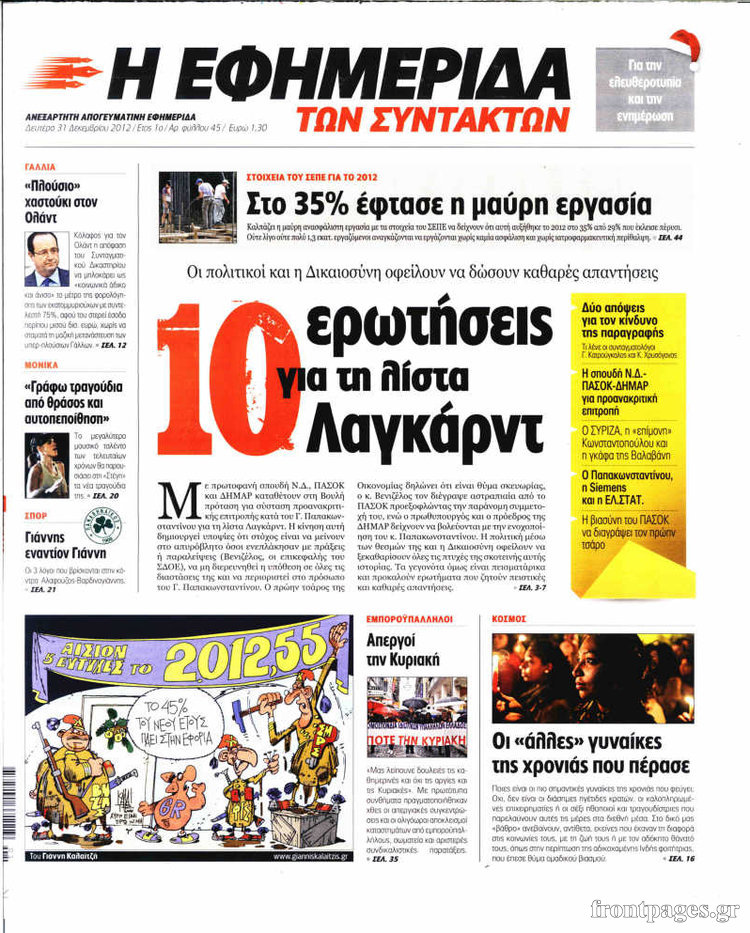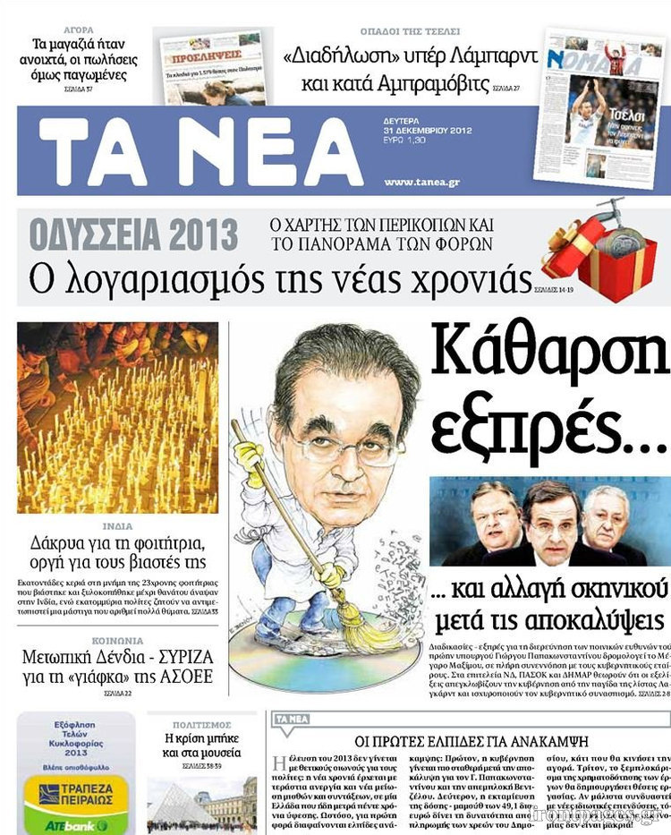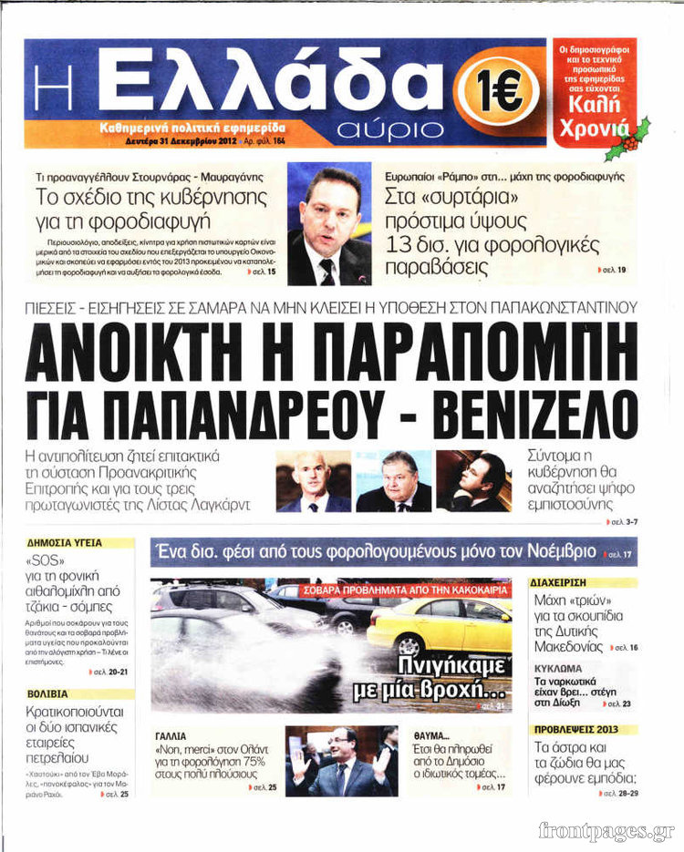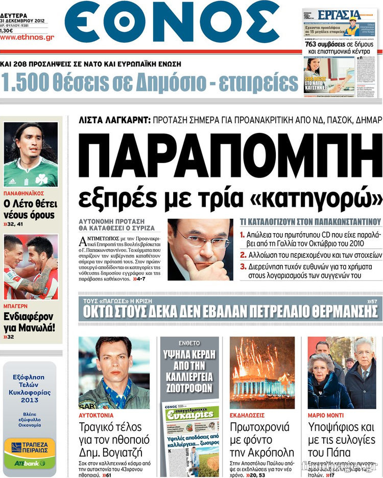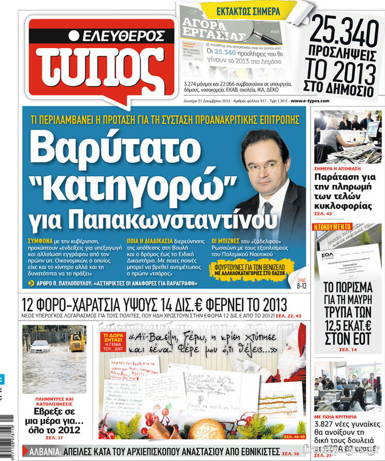 Οι πολιτικές εφημερίδες Enikos Newsroom 09:05, Δευτέρα 31 Δεκεμβρίου 2012 Media Οι πολιτικές εφημερίδες Τα πρωτοσέλιδα των πολιτικών εφημερίδων. ΠΟΛΙΤΙΚΕΣ ΕΦΗΜΕΡΙΔΕΣ ΠΡΩΤΟΣΕΛΙΔΑ Μοιράσου το: σχολίασε κι εσύ (0 σχόλια) Ακολουθήστε το enikos.gr στο Google News και μάθετε πρώτοι όλες τις ειδήσεις Δείτε όλες τις τελευταίες ειδήσεις από την Ελλάδα και τον Κόσμο στο enikos.gr Ειδήσεις Ροή Ειδήσεων 2 ώρες πριν «Βιολάντα:» Οι ανατριχιαστικοί διάλογοι λίγες ώρες πριν από την φονική έκρηξη για «μυρωδιά σαν υγραέριο» – «Μου έλεγαν ότι δεν ήταν κάτι ανησυχητικό» κατέθεσε ο υπεύθυνος βάρδιας 3 ώρες πριν Ο Κυριάκος Μητσοτάκης ανοίγει τα χαρτιά του για τη Συνταγματική Αναθεώρηση – Στο τραπέζι και η μονιμότητα των δημοσίων υπαλλήλων 1 ώρα πριν Νέα Πέραμος: Προσπάθησαν να κάψουν το πτώμα του 27χρονου – Οι έρευνες στο εργασιακό του περιβάλλον και η εκτέλεση «καρμπόν» πριν από 2 χρόνια στη Μάνδρα 2 ώρες πριν Κακοκαιρία: Νέο έκτακτο δελτίο της ΕΜΥ – Σε ποιες περιοχές θα συνεχιστούν τα έντονα φαινόμενα 1 ώρα πριν Γκίλφοϊλ: Προανήγγειλε επίσκεψη Τραμπ στην Ελλάδα – «Ελπίζω να έρθει και η Μελάνια» 3 ώρες πριν Αριθμολογία: Οι 3 «καταραμένες» διευθύνσεις σπιτιού – «Τα νούμερα αυτά συνδέονται με αναταραχές και αρνητική ενέργεια» 4 ώρες πριν Τα 11 ψέματα που λένε πάντα οι άνδρες για να σας πείσουν ότι έχετε εσείς το πρόβλημα 2 ώρες πριν Ύπνος: Γιατί πρέπει να κοιμάστε με την πόρτα του υπνοδωματίου σας κλειστή 1 ώρα πριν Στο φως η θρυλική πόλη που ίδρυσε ο Μέγας Αλέξανδρος στο Ιράκ – Το «φάντασμα» του Τίγρη αποκαλύπτεται 14 λεπτά πριν Ο πρόεδρος Τραμπ βλέπει μια συμφωνία με την Κούβα μετά τις απειλές 36 λεπτά πριν ΑΕΚ – Ολυμπιακός 1-1: Ισοπαλία στο ντέρμπι με πέναλτυ στο 90+16′ για τους Πειραιώτες – Έντονες διαμαρτυρίες των γηπεδούχων 48 λεπτά πριν Επίδομα παιδιού 2026: Πότε ανοίγει η πλατφόρμα για τις νέες αιτήσεις – Τι πρέπει να γνωρίζετε 1 ώρα πριν Στο φως η θρυλική πόλη που ίδρυσε ο Μέγας Αλέξανδρος στο Ιράκ – Το «φάντασμα» του Τίγρη αποκαλύπτεται 1 ώρα πριν Νέα Πέραμος: Προσπάθησαν να κάψουν το πτώμα του 27χρονου – Οι έρευνες στο εργασιακό του περιβάλλον και η εκτέλεση «καρμπόν» πριν από 2 χρόνια στη Μάνδρα ENIKOS NETWORK Γελάτε, κλαίτε ή ανοίγει η μύτη σας μετά τον οργασμό – Πού οφείλεται, σύμφωνα με μελέτη; Πώς να ξεφορτωθείτε τις σακούλες κάτω από τα μάτια – Tips που δουλεύουν Τη Δευτέρα οι ανακοινώσεις του Κυριάκου Μητσοτάκη για τη συνταγματική αναθεώρηση – Ποια άρθρα θα προτείνει να αλλάξουν Ο καιρός της Δευτέρας: Ισχυρές καταιγίδες και χιονοπτώσεις – Σε ποιες περιοχές χρειάζεται προσοχή Σπαζοκεφαλιά: Βρες πόσα 9 υπάρχουν στην εικόνα σε 8 δευτερόλεπτα Τεστ IQ: Μπορείς να εντοπίσεις τον αριθμό 999 ανάμεσα στα 99Q σε 15 δευτερόλεπτα; περισσότερα 17:13 , Κυριακή 01 Φεβρουαρίου 2026 Σία Κοσιώνη: Το πρώτο μήνυμα μετά την περιπέτεια με την υγεία της – «Τα καταφέραμε» Για έναν δύσκολο Ιανουάριο που της φάνηκε σαν ένας ολόκληρος χρόνος κάνει λόγο η Σία Κοσιώνη σ... 15:05 , Κυριακή 01 Φεβρουαρίου 2026 Από Ήλιο σε Ήλιο: Πότε κάνει τελικά πρεμιέρα η νέα σειρά της ΕΡΤ1; Το αρχικό πλάνο και η μετακίνηση της προβολής. Της Νάντιας Ρηγάτου Μπορεί η Μεγάλη Χίμαιρα να ... 15:04 , Κυριακή 01 Φεβρουαρίου 2026 Στο real taste & style που κυκλοφορεί με τη Realnews Στο real taste & style που κυκλοφορεί με τη Realnews. Τον Φεβρουάριο, η πατάτα βγαίνει μπρ... 13:47 , Κυριακή 01 Φεβρουαρίου 2026 Άγιος Έρωτας: Ο πατέρας Νικόλαος και η Χλόη παραδίνονται στον έρωτα – ‘Ολες οι εξελίξεις Κα