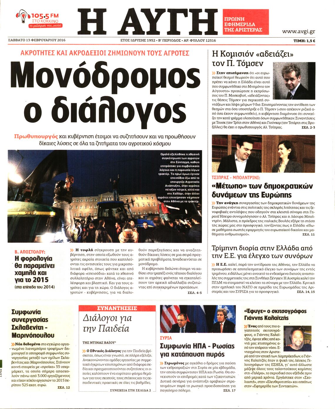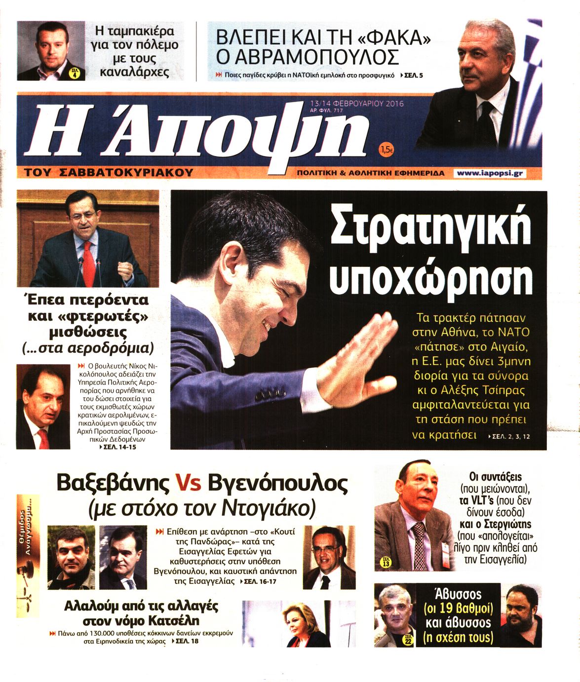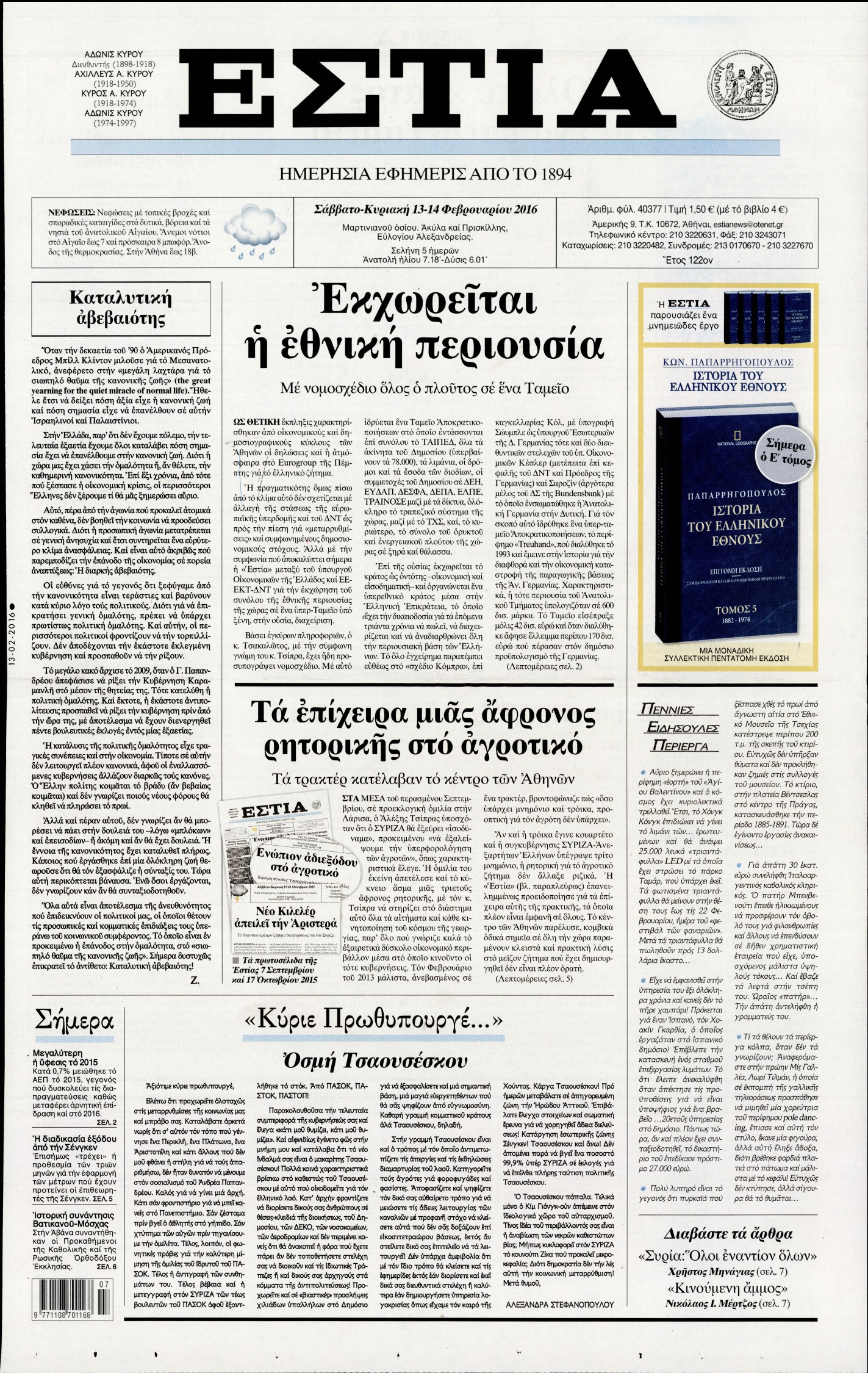 Οι πολιτικές εφημερίδες 13/2/2016 Enikos Newsroom 06:35, Σάββατο 13 Φεβρουαρίου 2016 Media Διαβάστε τα σημερινά πρωτοσέλιδα των πολιτικών εφημερίδων: ΠΟΛΙΤΙΚΕΣ ΕΦΗΜΕΡΙΔΕΣ ΠΡΩΤΟΣΕΛΙΔΑ Μοιράσου το: σχολίασε κι εσύ (0 σχόλια) Ακολουθήστε το enikos.gr στο Google News και μάθετε πρώτοι όλες τις ειδήσεις Δείτε όλες τις τελευταίες ειδήσεις από την Ελλάδα και τον Κόσμο στο enikos.gr Ειδήσεις Ροή Ειδήσεων 13 λεπτά πριν Μαρινάκης: Ο Πρωθυπουργός δεν μπορεί να λειτουργεί με όρους τελεσίγραφων – Περιμένουμε τα ονόματα των αγροτών που θα συμμετέχουν στις 2 συναντήσεις 2 ώρες πριν Κύπρος: Παραιτήθηκε ο Χαράλαμπος Χαραλάμπους από διευθυντής του γραφείου του Χριστοδουλίδη 2 ώρες πριν Σέρρες: Εισαγγελική έρευνα για τις αναφορές του «Χαμόγελου του Παιδιού» προ ετών για το περιβάλλον του 16χρονου 2 ώρες πριν Τραμπ για Γροιλανδία: «Η άμυνά τους είναι δύο έλκηθρα με σκύλους» – Επιμένει στην «απόκτηση» της χώρας από τις ΗΠΑ 2 ώρες πριν Ρούλα Πισπιρίγκου: Αναβολή για τον Σεπτέμβριο πήρε η δίκη της για τη δολοφονία της Τζωρτζίνας 4 ώρες πριν Πέταξε έξω από το σπίτι τον αρραβωνιαστικό της με την αγενέστατη κόρη του – «Σκέφτομαι να τον χωρίσω, θέλω την ηρεμία μου» 3 ώρες πριν Τα 3 ζώδια που ξαναβρίσκουν την ελπίδα που είχαν χάσει εδώ και καιρό – «Μία παλιά ιδέα αξίζει μία δεύτερη ευκαιρία» 2 ώρες πριν Η γλώσσα της «δυσαρέσκειας»: 8 φράσεις που εκπέμπουν μιζέρια και αρνητικότητα χωρίς να το συνειδητοποιείτε 1 ώρα πριν Γυναίκα έχασε 55 κιλά και βελτίωσε την ψυχολογία της τηρώντας έναν κανόνα – «Το κλειδί της επιτυχίας ήταν η ευκολία» 9 λεπτά πριν Ουκρανία: Χωρίς ηλεκτροδότηση έμειναν 35.000 νοικοκυριά στην Οδησσό 13 λεπτά πριν Μαρινάκης: Ο Πρωθυπουργός δεν μπορεί να λειτουργεί με όρους τελεσίγραφων – Περιμένουμε τα ονόματα των αγροτών που θα συμμετέχουν στις 2 συναντήσεις 14 λεπτά πριν Λαμία: Δέντρο ξεριζώθηκε και έπεσε στο κέντρο της πόλης 20 λεπτά πριν ΕΕ: Απειλεί το Ιράν με νέες κυρώσεις λόγω της βίαιης καταστολής των διαδηλώσεων – «Οι πολίτες αγωνίζονται για το μέλλον τους» 26 λεπτά πριν Γεωργιάδης: Σε μεγάλη πίεση τα νοσοκομεία, κάντε το εμβόλιο κατά της γρίπης ENIKOS NETWORK ΕΟΦ: Οδηγίες για ασφαλή χρήση φαρμάκου για την επιληψία σε νεογνά- Κίνδυνος σοβαρών παρενεργειών Νεογνικός γενωμικός έλεγχος για σπάνιες παθήσεις στο νοσοκομείο Παπαγεωργίου Συνολικά 120 νέες μόνιμες προσλήψεις σε φορέα του Δημοσίου: Ποιοι και μέχρι πότε μπορούν να υποβάλλουν αίτηση Ορόσημο το 2026 για την εμπέδωση της Ελλάδας ως ενεργειακή πύλη της ΝΑ Ευρώπης Ο Google Assistant θα παραμείνει λίγο περισσότερο για ορισμένους χρήστες Android Τεστ προσωπικότητας: Το βάζο που θα επιλέξετε αποκαλύπτει πώς λύνετε προβλήματα στη ζωή σας περισσότερα 10:15 , Δευτέρα 12 Ιανουαρίου 2026 Μαζωνάκης: Τι θα γίνει με τη νέα μουσική εκπομπή που συζητούσε Σε νέες βάσεις μπαίνει η συνεργασία του Γιώργου Μαζωνάκη με τον ΣΚΑΪ μετά το φινάλε του «The v... 09:45 , Δευτέρα 12 Ιανουαρίου 2026 Αλλαγή φρουράς στην πρωινή ζώνη του Σαββατοκύριακου του ANT1 Η απόφαση του ΑΝΤ1 να διακόψει το «Πρωινό Σαββατοκύριακο» με την Ελένη Τσολάκη και η επιστροφή... 08:07 , Δευτέρα 12 Ιανουαρίου 2026 Χρυσές Σφαίρες 2026: Θρίαμβος για το «One Battle After Another» με 4 βραβεία και δικαίωση για τον Σαλαμέ – Η λίστα των μεγάλων νικητών Με ανατροπές και σαρκασμό η 83η τελετή για τις Χρυσές Σφαίρες ολοκληρώθηκε το βράδυ της Κυριακ... 08:00 , Δευτέρα 12 Ιανουαρίου 2026 Αυτή την Κυριακή με τη Realnews: Στοιχειωμένα μυστικά – Ένα συναρπαστικ