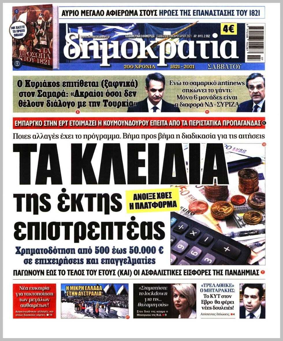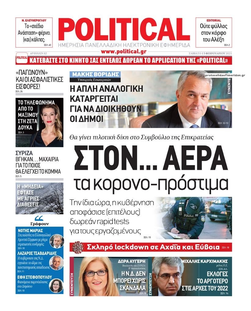 Οι πολιτικές εφημερίδες 13/2/2021 Διονύσης Νίκκας 07:10, Σάββατο 13 Φεβρουαρίου 2021 Media Διαβάστε τα πρωτοσέλιδα των πολιτικών εφημερίδων… ΕΦΗΜΕΡΙΔΕΣ ΠΟΛΙΤΙΚΕΣ ΕΦΗΜΕΡΙΔΕΣ ΠΡΩΤΟΣΕΛΙΔΑ Μοιράσου το: σχολίασε κι εσύ (0 σχόλια) Ακολουθήστε το enikos.gr στο Google News και μάθετε πρώτοι όλες τις ειδήσεις Δείτε όλες τις τελευταίες ειδήσεις από την Ελλάδα και τον Κόσμο στο enikos.gr Ειδήσεις Ροή Ειδήσεων 53 λεπτά πριν Χριστούγεννα στα μπλόκα: Επιμένουν στις κινητοποιήσεις τους οι αγρότες – Ανοίγουν τα διόδια το Σαββατοκύριακο 1 ώρα πριν Ουκρανία: Η άνευ προηγουμένου επίθεση σε ρωσικό τάνκερ στη Μεσόγειο και το μήνυμα προς στον Πούτιν – Το «μακρύ χέρι» του Κιέβου 30 λεπτά πριν Πούτιν: Τα μηνύματα σε Ευρώπη και ΝΑΤΟ από το μαραθώνιο «σόου» του – Η απαίτηση για «σεβασμό» και η ειρήνη «με τους όρους» της Μόσχας 1 ώρα πριν Τραμπ: Δεν αποκλείει την πιθανότητα ενός πολέμου στη Βενεζουέλα – «Ο Μαδούρο ξέρει καλύτερα από τον καθένα τι ακριβώς θέλω» 2 ώρες πριν Συνεχίζει να προκαλεί ο Μίτσκοσκι: «Για μένα το όνομα Μακεδονία είναι ιερό» 4 ώρες πριν Πούτιν: «Ναι, είμαι ερωτευμένος» – Βίντεο από τη σπάνια προσωπική παραδοχή του 3 ώρες πριν Αριθμολογία: Οι άνθρωποι που έχουν γεννηθεί αυτές τις 4 ημερομηνίες, συχνά παρεξηγούνται – «Η καλοσύνη τους κρύβει τεράστια δύναμη» 2 ώρες πριν Ύπνος: Μια κρυφή κατάσταση του εγκεφάλου πριν από τον ύπνο μπορεί να είναι το “κλειδί” για υψηλή ευφυΐα και δημιουργικότητα 4 ώρες πριν Ξεχάστε το καθάρισμα το Σαββατοκύριακο: Ο «κανόνας των 20 λεπτών» που θα σας λύσει τα χέρια 31 λεπτά πριν Ανακαλύφθηκαν αρχαία χρυσά νομίσματα 2.200 ετών που απεικονίζουν τον θεό Απόλλωνα – Η άγνωστη σύνδεση με τον Φίλιππο Β΄ της Μακεδονίας 57 δευτερόλεπτα πριν Γάζα: Ισραηλινό πλήγμα σε σχολείο που είχαν καταφύγει εκτοπισμένοι – Τουλάχιστον έξι νεκροί 15 λεπτά πριν Ολυμπιακός – Βιλερμπάν 107-84: Επιστροφή στις νίκες με… προπόνηση 21 λεπτά πριν Νέος Κόσμος: Συνελήφθη 41χρονος με ένταλμα από την Τουρκία για εμπόριο ναρκωτικών και ληστεία 30 λεπτά πριν Πούτιν: Τα μηνύματα σε Ευρώπη και ΝΑΤΟ από το μαραθώνιο «σόου» του – Η απαίτηση για «σεβασμό» και η ειρήνη «με τους όρους» της Μόσχας 31 λεπτά πριν Ανακαλύφθηκαν αρχαία χρυσά νομίσματα 2.200 ετών που απεικονίζουν τον θεό Απόλλωνα – Η άγνωστη σύνδεση με τον Φίλιππο Β΄ της Μακεδονίας ENIKOS NETWORK Το ΕΚΑΒ τιμήθηκε από την Ακαδημία Αθηνών για τα 40 χρόνια προσφοράς του Έχετε πραγματικά μεγάλη καρδιά; 10 χαρακτηριστικά όσων έχουν καλοσύνη Αναστολή μέτρων αναγκαστικής εκτέλεσης για κτηνοτρόφους που πλήττονται από την ευλογιά των αιγοπροβάτων Πλήρης επάρκεια προϊόντων στις λαϊκές της Αττικής, παρά τις αγροτικές κινητοποιήσεις – Τι απαντούν οι πωλητές Χαρτογραφώντας το «σημείο χωρίς επιστροφή»: Για πρώτη φορά αποκαλύπτεται με λεπτομέρεια το ακανθώδες όριο της ατμόσφαιρας τ... Η Google καταργεί τη λειτουργία «dark web report» – Πώς θα μπορούν οι χρήστες να διαγράφουν τα δεδομένα τους περισσότερα 22:42 , Παρασκευή 19 Δεκεμβρίου 2025 Γιώργος Γιαννόπουλος για “Το σόι σου”: “Είναι ευτυχία και ευλογία αυτή η σειρά” «Είναι ευτυχία και ευλογία η συγκυρία αυτής της σειράς», θα πει ο Γιώργος Γιαννόπουλος -ο αγαπ... 20:37 , Παρασκευή 19 Δεκεμβρίου 2025 Don’t Forget The Lyrics: Η Έλλη Κοκκίνου υποδέχεται 4 παίκτες που θα κάνουν τα πάντα για να μη χάσουν ούτε… μισή λέξη από τους στίχους Το «Don’t Forget The Lyrics» επιστρέφει απόψε, Παρασκευή 19 Δεκεμβρίου, στις 21:00 με νέο επει... 19:31 , Παρασκευή 19 