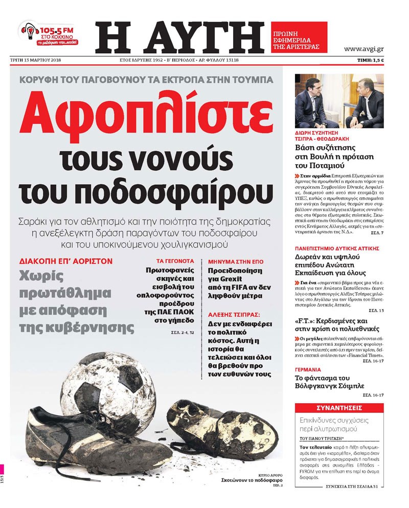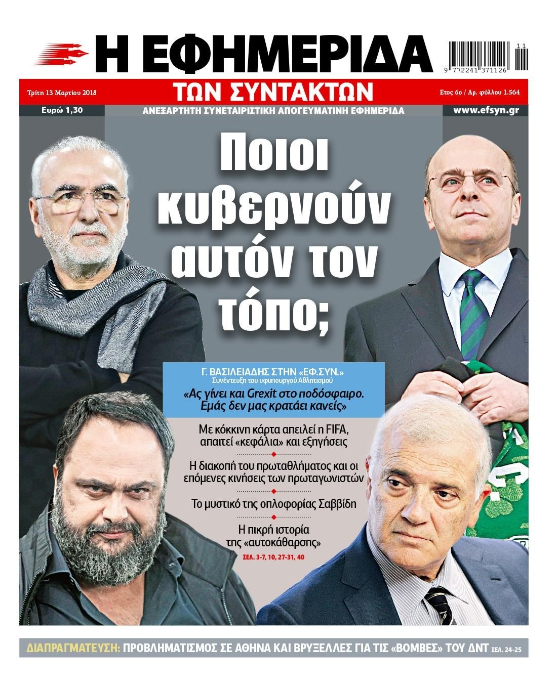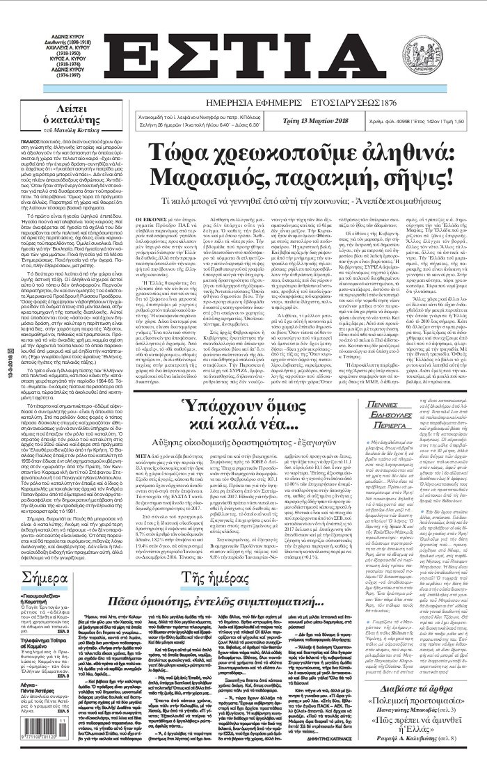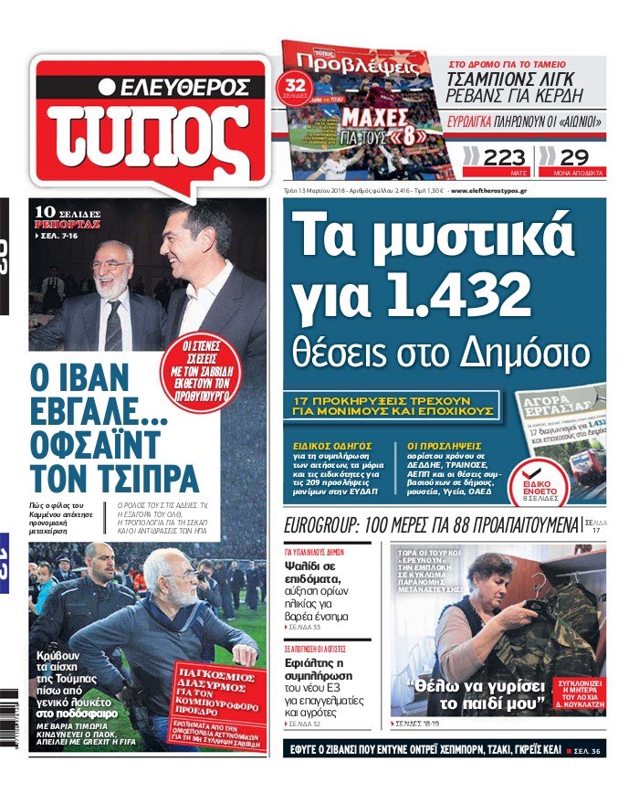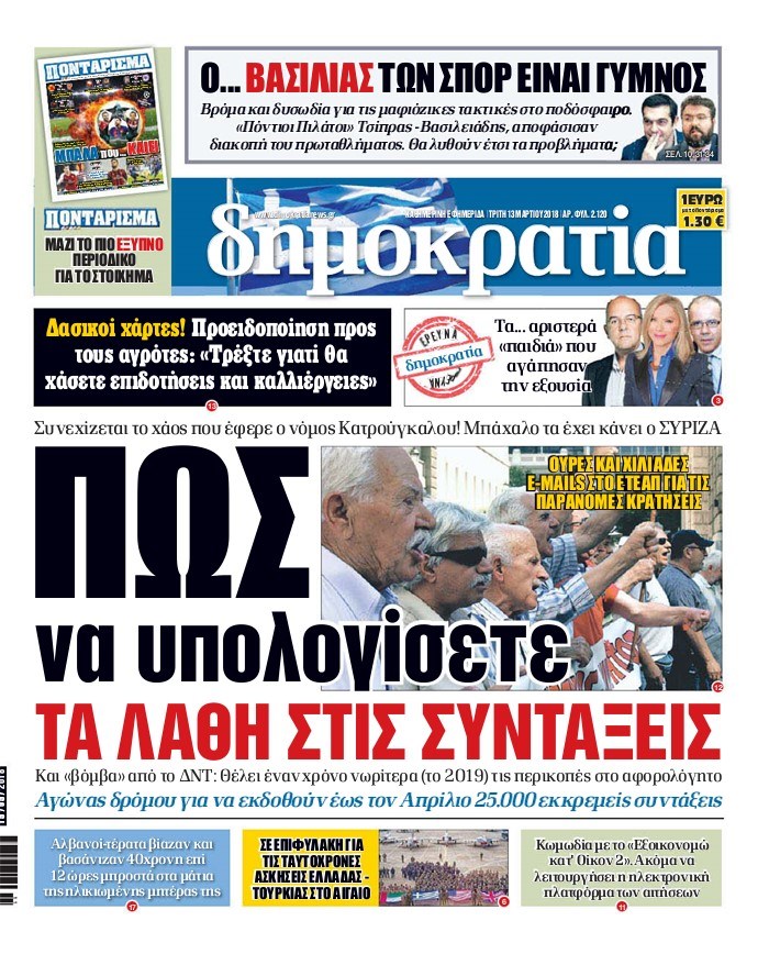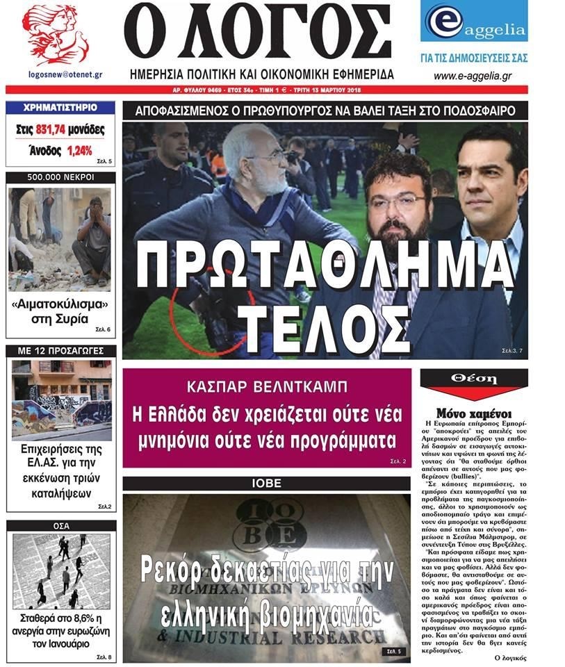 Οι πολιτικές εφημερίδες 13/3/2018 Κώστας Τεό 06:09, Τρίτη 13 Μαρτίου 2018 Media Διαβάστε τα σημερινά πρωτοσέλιδα των πολιτικών εφημερίδων: ΠΟΛΙΤΙΚΕΣ ΕΦΗΜΕΡΙΔΕΣ ΠΡΩΤΟΣΕΛΙΔΑ Μοιράσου το: σχολίασε κι εσύ (0 σχόλια) Ακολουθήστε το enikos.gr στο Google News και μάθετε πρώτοι όλες τις ειδήσεις Δείτε όλες τις τελευταίες ειδήσεις από την Ελλάδα και τον Κόσμο στο enikos.gr Ειδήσεις Ροή Ειδήσεων 4 ώρες πριν Υπόθεση Έπσταϊν: Το Υπουργείο Δικαιοσύνης δημοσιοποίησε μια σειρά από εξαιρετικά επεξεργασμένα αρχεία – «Λείπουν τα πιο σημαντικά έγγραφα», λένε οι Δημοκρατικοί 54 λεπτά πριν Γιορτές με μπλόκα για τους αγρότες: Ανοίγουν διόδια και μοιράζουν προϊόντα στους ταξιδιώτες 1 ώρα πριν Εξαφάνιση 33χρονου γιατρού στην Κρήτη: «Άναψα τα φώτα, τρόμαξε και άρχισε να τρέχει στα χωράφια» – Η τελευταία διαδρομή και η μαρτυρία «κλειδί» 3 ώρες πριν Ο «χάρτης» με τις αυξήσεις και τις φοροελαφρύνσεις του 2026 – Ποιοι και πόσα κερδίζουν 1 ώρα πριν Τα αρχεία του Έπσταϊν αποκαλύπτουν φωτογραφία του έκπτωτου πρίγκιπα Άντριου – Είναι ξαπλωμένος στην αγκαλιά 5 γυναικών 1 ώρα πριν Μία νέα «χρυσή» περίοδος αρχίζει για 3 ζώδια από σήμερα – «Μία αναπάντεχη ευκαιρία οδηγεί στην επιτυχία» 5 ώρες πριν Αυγά: Πόσα μπορείτε να τρώτε την ημέρα με ασφάλεια για μέγιστη πρόσληψη πρωτεΐνης 3 ώρες πριν Αρχαιολόγοι ανακάλυψαν σε χωράφι απεικόνιση 600 ετών ενός Αγίου – Τα στοιχεία που δείχνουν ότι μαρτύρησε 2 ώρες πριν Αγχώνεται για το χριστουγεννιάτικο δώρο που πήρε στην πλούσια σύντροφό του – «Φοβάμαι πως θα το βρει φθηνιάρικο, φοράει βραχιόλια Cartier» 3 λεπτά πριν Τραγωδία στην άσφαλτο στα Χανιά: Νεκρός 37χρονος οδηγός ΙΧ – Τον βρήκαν ώρες μετά το τροχαίο 11 λεπτά πριν Τα Labubu «μετακομίζουν» στο Χόλιγουντ: Η Sony Pictures ετοιμάζει live-action ταινία με τον σκηνοθέτη του «Wonka» 19 λεπτά πριν Νέες ταυτότητες: Μεγάλη αναμονή για ραντεβού στην Αττική – Τέλος τα ταξίδια εκτός Ελλάδος από τον Αύγουστο για όσους δεν έχουν αλλάξει 27 λεπτά πριν Οι 7 φράσεις που δεν λένε ποτέ οι συναισθηματικά έξυπνοι άνθρωποι κατά τη διάρκεια ενός καβγά 31 λεπτά πριν Τηλεθέαση (19/12): Ανατροπές και πρωτιές στην πρωινή ζώνη ENIKOS NETWORK Είστε μόνιμα απρόσεκτοι; 3 σημάδια που δείχνουν ότι μπορεί να είναι σύμπτωμα πάθησης Πόσα κιλά παίρνουμε πραγματικά τα Χριστούγεννα, σύμφωνα με την επιστήμη – Πώς να το αποτρέψουμε; e-ΕΦΚΑ και ΔΥΠΑ: Έρχονται νέες πληρωμές έως τις 24 Δεκεμβρίου – Ποιοι πάνε ταμείο Επίδομα παιδιού: Τι αλλάζει από το 2026 – Το όφελος από τις φορολογικές ελαφρύνσεις Χαρτογραφώντας το «σημείο χωρίς επιστροφή»: Για πρώτη φορά αποκαλύπτεται με λεπτομέρεια το ακανθώδες όριο της ατμόσφαιρας τ... Η Google καταργεί τη λειτουργία «dark web report» – Πώς θα μπορούν οι χρήστες να διαγράφουν τα δεδομένα τους περισσότερα 09:30 , Σάββατο 20 Δεκεμβρίου 2025 «Porto Leone: Στη γειτονιά με τα κόκκινα φανάρια» – Ο Χρόνης αποκαλύπτει στην Αλεξάνδρα το μυστικό για το παιδί της Λένας Η μεγάλη δραματική σειρά του Apha «Porto Leone: Στη γειτονιά με τα κόκκινα φανάρια» μας μεταφέ... 08:14 , Σάββατο 20 Δεκεμβρίου 2025 Τρομεροί γονείς: Η Μαρία Καβογιάννη εισβάλλει στο σπίτι της οικογένειας Στεφανίδη Όσα θα δούμε στο νέο διπλό επεισόδιο της σειράς «Τρομεροί γονείς», σήμερα Σάββατο 20 Δεκεμβρίο... 05:48 , Σάββατο 20 Δεκεμβρίου 2025 Οι οικονομικές εφημερίδες 20/12/2025 Διαβάστε τα πρωτοσέλιδα από τις οικονομικές εφημερίδες, σήμερα 20/12/2025. 05:43 , Σάββατο 20 Δεκεμβρίου 2025 Οι αθλητικές εφημερίδες 20/12/2025 Διαβάστε τα πρωτοσέλιδα από 