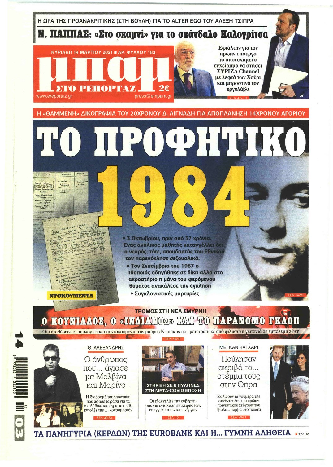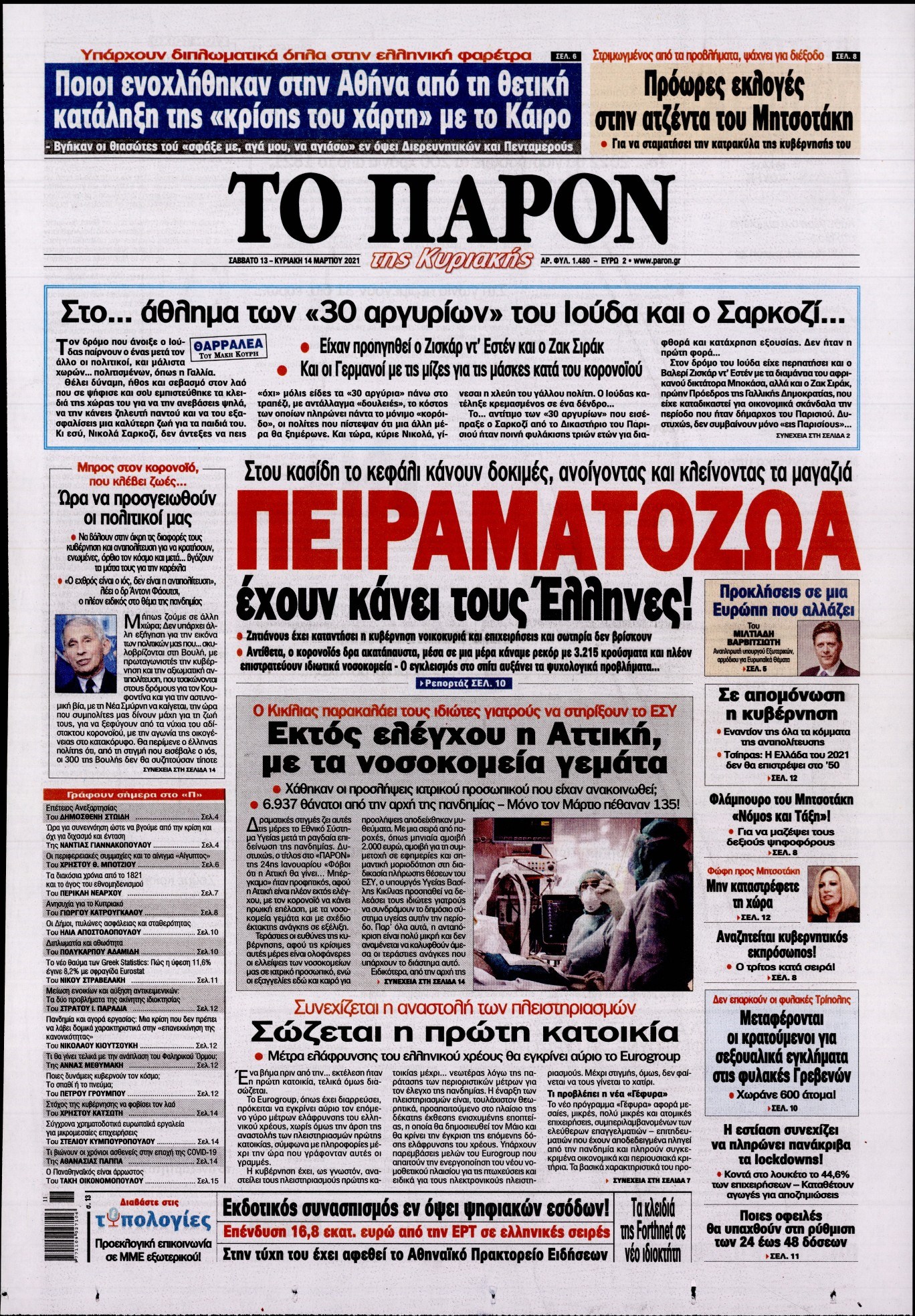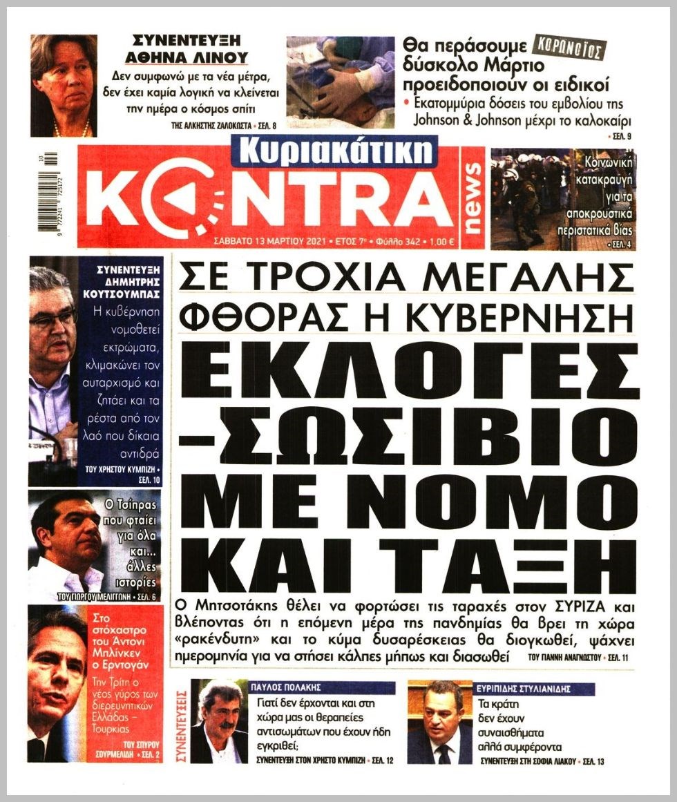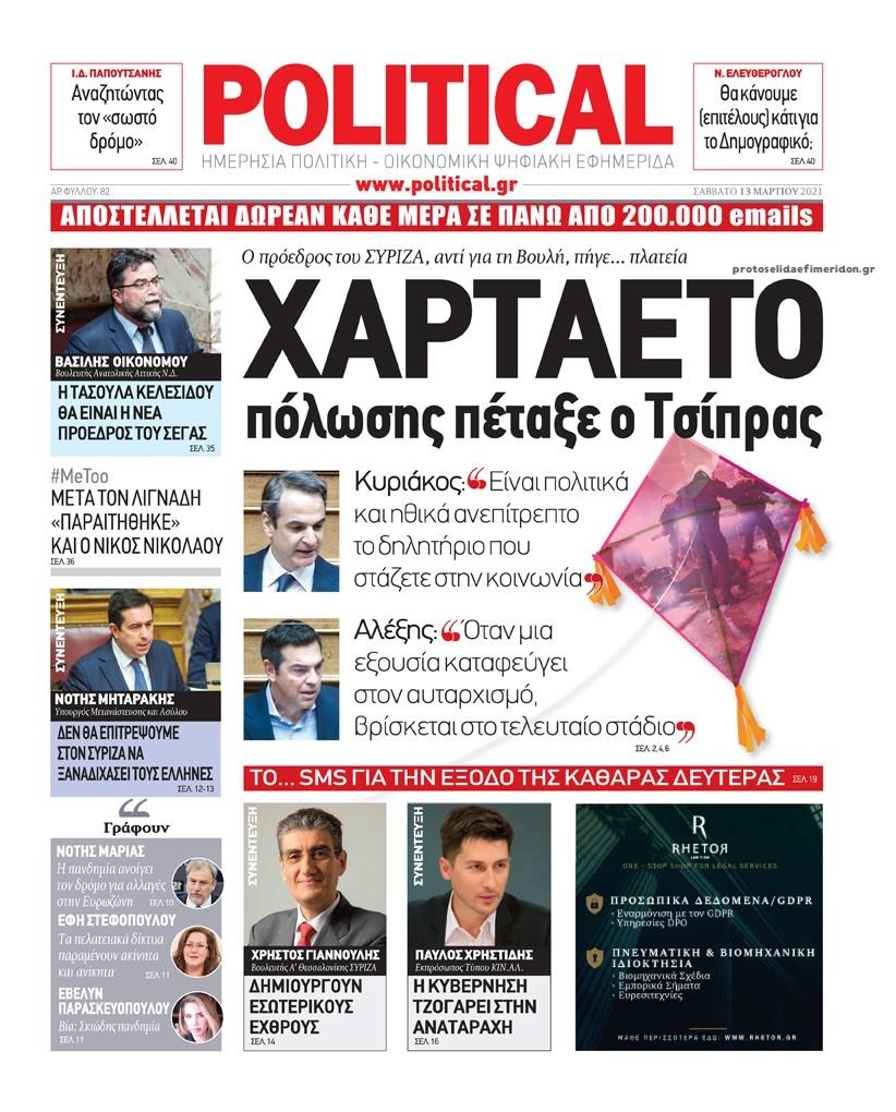 Οι πολιτικές εφημερίδες 13/3/2021 Διονύσης Νίκκας 07:10, Σάββατο 13 Μαρτίου 2021 Media Διαβάστε τα πρωτοσέλιδα των πολιτικών εφημερίδων… ΕΦΗΜΕΡΙΔΕΣ ΝΕΑ ΠΡΩΤΟΣΕΛΙΔΑ Μοιράσου το: σχολίασε κι εσύ (0 σχόλια) Ακολουθήστε το enikos.gr στο Google News και μάθετε πρώτοι όλες τις ειδήσεις Δείτε όλες τις τελευταίες ειδήσεις από την Ελλάδα και τον Κόσμο στο enikos.gr Ειδήσεις Ροή Ειδήσεων 1 ώρα πριν Μπλόκα: Οι αγρότες σηκώνουν τις μπάρες σε διόδια για τους εκδρομείς των Χριστουγέννων και μοιράζουν προϊόντα – Βίντεο 2 ώρες πριν Τσιάρας προς αγρότες: Τα μπλόκα και τα πείσματα δεν ωφελούν – Οι λύσεις περνούν μέσα από τον διάλογο 3 ώρες πριν Αρχεία Έπσταϊν: Οι συγκλονιστικές φωτογραφίες – Ο Μάικλ Τζάκσον, ο Μικ Τζάγκερ και ο Κέβιν Σπέισι ανάμεσα στους διάσημους που απεικονίζονται 29 λεπτά πριν Μαθητές διακινούσαν κοκαΐνη και χασίς σε σχολείο της Αττικής – 12 συλλήψεις 3 ώρες πριν Ινδία: Επτά ελέφαντες σκοτώθηκαν κατά τη σύγκρουση επιβατικού τρένου με κοπάδι 5 ώρες πριν Μία νέα «χρυσή» περίοδος αρχίζει για 3 ζώδια από σήμερα – «Μία αναπάντεχη ευκαιρία οδηγεί στην επιτυχία» 6 ώρες πριν Αγχώνεται για το χριστουγεννιάτικο δώρο που πήρε στην πλούσια σύντροφό του – «Φοβάμαι πως θα το βρει φθηνιάρικο, φοράει βραχιόλια Cartier» 3 ώρες πριν Διαιτολόγος αποκαλύπτει 9 πρωινές συνήθειες που «λιώνουν» το κοιλιακό λίπος – «Υποστηρίζουν την υγιεινή απώλεια βάρους» 4 ώρες πριν Οι 7 φράσεις που δεν λένε ποτέ οι συναισθηματικά έξυπνοι άνθρωποι κατά τη διάρκεια ενός καβγά 9 λεπτά πριν Θεσσαλονίκη: Ανήλικος που είχε εξαφανιστεί βρέθηκε στο σπίτι Τούρκων μετά από αστυνομική επιχείρηση 18 λεπτά πριν Ιταλία: 384 συλλήψεις και κατάσχεση 1,4 τόνων ναρκωτικών σε μεγάλη αστυνομική επιχείρηση 26 λεπτά πριν Γερμανού για Μαζωνάκη: «Η σχέση μας μετράει 30 χρόνια – Σαφώς και έχω άποψη» 29 λεπτά πριν Μαθητές διακινούσαν κοκαΐνη και χασίς σε σχολείο της Αττικής – 12 συλλήψεις 35 λεπτά πριν Βέλγιο: Άγνωστοι έριξαν κόκκινη μπογιά στο προξενείο της Πολωνίας στις Βρυξέλλες ENIKOS NETWORK Η αποχή από την αναπαραγωγή παρατείνει τη ζωή στα ζώα, σύμφωνα με μελέτη – Τι ισχύει για τους ανθρώπους; Σημαντικές επαφές στις ΗΠΑ είχε ο υπουργός Υγείας Άδωνις Γεωργιάδης Τσιάρας προς αγρότες: Έχει ικανοποιηθεί το 74% των αιτημάτων – Τα μπλόκα και τα πείσματα δεν ωφελούν MyHealth App: Τα στοιχεία για τον Προσωπικό Βοηθό Υγείας Πολίτη – Τι ερωτήματα έγιναν μέσα σε 7 ημέρες Χαρτογραφώντας το «σημείο χωρίς επιστροφή»: Για πρώτη φορά αποκαλύπτεται με λεπτομέρεια το ακανθώδες όριο της ατμόσφαιρας τ... Η Google καταργεί τη λειτουργία «dark web report» – Πώς θα μπορούν οι χρήστες να διαγράφουν τα δεδομένα τους περισσότερα 14:04 , Σάββατο 20 Δεκεμβρίου 2025 Η Realnews αυτής της Κυριακής (21/12/2025) Με τίτλο: «Ασπίδα προστασίας για την Ελλάδα» κυκλοφορεί, αυτήν την Κυριακή, η Realnews. Σημαντ... 12:53 , Σάββατο 20 Δεκεμβρίου 2025 Να μ’ αγαπάς: Το παρελθόν έρχεται στο φως – Καταιγιστικές εξελίξεις στα τελευταία επεισόδια του 2025 Ο Άγγελος αποκαλύπτεται, η Φωτεινή ανησυχεί για τον Λευτέρη και η Ζωή έρχεται αντιμέτωπη με το... 11:41 , Σάββατο 20 Δεκεμβρίου 2025 «Η αγάπη δεν χάνεται ποτέ»: Η μικρού μήκους ταινία κινουμένων σχεδίων που θέτει ερωτήματα για τη ζωή και τον θάνατο Ο θάνατος είναι ένα από τα πιο σκληρά θέματα που καλείται να διαχειριστεί κάποιος στη διάρκεια... 09:30 , Σάββατο 20 Δεκεμβρίου 2025 «Porto Leone: Στη γειτονιά με τα κόκκινα φανάρια» – Ο Χρόνης αποκαλύπτει στην Αλεξάνδρα το μυστικό για το παι