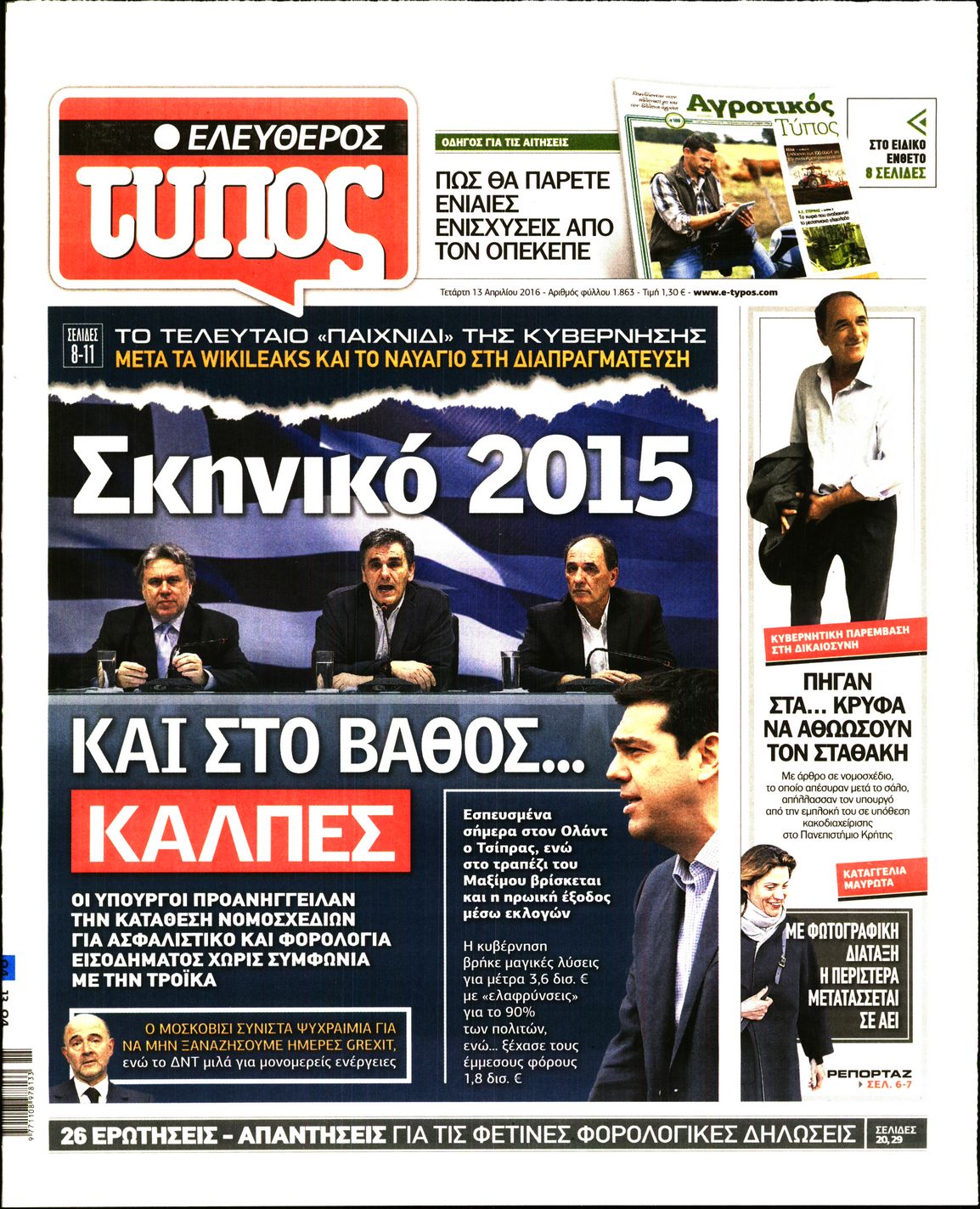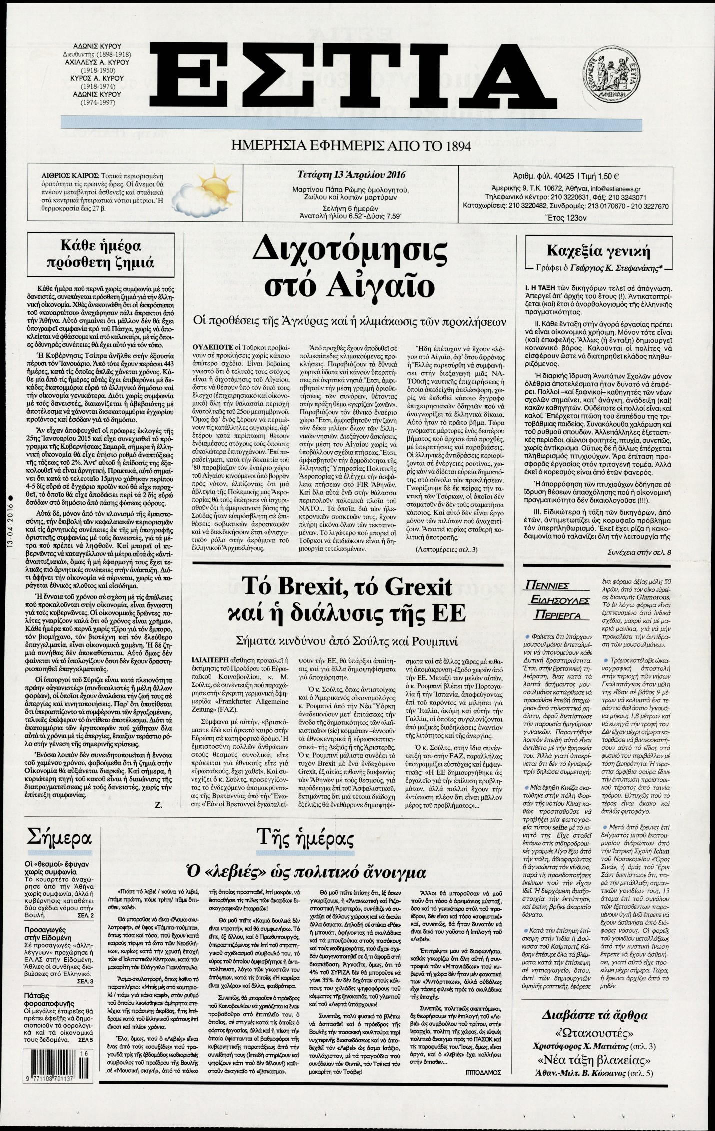 Οι πολιτικές εφημερίδες 13/4/2016 Enikos Newsroom 06:40, Τετάρτη 13 Απριλίου 2016 Media Διαβάστε τα σημερινά πρωτοσέλιδα των πολιτικών εφημερίδων… ΔΕΙΤΕ ΕΔΩ ΠΟΛΙΤΙΚΕΣ ΕΦΗΜΕΡΙΔΕΣ ΠΡΩΤΟΣΕΛΙΔΑ Μοιράσου το: σχολίασε κι εσύ (0 σχόλια) Ακολουθήστε το enikos.gr στο Google News και μάθετε πρώτοι όλες τις ειδήσεις Δείτε όλες τις τελευταίες ειδήσεις από την Ελλάδα και τον Κόσμο στο enikos.gr Ειδήσεις Ροή Ειδήσεων 8 ώρες πριν Χριστούγεννα στα μπλόκα: Επιμένουν στις κινητοποιήσεις τους οι αγρότες – Ανοίγουν τα διόδια το Σαββατοκύριακο 9 ώρες πριν Ουκρανία: Η άνευ προηγουμένου επίθεση σε ρωσικό τάνκερ στη Μεσόγειο και το μήνυμα προς στον Πούτιν – Το «μακρύ χέρι» του Κιέβου 8 ώρες πριν Πούτιν: Τα μηνύματα σε Ευρώπη και ΝΑΤΟ από το μαραθώνιο «σόου» του – Η απαίτηση για «σεβασμό» και η ειρήνη «με τους όρους» της Μόσχας 7 ώρες πριν ΗΠΑ: Η κυβέρνηση του Ντόναλντ Τραμπ άρχισε να δημοσιοποιεί τα αρχεία Έπσταϊν 7 ώρες πριν Άνω Λιόσια: Πυροβολισμοί σε επιχείρηση με χαλιά – Εντοπίστηκαν 10 κάλυκες 56 λεπτά πριν Αυγά: Πόσα μπορείτε να τρώτε την ημέρα με ασφάλεια για μέγιστη πρόσληψη πρωτεΐνης 1 ώρα πριν Τα ζώδια σήμερα, Σάββατο 20 Δεκεμβρίου: Παρθένοι, το σύμπαν σας δίνει το κλειδί 8 ώρες πριν Ανακαλύφθηκαν αρχαία χρυσά νομίσματα 2.200 ετών που απεικονίζουν τον θεό Απόλλωνα – Η άγνωστη σύνδεση με τον Φίλιππο Β΄ της Μακεδονίας 9 ώρες πριν Ύπνος: Μια κρυφή κατάσταση του εγκεφάλου πριν από τον ύπνο μπορεί να είναι το “κλειδί” για υψηλή ευφυΐα και δημιουργικότητα 16 λεπτά πριν Κίριλ Ντμίτριεφ: Στις ΗΠΑ ο απεσταλμένος της Ρωσίας για συνομιλίες με τους ομολόγους του, Γουίτκοφ και Κούσνερ 24 λεπτά πριν ΔΕΔΔΗΕ: Διακοπές ρεύματος σήμερα (20/12) στην Αθήνα και σε άλλες 7 περιοχές της Αττικής 32 λεπτά πριν Κολομβία: Είκοσι χρόνια κάθειρξη σε πρώην ανώτερο αξιωματικό για 72 εκτελέσεις αμάχων 40 λεπτά πριν Οπτική ψευδαίσθηση: Μόνο αν είσαι ο Σέρλοκ Χολμς θα βρεις τον αριθμό «87» σε 7 δευτερόλεπτα 47 λεπτά πριν Σαρωτικοί οι έλεγχοι στους δρόμους ενόψει εορτών – Μπλόκα της τροχαίας σε κεντρικές αρτηρίες της Αττικής ENIKOS NETWORK Πρέπει να αποδέχεστε ή να απορρίπτετε όλα τα cookies; Ένας ειδικός εξηγεί Η αγαπημένη λιχουδιά των πόνι που μπορεί να ενισχύσει όραση, εγκέφαλο και ανοσοποιητικό Αναστολή μέτρων αναγκαστικής εκτέλεσης για κτηνοτρόφους που πλήττονται από την ευλογιά των αιγοπροβάτων Πλήρης επάρκεια προϊόντων στις λαϊκές της Αττικής, παρά τις αγροτικές κινητοποιήσεις – Τι απαντούν οι πωλητές Χαρτογραφώντας το «σημείο χωρίς επιστροφή»: Για πρώτη φορά αποκαλύπτεται με λεπτομέρεια το ακανθώδες όριο της ατμόσφαιρας τ... Η Google καταργεί τη λειτουργία «dark web report» – Πώς θα μπορούν οι χρήστες να διαγράφουν τα δεδομένα τους περισσότερα 05:48 , Σάββατο 20 Δεκεμβρίου 2025 Οι οικονομικές εφημερίδες 20/12/2025 Διαβάστε τα πρωτοσέλιδα από τις οικονομικές εφημερίδες, σήμερα 20/12/2025. 05:43 , Σάββατο 20 Δεκεμβρίου 2025 Οι αθλητικές εφημερίδες 20/12/2025 Διαβάστε τα πρωτοσέλιδα από τις αθλητικές εφημερίδες, σήμερα 20/12/2025. 05:38 , Σάββατο 20 Δεκεμβρίου 2025 Οι πολιτικές εφημερίδες 20/12/2025 Διαβάστε τα πρωτοσέλιδα από τις πολιτικές εφημερίδες, σήμερα 20/12/2025. 04:20 , Σάββατο 20 Δεκεμβρίου 2025 Αγγελική Νικολούλη: Τα συλλυπητήρια για την απώλεια της Ειρήνης Μαρινάκη Τα συλληπητήρια στον πρόεδρο του Mega, τον Βαγγέλη Μαρινάκη, για την απώλεια της μητέρας του Ε... ΤΕΛΕΥΤΑΙΕΣ ΕΙΔΗΣΕΙΣ 16 λεπτά πριν Κίριλ Ντμίτριεφ: Στις ΗΠΑ ο απεσταλμένος της Ρωσίας... 24 λεπτά πριν ΔΕΔΔΗΕ: Διακοπές ρε