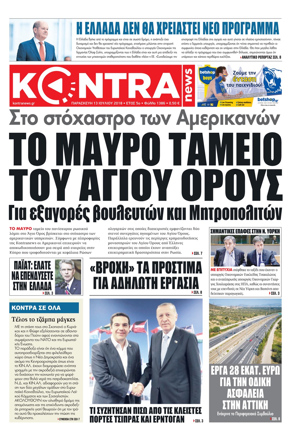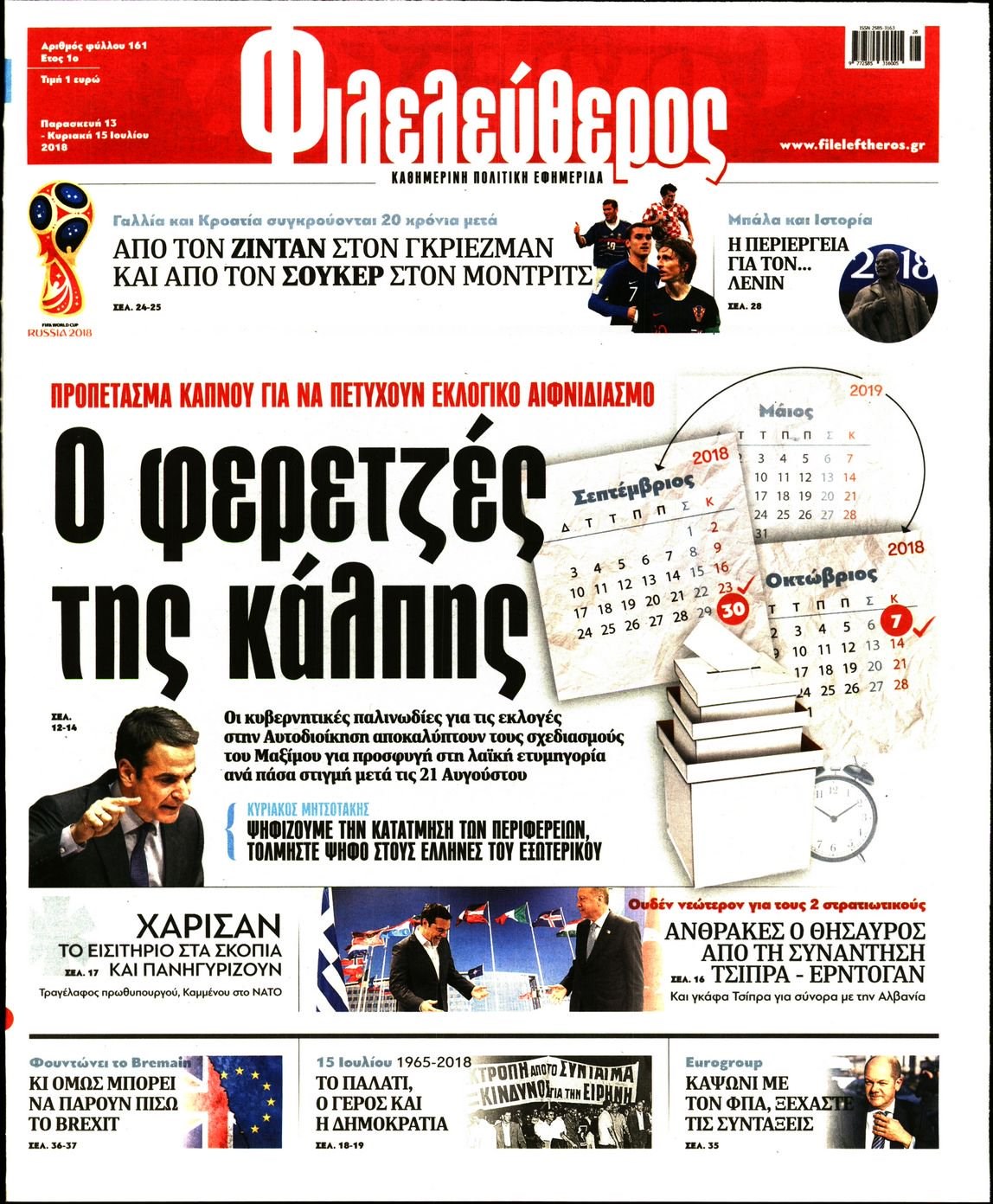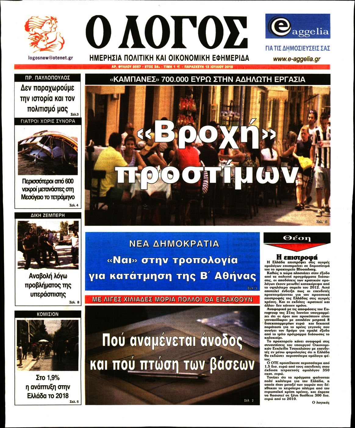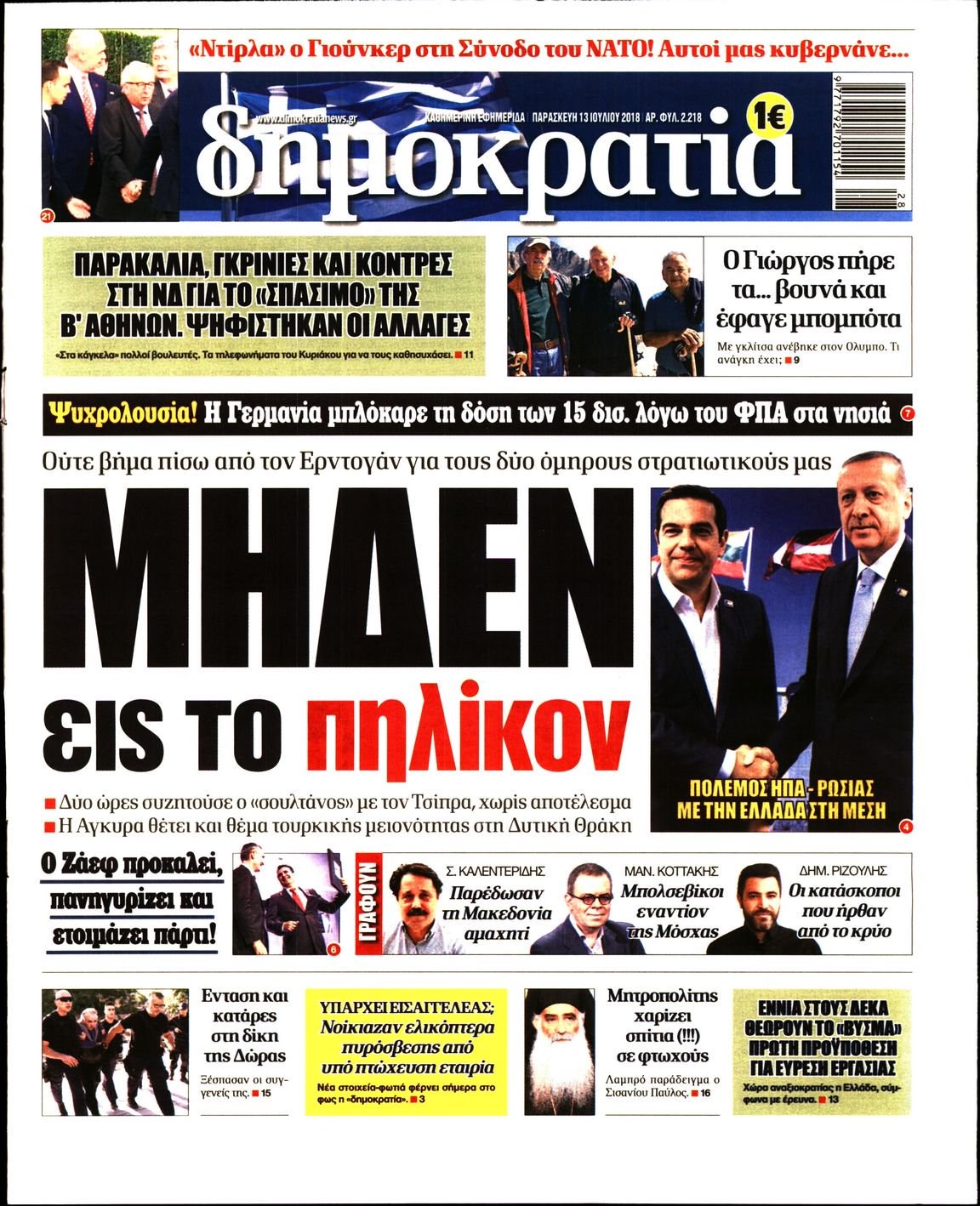 Οι πολιτικές εφημερίδες 13/7/2018 Enikos Newsroom 06:17, Παρασκευή 13 Ιουλίου 2018 Media Διαβάστε τα σημερινά πρωτοσέλιδα των πολιτικών εφημερίδων. ΠΟΛΙΤΙΚΕΣ ΕΦΗΜΕΡΙΔΕΣ ΠΡΩΤΟΣΕΛΙΔΑ Μοιράσου το: σχολίασε κι εσύ (0 σχόλια) Ακολουθήστε το enikos.gr στο Google News και μάθετε πρώτοι όλες τις ειδήσεις Δείτε όλες τις τελευταίες ειδήσεις από την Ελλάδα και τον Κόσμο στο enikos.gr Ειδήσεις Ροή Ειδήσεων 2 ώρες πριν Ζελένσκι: Μόνο οι ΗΠΑ και ο Τραμπ μπορούν να πιέσουν τη Ρωσία να βάλει τέλος στον πόλεμο 2 ώρες πριν Φοινικούντα: Προφυλακιστέος ο 30χρονος για συνέργεια στη διπλή δολοφονία – Και άλλα πρόσωπα στο «μικροσκόπιο» 3 ώρες πριν Κυριάκος Μητσοτάκης: Στην Ιερουσαλήμ την Τρίτη ο Πρωθυπουργός για την τριμερή Ελλάδας, Κύπρου, Ισραήλ – Θα συναντηθεί και με τον Αμπάς 6 ώρες πριν Πώς δρούσε το κύκλωμα που διακινούσε ναρκωτικά σε σχολεία – Υπέβαλαν σε βασανιστήρια όσους δεν τηρούσαν τους «κανόνες πειθαρχίας» 3 ώρες πριν Πάπας Λέων: Όταν έχει αϋπνίες επενδύει παραγωγικά τον χρόνο του – Ποιο παιχνίδι παίζει στο κινητό 2 ώρες πριν Αριθμολογία: Ο αριθμός του φύλακα αγγέλου σας, με βάση τον μήνα γέννησής σας – «Έτσι σας στέλνει σημάδια το σύμπαν» 3 ώρες πριν Πώς να απαλλαγείτε από τη μυρωδιά του τηγανητού φαγητού: Το μυστικό βρίσκεται στην κουζίνα σας 4 ώρες πριν Μήπως οι γιορτές σας δεν είναι τόσο τέλειες; 7 χριστουγεννιάτικες συνήθειες που μαρτυρούν ότι μια οικογένεια είναι δυσλειτουργική 14 ώρες πριν Enerwave: Το νέο «ρεύμα» στη λιανική ενέργειας που αλλάζει την εμπειρία του καταναλωτή 9 λεπτά πριν Χριστούγεννα στα μπλόκα οι αγρότες: Άνοιξαν στα διόδια και μοίρασαν προϊόντα στους πολίτες – Νέα σύσκεψη την Κυριακή στη Νίκαια 19 λεπτά πριν Ολυμπιακός – Κηφισιά 1-1: Δεύτερη σερί ισοπαλία για τους Ερυθρόλευκους – Υπό… αμφισβήτηση η κορυφή της Super League 30 λεπτά πριν Κύκλωμα διακίνησης ναρκωτικών σε σχολεία: Τηλεφωνούσαν στους ανηλίκους την ώρα του μαθήματος – Οι διάλογοι-σοκ, τα «ψευδώνυμα» και τα βασανιστήρια 39 λεπτά πριν Χαβιέρ Μιλέι: Ο πρόεδρος της Αργεντινής χαιρετίζει την «πίεση των ΗΠΑ» στη Βενεζουέλα 46 λεπτά πριν Ξένια Τσίρκοβα: Έμαθε από την τηλεόραση ότι είναι η μεγάλη νικήτρια του GNTM – Η αντίδρασή της – ΒΙΝΤΕΟ ENIKOS NETWORK Οι γυναίκες αποκαλύπτουν το πιο ελκυστικό πράγμα που μπορεί να κάνει ένας άνδρας Ομορφιά και αντιγήρανση: Ειδικοί μιλούν για συσκευές περιποίησης του δέρματος Ακύρωση ΑΦΜ για απάτες – Ποιους βάζει στο στόχαστρο η ΑΑΔΕ Ρεύμα: Πώς μπορείτε να αλλάξετε πάροχο γρήγορα και εύκολα – Τα βήματα της διαδικασίας Χαρτογραφώντας το «σημείο χωρίς επιστροφή»: Για πρώτη φορά αποκαλύπτεται με λεπτομέρεια το ακανθώδες όριο της ατμόσφαιρας τ... Η Google καταργεί τη λειτουργία «dark web report» – Πώς θα μπορούν οι χρήστες να διαγράφουν τα δεδομένα τους περισσότερα 20:30 , Σάββατο 20 Δεκεμβρίου 2025 Αυτή την Κυριακή με τη Realnews: Instyle, μαζί Drive και Realnews Geopolitics Αυτή την Κυριακή με τη Realnews: Instyle, μαζί Drive και Realnews Geopolitics Instyle Η Άννα Ρ... 20:28 , Σάββατο 20 Δεκεμβρίου 2025 Ο ΑΝΤ1 γεμίζει τις γιορτές με μουσική – Ποιους καλλιτέχνες θα απολαύσουμε Φέτος στον ΑΝΤ1 γιορτάζουμε τις νύχτες μας παρέα με αγαπημένους καλλιτέχνες και μεγάλες μουσι... 18:19 , Σάββατο 20 Δεκεμβρίου 2025 HOTΕΛ ΕΛVIRA: Η Ελβίρα μαθαίνει πως ο Χάρι μένει κρυφά στο ξενοδοχείο του Παντελή Συνεχίζονται οι εκλογές για πρόεδρο, στο νέο επεισόδιο της κωμικής σειράς του MEGA, HOTΕΛ ΕΛVI... 14:04 , Σάββατο 20 Δεκεμβρίου 2025 Η Realnews αυτής της Κυριακής (21/12/2025) Με τίτλο: «Ασπίδα προστ
