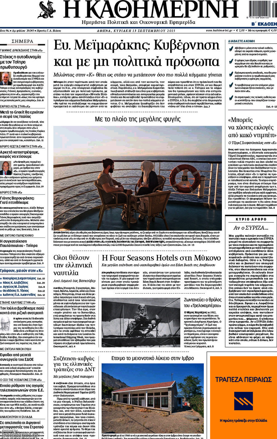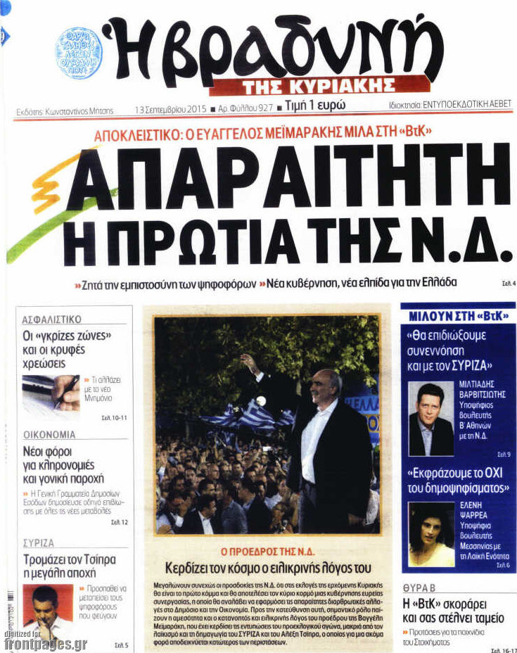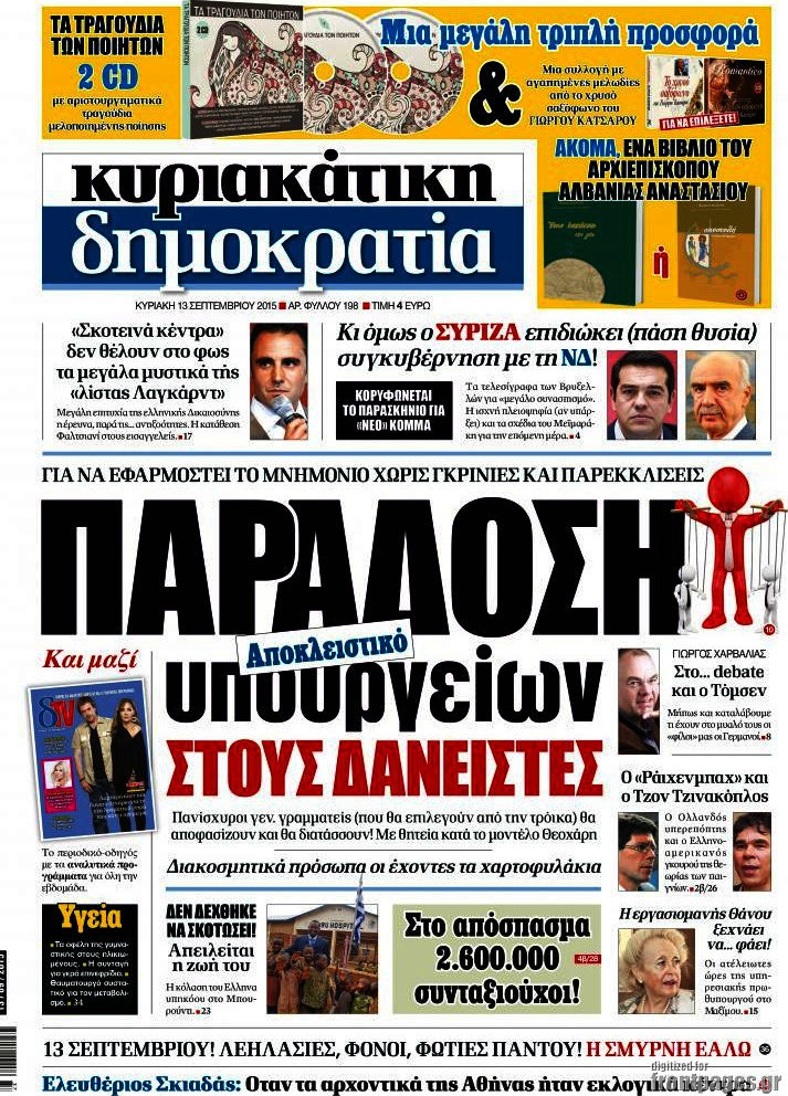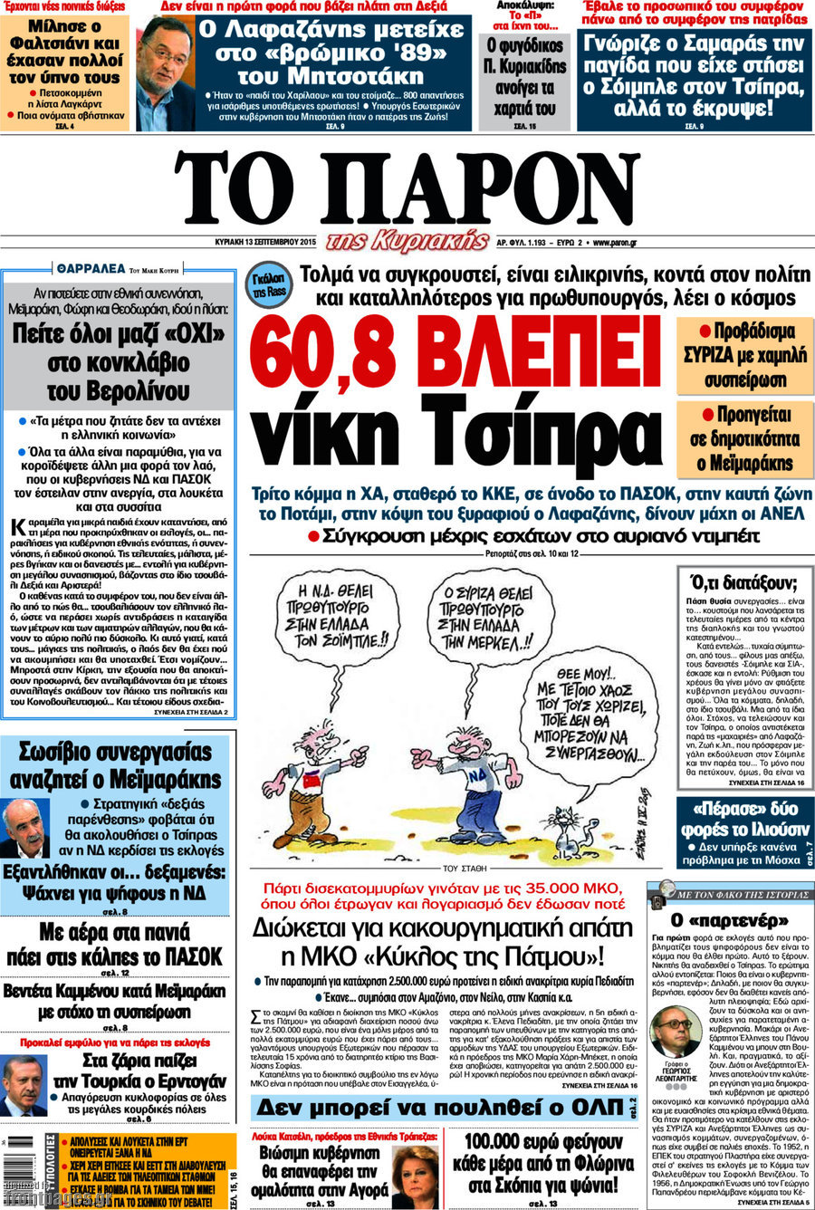 Οι πολιτικές εφημερίδες 13/9/2015 Enikos Newsroom 07:54, Κυριακή 13 Σεπτεμβρίου 2015 Media Διαβάστε τα σημερινά πρωτοσέλιδα των πολιτικών εφημερίδων. ΕΦΗΜΕΡΙΔΕΣ ΠΟΛΙΤΙΚΕΣ ΕΦΗΜΕΡΙΔΕΣ ΠΡΩΤΟΣΕΛΙΔΑ Μοιράσου το: σχολίασε κι εσύ (0 σχόλια) Ακολουθήστε το enikos.gr στο Google News και μάθετε πρώτοι όλες τις ειδήσεις Δείτε όλες τις τελευταίες ειδήσεις από την Ελλάδα και τον Κόσμο στο enikos.gr Ειδήσεις Ροή Ειδήσεων 36 λεπτά πριν Μεσόγειος: Η διαδρομή του ρωσικού τάνκερ «Qendil» και η στοχευμένη επίθεση της Ουκρανίας με drone – Ο Πούτιν προειδοποίησε για αντίποινα 30 λεπτά πριν Αττική: Θρίλερ με νεκρό βρέφος 5 μηνών – Κοιμόταν στο ίδιο κρεβάτι με τους γονείς του 1 ώρα πριν Από το Ορμένιο ως τα Μάλγαρα κι από τη Σιάτιστα μέχρι τη Νίκαια: Μπλόκα σε όλη την Ελλάδα – Το Σάββατο ανοίγουν τα διόδια οι αγρότες 1 ώρα πριν «Έλληνας Εσκομπάρ»: Φωτογραφίες με τους 4 τόνους κοκαΐνης που κατασχέθηκαν από το σκάφος «Ουρανία» 3 ώρες πριν Πούτιν: Σαρκαστικά μηνύματα, παράπονα και απρόοπτα στη συνέντευξη Τύπου – Η πρόταση γάμου on air και οι ερωτήσεις για τα αγγούρια και τους… εξωγήινους 3 ώρες πριν Τα 5 ζώδια που ευνοούνται στην ερωτική ζωή τους την επόμενη εβδομάδα – «Η ενέργεια του Αιγόκερου φέρνει αγάπη και σταθερότητα» 7 ώρες πριν Ειδικός μοιράζεται 6 κόλπα για να διατηρείστε σε φόρμα με πάνω από 40 ώρες εργασίας την εβδομάδα: «Προπονηθείτε πριν από τη δουλειά, όχι μετά» 4 ώρες πριν Αυτό το έξυπνο μαθηματικό κόλπο θα μπορούσε να αλλάξει τον τρόπο με τον οποίο οι επιστήμονες μελετούν τους σεισμούς 1 ώρα πριν Κουίζ για την παλιά Αθήνα: Αναγνωρίζετε την περιοχή; Έχετε περάσει 100% από εκεί 5 λεπτά πριν Επίσημη η «βόμβα»: Ο ΠΑΟΚ ανακοίνωσε την απόκτηση του Πάτρικ Μπέβερλι 9 λεπτά πριν Θεσσαλονίκη: Πατέρας εγκαλεί τον Ιατρικό Σύλλογο για ποινές «χάδι» σε γιατρό που κατηγορείται για τον θάνατο του παιδιού του 16 λεπτά πριν Κερατσίνι: Αστυνομικός εκτός υπηρεσίας απέτρεψε κλοπή μηχανών – Συνελήφθησαν τρεις ανήλικοι 19 λεπτά πριν Το σόι σου: Ο Άρης έρχεται στην Ελλάδα για τις γιορτές των Χριστουγέννων – Τι θα δούμε στο αποψινό εορταστικό επεισόδιο 26 λεπτά πριν ΠΑΣΟΚ σε Μαρινάκη: Δεν νομιμοποιούμε πολιτικές επιλογές που μεταφέρουν το πρόβλημα από υπηρεσία σε υπηρεσία ENIKOS NETWORK «Η σούπερ» γρίπη εξαπλώνεται στην Ευρώπη-Στοιχεία για την αποτελεσματικότητα του εμβολίου από το ECDC ΕΛΣΤΑΤ: Αύξηση κατά 1,7% των επαγγελματιών υγείας το 2024 Η απάντηση της κυβέρνησης στα αιτήματα των αγροτών: 16 έχουν ικανοποιηθεί, 4 βρίσκονται υπό επεξεργασία και 7 δεν είναι εφι... Μισθολογική διαφάνεια: Το 68% των εργαζομένων αγνοεί τη νέα οδηγία – Αναλυτικά τα στοιχεία έρευνας Χαρτογραφώντας το «σημείο χωρίς επιστροφή»: Για πρώτη φορά αποκαλύπτεται με λεπτομέρεια το ακανθώδες όριο της ατμόσφαιρας τ... Η Google καταργεί τη λειτουργία «dark web report» – Πώς θα μπορούν οι χρήστες να διαγράφουν τα δεδομένα τους περισσότερα 18:11 , Παρασκευή 19 Δεκεμβρίου 2025 Το σόι σου: Ο Άρης έρχεται στην Ελλάδα για τις γιορτές των Χριστουγέννων – Τι θα δούμε στο αποψινό εορταστικό επεισόδιο Ένα απολαυστικό, εορταστικό επεισόδιο της σειράς “Το σόι σου”, γεμάτο ευτράπελα αλ... 15:15 , Παρασκευή 19 Δεκεμβρίου 2025 Την Κυριακή με τη Realnews: Ό,τι και αν αγοράσεις, σκανάρεις και κερδίζεις! Την Κυριακή με τη Realnews: Ό,τι και αν αγοράσεις, σκανάρεις και κερδίζεις! Με το PADU app, το... 08:00 , Παρασκευή 19 Δεκεμβρίου 2025 Την Κυριακή με τη Realnews: Δωροεπιταγή 10€ Δωροεπιταγή αξίας 10€ για αγορές άνω των 60€ από τ