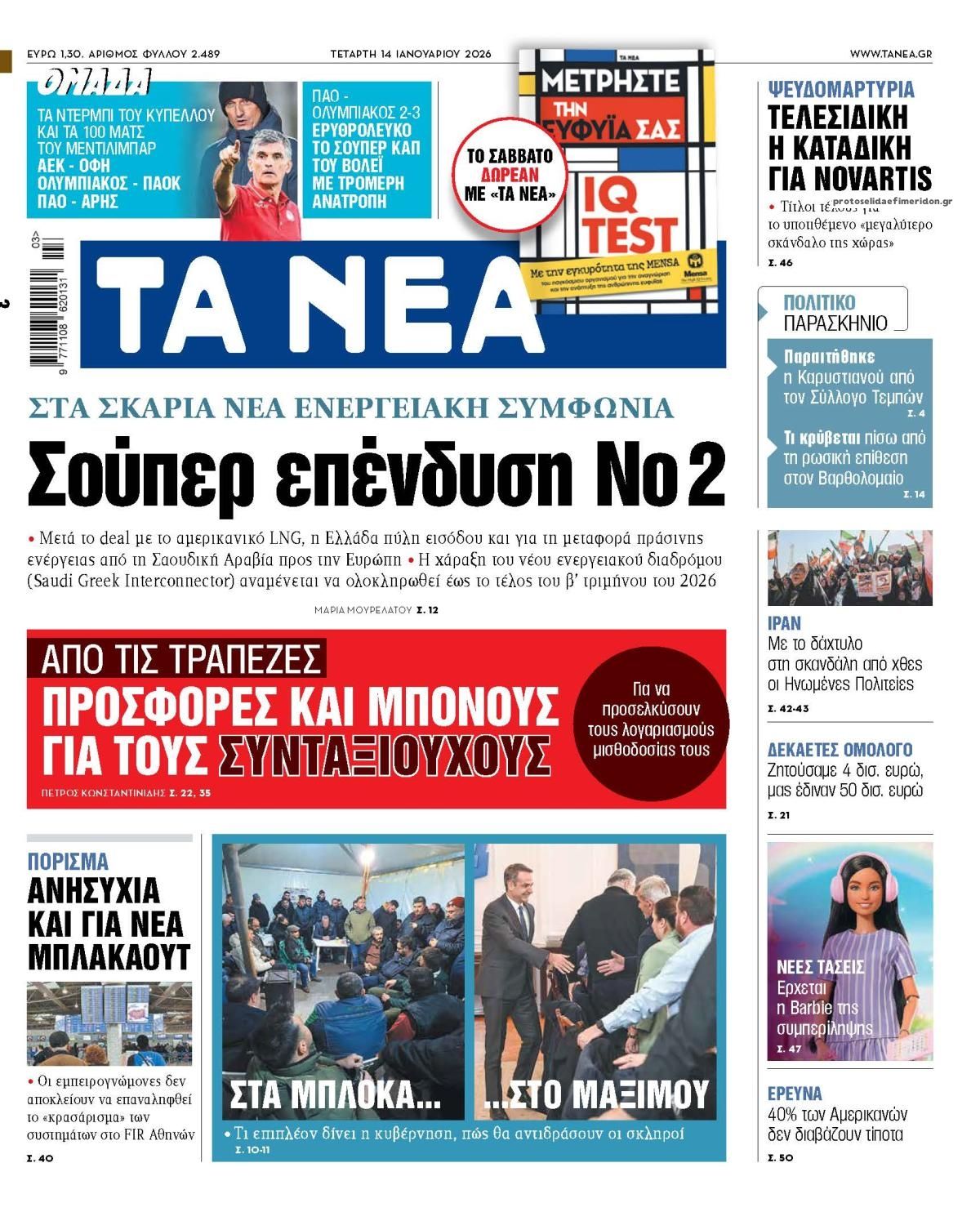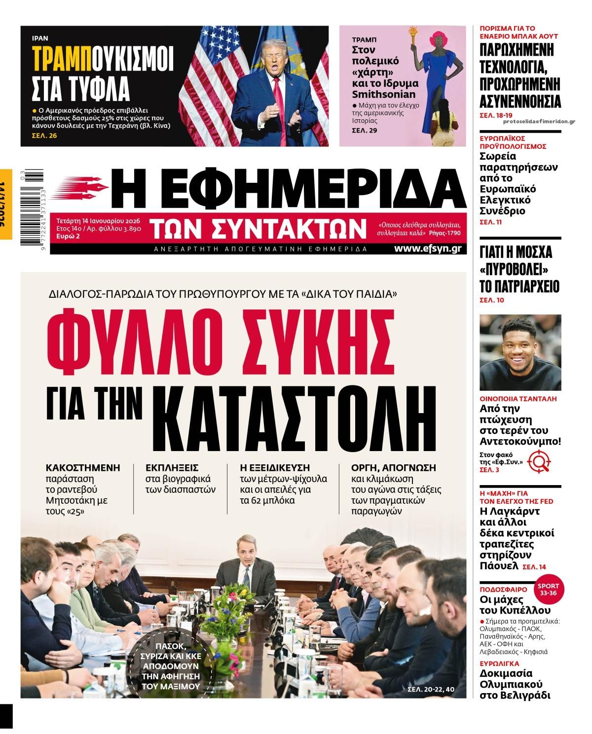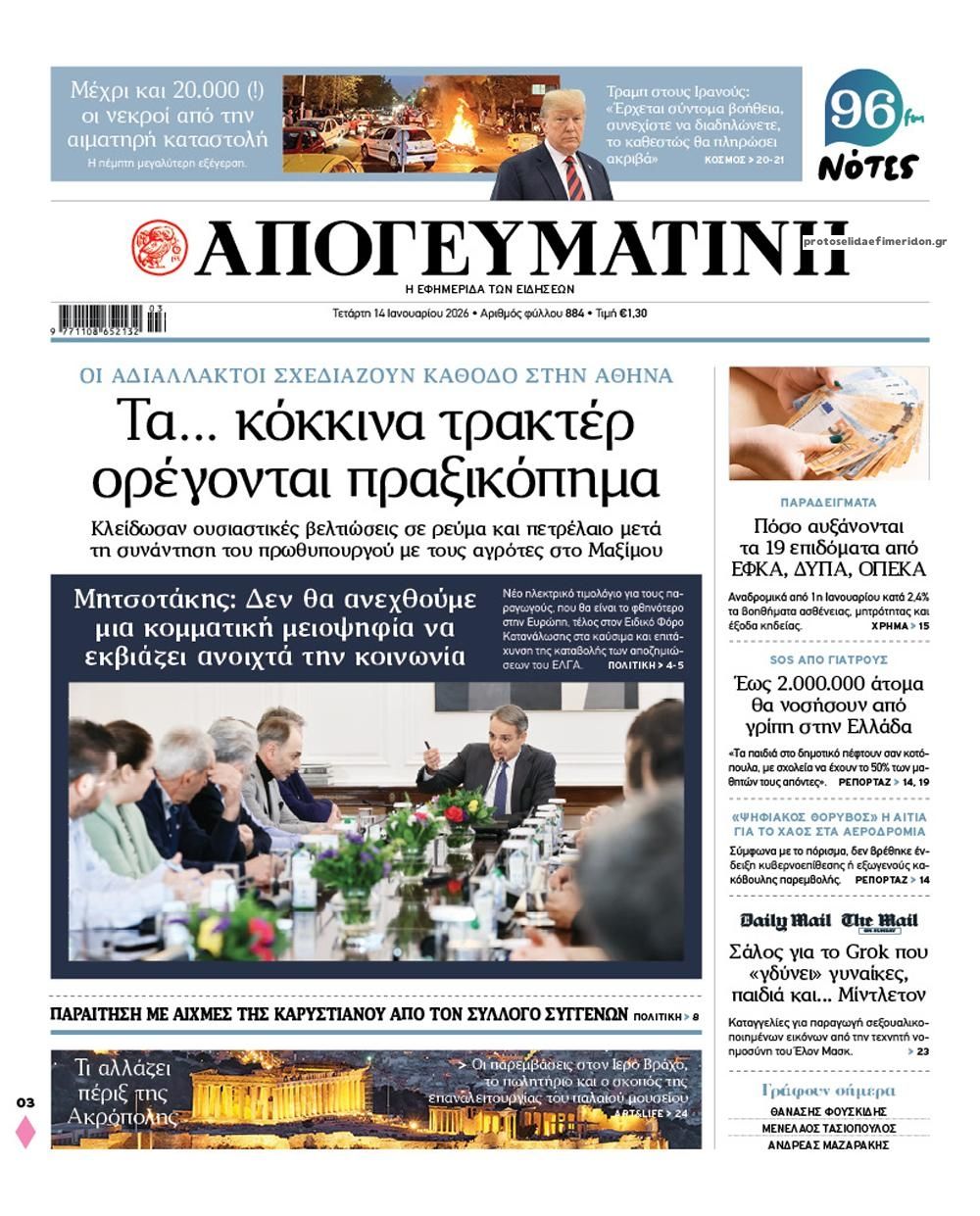 Οι πολιτικές εφημερίδες 14/1/2026 Enikos Newsroom 05:38, Τετάρτη 14 Ιανουαρίου 2026 Media Διαβάστε τα πρωτοσέλιδα από τις πολιτικές εφημερίδες, σήμερα 14/1/2026. ΕΦΗΜΕΡΙΔΕΣ ΟΙ ΠΟΛΙΤΙΚΕΣ ΕΦΗΜΕΡΙΔΕΣ ΠΡΩΤΟΣΕΛΙΔA Μοιράσου το: ACLED: Ο Ντόναλντ Τραμπ μέσα σε ένα χρόνο προχώρησε σε τόσα πλήγματα όσα σε ολόκληρη τη θητεία του ο Μπάιντεν Πασχάλης Τερζής: Η συνάντηση με τον Χρήστο Νικολόπουλο και οι σπάνιες φωτογραφίες – «Σε λίγες μέρες κυκλοφορει… » Μαρία Καβογιάννη: Η αγαπημένη ηθοποιός γιόρτασε τα 68α γενέθλιά της με ένα μεγάλο πάρτι – Δείτε βίντεο σχολίασε κι εσύ (0 σχόλια) Ακολουθήστε το enikos.gr στο Google News και μάθετε πρώτοι όλες τις ειδήσεις Δείτε όλες τις τελευταίες ειδήσεις από την Ελλάδα και τον Κόσμο στο enikos.gr Ειδήσεις Ροή Ειδήσεων 8 ώρες πριν Όσα συζητήθηκαν στην 3,5 ωρών συνάντηση Μητσοτάκη – αγροτών: Οι βελτιώσεις σε 3 μέτρα και το μήνυμα στους «σκληρούς» των μπλόκων που θέλουν κάθοδο με τρακτέρ στην Αθήνα 8 ώρες πριν Μαρία Καρυστιανού: Αποχωρεί από το ΔΣ του Συλλόγου συγγενών θυμάτων των Τεμπών 8 ώρες πριν Ιράν: Γιατί είναι περιορισμένες οι επιλογές του Τραμπ για στρατιωτική επέμβαση – Ανάλυση του Guardian 8 ώρες πριν Εξαφάνιση 16χρονης στην Πάτρα: Είχε φιλοξενηθεί σε δομή στη Γερμανία έπειτα από καταγγελία γείτονα – Οι αναρτήσεις που μιλούσε για κακοποίηση και το νέο βίντεο 50 λεπτά πριν Χωρίς ταξί και σήμερα η χώρα λόγω της απεργίας των αυτοκινητιστών 43 λεπτά πριν Οπτική ψευδαίσθηση: Μόνο αν έχετε παρατηρητικότητα ντετέκτιβ, θα εντοπίσετε την ομπρέλα σε 12 δευτερόλεπτα 59 λεπτά πριν Πρόληψη οστεοπόρωσης: Η πρωινή συνήθεια που προστατεύει την υγεία των οστών σας καθώς μεγαλώνετε, σύμφωνα με μελέτη 4 ώρες πριν Τα ζώδια σήμερα, Τετάρτη 14 Ιανουαρίου 2026: Καρκίνοι, κάντε μεγάλα όνειρα για το πώς θέλετε να βοηθήσετε τον κόσμο και ξεκινήστε από εκεί 8 ώρες πριν Δέος από αρχαιολογική αποκάλυψη κατά τη διάρκεια έργων για την κατασκευή δρόμου – Βρέθηκε «πριγκιπικός» τάφος με σιλουέτες που μοιάζουν με «φαντάσματα» 4 λεπτά πριν Με αιχμή το «ΔΕΟΣ» οι μάχες της ΑΑΔΕ κατά της φοροδιαφυγής, του λαθρεμπορίου και της οικονομικής απάτης 11 λεπτά πριν Κόστα Ρίκα: Οι αρχές αποκάλυψαν σχέδιο δολοφονίας του προέδρου Τσάβες 14 λεπτά πριν Τραγωδία στην Ταϊλάνδη: Τουλάχιστον 12 νεκροί και 30 τραυματίες από κατάρρευση γερανού πάνω σε τρένο 19 λεπτά πριν ΟΗΕ: Προειδοποίηση Γκουτέρες στο Ισραήλ για παραπομπή στη Χάγη σχετικά με την UNRWA 28 λεπτά πριν ΔΕΔΔΗΕ: Διακοπές ρεύματος σήμερα (14/1) στην Αθήνα και σε άλλες 14 περιοχές της Αττικής ENIKOS NETWORK Έχετε μάτια γερακιού; Εντοπίστε το κρυμμένο ζώο σε αυτό το τεστ οπτικής αντίληψης μέσα σε 25 δευτερόλεπτα Το λαχανικό των μαγισσών της Ευρώπης που έχει αντικαρκινική δράση και να προστατεύει από λοιμώξεις Σούπερ μάρκετ: Ξεπέρασε τα 16 δισ. ευρώ ο τζίρος το 2025 – Τι δείχνουν τα στοιχεία της NielsenIQ ΑΔΜΗΕ: Σε λειτουργία το Ψηφιακό Κέντρο Συντήρησης – Στόχος ο έλεγχος κρίσιμου εξοπλισμού και υποδομών του Συστήματος Μεταφο... Ο Google Assistant θα παραμείνει λίγο περισσότερο για ορισμένους χρήστες Android Τεστ προσωπικότητας: Το βάζο που θα επιλέξετε αποκαλύπτει πώς λύνετε προβλήματα στη ζωή σας περισσότερα 05:48 , Τετάρτη 14 Ιανουαρίου 2026 Οι οικονομικές εφημερίδες 14/1/2026 Διαβάστε τα πρωτοσέλιδα από τις οικονομικές εφημερίδες, σήμερα 14/1/2026. 05:43 , Τετάρτη 14 Ιανουαρίου 2026 Οι αθλητικές εφημερίδες 14/1/2026 Διαβάστε τα πρωτοσέλιδα από τις αθλητικές εφημερίδες, σήμερα 14/1/2026. 18:55 , Τρίτη 13 Ιανουαρ