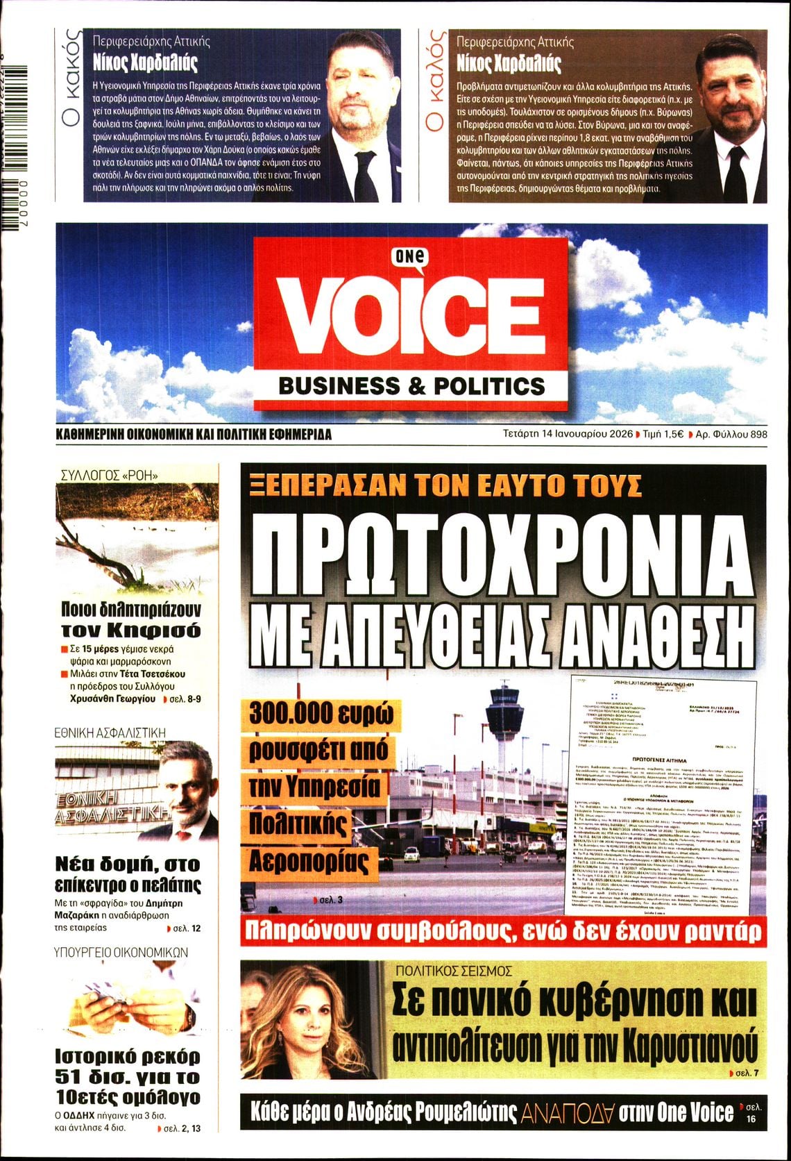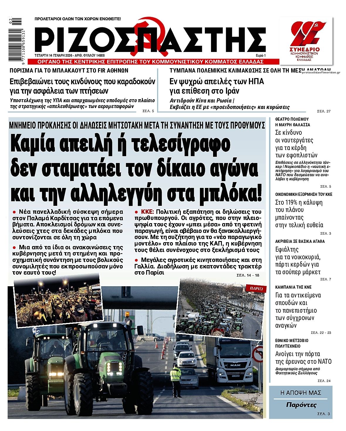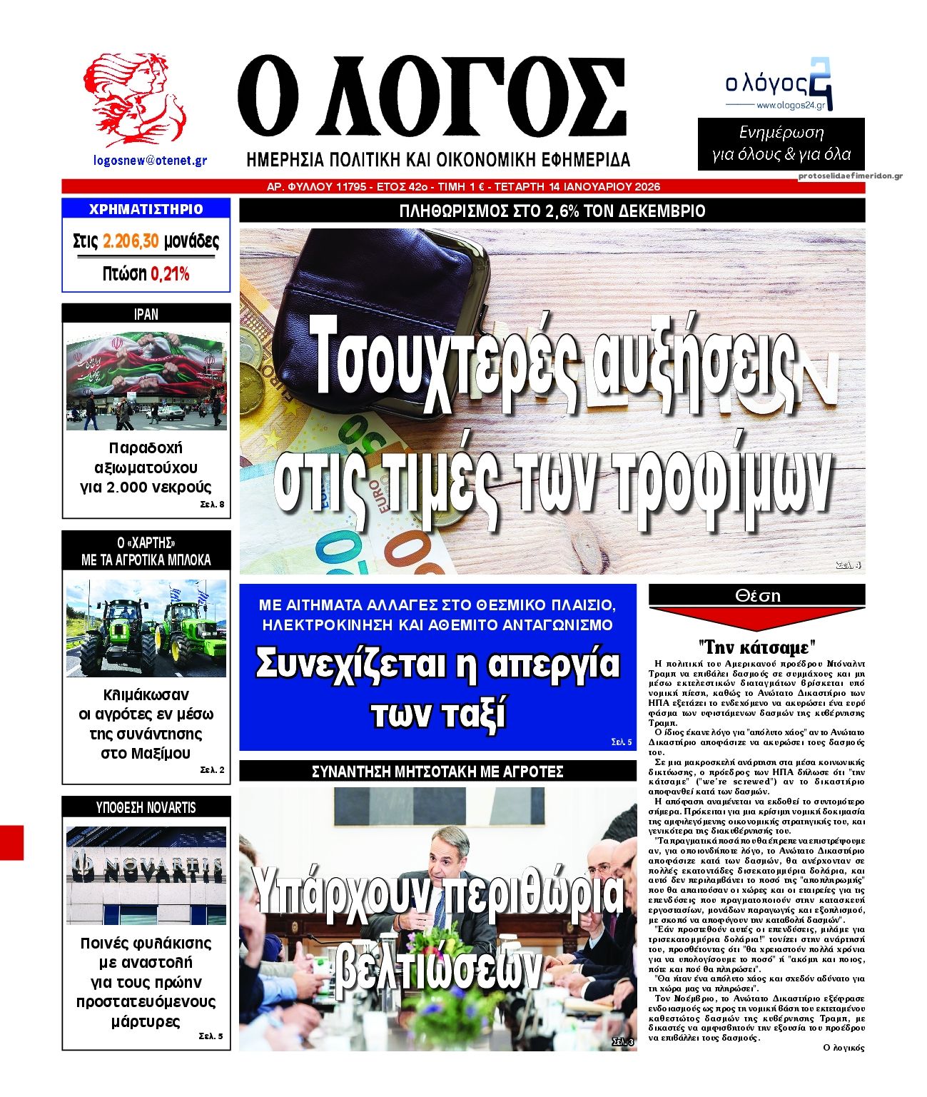 Οι πολιτικές εφημερίδες 14/1/2026 Enikos Newsroom 05:38, Τετάρτη 14 Ιανουαρίου 2026 Media Διαβάστε τα πρωτοσέλιδα από τις πολιτικές εφημερίδες, σήμερα 14/1/2026. ΕΦΗΜΕΡΙΔΕΣ ΟΙ ΠΟΛΙΤΙΚΕΣ ΕΦΗΜΕΡΙΔΕΣ ΠΡΩΤΟΣΕΛΙΔA Μοιράσου το: ACLED: Ο Ντόναλντ Τραμπ μέσα σε ένα χρόνο προχώρησε σε τόσα πλήγματα όσα σε ολόκληρη τη θητεία του ο Μπάιντεν Πασχάλης Τερζής: Η συνάντηση με τον Χρήστο Νικολόπουλο και οι σπάνιες φωτογραφίες – «Σε λίγες μέρες κυκλοφορει… » Μαρία Καβογιάννη: Η αγαπημένη ηθοποιός γιόρτασε τα 68α γενέθλιά της με ένα μεγάλο πάρτι – Δείτε βίντεο σχολίασε κι εσύ (0 σχόλια) Ακολουθήστε το enikos.gr στο Google News και μάθετε πρώτοι όλες τις ειδήσεις Δείτε όλες τις τελευταίες ειδήσεις από την Ελλάδα και τον Κόσμο στο enikos.gr Ειδήσεις Ροή Ειδήσεων 8 ώρες πριν Όσα συζητήθηκαν στην 3,5 ωρών συνάντηση Μητσοτάκη – αγροτών: Οι βελτιώσεις σε 3 μέτρα και το μήνυμα στους «σκληρούς» των μπλόκων που θέλουν κάθοδο με τρακτέρ στην Αθήνα 8 ώρες πριν Μαρία Καρυστιανού: Αποχωρεί από το ΔΣ του Συλλόγου συγγενών θυμάτων των Τεμπών 8 ώρες πριν Ιράν: Γιατί είναι περιορισμένες οι επιλογές του Τραμπ για στρατιωτική επέμβαση – Ανάλυση του Guardian 8 ώρες πριν Εξαφάνιση 16χρονης στην Πάτρα: Είχε φιλοξενηθεί σε δομή στη Γερμανία έπειτα από καταγγελία γείτονα – Οι αναρτήσεις που μιλούσε για κακοποίηση και το νέο βίντεο 50 λεπτά πριν Χωρίς ταξί και σήμερα η χώρα λόγω της απεργίας των αυτοκινητιστών 43 λεπτά πριν Οπτική ψευδαίσθηση: Μόνο αν έχετε παρατηρητικότητα ντετέκτιβ, θα εντοπίσετε την ομπρέλα σε 12 δευτερόλεπτα 59 λεπτά πριν Πρόληψη οστεοπόρωσης: Η πρωινή συνήθεια που προστατεύει την υγεία των οστών σας καθώς μεγαλώνετε, σύμφωνα με μελέτη 4 ώρες πριν Τα ζώδια σήμερα, Τετάρτη 14 Ιανουαρίου 2026: Καρκίνοι, κάντε μεγάλα όνειρα για το πώς θέλετε να βοηθήσετε τον κόσμο και ξεκινήστε από εκεί 8 ώρες πριν Δέος από αρχαιολογική αποκάλυψη κατά τη διάρκεια έργων για την κατασκευή δρόμου – Βρέθηκε «πριγκιπικός» τάφος με σιλουέτες που μοιάζουν με «φαντάσματα» 4 λεπτά πριν Με αιχμή το «ΔΕΟΣ» οι μάχες της ΑΑΔΕ κατά της φοροδιαφυγής, του λαθρεμπορίου και της οικονομικής απάτης 11 λεπτά πριν Κόστα Ρίκα: Οι αρχές αποκάλυψαν σχέδιο δολοφονίας του προέδρου Τσάβες 14 λεπτά πριν Τραγωδία στην Ταϊλάνδη: Τουλάχιστον 12 νεκροί και 30 τραυματίες από κατάρρευση γερανού πάνω σε τρένο 19 λεπτά πριν ΟΗΕ: Προειδοποίηση Γκουτέρες στο Ισραήλ για παραπομπή στη Χάγη σχετικά με την UNRWA 28 λεπτά πριν ΔΕΔΔΗΕ: Διακοπές ρεύματος σήμερα (14/1) στην Αθήνα και σε άλλες 14 περιοχές της Αττικής ENIKOS NETWORK Έχετε μάτια γερακιού; Εντοπίστε το κρυμμένο ζώο σε αυτό το τεστ οπτικής αντίληψης μέσα σε 25 δευτερόλεπτα Το λαχανικό των μαγισσών της Ευρώπης που έχει αντικαρκινική δράση και να προστατεύει από λοιμώξεις Σούπερ μάρκετ: Ξεπέρασε τα 16 δισ. ευρώ ο τζίρος το 2025 – Τι δείχνουν τα στοιχεία της NielsenIQ ΑΔΜΗΕ: Σε λειτουργία το Ψηφιακό Κέντρο Συντήρησης – Στόχος ο έλεγχος κρίσιμου εξοπλισμού και υποδομών του Συστήματος Μεταφο... Ο Google Assistant θα παραμείνει λίγο περισσότερο για ορισμένους χρήστες Android Τεστ προσωπικότητας: Το βάζο που θα επιλέξετε αποκαλύπτει πώς λύνετε προβλήματα στη ζωή σας περισσότερα 05:48 , Τετάρτη 14 Ιανουαρίου 2026 Οι οικονομικές εφημερίδες 14/1/2026 Διαβάστε τα πρωτοσέλιδα από τις οικονομικές εφημερίδες, σήμερα 14/1/2026. 05:43 , Τετάρτη 14 Ιανουαρίου 2026 Οι αθλητικές εφημερίδες 14/1/2026 Διαβάστε τα πρωτοσέλιδα από τις αθλητικές εφημερίδες, σήμερα 14/1/2026. 18:55 , Τρίτη 13 Ιανουαρ