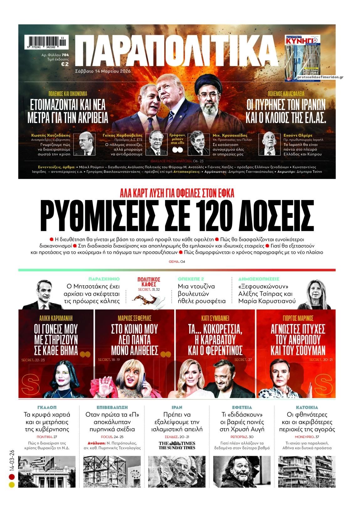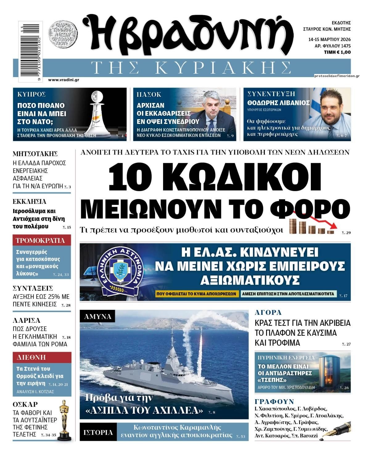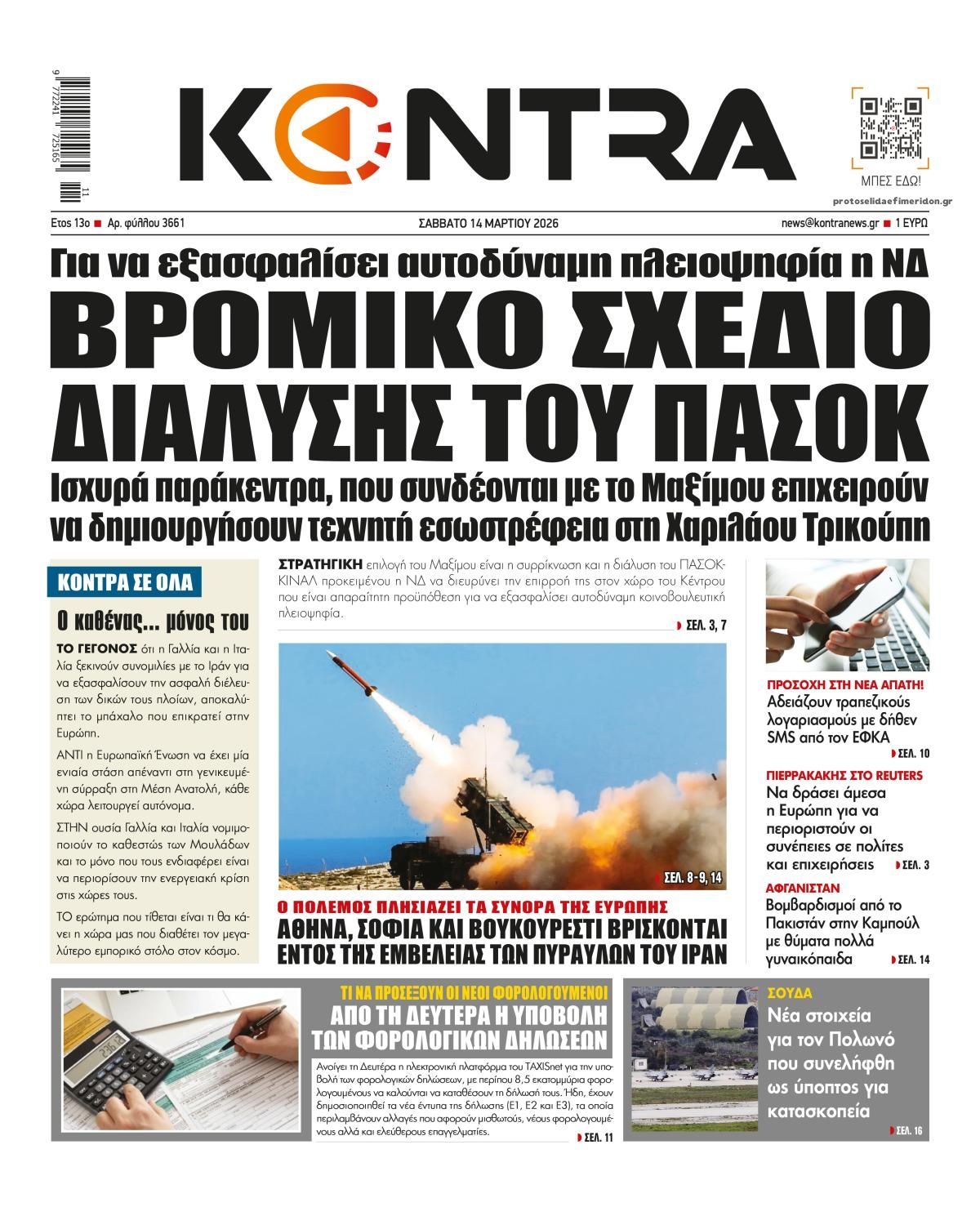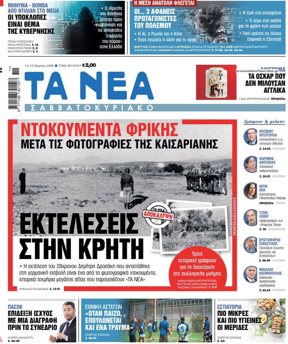 Οι πολιτικές εφημερίδες 14/3/2026 Enikos Newsroom 05:38, Σάββατο 14 Μαρτίου 2026 Media Διαβάστε τα πρωτοσέλιδα από τις πολιτικές εφημερίδες, σήμερα 14/3/2026. ΕΦΗΜΕΡΙΔΕΣ ΠΟΛΙΤΙΚΕΣ ΕΦΗΜΕΡΙΔΕΣ ΠΡΩΤΟΣΕΛΙΔΑ Μοιράσου το: Ντόναλντ Τραμπ: Οι στόχοι των ΗΠΑ και του Ισραήλ στο Ιράν «μπορεί να είναι λίγο διαφορετικοί» – Ο πόλεμος «θα διαρκέσει όσο είναι απαραίτητο» Ντοναλντ Τραμπ: Επίθεση των ΗΠΑ σε στρατιωτικούς στόχους στο νησί Χαργκ του Ιράν, ενώ εξετάζει χτύπημα και στις πετρελαϊκές υποδομές του – Δείτε βίντεο της επίθεσης Το Ιράν απειλεί με αντίποινα σε πετρελαϊκές υποδομές στην περιοχή μετά τον βομβαρδισμό των ΗΠΑ στη νήσο Χαργκ σχολίασε κι εσύ (0 σχόλια) Ακολουθήστε το enikos.gr στο Google News και μάθετε πρώτοι όλες τις ειδήσεις Δείτε όλες τις τελευταίες ειδήσεις από την Ελλάδα και τον Κόσμο στο enikos.gr Ειδήσεις Ροή Ειδήσεων 24 ώρες πριν LIVE – 14η ημέρα πολέμου ΗΠΑ – Ισραήλ με Ιράν – Οι εξελίξεις 8 ώρες πριν Δολοφονία στη Θεσσαλονίκη: Το Σάββατο στον εισαγγελέα ο 23χρονος δράστης, αναζητούνται οι 2 φίλοι του θύματος – Γρίφος τα κίνητρα της συμπλοκής 8 ώρες πριν Μέση Ανατολή: Η απουσία σχεδίου για τον πόλεμο στο Ιράν έχει προκαλέσει χάος και μπορεί να δεσμεύσει τις ΗΠΑ για δεκαετίες 8 ώρες πριν Τραμπ: Με την αναστολή των κυρώσεων στη Ρωσία πρόσθεσε και μια πολιτική νίκη στα κέρδη του Πούτιν από τον πόλεμο στο Ιράν 10 ώρες πριν Τραγωδία στον Πύργο: Θρήνος για τον 18χρονο που σκοτώθηκε πέφτοντας από μπαλκόνι – Η σπαρακτική ανάρτηση του πατέρα του 46 λεπτά πριν Οπτική ψευδαίσθηση: Μόνο το 1% των ανθρώπων θα βρει το φίδι σε 13 δευτερόλεπτα 1 ώρα πριν Υπερ-επεξεργασμένα τρόφιμα: Μελέτη συνδέει την αυξημένη κατανάλωσή τους με επιβαρυμένη υγεία των οστών 4 ώρες πριν Ζώδια 14/3: Ημερήσιες προβλέψεις – Ιχθύες, γίνεται ένα ξεκαθάρισμα στις ζωές σας για να μπουν νέοι φίλοι 9 ώρες πριν Ύπνος: Το αρχαίο βότανο που βοηθά στην αντιμετώπιση του άγχους και της αϋπνίας 10 λεπτά πριν Axios: To Ισραήλ προετοιμάζει μαζική χερσαία επιχείρηση στον Λίβανο κατά της Χεζμπολάχ 25 λεπτά πριν ΔΕΔΔΗΕ: Διακοπές ρεύματος σήμερα (14/3) στην Αθήνα και σε άλλες 6 περιοχές της Αττικής 46 λεπτά πριν Οπτική ψευδαίσθηση: Μόνο το 1% των ανθρώπων θα βρει το φίδι σε 13 δευτερόλεπτα 51 λεπτά πριν Ιράκ: Χτυπήθηκε από drone η πρεσβεία των ΗΠΑ στη Βαγδάτη, υψώνεται μαύρος καπνός 1 ώρα πριν Υπερ-επεξεργασμένα τρόφιμα: Μελέτη συνδέει την αυξημένη κατανάλωσή τους με επιβαρυμένη υγεία των οστών ENIKOS NETWORK Ο κανόνας των δύο ερωτήσεων που μπορεί να σας εξοικονομήσει άμεσα χρήματα Η τροφή – απρόσμενη ανακάλυψη των νομάδων που είναι πλούσια σε πρωτεΐνη και μπορεί να ενισχύσει το μικροβίωμα του εντέρου Οικονομικό Επιμελητήριο Ελλάδος: 5 προτάσεις και μεταβατικός χρόνος για την επίλυση των προβλημάτων σε ΕΡΓΑΝΗ ΙΙ και ΑΡΙΑΔΝ... ΥΠΕΝ: Παρατάσεις στις προθεσμίες ολοκλήρωσης ενεργειακών προγραμμάτων του Ταμείου Ανάκαμψης Ευπάθεια στο moltbook ai αποκαλύπτει email, tokens σύνδεσης και api keys Αυτός είναι ο ρόλος της μικρής τρύπας στους νυχοκόπτες – «Είμαι ο μόνος που δεν το ήξερε;»» περισσότερα 05:43 , Σάββατο 14 Μαρτίου 2026 Οι αθλητικές εφημερίδες 14/3/2026 Διαβάστε τα πρωτοσέλιδα από τις αθλητικές εφημερίδες, σήμερα 14/3/2026. 21:29 , Παρασκευή 13 Μαρτίου 2026 Το Σπίτι Δίπλα Στο Ποτάμι: H Νίτσα κάνει μία συγκλονιστική αποκάλυψη στη Μελισσάνθη, απόψε στις 22:00 Νέες εξελίξεις για τις τέσσερις αδερφές έρχονται στο νέο επεισόδιο της σειράς “Το σπίτι ... 20:27 , Παρασκευή 13 Μαρτίου 2026 Μπαμπά, σ’ αγ