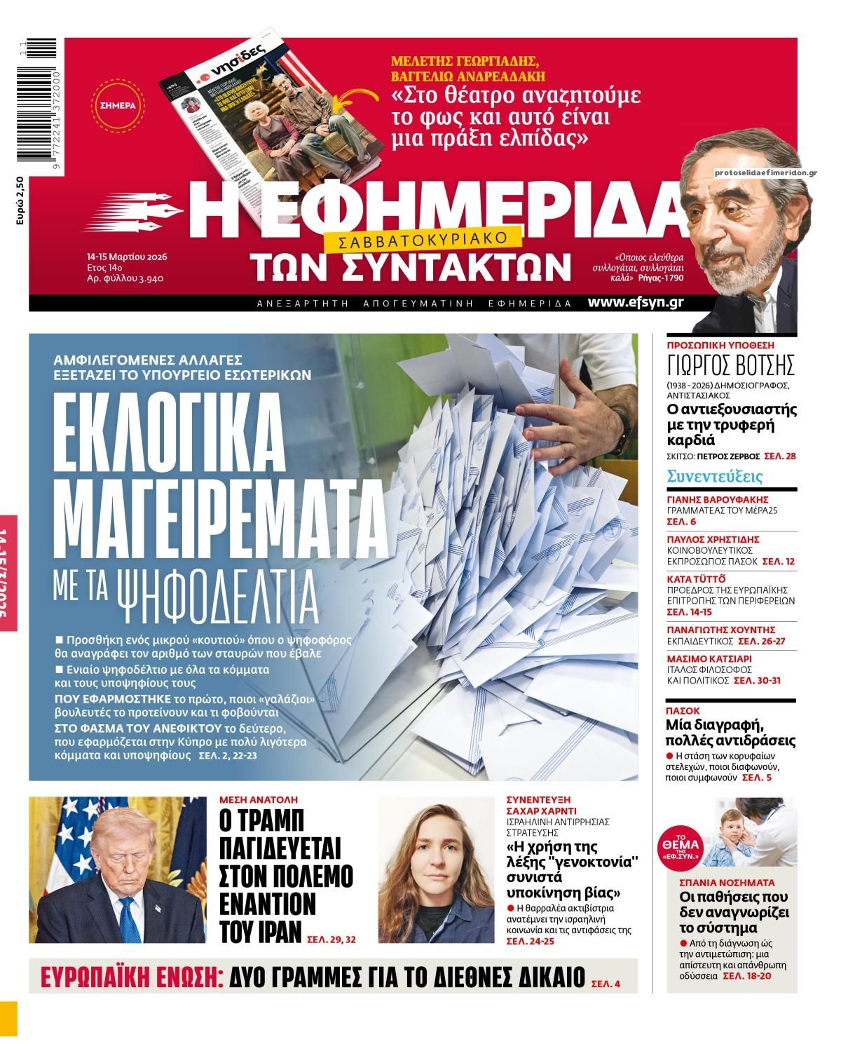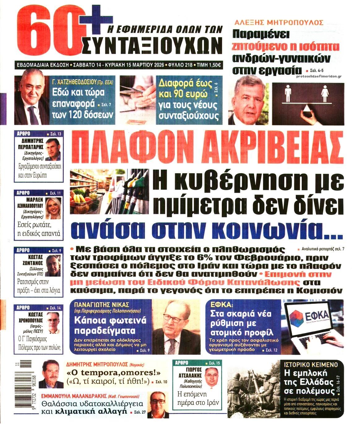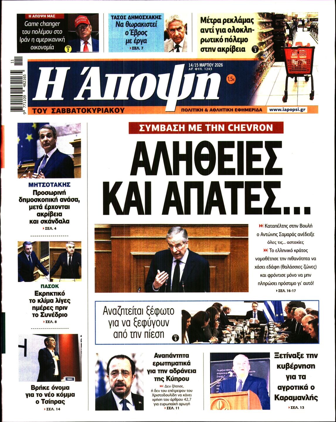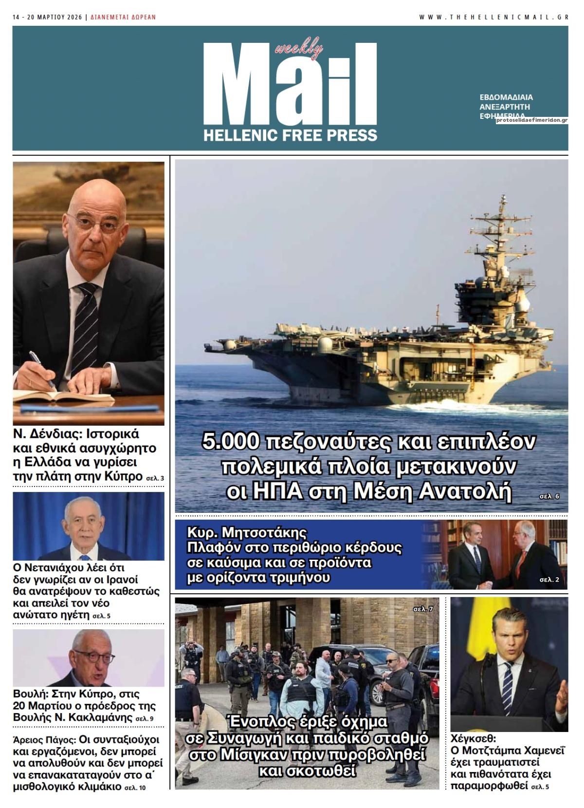 Οι πολιτικές εφημερίδες 14/3/2026 Enikos Newsroom 05:38, Σάββατο 14 Μαρτίου 2026 Media Διαβάστε τα πρωτοσέλιδα από τις πολιτικές εφημερίδες, σήμερα 14/3/2026. ΕΦΗΜΕΡΙΔΕΣ ΠΟΛΙΤΙΚΕΣ ΕΦΗΜΕΡΙΔΕΣ ΠΡΩΤΟΣΕΛΙΔΑ Μοιράσου το: Ντόναλντ Τραμπ: Οι στόχοι των ΗΠΑ και του Ισραήλ στο Ιράν «μπορεί να είναι λίγο διαφορετικοί» – Ο πόλεμος «θα διαρκέσει όσο είναι απαραίτητο» Ντοναλντ Τραμπ: Επίθεση των ΗΠΑ σε στρατιωτικούς στόχους στο νησί Χαργκ του Ιράν, ενώ εξετάζει χτύπημα και στις πετρελαϊκές υποδομές του – Δείτε βίντεο της επίθεσης Το Ιράν απειλεί με αντίποινα σε πετρελαϊκές υποδομές στην περιοχή μετά τον βομβαρδισμό των ΗΠΑ στη νήσο Χαργκ σχολίασε κι εσύ (0 σχόλια) Ακολουθήστε το enikos.gr στο Google News και μάθετε πρώτοι όλες τις ειδήσεις Δείτε όλες τις τελευταίες ειδήσεις από την Ελλάδα και τον Κόσμο στο enikos.gr Ειδήσεις Ροή Ειδήσεων 24 ώρες πριν LIVE – 14η ημέρα πολέμου ΗΠΑ – Ισραήλ με Ιράν – Οι εξελίξεις 8 ώρες πριν Δολοφονία στη Θεσσαλονίκη: Το Σάββατο στον εισαγγελέα ο 23χρονος δράστης, αναζητούνται οι 2 φίλοι του θύματος – Γρίφος τα κίνητρα της συμπλοκής 8 ώρες πριν Μέση Ανατολή: Η απουσία σχεδίου για τον πόλεμο στο Ιράν έχει προκαλέσει χάος και μπορεί να δεσμεύσει τις ΗΠΑ για δεκαετίες 8 ώρες πριν Τραμπ: Με την αναστολή των κυρώσεων στη Ρωσία πρόσθεσε και μια πολιτική νίκη στα κέρδη του Πούτιν από τον πόλεμο στο Ιράν 10 ώρες πριν Τραγωδία στον Πύργο: Θρήνος για τον 18χρονο που σκοτώθηκε πέφτοντας από μπαλκόνι – Η σπαρακτική ανάρτηση του πατέρα του 46 λεπτά πριν Οπτική ψευδαίσθηση: Μόνο το 1% των ανθρώπων θα βρει το φίδι σε 13 δευτερόλεπτα 1 ώρα πριν Υπερ-επεξεργασμένα τρόφιμα: Μελέτη συνδέει την αυξημένη κατανάλωσή τους με επιβαρυμένη υγεία των οστών 4 ώρες πριν Ζώδια 14/3: Ημερήσιες προβλέψεις – Ιχθύες, γίνεται ένα ξεκαθάρισμα στις ζωές σας για να μπουν νέοι φίλοι 9 ώρες πριν Ύπνος: Το αρχαίο βότανο που βοηθά στην αντιμετώπιση του άγχους και της αϋπνίας 10 λεπτά πριν Axios: To Ισραήλ προετοιμάζει μαζική χερσαία επιχείρηση στον Λίβανο κατά της Χεζμπολάχ 25 λεπτά πριν ΔΕΔΔΗΕ: Διακοπές ρεύματος σήμερα (14/3) στην Αθήνα και σε άλλες 6 περιοχές της Αττικής 46 λεπτά πριν Οπτική ψευδαίσθηση: Μόνο το 1% των ανθρώπων θα βρει το φίδι σε 13 δευτερόλεπτα 51 λεπτά πριν Ιράκ: Χτυπήθηκε από drone η πρεσβεία των ΗΠΑ στη Βαγδάτη, υψώνεται μαύρος καπνός 1 ώρα πριν Υπερ-επεξεργασμένα τρόφιμα: Μελέτη συνδέει την αυξημένη κατανάλωσή τους με επιβαρυμένη υγεία των οστών ENIKOS NETWORK Ο κανόνας των δύο ερωτήσεων που μπορεί να σας εξοικονομήσει άμεσα χρήματα Η τροφή – απρόσμενη ανακάλυψη των νομάδων που είναι πλούσια σε πρωτεΐνη και μπορεί να ενισχύσει το μικροβίωμα του εντέρου Οικονομικό Επιμελητήριο Ελλάδος: 5 προτάσεις και μεταβατικός χρόνος για την επίλυση των προβλημάτων σε ΕΡΓΑΝΗ ΙΙ και ΑΡΙΑΔΝ... ΥΠΕΝ: Παρατάσεις στις προθεσμίες ολοκλήρωσης ενεργειακών προγραμμάτων του Ταμείου Ανάκαμψης Ευπάθεια στο moltbook ai αποκαλύπτει email, tokens σύνδεσης και api keys Αυτός είναι ο ρόλος της μικρής τρύπας στους νυχοκόπτες – «Είμαι ο μόνος που δεν το ήξερε;»» περισσότερα 05:43 , Σάββατο 14 Μαρτίου 2026 Οι αθλητικές εφημερίδες 14/3/2026 Διαβάστε τα πρωτοσέλιδα από τις αθλητικές εφημερίδες, σήμερα 14/3/2026. 21:29 , Παρασκευή 13 Μαρτίου 2026 Το Σπίτι Δίπλα Στο Ποτάμι: H Νίτσα κάνει μία συγκλονιστική αποκάλυψη στη Μελισσάνθη, απόψε στις 22:00 Νέες εξελίξεις για τις τέσσερις αδερφές έρχονται στο νέο επεισόδιο της σειράς “Το σπίτι ... 20:27 , Παρασκευή 13 Μαρτίου 2026 Μπαμπά, σ’ αγ