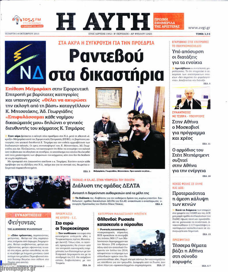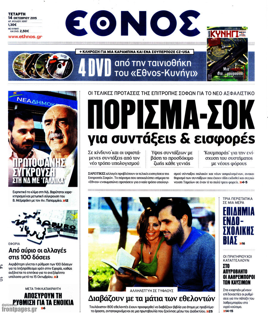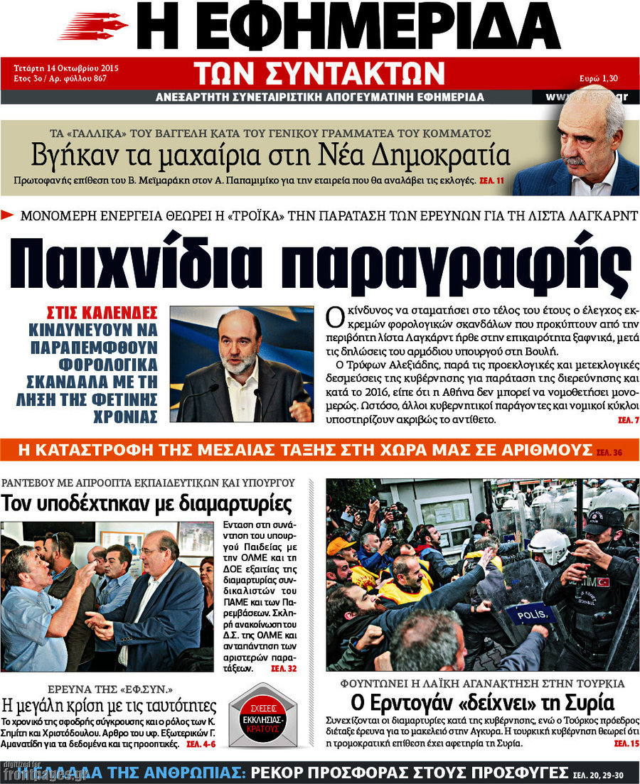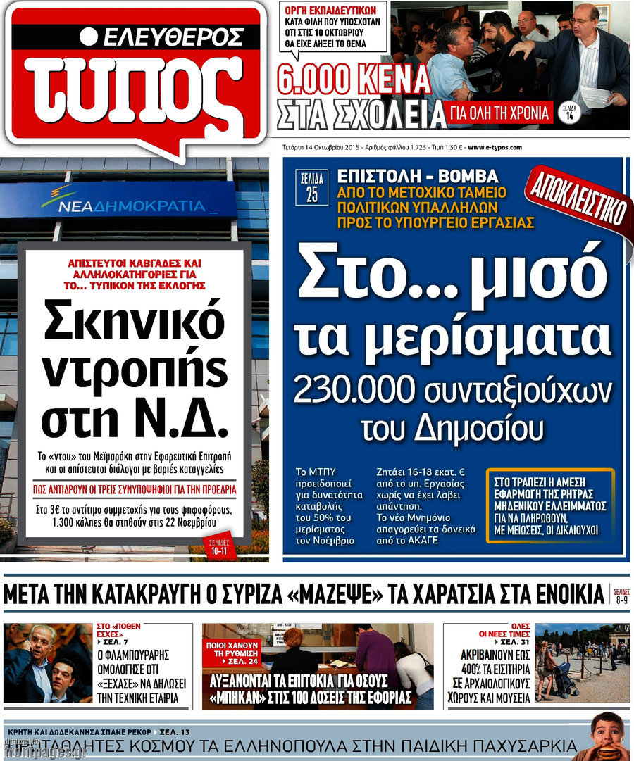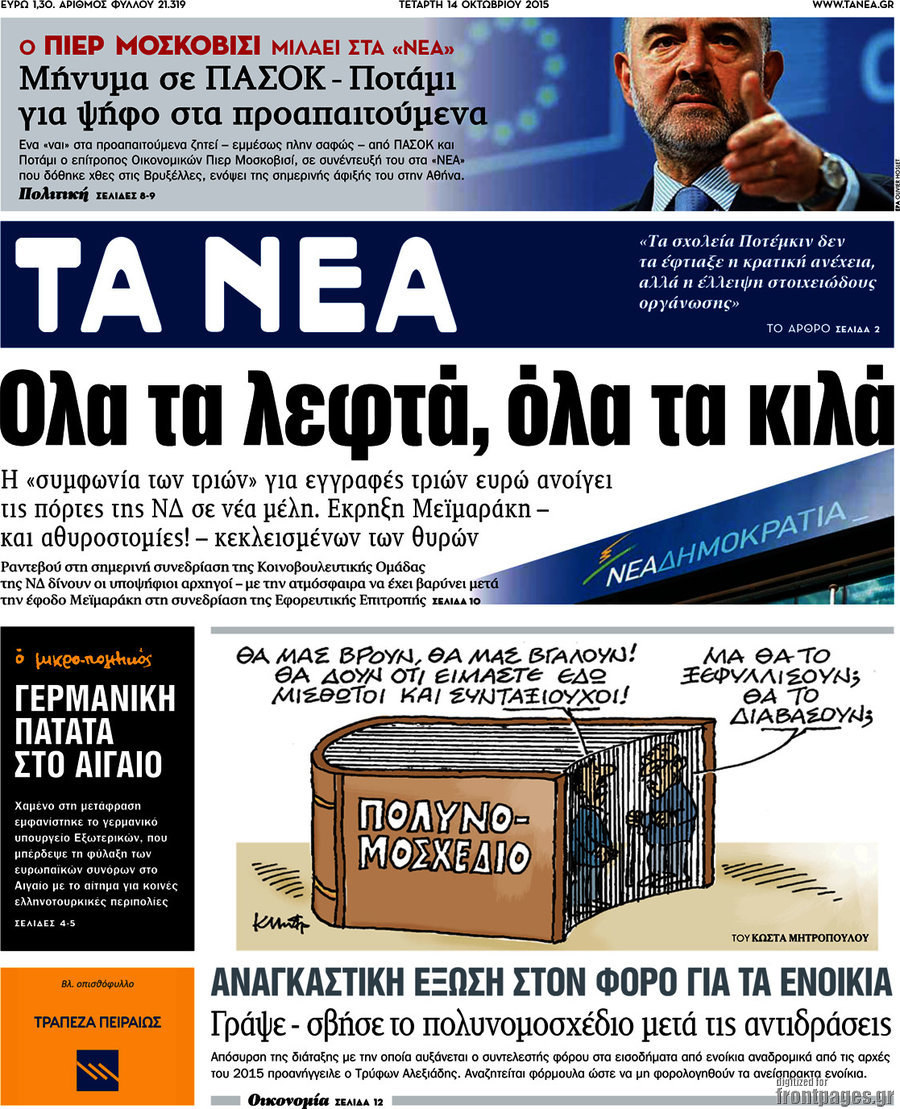 Οι πολιτικές εφημερίδες 14/10/2015 Enikos Newsroom 07:57, Τετάρτη 14 Οκτωβρίου 2015 Media Διαβάστε τα σημερινά πρωτοσέλιδα των πολιτικών εφημερίδων: ΠΟΛΙΤΙΚΕΣ ΕΦΗΜΕΡΙΔΕΣ ΠΡΩΤΟΣΕΛΙΔΑ Μοιράσου το: σχολίασε κι εσύ (0 σχόλια) Ακολουθήστε το enikos.gr στο Google News και μάθετε πρώτοι όλες τις ειδήσεις Δείτε όλες τις τελευταίες ειδήσεις από την Ελλάδα και τον Κόσμο στο enikos.gr Ειδήσεις Ροή Ειδήσεων 4 ώρες πριν Υπόθεση Έπσταϊν: Το Υπουργείο Δικαιοσύνης δημοσιοποίησε μια σειρά από εξαιρετικά επεξεργασμένα αρχεία – «Λείπουν τα πιο σημαντικά έγγραφα», λένε οι Δημοκρατικοί 47 λεπτά πριν Γιορτές με μπλόκα για τους αγρότες: Ανοίγουν διόδια και μοιράζουν προϊόντα στους ταξιδιώτες 1 ώρα πριν Εξαφάνιση 33χρονου γιατρού στην Κρήτη: «Άναψα τα φώτα, τρόμαξε και άρχισε να τρέχει στα χωράφια» – Η τελευταία διαδρομή και η μαρτυρία «κλειδί» 3 ώρες πριν Ο «χάρτης» με τις αυξήσεις και τις φοροελαφρύνσεις του 2026 – Ποιοι και πόσα κερδίζουν 1 ώρα πριν Τα αρχεία του Έπσταϊν αποκαλύπτουν φωτογραφία του έκπτωτου πρίγκιπα Άντριου – Είναι ξαπλωμένος στην αγκαλιά 5 γυναικών 1 ώρα πριν Μία νέα «χρυσή» περίοδος αρχίζει για 3 ζώδια από σήμερα – «Μία αναπάντεχη ευκαιρία οδηγεί στην επιτυχία» 5 ώρες πριν Αυγά: Πόσα μπορείτε να τρώτε την ημέρα με ασφάλεια για μέγιστη πρόσληψη πρωτεΐνης 3 ώρες πριν Αρχαιολόγοι ανακάλυψαν σε χωράφι απεικόνιση 600 ετών ενός Αγίου – Τα στοιχεία που δείχνουν ότι μαρτύρησε 2 ώρες πριν Αγχώνεται για το χριστουγεννιάτικο δώρο που πήρε στην πλούσια σύντροφό του – «Φοβάμαι πως θα το βρει φθηνιάρικο, φοράει βραχιόλια Cartier» 5 λεπτά πριν Τα Labubu «μετακομίζουν» στο Χόλιγουντ: Η Sony Pictures ετοιμάζει live-action ταινία με τον σκηνοθέτη του «Wonka» 12 λεπτά πριν Νέες ταυτότητες: Μεγάλη αναμονή για ραντεβού στην Αττική – Τέλος τα ταξίδια εκτός Ελλάδος από τον Αύγουστο για όσους δεν έχουν αλλάξει 21 λεπτά πριν Οι 7 φράσεις που δεν λένε ποτέ οι συναισθηματικά έξυπνοι άνθρωποι κατά τη διάρκεια ενός καβγά 24 λεπτά πριν Τηλεθέαση (19/12): Ανατροπές και πρωτιές στην πρωινή ζώνη 32 λεπτά πριν Πώς η κλιματική αλλαγή επηρεάζει εγκύους και βρέφη – Οι επιπτώσεις των υψηλών θερμοκρασιών ENIKOS NETWORK Είστε μόνιμα απρόσεκτοι; 3 σημάδια που δείχνουν ότι μπορεί να είναι σύμπτωμα πάθησης Πόσα κιλά παίρνουμε πραγματικά τα Χριστούγεννα, σύμφωνα με την επιστήμη – Πώς να το αποτρέψουμε; e-ΕΦΚΑ και ΔΥΠΑ: Έρχονται νέες πληρωμές έως τις 24 Δεκεμβρίου – Ποιοι πάνε ταμείο Επίδομα παιδιού: Τι αλλάζει από το 2026 – Το όφελος από τις φορολογικές ελαφρύνσεις Χαρτογραφώντας το «σημείο χωρίς επιστροφή»: Για πρώτη φορά αποκαλύπτεται με λεπτομέρεια το ακανθώδες όριο της ατμόσφαιρας τ... Η Google καταργεί τη λειτουργία «dark web report» – Πώς θα μπορούν οι χρήστες να διαγράφουν τα δεδομένα τους περισσότερα 09:30 , Σάββατο 20 Δεκεμβρίου 2025 «Porto Leone: Στη γειτονιά με τα κόκκινα φανάρια» – Ο Χρόνης αποκαλύπτει στην Αλεξάνδρα το μυστικό για το παιδί της Λένας Η μεγάλη δραματική σειρά του Apha «Porto Leone: Στη γειτονιά με τα κόκκινα φανάρια» μας μεταφέ... 08:14 , Σάββατο 20 Δεκεμβρίου 2025 Τρομεροί γονείς: Η Μαρία Καβογιάννη εισβάλλει στο σπίτι της οικογένειας Στεφανίδη Όσα θα δούμε στο νέο διπλό επεισόδιο της σειράς «Τρομεροί γονείς», σήμερα Σάββατο 20 Δεκεμβρίο... 05:48 , Σάββατο 20 Δεκεμβρίου 2025 Οι οικονομικές εφημερίδες 20/12/2025 Διαβάστε τα πρωτοσέλιδα από τις οικονομικές εφημερίδες, σήμερα 20/12/2025. 05:43 , Σάββατο 20 Δεκεμβρίου 2025 Οι αθλητικές εφημερίδες 20/12/2025 Διαβάστε τα πρωτοσέλιδα α