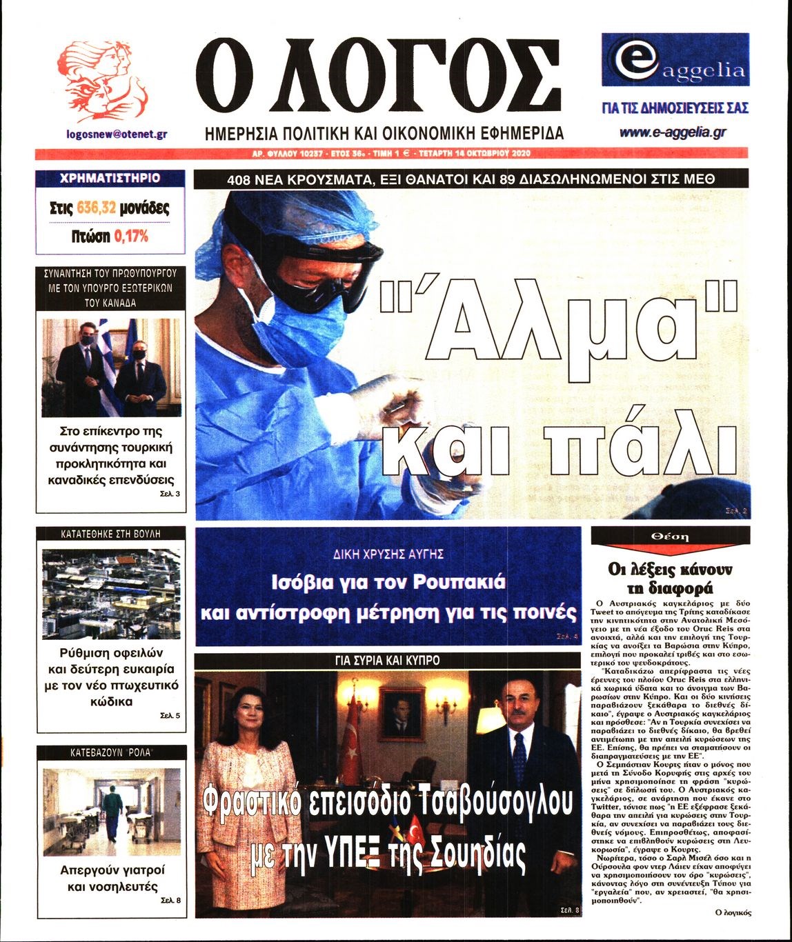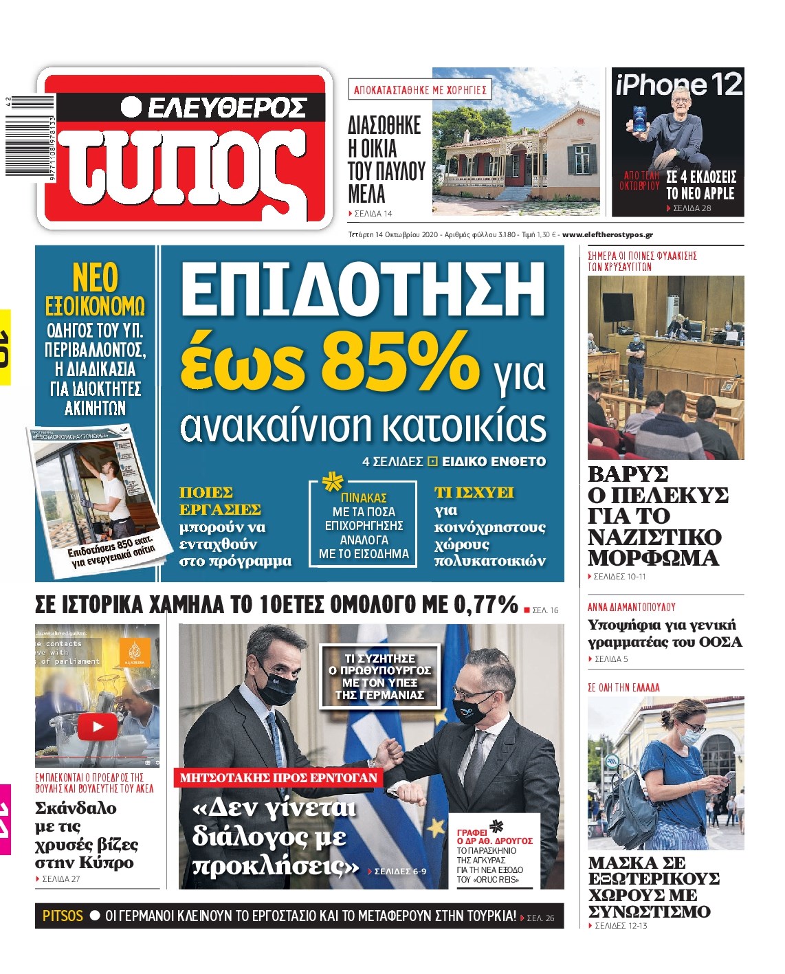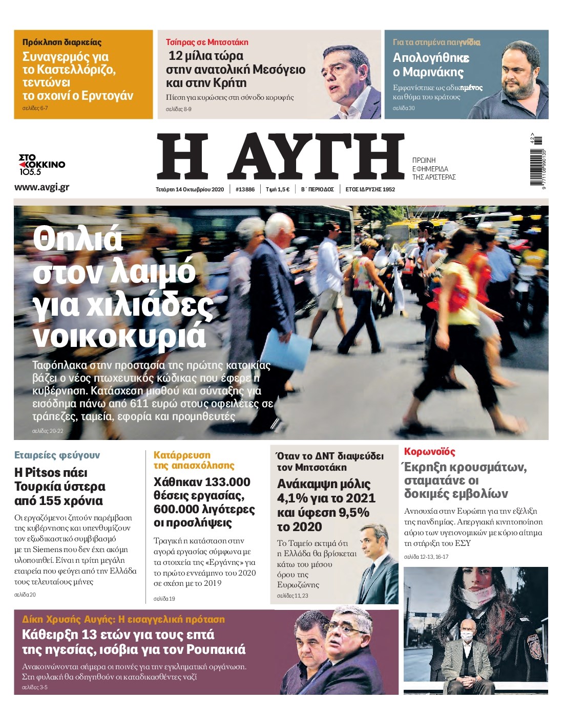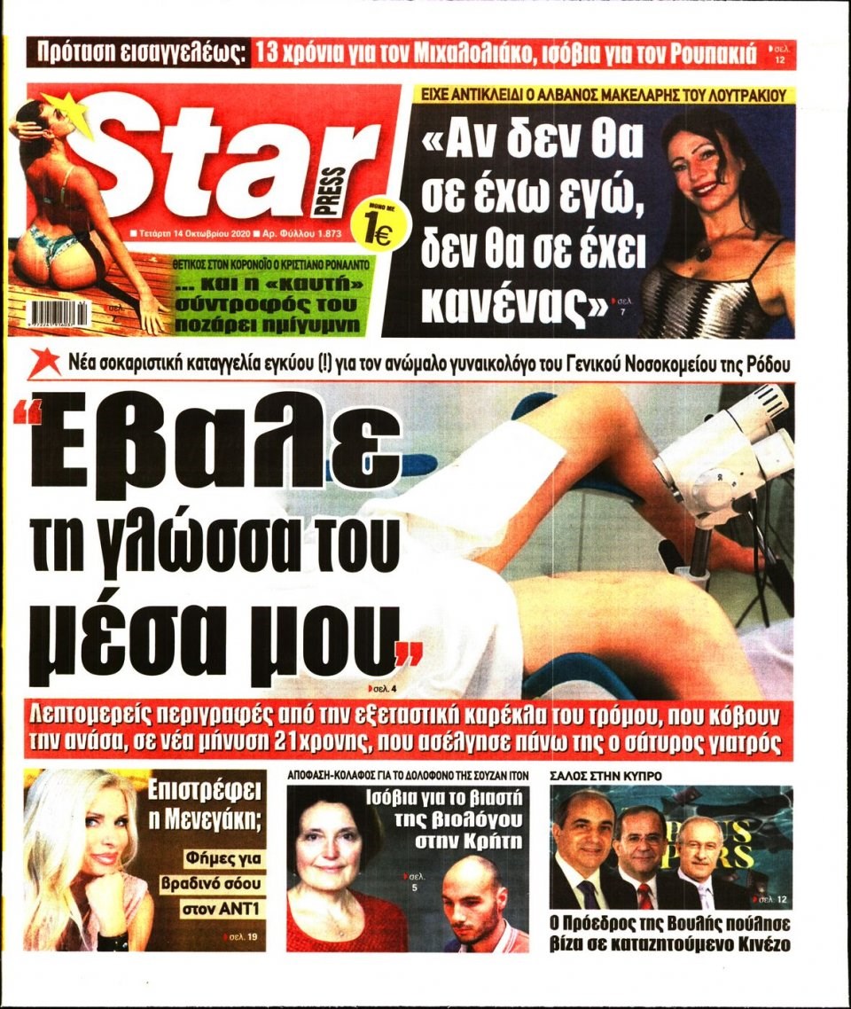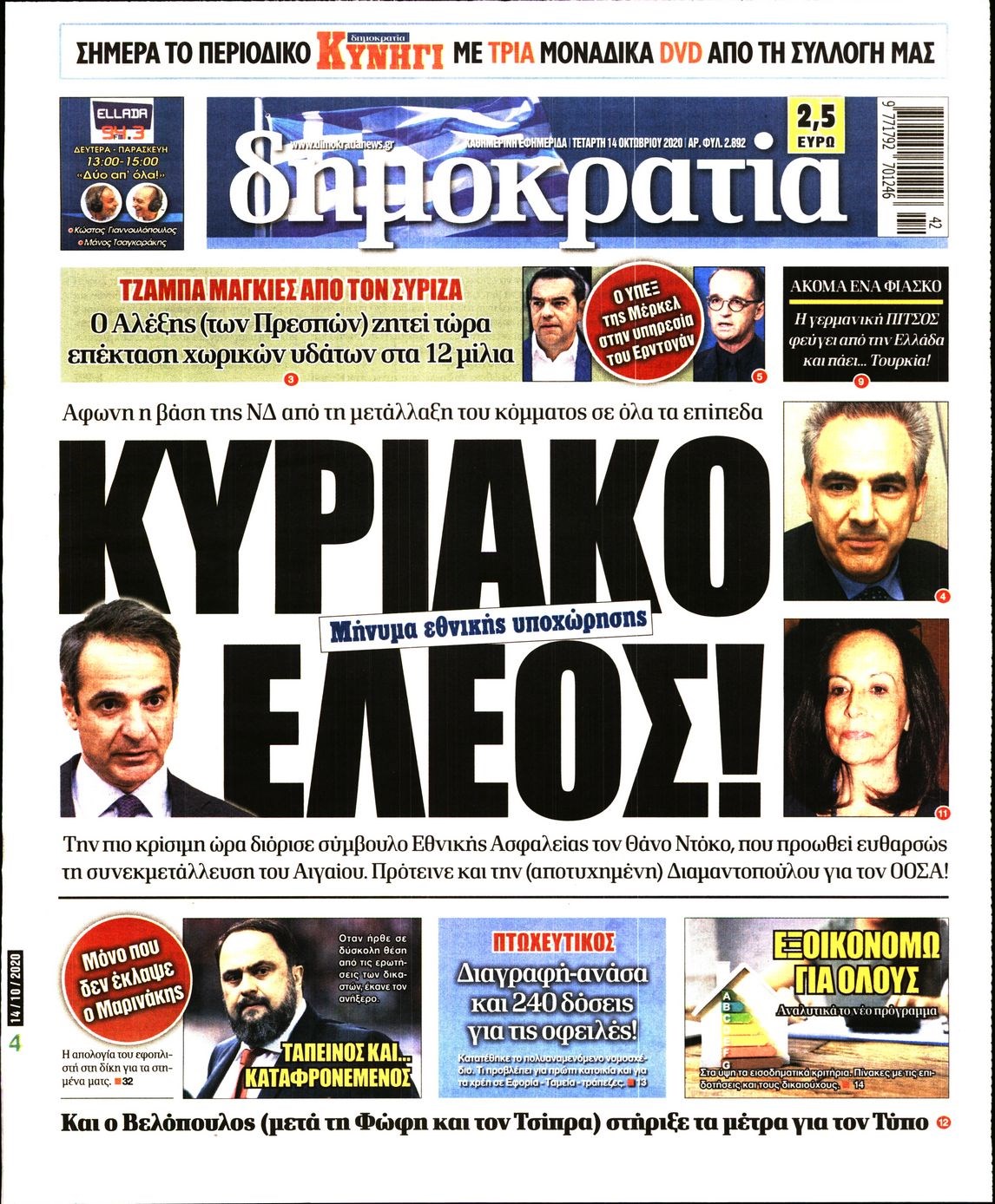 Οι πολιτικές εφημερίδες 14/10/2020 Διονύσης Νίκκας 06:09, Τετάρτη 14 Οκτωβρίου 2020 Media Διαβάστε τα πρωτοσέλιδα των πολιτικών εφημερίδων… ΠΟΛΙΤΙΚΕΣ ΕΦΗΜΕΡΙΔΕΣ ΠΡΩΤΟΣΕΛΙΔΑ Μοιράσου το: σχολίασε κι εσύ (0 σχόλια) Ακολουθήστε το enikos.gr στο Google News και μάθετε πρώτοι όλες τις ειδήσεις Δείτε όλες τις τελευταίες ειδήσεις από την Ελλάδα και τον Κόσμο στο enikos.gr Ειδήσεις Ροή Ειδήσεων 2 ώρες πριν Χριστούγεννα στα μπλόκα: Επιμένουν στις κινητοποιήσεις τους οι αγρότες – Ανοίγουν τα διόδια το Σαββατοκύριακο 2 ώρες πριν Ουκρανία: Η άνευ προηγουμένου επίθεση σε ρωσικό τάνκερ στη Μεσόγειο και το μήνυμα προς στον Πούτιν – Το «μακρύ χέρι» του Κιέβου 2 ώρες πριν Πούτιν: Τα μηνύματα σε Ευρώπη και ΝΑΤΟ από το μαραθώνιο «σόου» του – Η απαίτηση για «σεβασμό» και η ειρήνη «με τους όρους» της Μόσχας 3 ώρες πριν Τραμπ: Δεν αποκλείει την πιθανότητα ενός πολέμου στη Βενεζουέλα – «Ο Μαδούρο ξέρει καλύτερα από τον καθένα τι ακριβώς θέλω» 3 ώρες πριν Συνεχίζει να προκαλεί ο Μίτσκοσκι: «Για μένα το όνομα Μακεδονία είναι ιερό» 2 ώρες πριν Ανακαλύφθηκαν αρχαία χρυσά νομίσματα 2.200 ετών που απεικονίζουν τον θεό Απόλλωνα – Η άγνωστη σύνδεση με τον Φίλιππο Β΄ της Μακεδονίας 3 ώρες πριν Ύπνος: Μια κρυφή κατάσταση του εγκεφάλου πριν από τον ύπνο μπορεί να είναι το “κλειδί” για υψηλή ευφυΐα και δημιουργικότητα 4 ώρες πριν Αριθμολογία: Οι άνθρωποι που έχουν γεννηθεί αυτές τις 4 ημερομηνίες, συχνά παρεξηγούνται – «Η καλοσύνη τους κρύβει τεράστια δύναμη» 5 ώρες πριν Ξεχάστε το καθάρισμα το Σαββατοκύριακο: Ο «κανόνας των 20 λεπτών» που θα σας λύσει τα χέρια 15 λεπτά πριν Φαίη Σκορδά: «Παλιότερα τα κομπλιμέντα τα προσπερνούσα, τώρα τα έχω ανάγκη» 31 λεπτά πριν Βασίλης Σπανούλης: Δεν εμφανίστηκε ούτε ένας δημοσιογράφος στην συνέντευξη Τύπου – «Καλησπέρα στον… κανέναν», δείτε βίντεο 42 λεπτά πριν Πόλεμος στην Ουκρανία: Εφτά νεκροί από ρωσική πυραυλική επίθεση στο λιμάνι της Οδησσού 45 λεπτά πριν ΗΠΑ: Η κυβέρνηση του Ντόναλντ Τραμπ άρχισε να δημοσιοποιεί τα αρχεία Έπσταϊν 57 λεπτά πριν Σάμος: Άνοιξε το μπλόκο των αγροτών στον κόμβο Κοκκαρίου – Σε νέα συνεδρίαση θα καθορίσουν την στάση τους ENIKOS NETWORK Το ΕΚΑΒ τιμήθηκε από την Ακαδημία Αθηνών για τα 40 χρόνια προσφοράς του Έχετε πραγματικά μεγάλη καρδιά; 10 χαρακτηριστικά όσων έχουν καλοσύνη Αναστολή μέτρων αναγκαστικής εκτέλεσης για κτηνοτρόφους που πλήττονται από την ευλογιά των αιγοπροβάτων Πλήρης επάρκεια προϊόντων στις λαϊκές της Αττικής, παρά τις αγροτικές κινητοποιήσεις – Τι απαντούν οι πωλητές Χαρτογραφώντας το «σημείο χωρίς επιστροφή»: Για πρώτη φορά αποκαλύπτεται με λεπτομέρεια το ακανθώδες όριο της ατμόσφαιρας τ... Η Google καταργεί τη λειτουργία «dark web report» – Πώς θα μπορούν οι χρήστες να διαγράφουν τα δεδομένα τους περισσότερα 22:42 , Παρασκευή 19 Δεκεμβρίου 2025 Γιώργος Γιαννόπουλος για “Το σόι σου”: “Είναι ευτυχία και ευλογία αυτή η σειρά” «Είναι ευτυχία και ευλογία η συγκυρία αυτής της σειράς», θα πει ο Γιώργος Γιαννόπουλος -ο αγαπ... 20:37 , Παρασκευή 19 Δεκεμβρίου 2025 Don’t Forget The Lyrics: Η Έλλη Κοκκίνου υποδέχεται 4 παίκτες που θα κάνουν τα πάντα για να μη χάσουν ούτε… μισή λέξη από τους στίχους Το «Don’t Forget The Lyrics» επιστρέφει απόψε, Παρασκευή 19 Δεκεμβρίου, στις 21:00 με νέο επει... 19:31 , Παρασκευή 19 Δεκεμβρίου 2025 GNTM: Απόψε ο μεγάλος τελικός για τους 4 φιναλίστ Έπειτα από μήνες γεμάτους μόδα, δημιουργία και έντονες αναμετρήσεις, το GNTM 2025 κορυφώνεται,... 18:11 , Πα