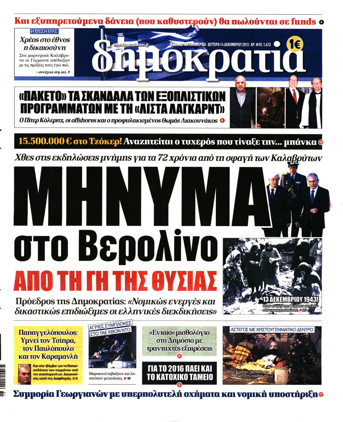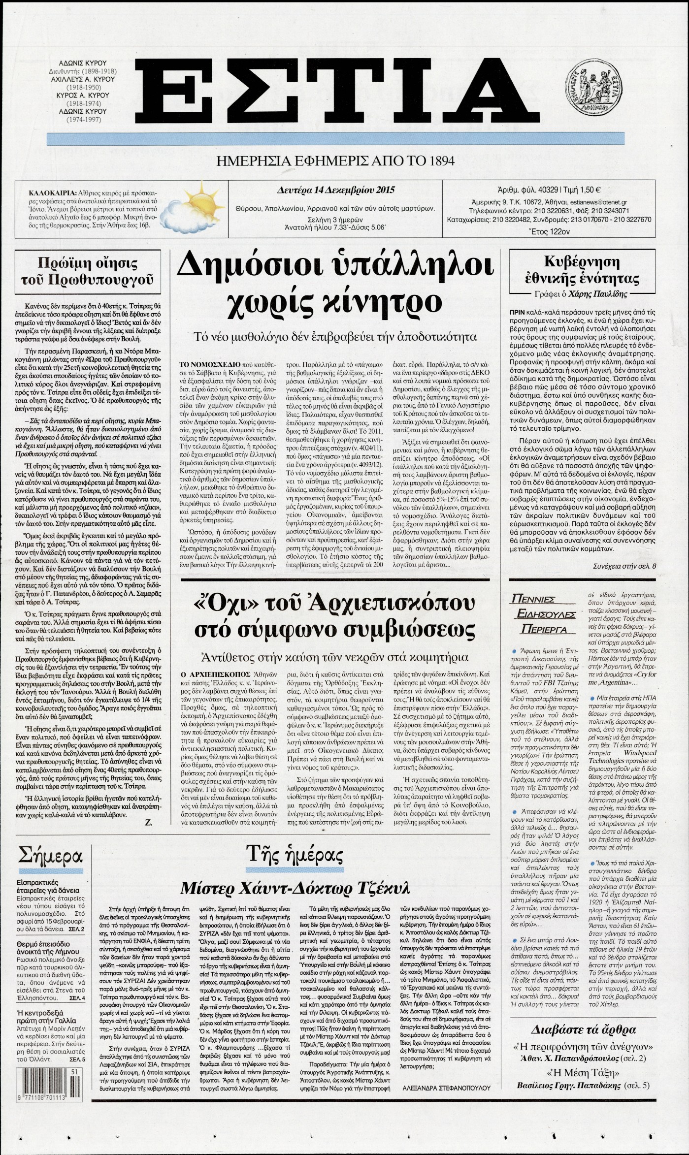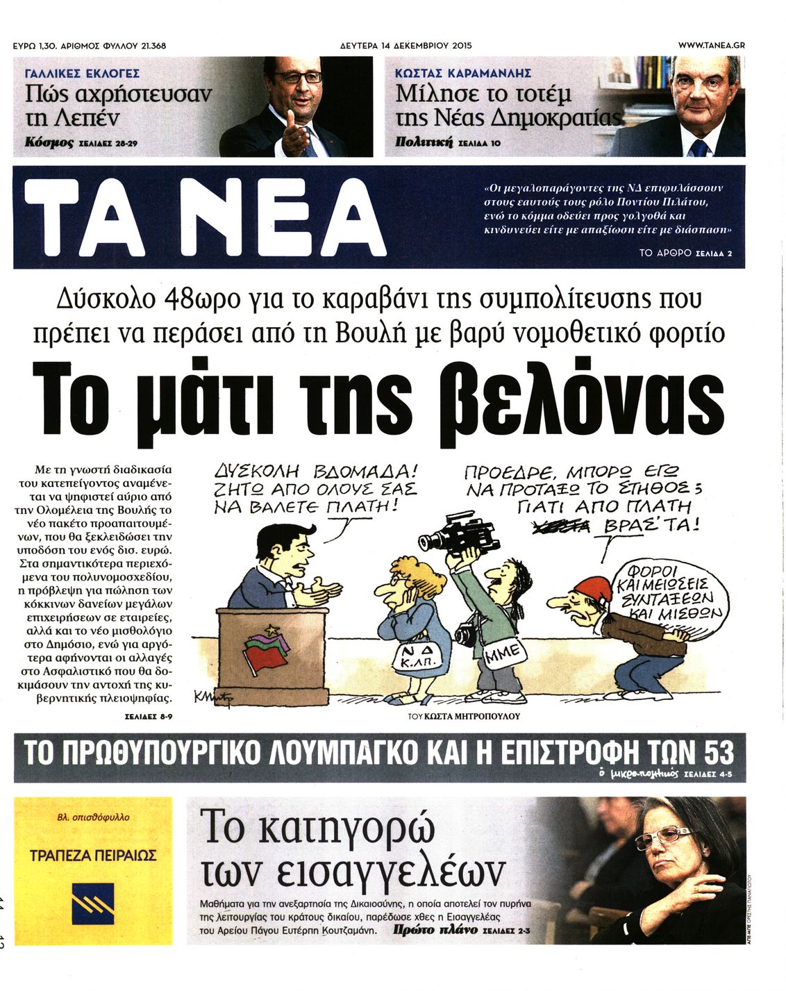 Οι πολιτικές εφημερίδες 14/12/2015 Enikos Newsroom 06:25, Δευτέρα 14 Δεκεμβρίου 2015 Media Διαβάστε τα σημερινά πρωτοσέλιδα των πολιτικών εφημερίδων: ΠΟΛΙΤΙΚΕΣ ΕΦΗΜΕΡΙΔΕΣ ΠΡΩΤΟΣΕΛΙΔΑ Μοιράσου το: σχολίασε κι εσύ (0 σχόλια) Ακολουθήστε το enikos.gr στο Google News και μάθετε πρώτοι όλες τις ειδήσεις Δείτε όλες τις τελευταίες ειδήσεις από την Ελλάδα και τον Κόσμο στο enikos.gr Ειδήσεις Ροή Ειδήσεων 2 ώρες πριν Υπόθεση Έπσταϊν: Το Υπουργείο Δικαιοσύνης δημοσιοποίησε μια σειρά από εξαιρετικά επεξεργασμένα αρχεία – «Λείπουν τα πιο σημαντικά έγγραφα», λένε οι Δημοκρατικοί 1 ώρα πριν Ο «χάρτης» με τις αυξήσεις και τις φοροελαφρύνσεις του 2026 – Ποιοι και πόσα κερδίζουν 11 ώρες πριν Χριστούγεννα στα μπλόκα: Επιμένουν στις κινητοποιήσεις τους οι αγρότες – Ανοίγουν τα διόδια το Σαββατοκύριακο 2 ώρες πριν ΟΝΕΧ – MEGATUGS: Ξεκίνησε η ναυπήγηση ρυμουλκών στην Ελλάδα – Προθάλαμος πολεμικών πλοίων – Δείτε φωτογραφίες και βίντεο 2 ώρες πριν Καιρός: Αλλαγή σκηνικού σήμερα με βροχές και πτώση της θερμοκρασίας – Οι προβλέψεις των μετεωρολόγων για τα Χριστούγεννα 4 ώρες πριν Αυγά: Πόσα μπορείτε να τρώτε την ημέρα με ασφάλεια για μέγιστη πρόσληψη πρωτεΐνης 3 ώρες πριν Οπτική ψευδαίσθηση: Μόνο αν είσαι ο Σέρλοκ Χολμς θα βρεις τον αριθμό «87» σε 7 δευτερόλεπτα 2 ώρες πριν Αρχαιολόγοι ανακάλυψαν σε χωράφι απεικόνιση 600 ετών ενός Αγίου – Τα στοιχεία που δείχνουν ότι μαρτύρησε 34 λεπτά πριν Αγχώνεται για το χριστουγεννιάτικο δώρο που πήρε στην πλούσια σύντροφό του – «Φοβάμαι πως θα το βρει φθηνιάρικο, φοράει βραχιόλια Cartier» 9 λεπτά πριν «Porto Leone: Στη γειτονιά με τα κόκκινα φανάρια» – Ο Χρόνης αποκαλύπτει στην Αλεξάνδρα το μυστικό για το παιδί της Λένας 17 λεπτά πριν Νέες αιτήσεις για ίδρυση μη κρατικών πανεπιστημίων στο πρώτο δίμηνο του 2026 – Τι είπε η Ζαχαράκη 25 λεπτά πριν Ουκρανία: Drones έπληξαν εξέδρα πετρελαίου και πολεμικό πλοίο της Ρωσίας στην Κασπία 34 λεπτά πριν Παιδική υπέρταση: Μια σιωπηλή απειλή που αυξάνεται διεθνώς 34 λεπτά πριν Αγχώνεται για το χριστουγεννιάτικο δώρο που πήρε στην πλούσια σύντροφό του – «Φοβάμαι πως θα το βρει φθηνιάρικο, φοράει βραχιόλια Cartier» ENIKOS NETWORK Πόσα κιλά παίρνουμε πραγματικά τα Χριστούγεννα, σύμφωνα με την επιστήμη – Πώς να το αποτρέψουμε; Το δημοφιλές ρόφημα που αυξάνει την πίεση πιο γρήγορα και από το αλάτι Mega χριστουγεννιάτικη φορολοταρία: «Κλείδωσε» η ημερομηνία για την κλήρωση – Ερωτήσεις και απαντήσεις Αναστολή μέτρων αναγκαστικής εκτέλεσης για κτηνοτρόφους που πλήττονται από την ευλογιά των αιγοπροβάτων Χαρτογραφώντας το «σημείο χωρίς επιστροφή»: Για πρώτη φορά αποκαλύπτεται με λεπτομέρεια το ακανθώδες όριο της ατμόσφαιρας τ... Η Google καταργεί τη λειτουργία «dark web report» – Πώς θα μπορούν οι χρήστες να διαγράφουν τα δεδομένα τους περισσότερα 09:30 , Σάββατο 20 Δεκεμβρίου 2025 «Porto Leone: Στη γειτονιά με τα κόκκινα φανάρια» – Ο Χρόνης αποκαλύπτει στην Αλεξάνδρα το μυστικό για το παιδί της Λένας Η μεγάλη δραματική σειρά του Apha «Porto Leone: Στη γειτονιά με τα κόκκινα φανάρια» μας μεταφέ... 08:14 , Σάββατο 20 Δεκεμβρίου 2025 Τρομεροί γονείς: Η Μαρία Καβογιάννη εισβάλλει στο σπίτι της οικογένειας Στεφανίδη Όσα θα δούμε στο νέο διπλό επεισόδιο της σειράς «Τρομεροί γονείς», σήμερα Σάββατο 20 Δεκεμβρίο... 05:48 , Σάββατο 20 Δεκεμβρίου 2025 Οι οικονομικές εφημερίδες 20/12/2025 Διαβάστε τα πρωτοσέλιδα από τις οικονομικές εφημερίδες, σήμερα 20/12/2025. 05:43 , Σάββατο 20 Δεκεμβρίου 2025 Οι αθλητικές εφημε