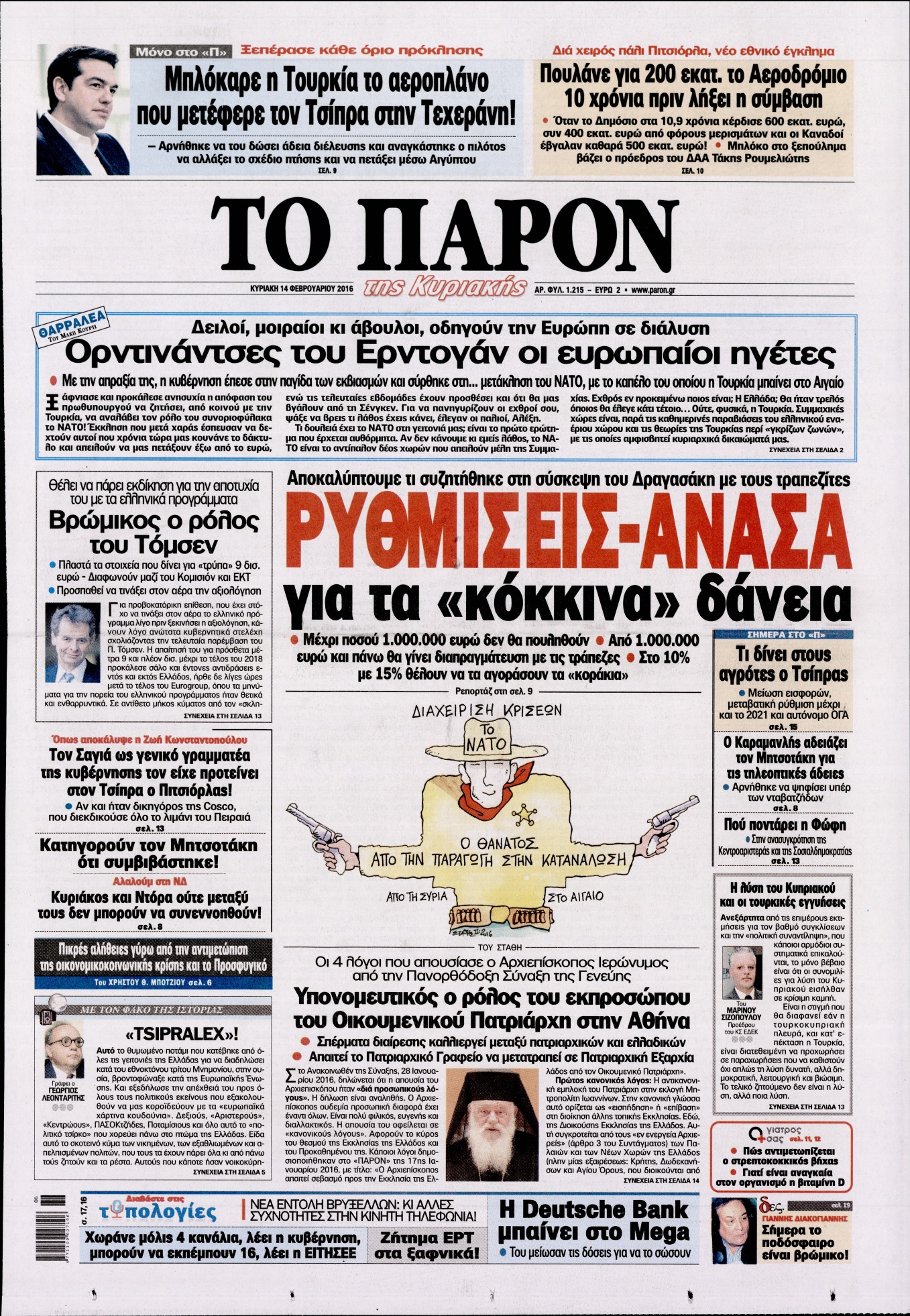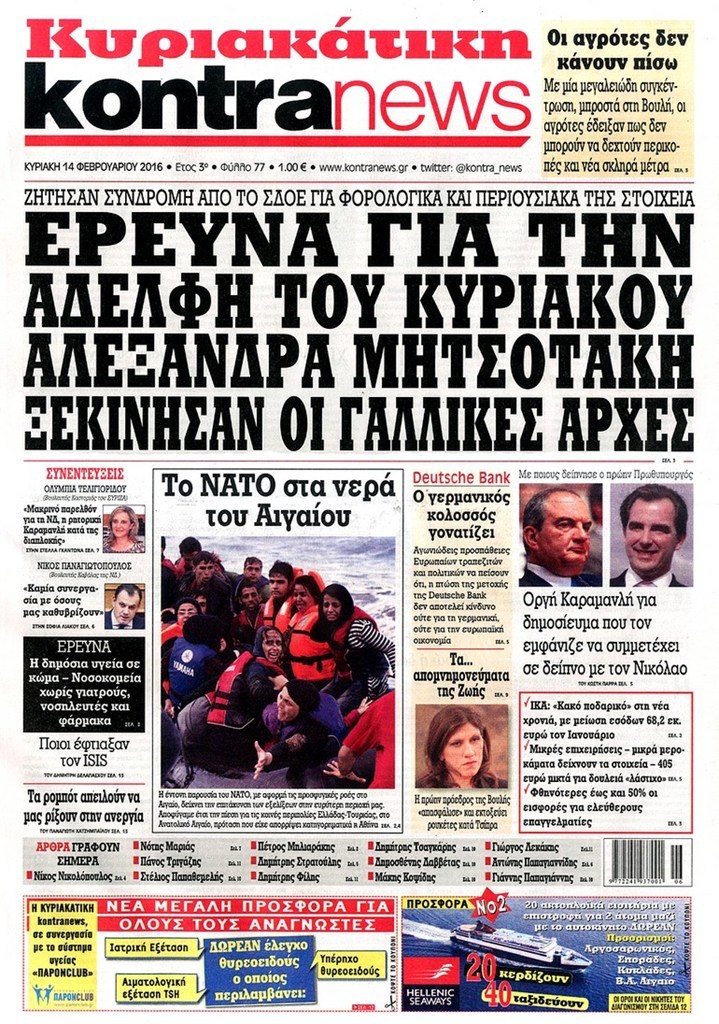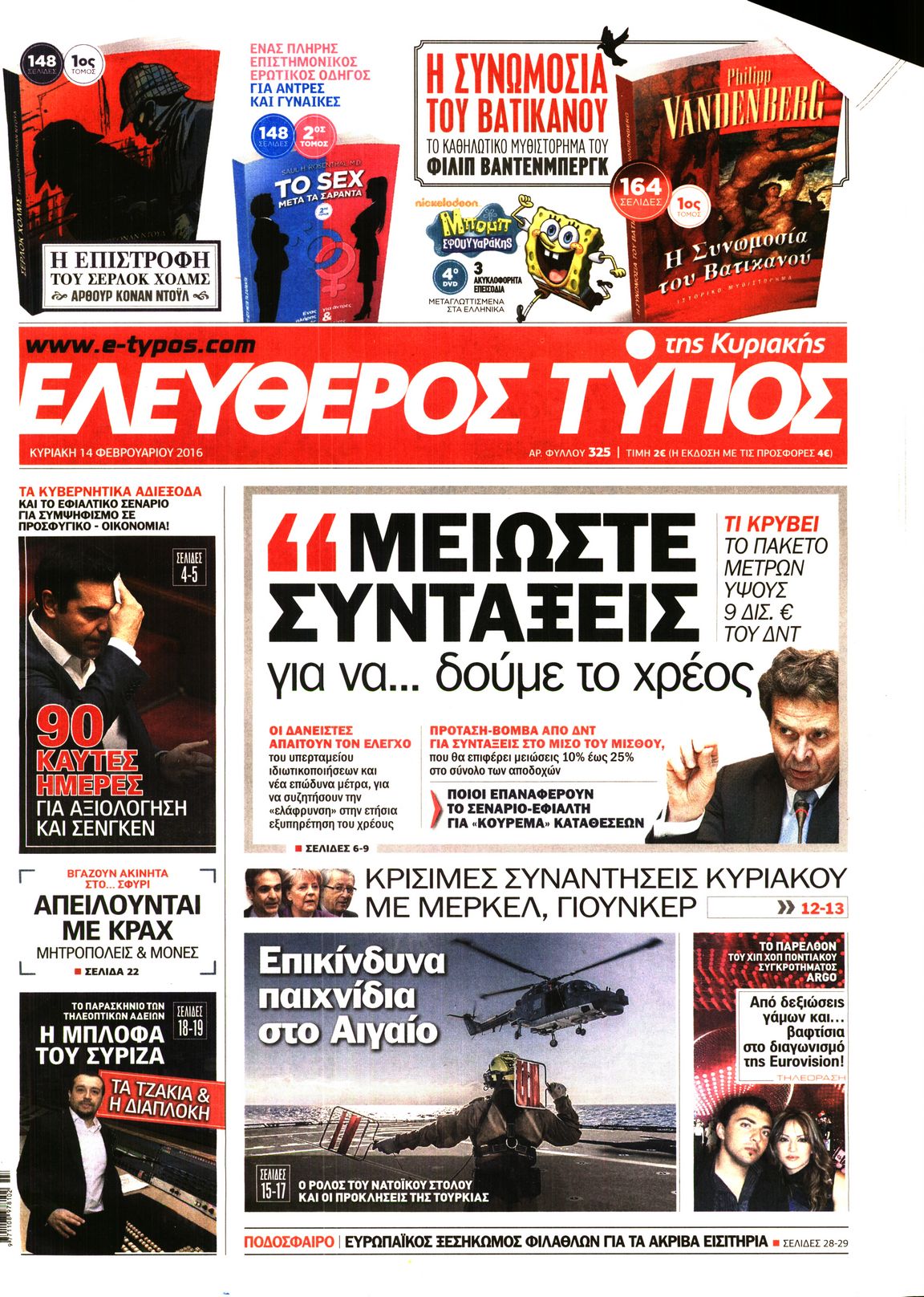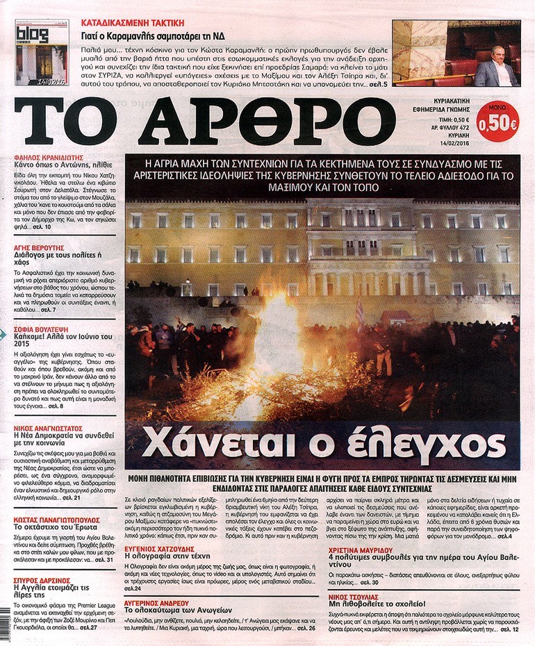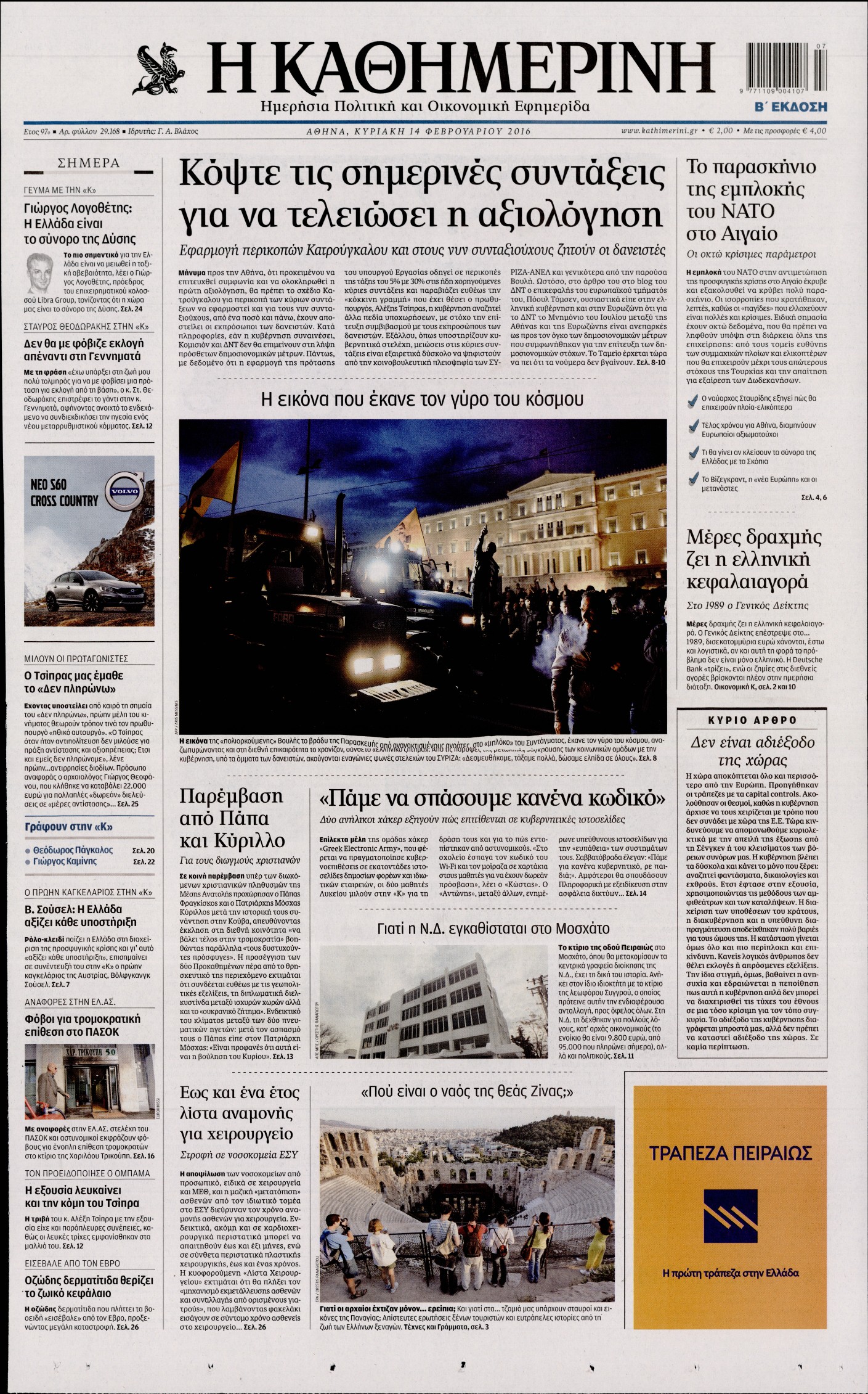 Οι πολιτικές εφημερίδες 14/2/2016 Enikos Newsroom 05:48, Κυριακή 14 Φεβρουαρίου 2016 Media Διαβάστε τα σημερινά πρωτοσέλιδα των πολιτικών εφημερίδων: Μοιράσου το: σχολίασε κι εσύ (0 σχόλια) Ακολουθήστε το enikos.gr στο Google News και μάθετε πρώτοι όλες τις ειδήσεις Δείτε όλες τις τελευταίες ειδήσεις από την Ελλάδα και τον Κόσμο στο enikos.gr Ειδήσεις Ροή Ειδήσεων 24 λεπτά πριν Τραμπ: Δεν αποκλείει την πιθανότητα ενός πολέμου στη Βενεζουέλα – «Ο Μαδούρο ξέρει καλύτερα από τον καθένα τι ακριβώς θέλω» 18 λεπτά πριν Ουκρανία: Η άνευ προηγουμένου επίθεση σε ρωσικό τάνκερ στη Μεσόγειο και το μήνυμα προς στον Πούτιν – Το «μακρύ χέρι» του Κιέβου 3 ώρες πριν Εμπλοκή και αερομαχίες με οπλισμένα τουρκικά F-16 στο Αιγαίο 3 ώρες πριν Πούτιν: «Ναι, είμαι ερωτευμένος» – Βίντεο από τη σπάνια προσωπική παραδοχή του 1 ώρα πριν Ανδρέας Λυκουρέντζος: Υπέβαλε την παραίτησή του ο πρόεδρος του ΕΛΓΑ, αλλά δεν έγινε δεκτή – Όλο το παρασκήνιο 2 ώρες πριν Αριθμολογία: Οι άνθρωποι που έχουν γεννηθεί αυτές τις 4 ημερομηνίες, συχνά παρεξηγούνται – «Η καλοσύνη τους κρύβει τεράστια δύναμη» 4 ώρες πριν Μήπως έχετε χάσει τον εαυτό σας στη σχέση σας; 7 «αθόρυβες» υποχωρήσεις που μάλλον κάνατε, χωρίς να το συνειδητοποιήσετε 3 ώρες πριν Ξεχάστε το καθάρισμα το Σαββατοκύριακο: Ο «κανόνας των 20 λεπτών» που θα σας λύσει τα χέρια 33 λεπτά πριν Ύπνος: Μια κρυφή κατάσταση του εγκεφάλου πριν από τον ύπνο μπορεί να είναι το “κλειδί” για υψηλή ευφυΐα και δημιουργικότητα 7 λεπτά πριν Χάρι και Μέγκαν: Η σπάνια οικογενειακή φωτογραφία με τον Άρτσι και τη Λίλιμπετ – Τι σχεδιάζουν για τα Χριστούγεννα 13 λεπτά πριν Βασίλης Καρράς: «Είναι πάντα δίπλα μου, δεν έφυγε…», λέει ο αδελφός του 18 λεπτά πριν Ουκρανία: Η άνευ προηγουμένου επίθεση σε ρωσικό τάνκερ στη Μεσόγειο και το μήνυμα προς στον Πούτιν – Το «μακρύ χέρι» του Κιέβου 24 λεπτά πριν Τραμπ: Δεν αποκλείει την πιθανότητα ενός πολέμου στη Βενεζουέλα – «Ο Μαδούρο ξέρει καλύτερα από τον καθένα τι ακριβώς θέλω» 25 λεπτά πριν Κηφισιά: Με πολλές απουσίες κόντρα στον Ολυμπιακό – «Last dance» για τον Τεττέη ENIKOS NETWORK Το ΕΚΑΒ τιμήθηκε από την Ακαδημία Αθηνών για τα 40 χρόνια προσφοράς του Έχετε πραγματικά μεγάλη καρδιά; 10 χαρακτηριστικά όσων έχουν καλοσύνη ΑΑΔΕ: Νέες αναβαθμίσεις στο Ψηφιακό Πελατολόγιο και την εφαρμογή myDATAapp – Τι πρέπει να γνωρίζετε Όμιλος ΔΕΗ: Νέα ορόσημα και ενισχυμένη διαφάνεια στην ετήσια Έκθεση Βιώσιμης Ανάπτυξης Χαρτογραφώντας το «σημείο χωρίς επιστροφή»: Για πρώτη φορά αποκαλύπτεται με λεπτομέρεια το ακανθώδες όριο της ατμόσφαιρας τ... Η Google καταργεί τη λειτουργία «dark web report» – Πώς θα μπορούν οι χρήστες να διαγράφουν τα δεδομένα τους περισσότερα 20:37 , Παρασκευή 19 Δεκεμβρίου 2025 Don’t Forget The Lyrics: Η Έλλη Κοκκίνου υποδέχεται 4 παίκτες που θα κάνουν τα πάντα για να μη χάσουν ούτε… μισή λέξη από τους στίχους Το «Don’t Forget The Lyrics» επιστρέφει απόψε, Παρασκευή 19 Δεκεμβρίου, στις 21:00 με νέο επει... 19:31 , Παρασκευή 19 Δεκεμβρίου 2025 GNTM: Απόψε ο μεγάλος τελικός για τους 4 φιναλίστ Έπειτα από μήνες γεμάτους μόδα, δημιουργία και έντονες αναμετρήσεις, το GNTM 2025 κορυφώνεται,... 18:11 , Παρασκευή 19 Δεκεμβρίου 2025 Το σόι σου: Ο Άρης έρχεται στην Ελλάδα για τις γιορτές των Χριστουγέννων – Τι θα δούμε στο αποψινό εορταστικό επεισόδιο Ένα απολαυστικό, εορταστικό επεισόδιο της σειράς “Το σόι σου”, γεμάτο ευτράπελα αλ... 15:15 , Παρασκευή 19 Δεκεμβρίου 2025 Την Κυριακή με τη Realnews: Ό,τι και αν αγοράσεις, σκανάρεις