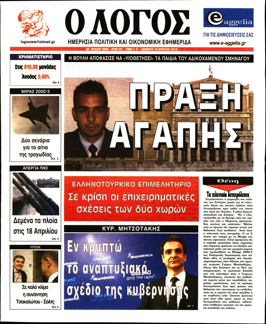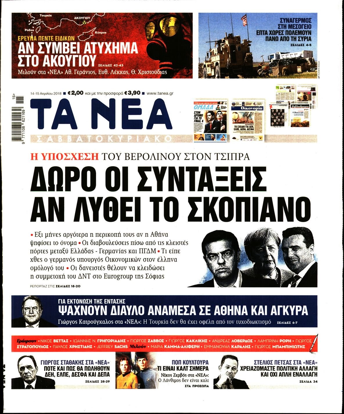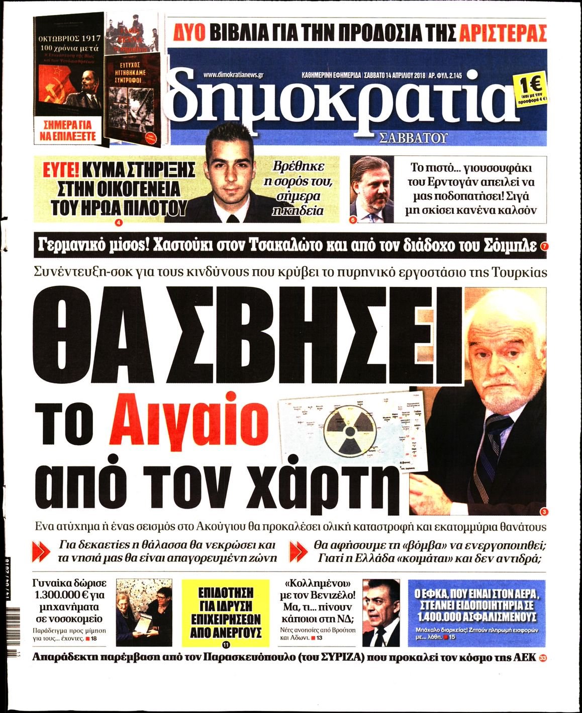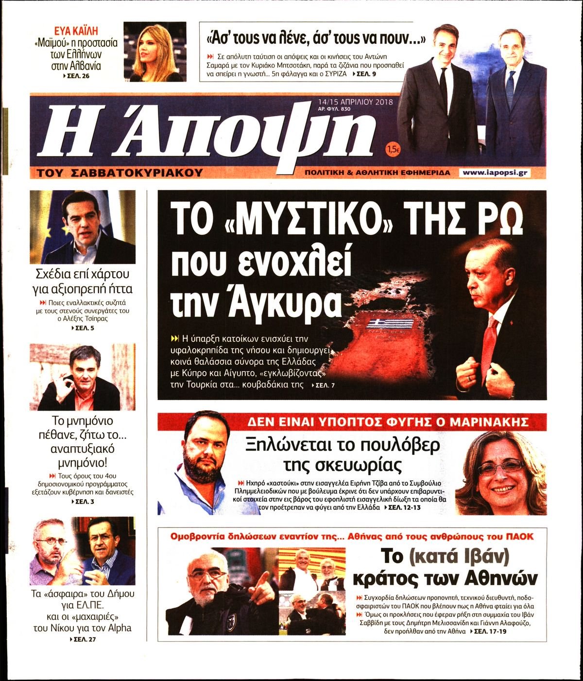 Οι πολιτικές εφημερίδες 14/4/2018 Enikos Newsroom 07:37, Σάββατο 14 Απριλίου 2018 Media Διαβάστε τα σημερινά πρωτοσέλιδα των πολιτικών εφημερίδων: ΠΟΛΙΤΙΚΕΣ ΕΦΗΜΕΡΙΔΕΣ ΠΡΩΤΟΣΕΛΙΔΑ Μοιράσου το: σχολίασε κι εσύ (0 σχόλια) Ακολουθήστε το enikos.gr στο Google News και μάθετε πρώτοι όλες τις ειδήσεις Δείτε όλες τις τελευταίες ειδήσεις από την Ελλάδα και τον Κόσμο στο enikos.gr Ειδήσεις Ροή Ειδήσεων 25 λεπτά πριν Υπόθεση Έπσταϊν: Το Υπουργείο Δικαιοσύνης δημοσιοποίησε μια σειρά από εξαιρετικά επεξεργασμένα αρχεία – «Λείπουν τα πιο σημαντικά έγγραφα», λένε οι Δημοκρατικοί 2 ώρες πριν Σαρωτικοί οι έλεγχοι στους δρόμους ενόψει εορτών – Μπλόκα της τροχαίας σε κεντρικές αρτηρίες της Αττικής 36 λεπτά πριν ΟΝΕΧ – MEGATUGS: Ξεκίνησε η ναυπήγηση ρυμουλκών στην Ελλάδα – Προθάλαμος πολεμικών πλοίων – Δείτε φωτογραφίες και βίντεο 10 ώρες πριν Χριστούγεννα στα μπλόκα: Επιμένουν στις κινητοποιήσεις τους οι αγρότες – Ανοίγουν τα διόδια το Σαββατοκύριακο 9 ώρες πριν Πούτιν: Τα μηνύματα σε Ευρώπη και ΝΑΤΟ από το μαραθώνιο «σόου» του – Η απαίτηση για «σεβασμό» και η ειρήνη «με τους όρους» της Μόσχας 2 ώρες πριν Αυγά: Πόσα μπορείτε να τρώτε την ημέρα με ασφάλεια για μέγιστη πρόσληψη πρωτεΐνης 3 ώρες πριν Τα ζώδια σήμερα, Σάββατο 20 Δεκεμβρίου: Παρθένοι, το σύμπαν σας δίνει το κλειδί 9 ώρες πριν Ανακαλύφθηκαν αρχαία χρυσά νομίσματα 2.200 ετών που απεικονίζουν τον θεό Απόλλωνα – Η άγνωστη σύνδεση με τον Φίλιππο Β΄ της Μακεδονίας 2 ώρες πριν Οπτική ψευδαίσθηση: Μόνο αν είσαι ο Σέρλοκ Χολμς θα βρεις τον αριθμό «87» σε 7 δευτερόλεπτα 5 λεπτά πριν Αρχαιολόγοι ανακάλυψαν σε χωράφι απεικόνιση 600 ετών ενός Αγίου – Τα στοιχεία που δείχνουν ότι μαρτύρησε 13 λεπτά πριν Mega χριστουγεννιάτικη φορολοταρία: «Κλείδωσε» η ημερομηνία για την κλήρωση – Ερωτήσεις και απαντήσεις 20 λεπτά πριν ΗΠΑ: Τέσσερις μετανάστες πέθαναν σε κέντρα κράτησης – Αύξηση θανάτων σε επίπεδο ρεκόρ το 2025 25 λεπτά πριν Υπόθεση Έπσταϊν: Το Υπουργείο Δικαιοσύνης δημοσιοποίησε μια σειρά από εξαιρετικά επεξεργασμένα αρχεία – «Λείπουν τα πιο σημαντικά έγγραφα», λένε οι Δημοκρατικοί 28 λεπτά πριν Καιρός: Αλλαγή σκηνικού σήμερα με βροχές και πτώση της θερμοκρασίας – Οι προβλέψεις των μετεωρολόγων για τα Χριστούγεννα ENIKOS NETWORK Το τεστ των 10 δευτερολέπτων που μπορεί να προβλέψει το προσδόκιμο ζωής σας – Τι λέει ειδικός του Cleveland Επιλέξτε καρέκλα για να μάθετε ποια είναι τα κρυφά χαρακτηριστικά σας – Τι αποκάλυψε για εσάς αυτό το τεστ προσωπικότητας; Mega χριστουγεννιάτικη φορολοταρία: «Κλείδωσε» η ημερομηνία για την κλήρωση – Ερωτήσεις και απαντήσεις Αναστολή μέτρων αναγκαστικής εκτέλεσης για κτηνοτρόφους που πλήττονται από την ευλογιά των αιγοπροβάτων Χαρτογραφώντας το «σημείο χωρίς επιστροφή»: Για πρώτη φορά αποκαλύπτεται με λεπτομέρεια το ακανθώδες όριο της ατμόσφαιρας τ... Η Google καταργεί τη λειτουργία «dark web report» – Πώς θα μπορούν οι χρήστες να διαγράφουν τα δεδομένα τους περισσότερα 05:48 , Σάββατο 20 Δεκεμβρίου 2025 Οι οικονομικές εφημερίδες 20/12/2025 Διαβάστε τα πρωτοσέλιδα από τις οικονομικές εφημερίδες, σήμερα 20/12/2025. 05:43 , Σάββατο 20 Δεκεμβρίου 2025 Οι αθλητικές εφημερίδες 20/12/2025 Διαβάστε τα πρωτοσέλιδα από τις αθλητικές εφημερίδες, σήμερα 20/12/2025. 05:38 , Σάββατο 20 Δεκεμβρίου 2025 Οι πολιτικές εφημερίδες 20/12/2025 Διαβάστε τα πρωτοσέλιδα από τις πολιτικές εφημερίδες, σήμερα 20/12/2025. 04:20 , Σάββατο 20 Δεκεμβρίου 2025 Αγγελική Νικολούλη: Τα συλλυπητήρια για την απώλε