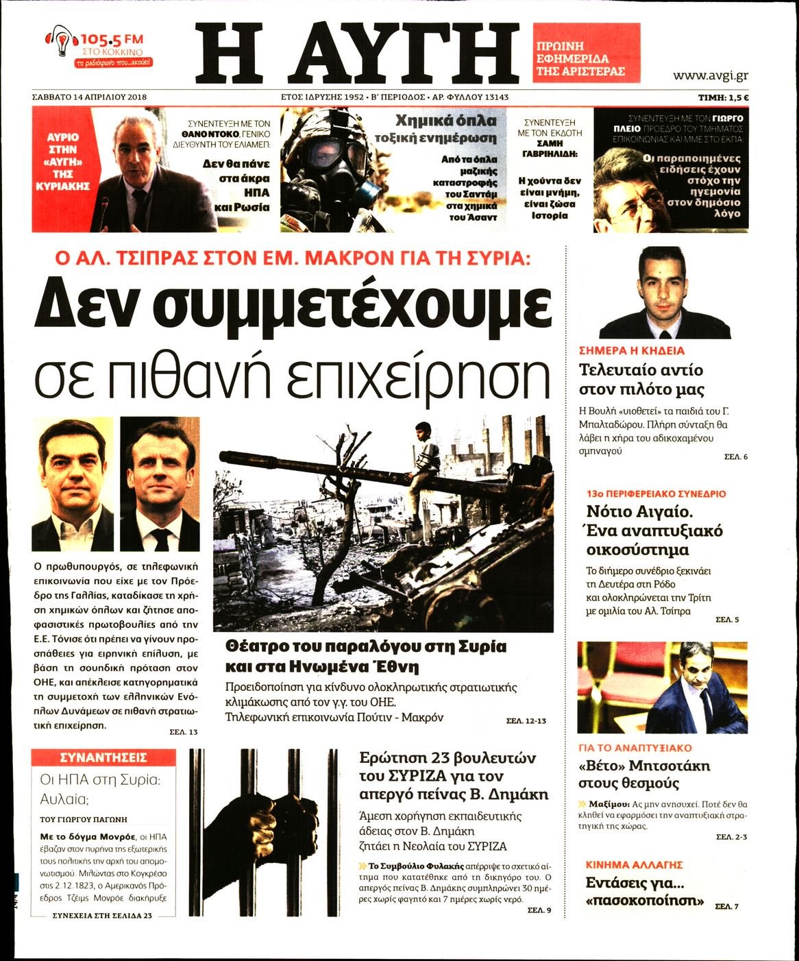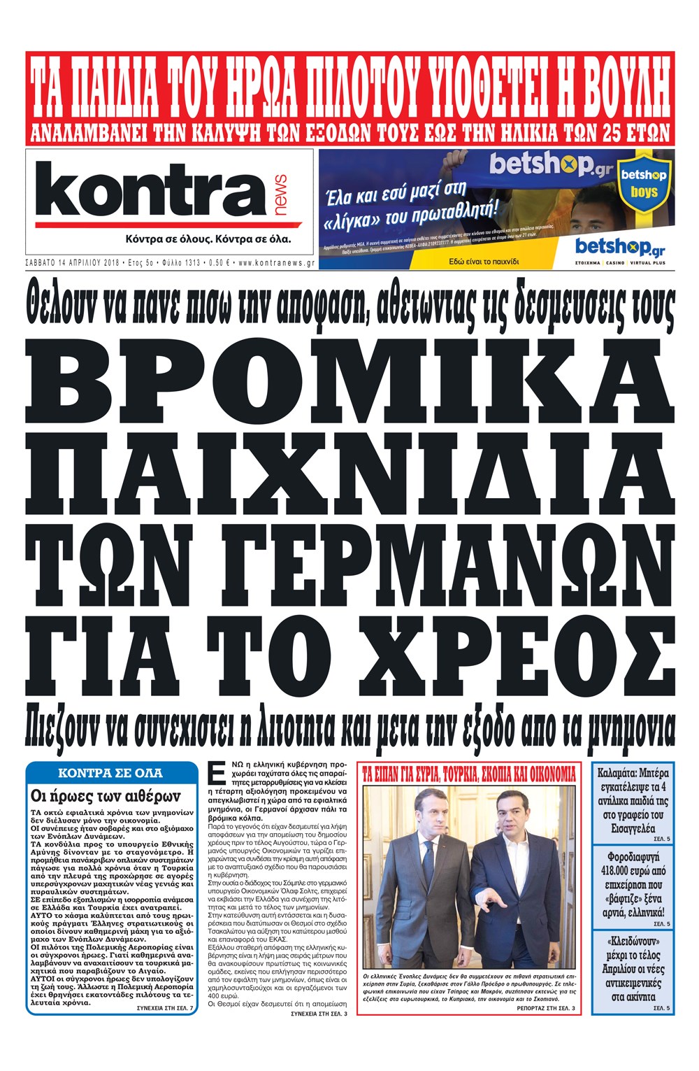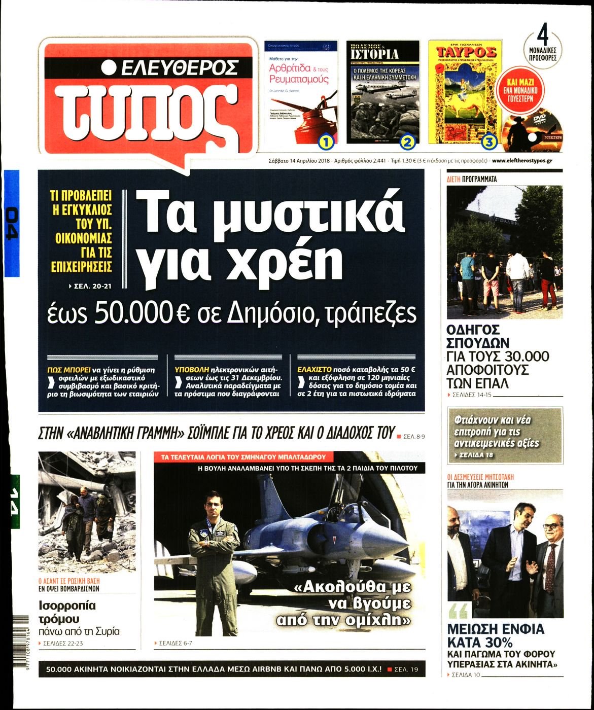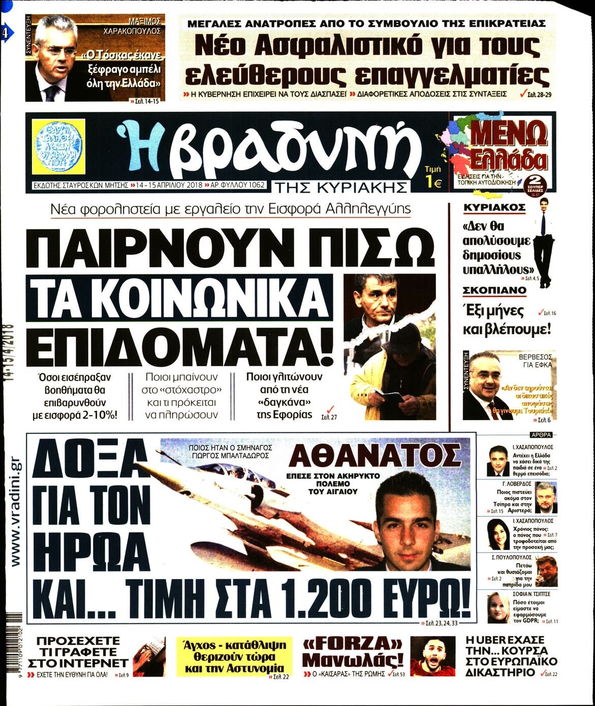 Οι πολιτικές εφημερίδες 14/4/2018 Enikos Newsroom 07:37, Σάββατο 14 Απριλίου 2018 Media Διαβάστε τα σημερινά πρωτοσέλιδα των πολιτικών εφημερίδων: ΠΟΛΙΤΙΚΕΣ ΕΦΗΜΕΡΙΔΕΣ ΠΡΩΤΟΣΕΛΙΔΑ Μοιράσου το: σχολίασε κι εσύ (0 σχόλια) Ακολουθήστε το enikos.gr στο Google News και μάθετε πρώτοι όλες τις ειδήσεις Δείτε όλες τις τελευταίες ειδήσεις από την Ελλάδα και τον Κόσμο στο enikos.gr Ειδήσεις Ροή Ειδήσεων 25 λεπτά πριν Υπόθεση Έπσταϊν: Το Υπουργείο Δικαιοσύνης δημοσιοποίησε μια σειρά από εξαιρετικά επεξεργασμένα αρχεία – «Λείπουν τα πιο σημαντικά έγγραφα», λένε οι Δημοκρατικοί 2 ώρες πριν Σαρωτικοί οι έλεγχοι στους δρόμους ενόψει εορτών – Μπλόκα της τροχαίας σε κεντρικές αρτηρίες της Αττικής 36 λεπτά πριν ΟΝΕΧ – MEGATUGS: Ξεκίνησε η ναυπήγηση ρυμουλκών στην Ελλάδα – Προθάλαμος πολεμικών πλοίων – Δείτε φωτογραφίες και βίντεο 10 ώρες πριν Χριστούγεννα στα μπλόκα: Επιμένουν στις κινητοποιήσεις τους οι αγρότες – Ανοίγουν τα διόδια το Σαββατοκύριακο 9 ώρες πριν Πούτιν: Τα μηνύματα σε Ευρώπη και ΝΑΤΟ από το μαραθώνιο «σόου» του – Η απαίτηση για «σεβασμό» και η ειρήνη «με τους όρους» της Μόσχας 2 ώρες πριν Αυγά: Πόσα μπορείτε να τρώτε την ημέρα με ασφάλεια για μέγιστη πρόσληψη πρωτεΐνης 3 ώρες πριν Τα ζώδια σήμερα, Σάββατο 20 Δεκεμβρίου: Παρθένοι, το σύμπαν σας δίνει το κλειδί 9 ώρες πριν Ανακαλύφθηκαν αρχαία χρυσά νομίσματα 2.200 ετών που απεικονίζουν τον θεό Απόλλωνα – Η άγνωστη σύνδεση με τον Φίλιππο Β΄ της Μακεδονίας 2 ώρες πριν Οπτική ψευδαίσθηση: Μόνο αν είσαι ο Σέρλοκ Χολμς θα βρεις τον αριθμό «87» σε 7 δευτερόλεπτα 5 λεπτά πριν Αρχαιολόγοι ανακάλυψαν σε χωράφι απεικόνιση 600 ετών ενός Αγίου – Τα στοιχεία που δείχνουν ότι μαρτύρησε 13 λεπτά πριν Mega χριστουγεννιάτικη φορολοταρία: «Κλείδωσε» η ημερομηνία για την κλήρωση – Ερωτήσεις και απαντήσεις 20 λεπτά πριν ΗΠΑ: Τέσσερις μετανάστες πέθαναν σε κέντρα κράτησης – Αύξηση θανάτων σε επίπεδο ρεκόρ το 2025 25 λεπτά πριν Υπόθεση Έπσταϊν: Το Υπουργείο Δικαιοσύνης δημοσιοποίησε μια σειρά από εξαιρετικά επεξεργασμένα αρχεία – «Λείπουν τα πιο σημαντικά έγγραφα», λένε οι Δημοκρατικοί 28 λεπτά πριν Καιρός: Αλλαγή σκηνικού σήμερα με βροχές και πτώση της θερμοκρασίας – Οι προβλέψεις των μετεωρολόγων για τα Χριστούγεννα ENIKOS NETWORK Το τεστ των 10 δευτερολέπτων που μπορεί να προβλέψει το προσδόκιμο ζωής σας – Τι λέει ειδικός του Cleveland Επιλέξτε καρέκλα για να μάθετε ποια είναι τα κρυφά χαρακτηριστικά σας – Τι αποκάλυψε για εσάς αυτό το τεστ προσωπικότητας; Mega χριστουγεννιάτικη φορολοταρία: «Κλείδωσε» η ημερομηνία για την κλήρωση – Ερωτήσεις και απαντήσεις Αναστολή μέτρων αναγκαστικής εκτέλεσης για κτηνοτρόφους που πλήττονται από την ευλογιά των αιγοπροβάτων Χαρτογραφώντας το «σημείο χωρίς επιστροφή»: Για πρώτη φορά αποκαλύπτεται με λεπτομέρεια το ακανθώδες όριο της ατμόσφαιρας τ... Η Google καταργεί τη λειτουργία «dark web report» – Πώς θα μπορούν οι χρήστες να διαγράφουν τα δεδομένα τους περισσότερα 05:48 , Σάββατο 20 Δεκεμβρίου 2025 Οι οικονομικές εφημερίδες 20/12/2025 Διαβάστε τα πρωτοσέλιδα από τις οικονομικές εφημερίδες, σήμερα 20/12/2025. 05:43 , Σάββατο 20 Δεκεμβρίου 2025 Οι αθλητικές εφημερίδες 20/12/2025 Διαβάστε τα πρωτοσέλιδα από τις αθλητικές εφημερίδες, σήμερα 20/12/2025. 05:38 , Σάββατο 20 Δεκεμβρίου 2025 Οι πολιτικές εφημερίδες 20/12/2025 Διαβάστε τα πρωτοσέλιδα από τις πολιτικές εφημερίδες, σήμερα 20/12/2025. 04:20 , Σάββατο 20 Δεκεμβρίου 2025 Αγγελική Νικολούλη: Τα συλλυπητήρια για την απώλε