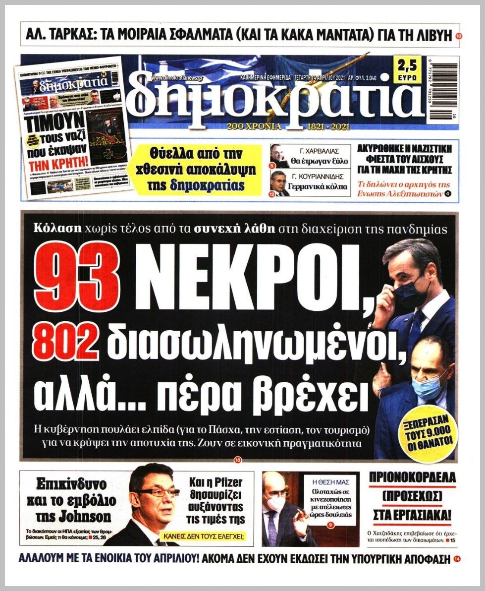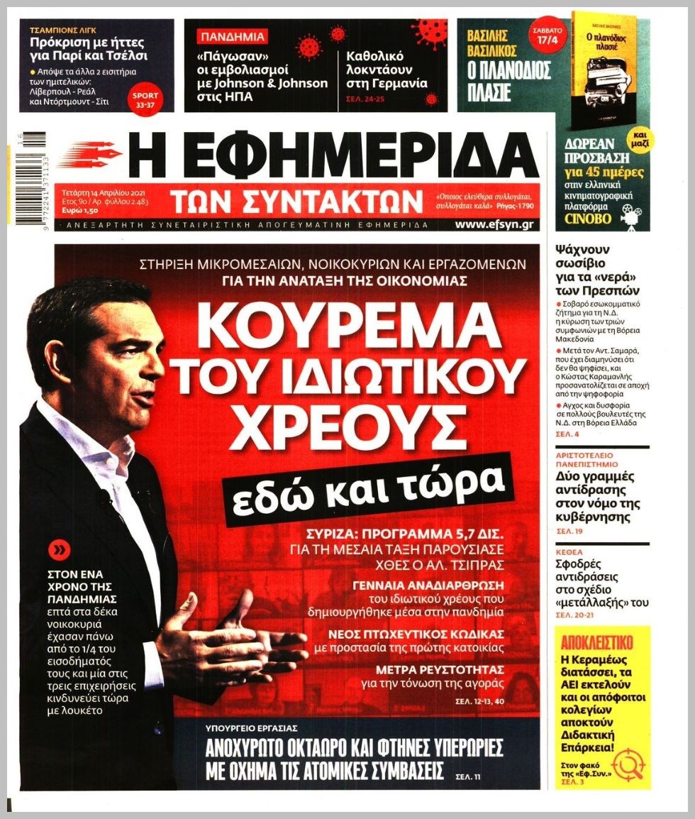Οι πολιτικές εφημερίδες 14/4/2021 Διονύσης Νίκκας 06:08, Τετάρτη 14 Απριλίου 2021 Media Διαβάστε τα πρωτοσέλιδα των πολιτικών εφημερίδων… ΕΦΗΜΕΡΙΔΕΣ ΠΡΩΤΟΣΕΛΙΔΑ Μοιράσου το: σχολίασε κι εσύ (0 σχόλια) Ακολουθήστε το enikos.gr στο Google News και μάθετε πρώτοι όλες τις ειδήσεις Δείτε όλες τις τελευταίες ειδήσεις από την Ελλάδα και τον Κόσμο στο enikos.gr Ειδήσεις Ροή Ειδήσεων 2 ώρες πριν Αυξάνουν την πίεση προς την κυβέρνηση οι αγρότες: Κλείνουν παρακαμπτήριους και ανοίγουν διόδια – Τι θα γίνει τις γιορτές 44 λεπτά πριν ΟΠΕΚΕΠΕ: Προφυλακιστέος ο φερόμενος αρχηγός και ο λογιστής της εγκληματικής οργάνωσης 2 ώρες πριν Φοινικούντα: Το Σάββατο απολογείται ο 30χρονος γιος γνωστού επιχειρηματία της Πλάκας που παραδόθηκε – Όσα είπε στους αστυνομικούς και ο ρόλος του στο έγκλημα 1 ώρα πριν Μπορεί ο Μαδούρο να αντέξει τον αποκλεισμό του Τραμπ; Τι θα χρειαστεί η Ουάσινγκτον για να τον ανατρέψει 3 ώρες πριν Πρίγκιπας Ουίλιαμ – Κέιτ: Η νέα οικογενειακή φωτογραφία για τις Χριστουγεννιάτικες κάρτες του 2025 2 ώρες πριν Ύπνος: Η απλή βραδινή ρουτίνα για να προστατεύσετε τα μαλλιά σας από το κρύο κατά τη διάρκεια του χειμώνα 3 ώρες πριν Manifesting: Πώς να συναντήσετε τον σύντροφο της ζωής σας, ανάλογα με τον μήνα γέννησής σας 2 ημέρες πριν 20 χρόνια τα Χριστούγεννα ξεκινούν στα Public με μεγάλη ποικιλία σε δώρα! 1 ώρα πριν Αρχαιολόγοι ανακάλυψαν ρωμαϊκά τεχνουργήματα από μια πόλη που δεν υπήρξε ποτέ – Τα τρία εντυπωσιακά κτίρια και ο αμφορέας με τις… σαρδέλες 24 λεπτά πριν ΑΕΚ – Κραϊόβα 3-2: Επική ανατροπή και πρόκριση στους «16» του Conference League η Ένωση 44 λεπτά πριν ΟΠΕΚΕΠΕ: Προφυλακιστέος ο φερόμενος αρχηγός και ο λογιστής της εγκληματικής οργάνωσης 54 λεπτά πριν Αθηνά Μαξίμου: Η τρυφερή ανάρτηση για τα γενέθλια του Αιμίλιου Χειλάκη – «Είναι η εκλεκτική συγγένειά μου, η επιλογή και η ευθύνη μου» 1 ώρα πριν Παναθηναϊκός – Χάποελ Τελ Αβίβ 93-82: Με… φόρα από την Κωνσταντινούπολη 1 ώρα πριν Μπορεί ο Μαδούρο να αντέξει τον αποκλεισμό του Τραμπ; Τι θα χρειαστεί η Ουάσινγκτον για να τον ανατρέψει ENIKOS NETWORK Σε περίοδο αυξημένης δραστηριότητας η γρίπη στην Ελλάδα-Μέτρα προστασίας από τον ΕΟΔΥ Σκέφτεστε συνέχεια συζητήσεις που έχετε κάνει; Τι σημαίνει αυτό, σύμφωνα με ειδικό Στεγαστικό: Τι λέει η ΠΟΜΙΔΑ για τα νέα μέτρα που ανακοίνωσε ο Κυριάκος Μητσοτάκης Λαγκάρντ: Αισιόδοξη για την ανάπτυξη της Ευρωζώνης, αβέβαιη για τον πληθωρισμό Χαρτογραφώντας το «σημείο χωρίς επιστροφή»: Για πρώτη φορά αποκαλύπτεται με λεπτομέρεια το ακανθώδες όριο της ατμόσφαιρας τ... Η Google καταργεί τη λειτουργία «dark web report» – Πώς θα μπορούν οι χρήστες να διαγράφουν τα δεδομένα τους περισσότερα 17:45 , Πέμπτη 18 Δεκεμβρίου 2025 ROUK ZOUK: Εορταστικό επεισόδιο με καλεσμένους τους πρωταγωνιστές του «Γιατί ρε πατέρα» Το Σάββατο 20 Δεκεμβρίου στις 21:00, η Ζέτα Μακρυπούλια υποδέχεται εκλεκτούς ηθοποιούς που όλο... 17:20 , Πέμπτη 18 Δεκεμβρίου 2025 Άγιος έρωτας: Η Χριστίνα εξομολογείται στον πατέρα Νικόλαο, απόψε στις 21:00 στον Alpha Η Νότα αποφασίζει να εκδικηθεί τον Πέτρο και τον Στέφανο, για χάρη του Λούη, όμως τα πράγματα ... 16:50 , Πέμπτη 18 Δεκεμβρίου 2025 Να μ’ αγαπάς: Ζωή και Φωτεινή συμφιλιώνονται ως μάνα με κόρη, απόψε στις 20:00 Η ταυτότητα του Άγγελου αποκαλύπτεται στο νέο επεισόδιο της σειράς “Να μ’ αγαπάς... 15:52 , Πέμπτη 18 Δεκεμβρίου 2025 Το Σπίτι Δίπλα Στο Ποτάμι: Το καθηλωτικό τελευταίο επεισόδιο για το 2025 απόψε στις 22:30 Καθηλώνει το σημερινό επεισόδιο της σ