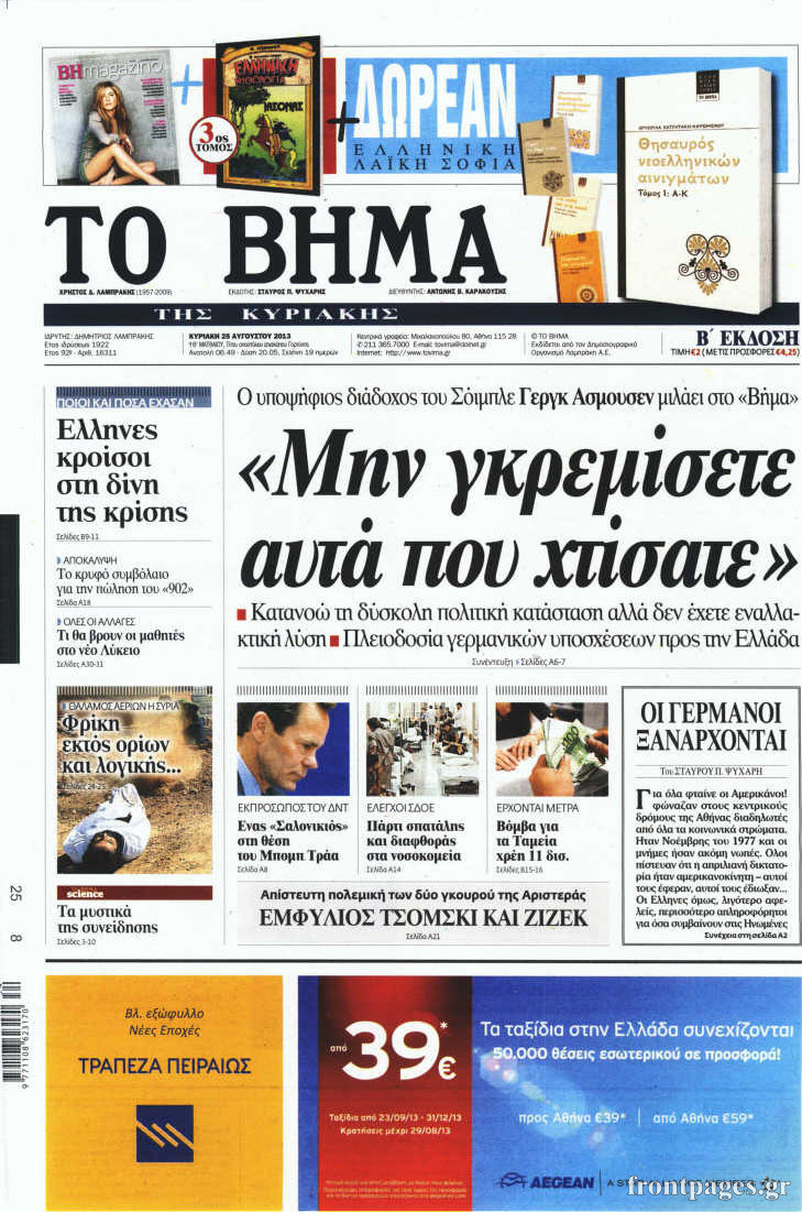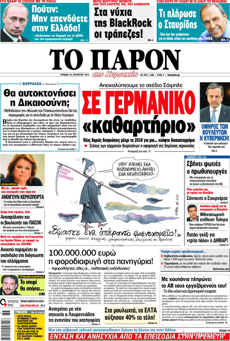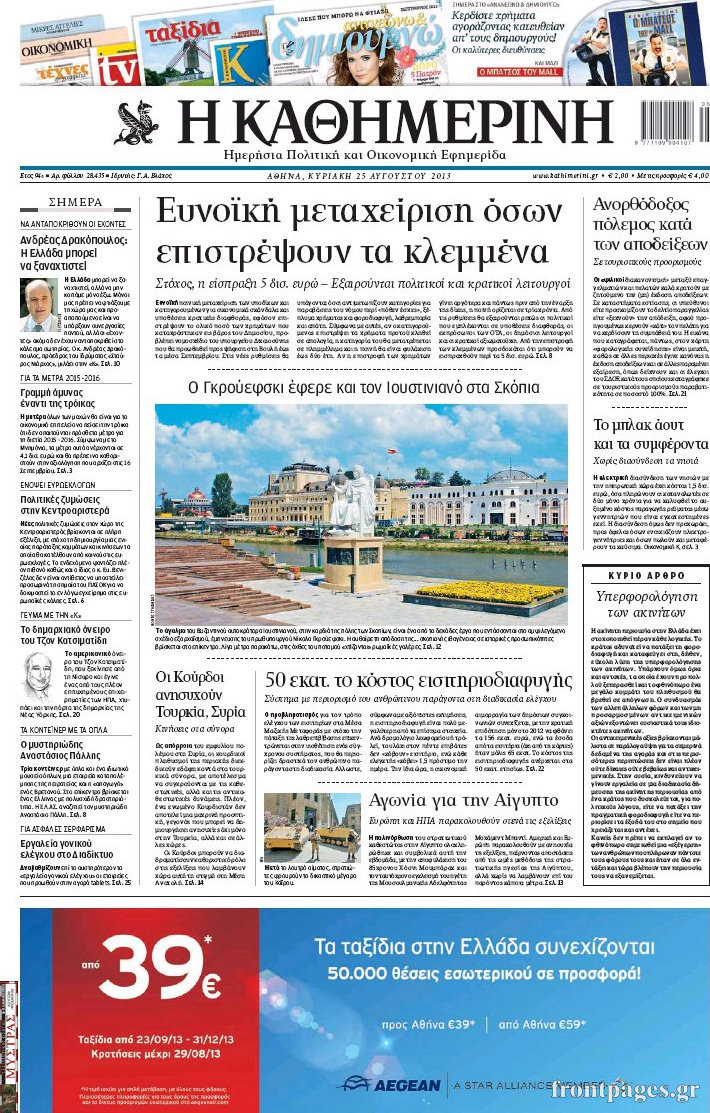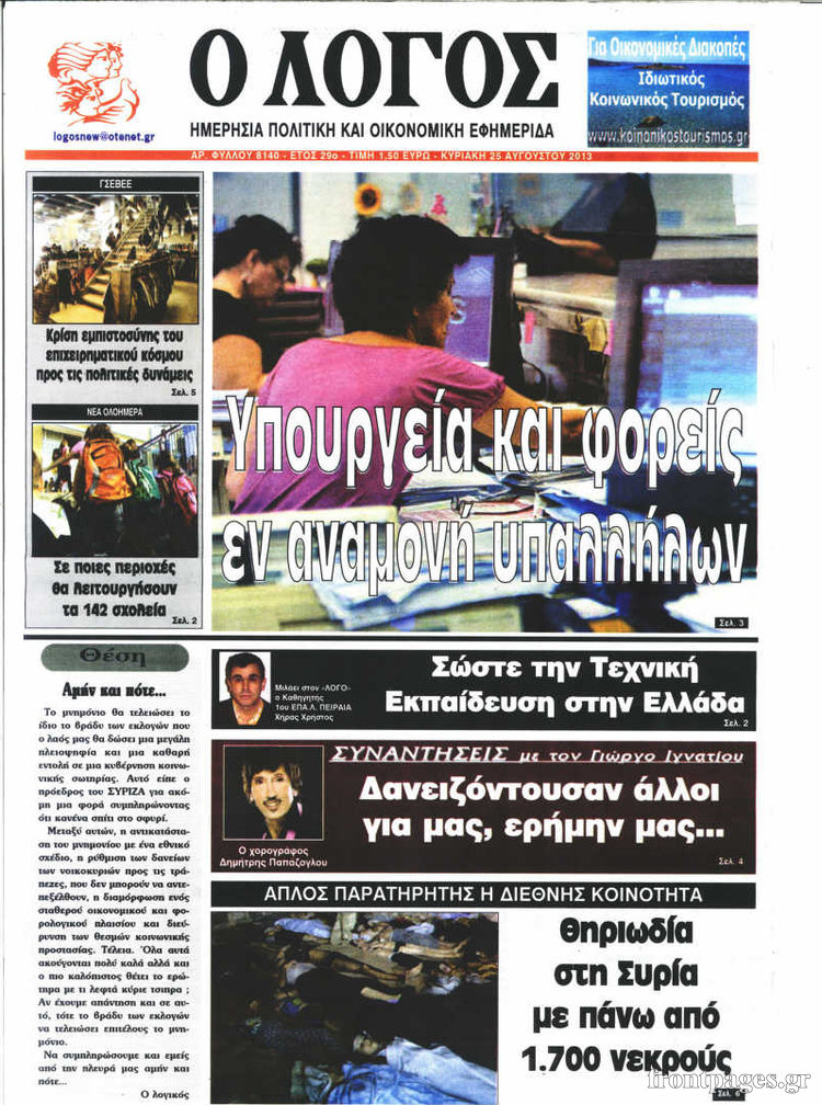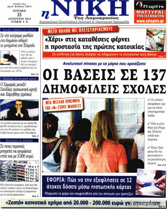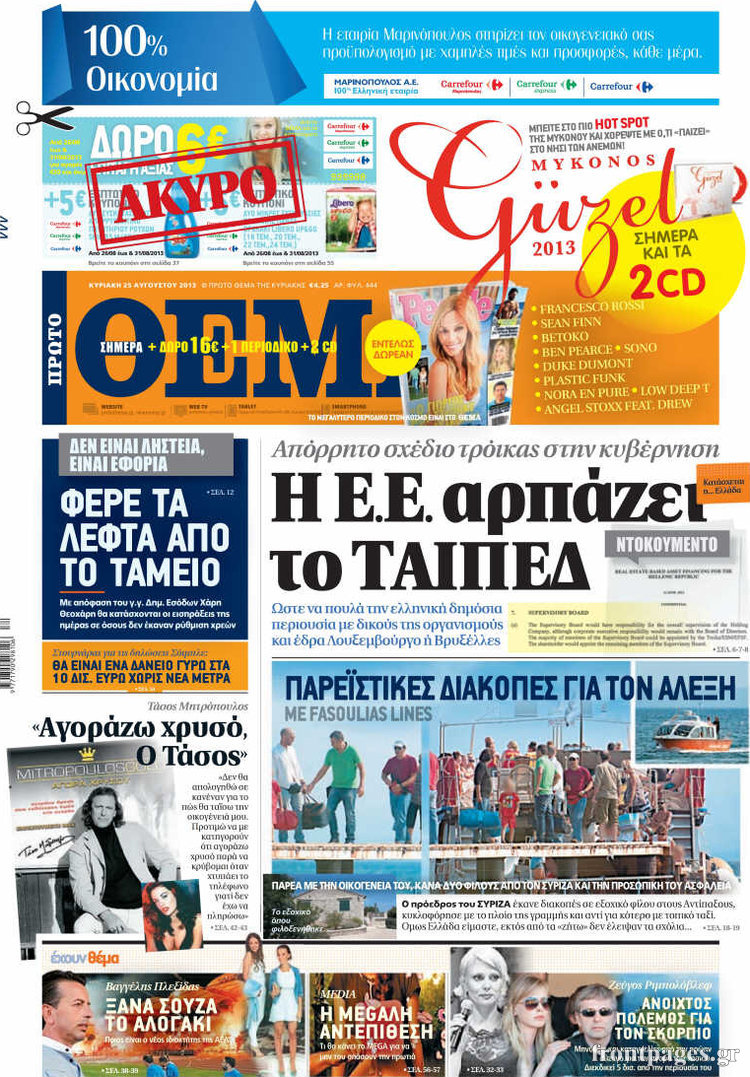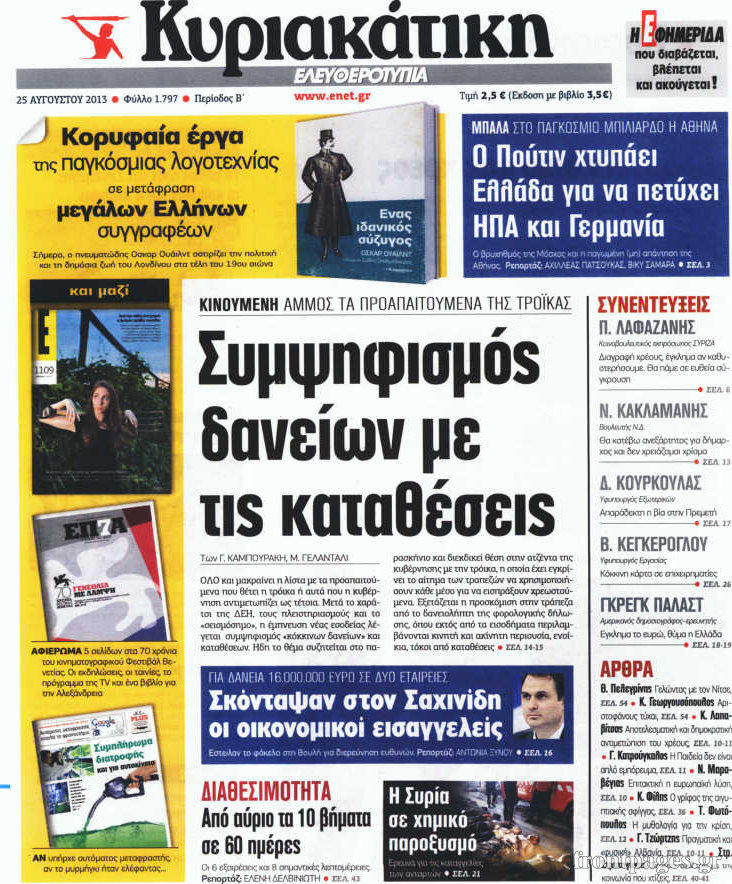 Οι πολιτικές εφημερίδες Enikos Newsroom 10:56, Κυριακή 25 Αυγούστου 2013 Media Οι πολιτικές εφημερίδες Διαβάστε τα πρωτοσέλιδα των πολιτικών εφημερίδων: ΕΦΗΜΕΡΙΔΕΣ ΠΟΛΙΤΙΚΕΣ ΕΦΗΜΕΡΙΔΕΣ ΠΡΩΤΟΣΕΛΙΔΑ Μοιράσου το: σχολίασε κι εσύ (0 σχόλια) Ακολουθήστε το enikos.gr στο Google News και μάθετε πρώτοι όλες τις ειδήσεις Δείτε όλες τις τελευταίες ειδήσεις από την Ελλάδα και τον Κόσμο στο enikos.gr Ειδήσεις Ροή Ειδήσεων 9 λεπτά πριν Υπόθεση Έπσταϊν: Το Υπουργείο Δικαιοσύνης δημοσιοποίησε μια σειρά από εξαιρετικά επεξεργασμένα αρχεία – «Λείπουν τα πιο σημαντικά έγγραφα», λένε οι Δημοκρατικοί 2 ώρες πριν Σαρωτικοί οι έλεγχοι στους δρόμους ενόψει εορτών – Μπλόκα της τροχαίας σε κεντρικές αρτηρίες της Αττικής 19 λεπτά πριν ΟΝΕΧ – MEGATUGS: Ξεκίνησε η ναυπήγηση ρυμουλκών στην Ελλάδα – Προθάλαμος πολεμικών πλοίων – Δείτε φωτογραφίες και βίντεο 9 ώρες πριν Χριστούγεννα στα μπλόκα: Επιμένουν στις κινητοποιήσεις τους οι αγρότες – Ανοίγουν τα διόδια το Σαββατοκύριακο 9 ώρες πριν Πούτιν: Τα μηνύματα σε Ευρώπη και ΝΑΤΟ από το μαραθώνιο «σόου» του – Η απαίτηση για «σεβασμό» και η ειρήνη «με τους όρους» της Μόσχας 2 ώρες πριν Αυγά: Πόσα μπορείτε να τρώτε την ημέρα με ασφάλεια για μέγιστη πρόσληψη πρωτεΐνης 2 ώρες πριν Τα ζώδια σήμερα, Σάββατο 20 Δεκεμβρίου: Παρθένοι, το σύμπαν σας δίνει το κλειδί 9 ώρες πριν Ανακαλύφθηκαν αρχαία χρυσά νομίσματα 2.200 ετών που απεικονίζουν τον θεό Απόλλωνα – Η άγνωστη σύνδεση με τον Φίλιππο Β΄ της Μακεδονίας 2 ώρες πριν Οπτική ψευδαίσθηση: Μόνο αν είσαι ο Σέρλοκ Χολμς θα βρεις τον αριθμό «87» σε 7 δευτερόλεπτα 3 λεπτά πριν ΗΠΑ: Τέσσερις μετανάστες πέθαναν σε κέντρα κράτησης – Αύξηση θανάτων σε επίπεδο ρεκόρ το 2025 9 λεπτά πριν Υπόθεση Έπσταϊν: Το Υπουργείο Δικαιοσύνης δημοσιοποίησε μια σειρά από εξαιρετικά επεξεργασμένα αρχεία – «Λείπουν τα πιο σημαντικά έγγραφα», λένε οι Δημοκρατικοί 12 λεπτά πριν Καιρός: Αλλαγή σκηνικού σήμερα με βροχές και πτώση της θερμοκρασίας – Οι προβλέψεις των μετεωρολόγων για τα Χριστούγεννα 19 λεπτά πριν ΟΝΕΧ – MEGATUGS: Ξεκίνησε η ναυπήγηση ρυμουλκών στην Ελλάδα – Προθάλαμος πολεμικών πλοίων – Δείτε φωτογραφίες και βίντεο 28 λεπτά πριν Φοινικούντα: Σήμερα απολογείται ο 30χρονος γιος γνωστού επιχειρηματία της Πλάκας ENIKOS NETWORK Το τεστ των 10 δευτερολέπτων που μπορεί να προβλέψει το προσδόκιμο ζωής σας – Τι λέει ειδικός του Cleveland Επιλέξτε καρέκλα για να μάθετε ποια είναι τα κρυφά χαρακτηριστικά σας – Τι αποκάλυψε για εσάς αυτό το τεστ προσωπικότητας; Αναστολή μέτρων αναγκαστικής εκτέλεσης για κτηνοτρόφους που πλήττονται από την ευλογιά των αιγοπροβάτων Πλήρης επάρκεια προϊόντων στις λαϊκές της Αττικής, παρά τις αγροτικές κινητοποιήσεις – Τι απαντούν οι πωλητές Χαρτογραφώντας το «σημείο χωρίς επιστροφή»: Για πρώτη φορά αποκαλύπτεται με λεπτομέρεια το ακανθώδες όριο της ατμόσφαιρας τ... Η Google καταργεί τη λειτουργία «dark web report» – Πώς θα μπορούν οι χρήστες να διαγράφουν τα δεδομένα τους περισσότερα 05:48 , Σάββατο 20 Δεκεμβρίου 2025 Οι οικονομικές εφημερίδες 20/12/2025 Διαβάστε τα πρωτοσέλιδα από τις οικονομικές εφημερίδες, σήμερα 20/12/2025. 05:43 , Σάββατο 20 Δεκεμβρίου 2025 Οι αθλητικές εφημερίδες 20/12/2025 Διαβάστε τα πρωτοσέλιδα από τις αθλητικές εφημερίδες, σήμερα 20/12/2025. 05:38 , Σάββατο 20 Δεκεμβρίου 2025 Οι πολιτικές εφημερίδες 20/12/2025 Διαβάστε τα πρωτοσέλιδα από τις πολιτικές εφημερίδες, σήμερα 20/12/2025. 04:20 , Σάββατο 20 Δεκεμβρίου 2025 Αγγελική Νικολούλη: Τα συλλυ