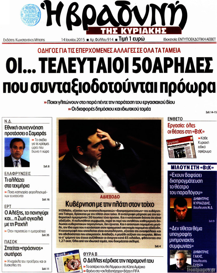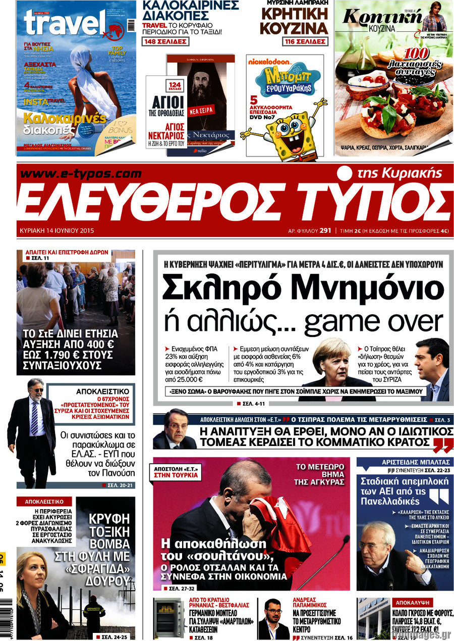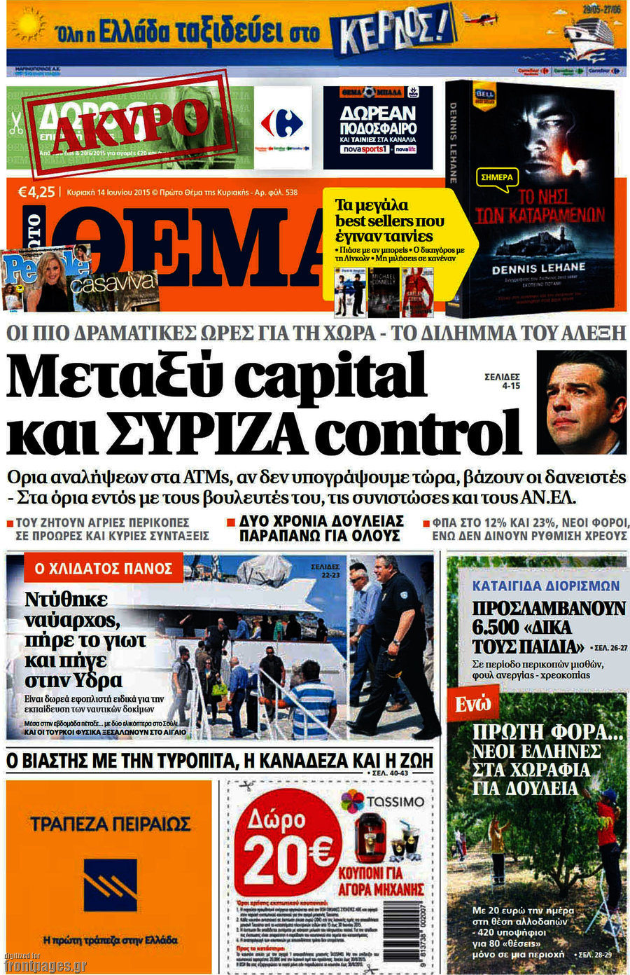 Oι πολιτικές εφημερίδες 14/6/2015 Enikos Newsroom 07:50, Κυριακή 14 Ιουνίου 2015 Media Διαβάστε τα σημερινά πρωτοσέλιδα των πολιτικών εφημερίδων: ΠΟΛΙΤΙΚΕΣ ΕΦΗΜΕΡΙΔΕΣ ΠΡΩΤΟΣΕΛΙΔΑ Μοιράσου το: σχολίασε κι εσύ (0 σχόλια) Ακολουθήστε το enikos.gr στο Google News και μάθετε πρώτοι όλες τις ειδήσεις Δείτε όλες τις τελευταίες ειδήσεις από την Ελλάδα και τον Κόσμο στο enikos.gr Ειδήσεις Ροή Ειδήσεων 4 ώρες πριν Χριστούγεννα στα μπλόκα: Επιμένουν στις κινητοποιήσεις τους οι αγρότες – Ανοίγουν τα διόδια το Σαββατοκύριακο 4 ώρες πριν Ουκρανία: Η άνευ προηγουμένου επίθεση σε ρωσικό τάνκερ στη Μεσόγειο και το μήνυμα προς στον Πούτιν – Το «μακρύ χέρι» του Κιέβου 3 ώρες πριν Πούτιν: Τα μηνύματα σε Ευρώπη και ΝΑΤΟ από το μαραθώνιο «σόου» του – Η απαίτηση για «σεβασμό» και η ειρήνη «με τους όρους» της Μόσχας 4 ώρες πριν Τραμπ: Δεν αποκλείει την πιθανότητα ενός πολέμου στη Βενεζουέλα – «Ο Μαδούρο ξέρει καλύτερα από τον καθένα τι ακριβώς θέλω» 5 ώρες πριν Συνεχίζει να προκαλεί ο Μίτσκοσκι: «Για μένα το όνομα Μακεδονία είναι ιερό» 3 ώρες πριν Ανακαλύφθηκαν αρχαία χρυσά νομίσματα 2.200 ετών που απεικονίζουν τον θεό Απόλλωνα – Η άγνωστη σύνδεση με τον Φίλιππο Β΄ της Μακεδονίας 4 ώρες πριν Ύπνος: Μια κρυφή κατάσταση του εγκεφάλου πριν από τον ύπνο μπορεί να είναι το “κλειδί” για υψηλή ευφυΐα και δημιουργικότητα 5 ώρες πριν Αριθμολογία: Οι άνθρωποι που έχουν γεννηθεί αυτές τις 4 ημερομηνίες, συχνά παρεξηγούνται – «Η καλοσύνη τους κρύβει τεράστια δύναμη» 6 ώρες πριν Ξεχάστε το καθάρισμα το Σαββατοκύριακο: Ο «κανόνας των 20 λεπτών» που θα σας λύσει τα χέρια 13 λεπτά πριν Εξάρχεια: Ένταση με μολότοφ, χημικά και κρότου λάμψης 29 λεπτά πριν ΗΠΑ: Τραγωδία στην Αλαμπάμα – Σκότωσε την δημοσιογράφο σύζυγό του και αυτοκτόνησε μπροστά στον 3χρονο γιο τους 43 λεπτά πριν Πρόταση γάμου στο ΣΕΦ κατά την διάρκεια του αγώνα Ολυμπιακός-Βιλερμπάν – Δείτε βίντεο 58 λεπτά πριν Euroleague: Επέστρεψε στις νίκες ο Ολυμπιακός, πήρε την ματσάρα της χρονιάς η Μπάρτσα – Τα αποτελέσματα και η βαθμολογία 1 ώρα πριν Συρία: Μαζικά πλήγματα των ΗΠΑ σε θέσεις του Ισλαμικού Κράτους – Χέγκσεθ: «Δεν είναι αρχή πολέμου, είναι μια δήλωση εκδίκησης» για το θάνατο των στρατιωτών μας ENIKOS NETWORK Το ΕΚΑΒ τιμήθηκε από την Ακαδημία Αθηνών για τα 40 χρόνια προσφοράς του Έχετε πραγματικά μεγάλη καρδιά; 10 χαρακτηριστικά όσων έχουν καλοσύνη Αναστολή μέτρων αναγκαστικής εκτέλεσης για κτηνοτρόφους που πλήττονται από την ευλογιά των αιγοπροβάτων Πλήρης επάρκεια προϊόντων στις λαϊκές της Αττικής, παρά τις αγροτικές κινητοποιήσεις – Τι απαντούν οι πωλητές Χαρτογραφώντας το «σημείο χωρίς επιστροφή»: Για πρώτη φορά αποκαλύπτεται με λεπτομέρεια το ακανθώδες όριο της ατμόσφαιρας τ... Η Google καταργεί τη λειτουργία «dark web report» – Πώς θα μπορούν οι χρήστες να διαγράφουν τα δεδομένα τους περισσότερα 22:42 , Παρασκευή 19 Δεκεμβρίου 2025 Γιώργος Γιαννόπουλος για “Το σόι σου”: “Είναι ευτυχία και ευλογία αυτή η σειρά” «Είναι ευτυχία και ευλογία η συγκυρία αυτής της σειράς», θα πει ο Γιώργος Γιαννόπουλος -ο αγαπ... 20:37 , Παρασκευή 19 Δεκεμβρίου 2025 Don’t Forget The Lyrics: Η Έλλη Κοκκίνου υποδέχεται 4 παίκτες που θα κάνουν τα πάντα για να μη χάσουν ούτε… μισή λέξη από τους στίχους Το «Don’t Forget The Lyrics» επιστρέφει απόψε, Παρασκευή 19 Δεκεμβρίου, στις 21:00 με νέο επει... 19:31 , Παρασκευή 19 Δεκεμβρίου 2025 GNTM: Απόψε ο μεγάλος τελικός για τους 4 φιναλίστ Έπειτα από μήνες γεμάτους μόδα, δημιουργία και έν