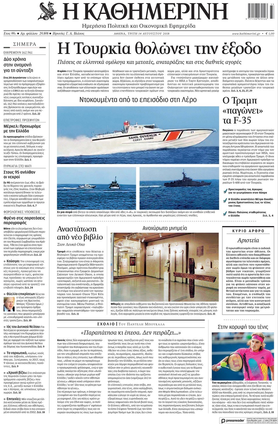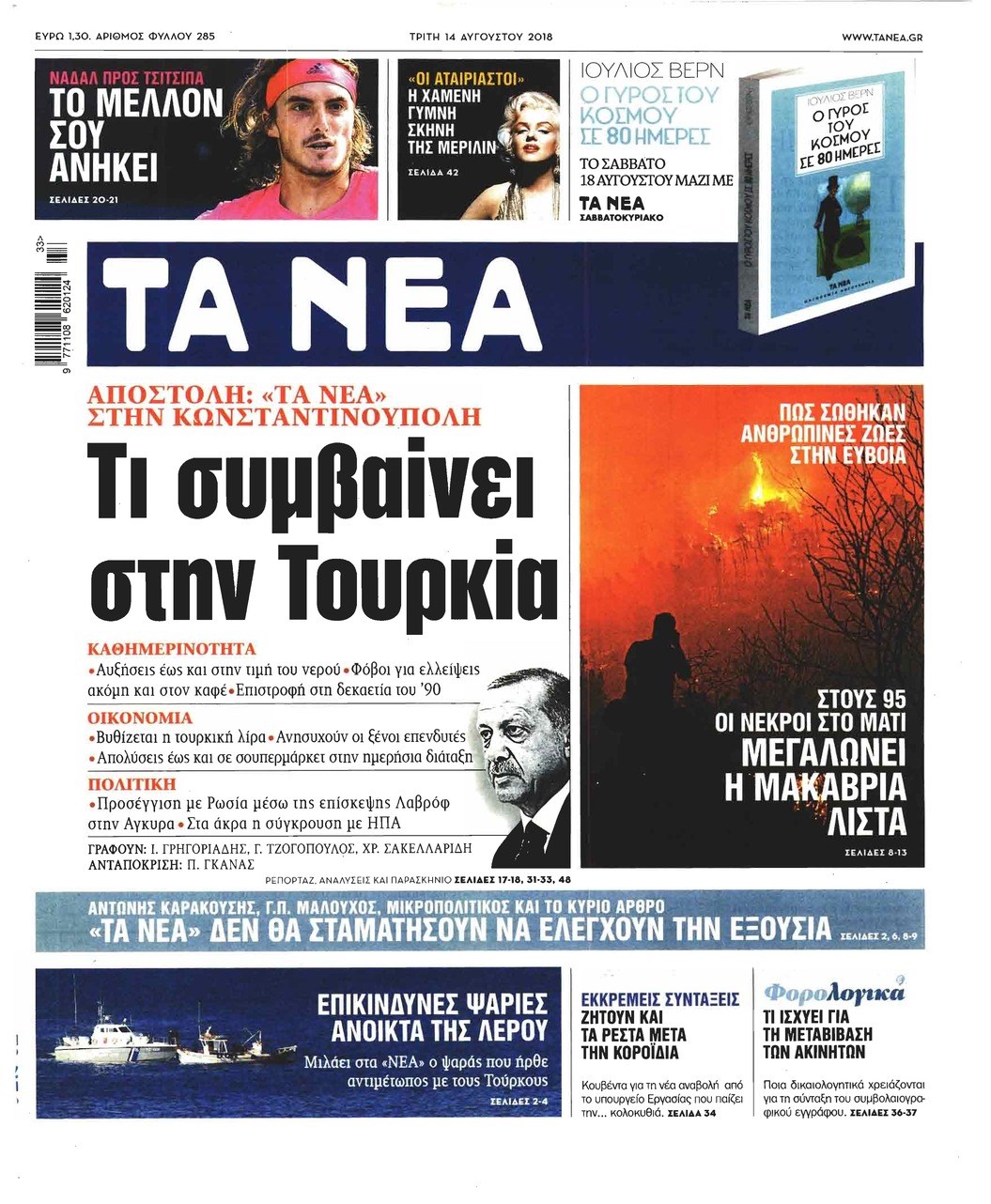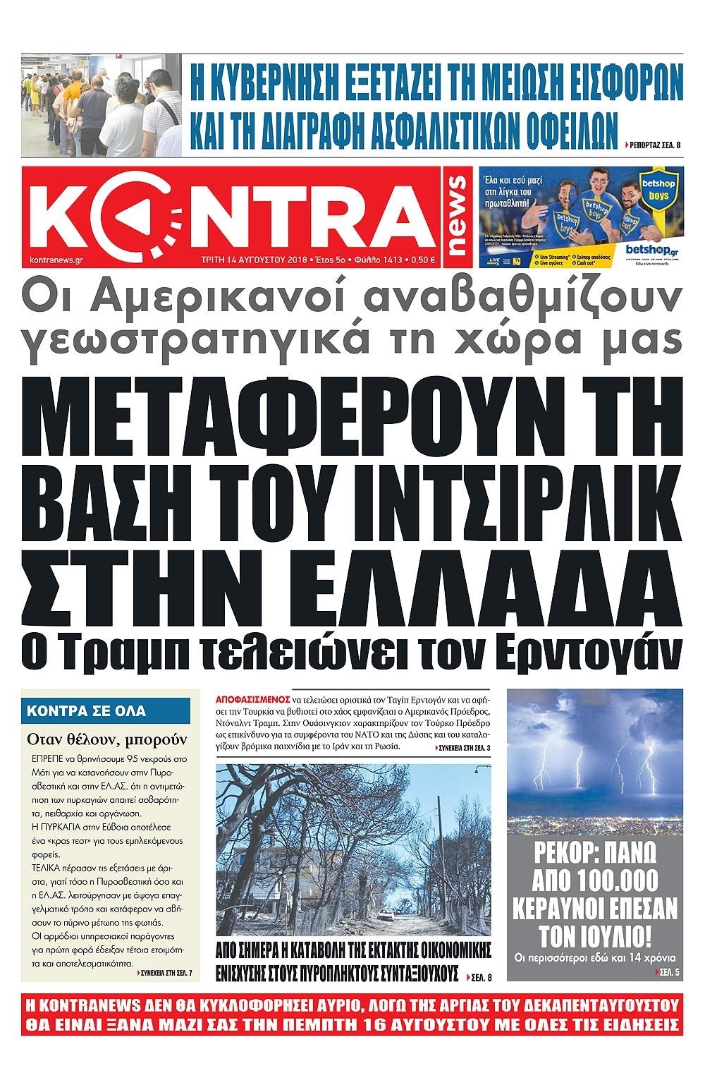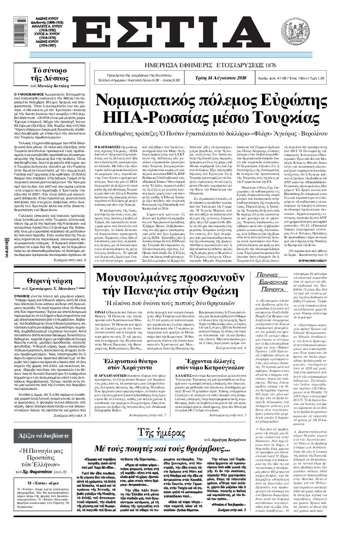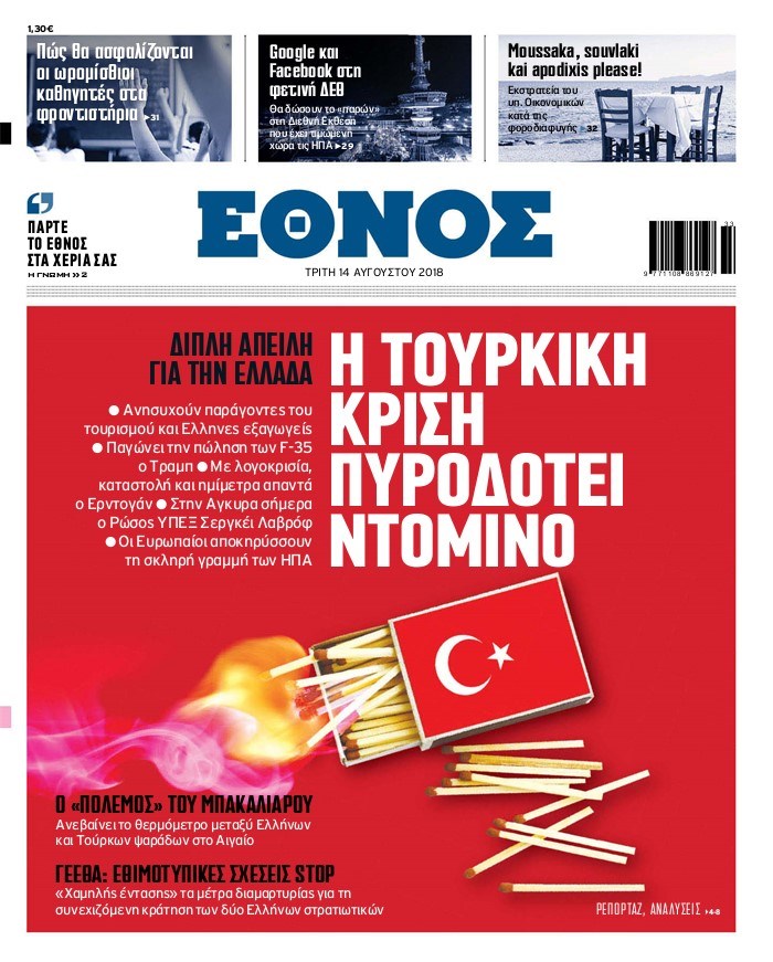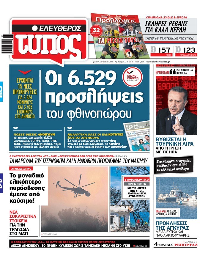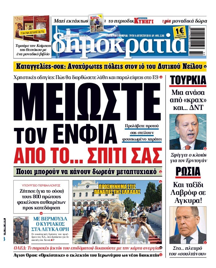 Οι πολιτικές εφημερίδες 14/8/2018 Enikos Newsroom 06:45, Τρίτη 14 Αυγούστου 2018 Media Διαβάστε τα πρωτοσέλιδα ΠΟΛΙΤΙΚΕΣ ΕΦΗΜΕΡΙΔΕΣ Μοιράσου το: σχολίασε κι εσύ (0 σχόλια) Ακολουθήστε το enikos.gr στο Google News και μάθετε πρώτοι όλες τις ειδήσεις Δείτε όλες τις τελευταίες ειδήσεις από την Ελλάδα και τον Κόσμο στο enikos.gr Ειδήσεις Ροή Ειδήσεων 1 ώρα πριν Μητσοτάκης σε αγρότες: Είμαστε ανοιχτοί στον διάλογο, αλλά όχι στο παράλογο – Η διεκδίκηση αιτημάτων οφείλει να γίνεται με σεβασμό στο κοινωνικό σύνολο 2 ώρες πριν Γρίπη: «Καμπανάκι» από τους επιστήμονες για έξαρση κρουσμάτων στις γιορτές – Ποιοι κινδυνεύουν και πώς προστατευόμαστε 3 ώρες πριν Γαλλία: Έτοιμοι για Χριστούγεννα στους δρόμους οι αγρότες – «Οι δεσμεύσεις της κυβέρνησης δεν είναι αρκετές» 2 ώρες πριν Η οικογενειακή διαμάχη των Μπέκαμ: Το block από τον Μπρούκλιν και η απόφαση να περάσει τα Χριστούγεννα με τους δισεκατομμυριούχους γονείς της συζύγου του 2 ώρες πριν Φοροδιαφυγή και «κενό ΦΠΑ»: Πώς τα ψηφιακά εργαλεία έφεραν δισεκατομμύρια στα ταμεία του Δημοσίου 2 ώρες πριν Τα άστρα ευνοούν σκανδαλωδώς 4 ζώδια – «Εμφανίζονται ξαφνικά ευκαιρίες γιατί αποφασίζετε να αφήσετε πίσω το παρελθόν» 3 ώρες πριν Οι γονείς της θέλουν να έχουν πρόσβαση στον τραπεζικό της λογαριασμό – «Επιμένουν πως στις οικογένειες δεν υπάρχουν μυστικά» 3 ώρες πριν Αρχαιολόγοι ανακάλυψαν κάτι που δεν περίμεναν: Τα μαθηματικά υπήρχαν πριν από τους αριθμούς – Το μυστικό που κρύβεται πίσω από περίεργα αγγεία 8.000 ετών 1 ημέρα πριν Enerwave: Το νέο «ρεύμα» στη λιανική ενέργειας που αλλάζει την εμπειρία του καταναλωτή 5 λεπτά πριν Ξενοφών Ζηκίδης: Πέθανε ο δημοσιογράφος της ΕΡΤ 12 λεπτά πριν Παραμένουν στους δρόμους οι αγρότες – Απρόσκοπτη η μετακίνηση των εκδρομέων για τις γιορτές 20 λεπτά πριν Κηφισιά: Δύο συλλήψεις για ληστεία με λεία 180.000 ευρώ – Το «πλούσιο» ποινικό παρελθόν των κατηγορουμένων 28 λεπτά πριν Mente Fuerte για Μαρία Σολωμού: «Ό,τι και αν έχει γίνει, είναι οικογένειά μου» 36 λεπτά πριν Κως: Συνελήφθη 27χρονος για διακίνηση ναρκωτικών – Έπαιρνε εντολές από κρατούμενο ENIKOS NETWORK Άσκηση: η «ασπίδα» του εγκεφάλου απέναντι στη γήρανση Έχετε καταρροή και φαγούρα στα μάτια στις γιορτές; Μπορεί να ευθύνεται το σύνδρομο χριστουγεννιάτικου δέντρου Ανοιχτά τα καταστήματα σήμερα – Μέχρι τι ώρα μπορείτε να κάνετε τις αγορές σας Πρωτοχρονιά 2026: Πόσο θα κοστίσει φέτος η βασιλόπιτα – Οι τιμές σε ζαχαροπλαστεία, φούρνους και σούπερ μάρκετ Χαρτογραφώντας το «σημείο χωρίς επιστροφή»: Για πρώτη φορά αποκαλύπτεται με λεπτομέρεια το ακανθώδες όριο της ατμόσφαιρας τ... Η Google καταργεί τη λειτουργία «dark web report» – Πώς θα μπορούν οι χρήστες να διαγράφουν τα δεδομένα τους περισσότερα 09:43 , Κυριακή 21 Δεκεμβρίου 2025 Το λάθος στην ταινία Die Hard που άφησε άναυδους τους θαυμαστές του Μπρους Γουίλις Ένας φανατικός των ταινιών άφησε άναυδους τους θαυμαστές του Die Hard, επισημαίνοντας τρία βασ... 08:13 , Κυριακή 21 Δεκεμβρίου 2025 Άγιος έρωτας: Ένας καταστροφικός σεισμός χτυπά τη Στέρνα Καταιγιστικές είναι οι εξελίξεις στα δυο τελευταία, συγκλονιστικά επεισόδια του 2025 της σειρά... 08:00 , Κυριακή 21 Δεκεμβρίου 2025 Σήμερα με τη Realnews: Ό,τι και αν αγοράσεις, σκανάρεις και κερδίζεις! Σήμερα με τη Realnews: Ό,τι και αν αγοράσεις, σκανάρεις και κερδίζεις! Με το PADU app, το κορυ... 07:00 , Κυριακή 21 Δεκεμβρίου 2025 Σήμερα με τη Realnews: Instyle, μαζί Drive και Realnews Geopolitics Σήμερα με τη Realnews: Instyle, μαζί Drive και Realnews Geopolitics Instyl