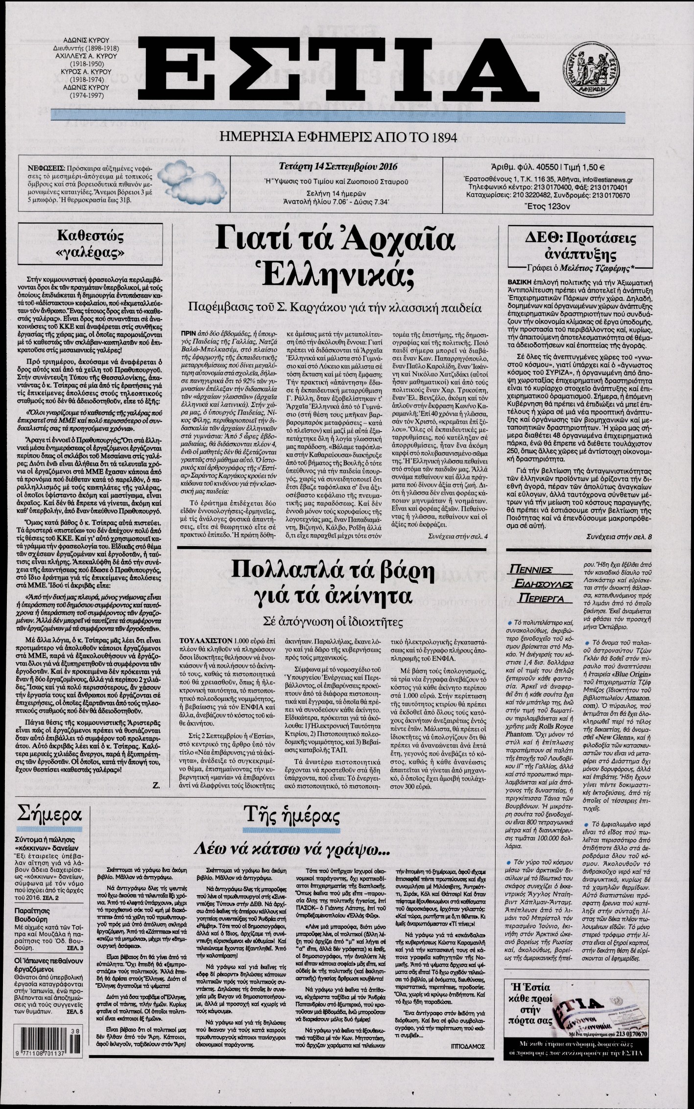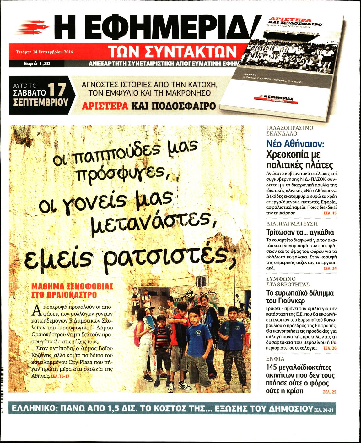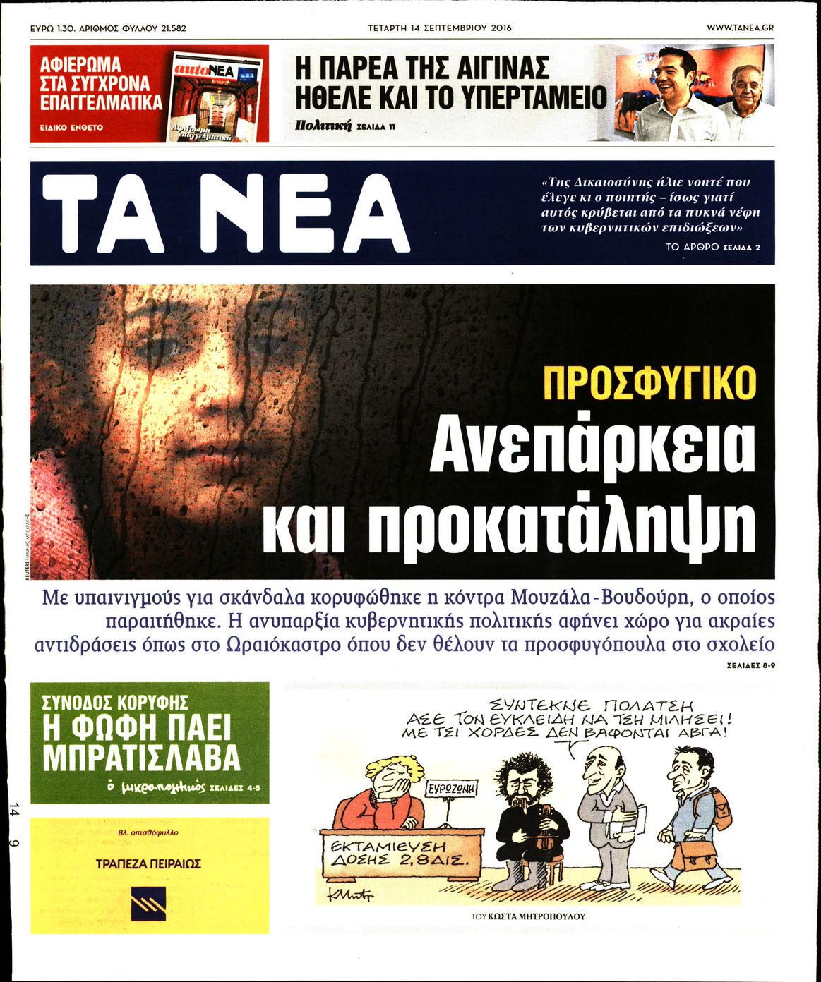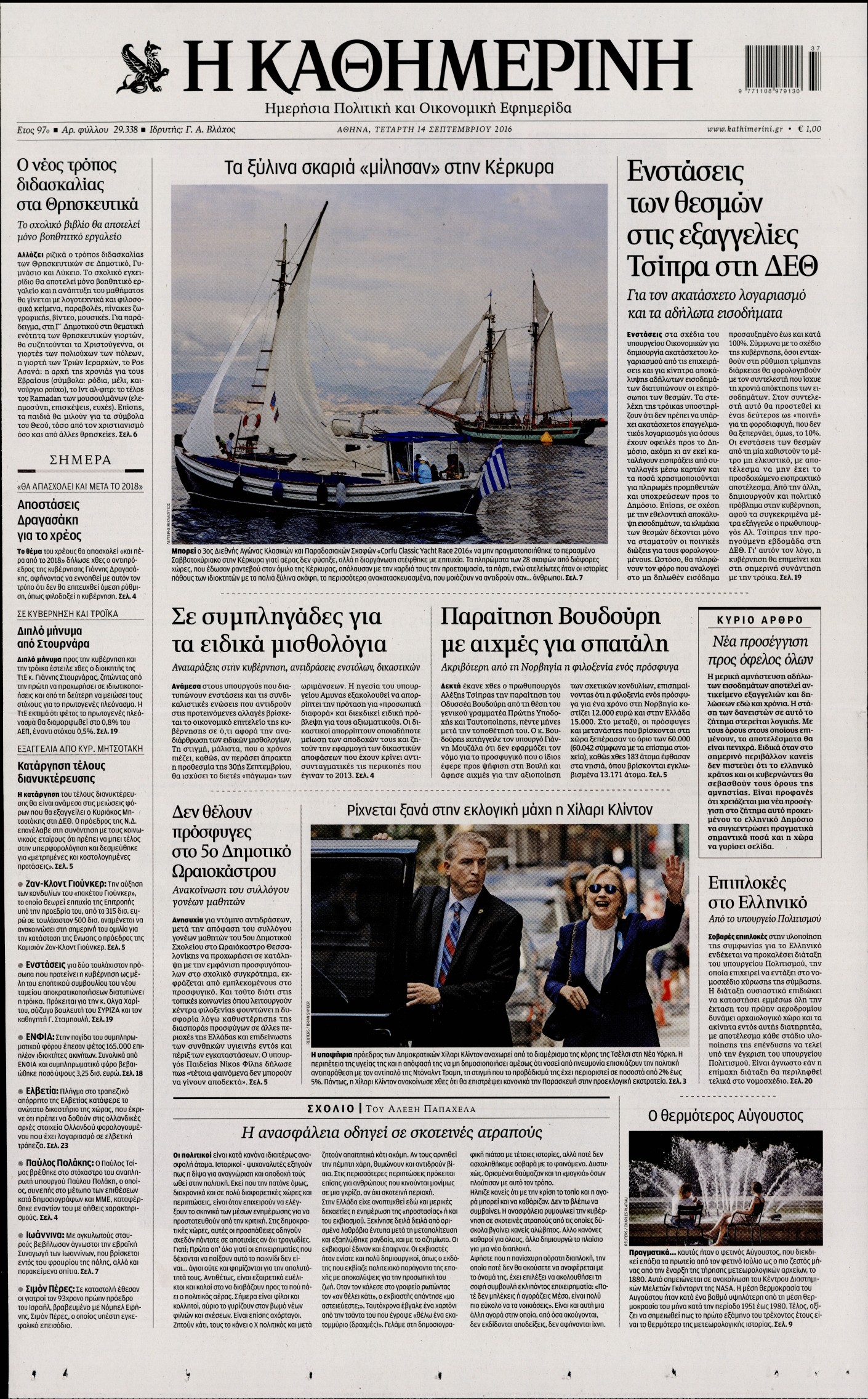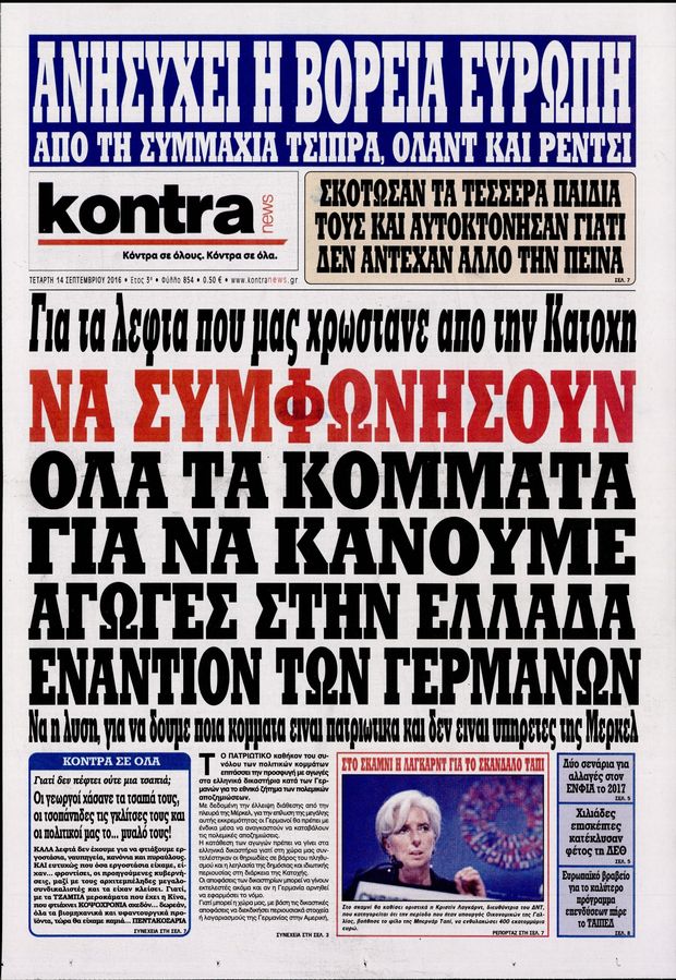 Οι πολιτικές εφημερίδες 14/9/2016 Enikos Newsroom 05:43, Τετάρτη 14 Σεπτεμβρίου 2016 Media Διαβάστε τα σημερινά πρωτοσέλιδα των πολιτικών εφημερίδων: ΠΟΛΙΤΙΚΕΣ ΕΦΗΜΕΡΙΔΕΣ ΠΡΩΤΟΣΕΛΙΔΑ Μοιράσου το: σχολίασε κι εσύ (0 σχόλια) Ακολουθήστε το enikos.gr στο Google News και μάθετε πρώτοι όλες τις ειδήσεις Δείτε όλες τις τελευταίες ειδήσεις από την Ελλάδα και τον Κόσμο στο enikos.gr Ειδήσεις Ροή Ειδήσεων 24 λεπτά πριν Νίκος Παππάς: Το παρασκήνιο της αποπομπής του – Οι μπουνιές, τα μηνύματα μετά την επίθεση και η διαγραφή από τον ΣΥΡΙΖΑ 1 ώρα πριν Φοροδιαφυγή: Ποιοι φορολογούμενοι κινδυνεύουν να πληρώσουν «τσουχτερά» πρόστιμα 51 λεπτά πριν Φοινικούντα: Παραδόθηκε 30χρονος στην Καλαμάτα για τη διπλή δολοφονία 1 ώρα πριν Αγρότες: Ανυποχώρητοι στα μπλόκα – Στις Σέρρες σήμερα η κρίσιμη συνεδρίαση της Πανελλαδικής Επιτροπής 1 ώρα πριν Τα επίσημα χρονοδιαγράμματα που η Τουρκία θα παραλάβει τα Eurofighter 3 ώρες πριν Καούρα: Το μπαχαρικό που είναι «εξίσου αποτελεσματικό» με την ομεπραζόλη, σύμφωνα με ειδικούς 3 ώρες πριν Τα ζώδια σήμερα, Πέμπτη 18 Δεκεμβρίου: Λέοντες, η καρδιά σας θέλει να εκφραστεί 3 ώρες πριν Οπτική ψευδαίσθηση: Μόνο οι πιο έξυπνοι άνθρωποι θα βρουν 7 ξωτικά 15 δευτερόλεπτα 23 ώρες πριν 20 χρόνια τα Χριστούγεννα ξεκινούν στα Public με μεγάλη ποικιλία σε δώρα! 8 λεπτά πριν Μαρία Αλιφέρη: «Καλή σου ξεκούραση ακριβέ μου φίλε και αδελφέ» – Η συγκινητική ανάρτηση για τον Αλμπέρτο Εσκενάζυ 12 λεπτά πριν Οφειλές προς το Δημόσιο: Τι απαντά το υπουργείο στα σενάρια για νέα ρύθμιση 17 λεπτά πριν Συνταγή του Gordon Ramsay για σπιτικές πατάτες φούρνου 22 λεπτά πριν Δώρο Χριστουγέννων: Έως αύριο η καταβολή του – Πώς υπολογίζεται και τι πρέπει να κάνουν οι εργαζόμενοι που δεν θα το λάβουν 24 λεπτά πριν Νίκος Παππάς: Το παρασκήνιο της αποπομπής του – Οι μπουνιές, τα μηνύματα μετά την επίθεση και η διαγραφή από τον ΣΥΡΙΖΑ ENIKOS NETWORK Ουρική αρθρίτιδα: Μεγάλη μελέτη αποκαλύπτει τι μπορεί να προκαλεί τη νόσο Τι σημαίνει όταν ο σκύλος σας σάς φέρνει τυχαία αντικείμενα, σύμφωνα με εκπαιδεύτρια Οφειλές προς το Δημόσιο: «Φρένο» στα σενάρια για νέα ρύθμιση – Τι απαντά το υπουργείο Εθνικής Οικονομίας και Οικονομικών Φοροδιαφυγή: Ποιοι φορολογούμενοι κινδυνεύουν να πληρώσουν «τσουχτερά» πρόστιμα Χαρτογραφώντας το «σημείο χωρίς επιστροφή»: Για πρώτη φορά αποκαλύπτεται με λεπτομέρεια το ακανθώδες όριο της ατμόσφαιρας τ... Η Google καταργεί τη λειτουργία «dark web report» – Πώς θα μπορούν οι χρήστες να διαγράφουν τα δεδομένα τους περισσότερα 08:00 , Πέμπτη 18 Δεκεμβρίου 2025 Την Κυριακή με τη Realnews: Δωροεπιταγή 10€ Δωροεπιταγή αξίας 10€ για αγορές άνω των 60€ από τα πολυκαταστήματα FactoryOutlet H προσφορά ι... 07:50 , Πέμπτη 18 Δεκεμβρίου 2025 «Το σόι σου»: Backstage στα γυρίσματα για το εορταστικό επεισόδιο «Το σόι σου» φορά τα γιορτινά του για τα Χριστούγεννα και η Όλγα Λαφαζάνη, με την κάμερα του «... 07:36 , Πέμπτη 18 Δεκεμβρίου 2025 Οι αθλητικές μεταδόσεις 18/12/2025 – Πού θα δείτε τον αγώνα της ΑΕΚ με την Κραϊόβα για το Conference League Τα ματς ΑΕΚ – Ουνιβερσιτάτεα Κραϊόβα για το Conference League και Παναθηναϊκός – Χάποελ Τελ Αβ... 05:48 , Πέμπτη 18 Δεκεμβρίου 2025 Οι οικονομικές εφημερίδες 18/12/2025 Διαβάστε τα πρωτοσέλιδα από τις οικονομικές εφημερίδες, σήμερα 18/12/2025. ΤΕΛΕΥΤΑΙΕΣ ΕΙΔΗΣΕΙΣ 8 λεπτά πριν Μαρία Αλιφέρη: «Καλή σου ξεκούραση ακριβέ μου φίλε και... 12 λεπτά πριν Οφειλές προς το Δημόσιο: Τι απαντά το υπουργείο στα... 17 λεπτά πριν Συνταγή του Gordon Ramsay για σπιτικές πατάτες φούρνου 